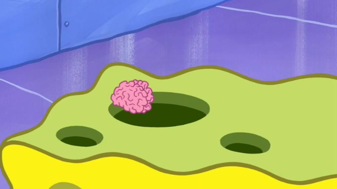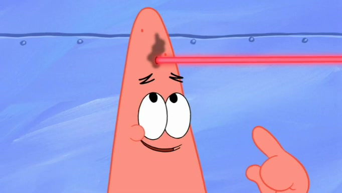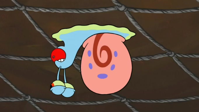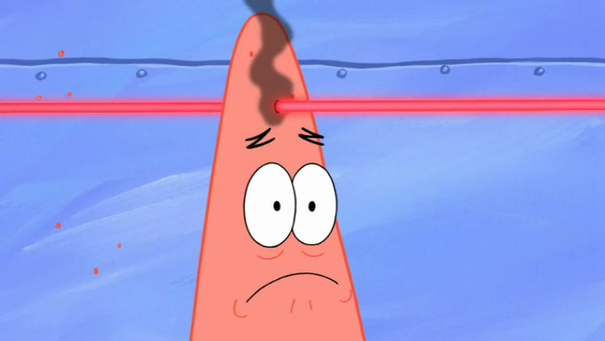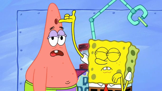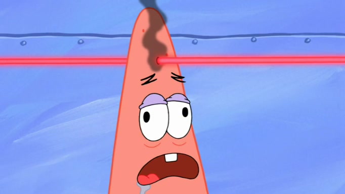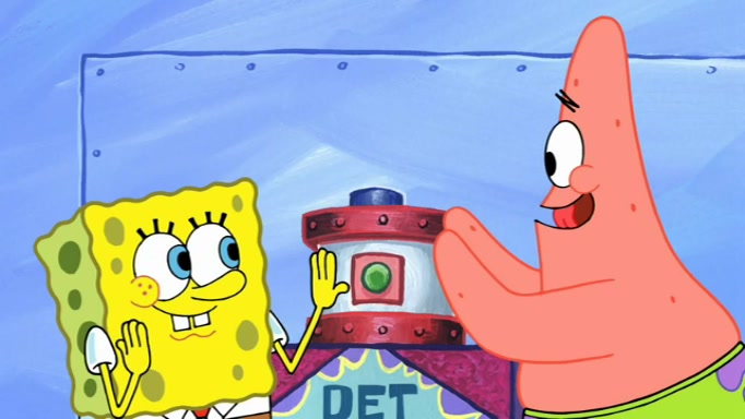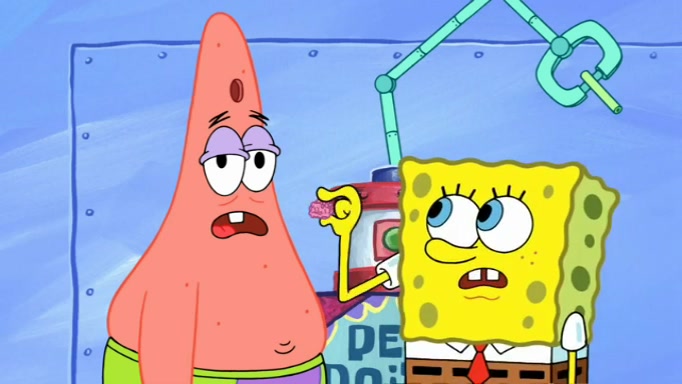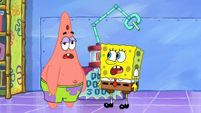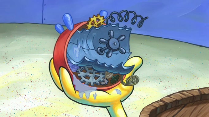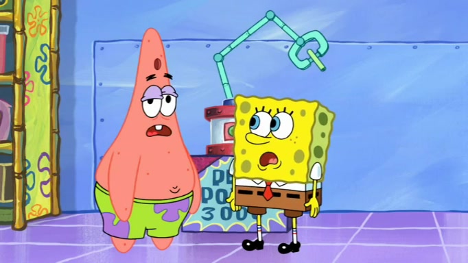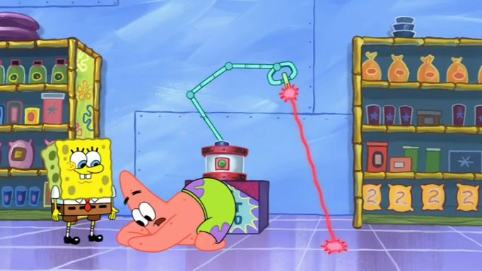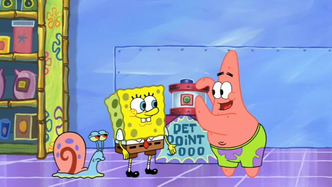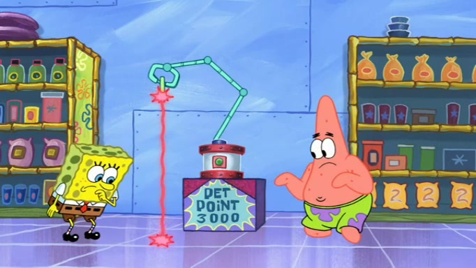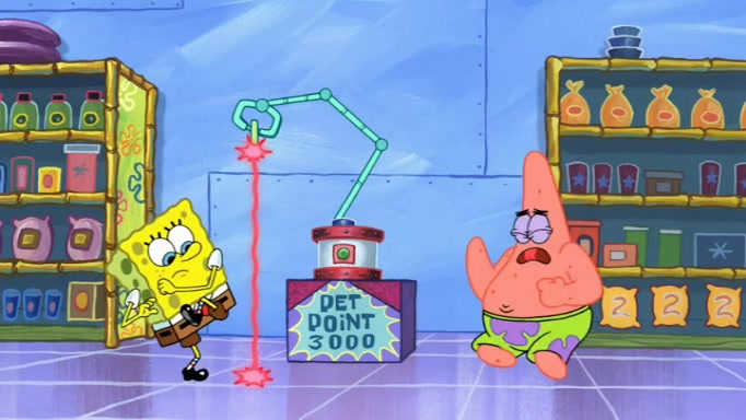 SpongeBob takes out a toy fire hydrant, but Gary bites onto the end causing water to spray onto SpongeBob's face. Patrick then points out the "Pet Point 3000" with SpongeBob interested, but not so much with Gary, who crawls away. Patrick then starts to play with the toy, but ends up getting the laser through his head and his brain pops out (which SpongeBob then puts back in). Gary then notices a shiny red ball and loves it and SpongeBob decides to buy it.