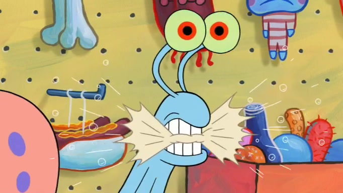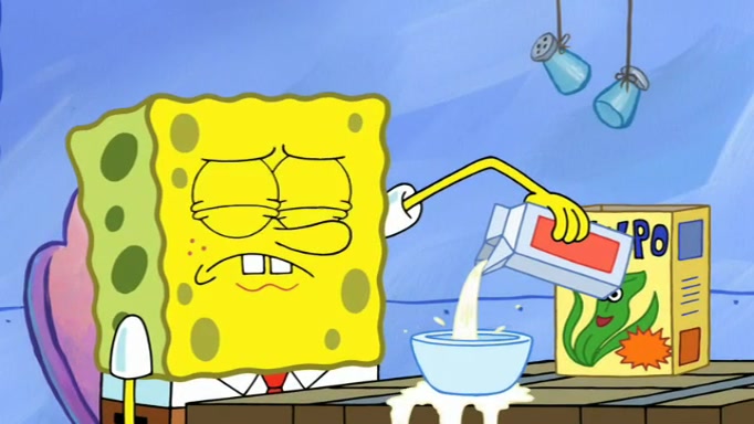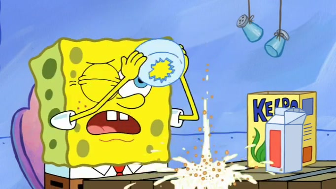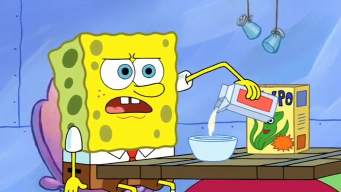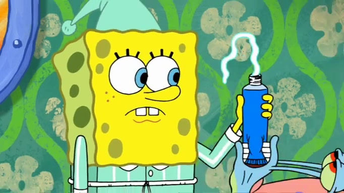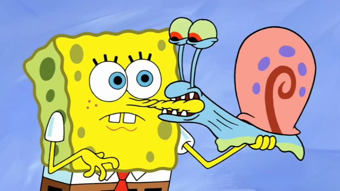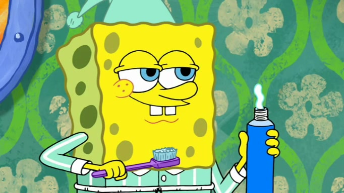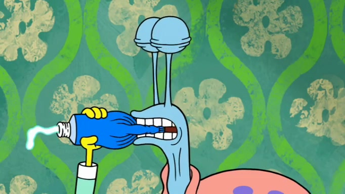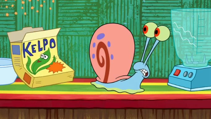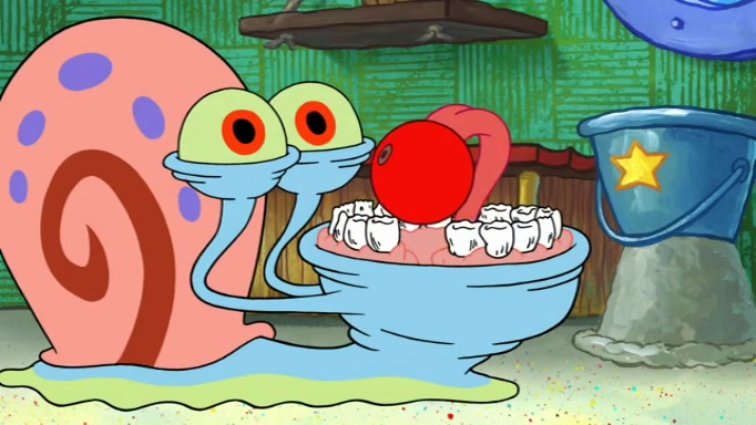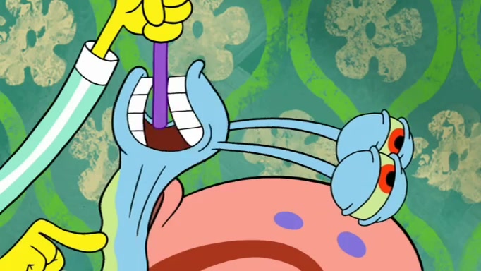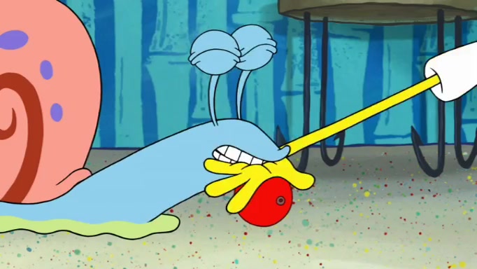 SpongeBob tries to pull it away from him but no success. SpongeBob then tickles Gary which makes him finally let go of the toothbrush, but then he starts to bite on his toothpaste instead. SpongeBob is wondering if Gary is teething again (as milk goes through his bowl of cereal) and then Gary starts biting on the table. SpongeBob then decides to buy Gary a chew toy.