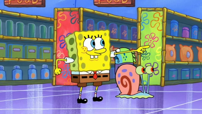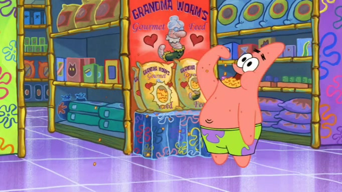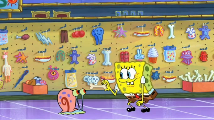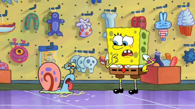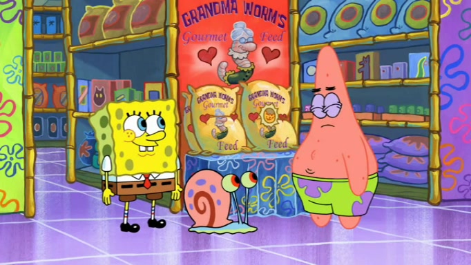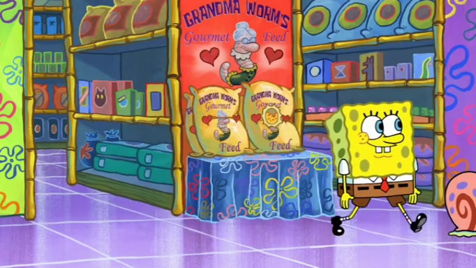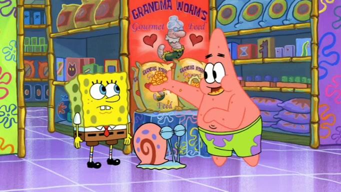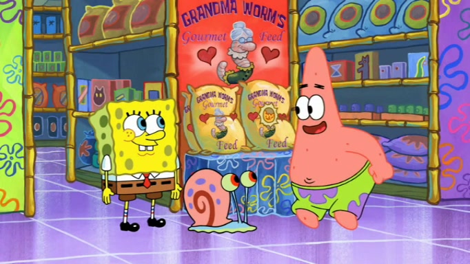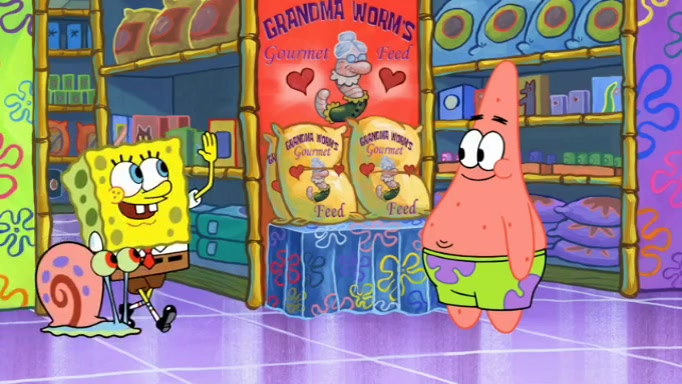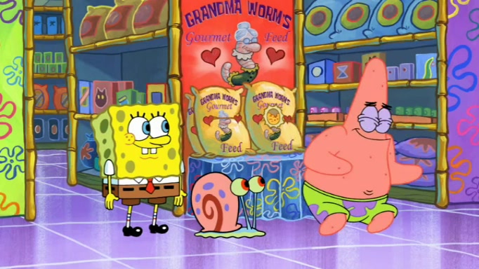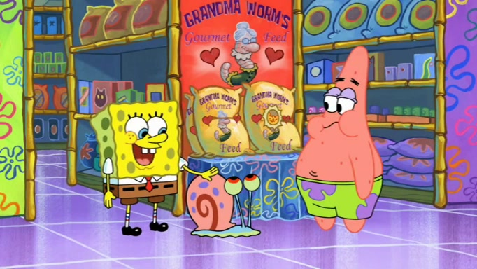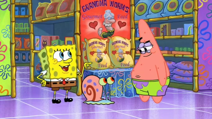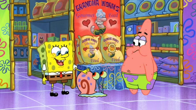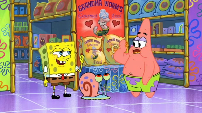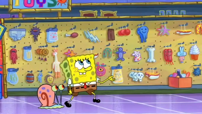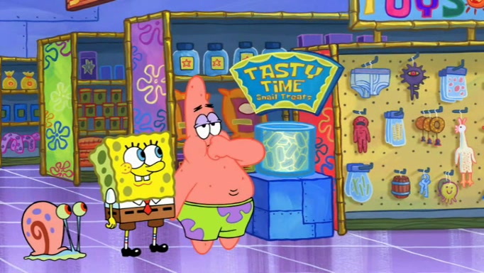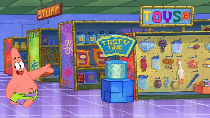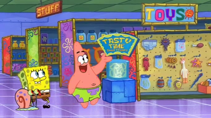 SpongeBob and Gary are at the Pet Store looking to pick out which chew toy to get. They meet up with Patrick who is having some "free samples" (which he punches a hole open in the worm food and starts to eat it). SpongeBob tells Patrick that he is there to buy Gary a new toy and Patrick tells them that it's on an aisle next to the "most delicious snail treats." They walk over to a stand that says "Tasty Time Snail Treats" with the toy aisle right next to it. Patrick eats at the stand while SpongeBob and Gary browse for a new toy. SpongeBob picks out a bone, but Gary bites right through it.