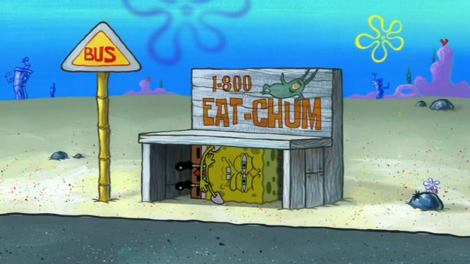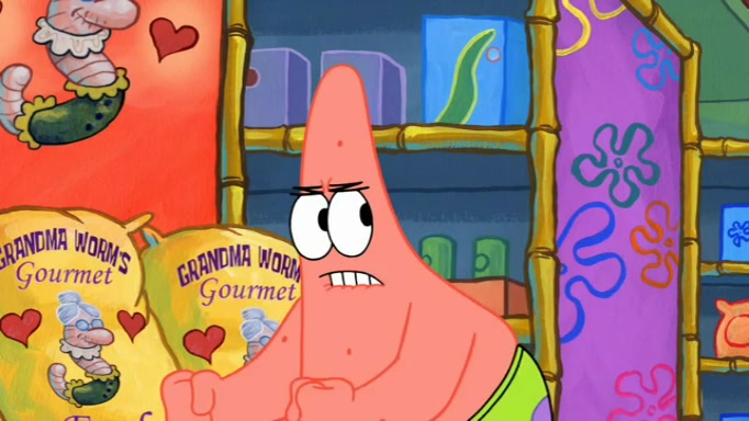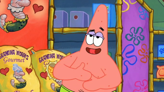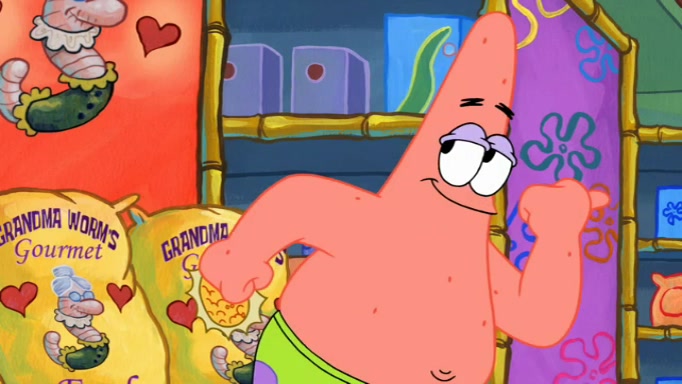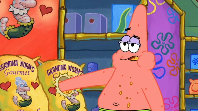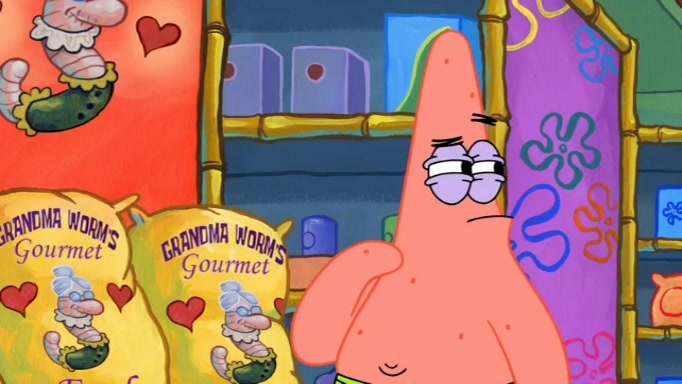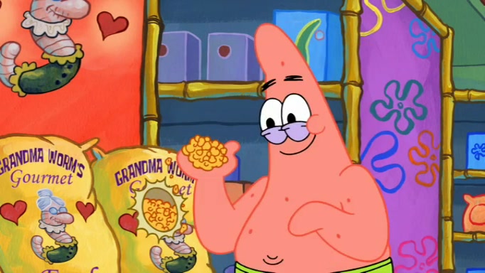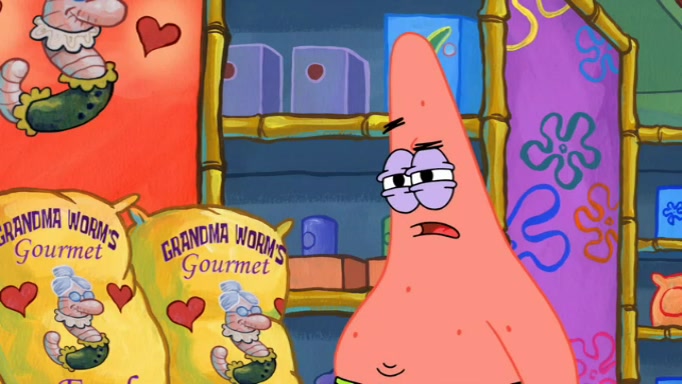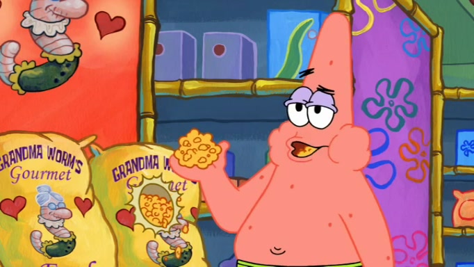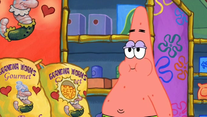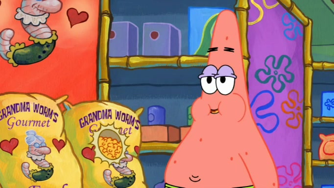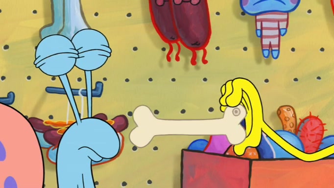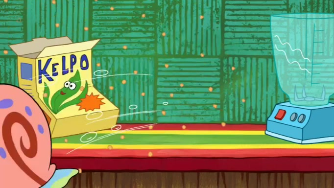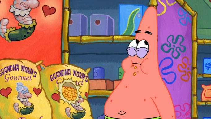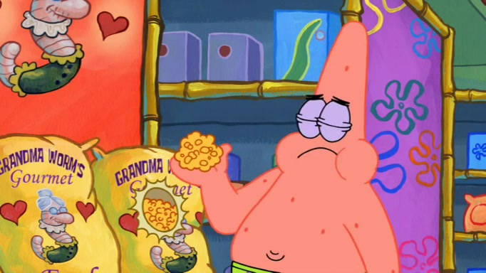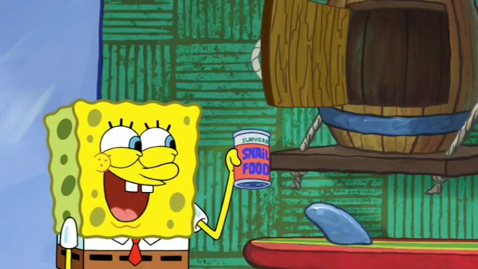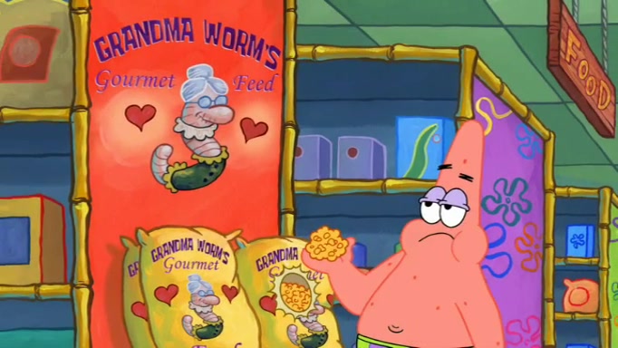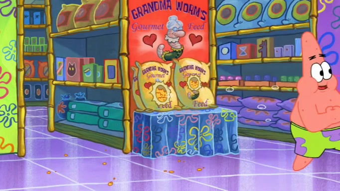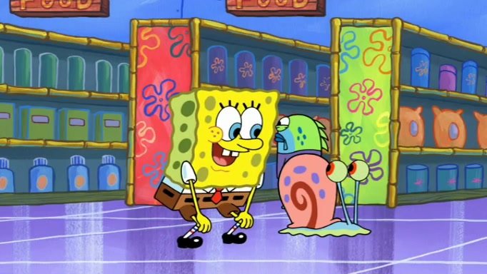 SpongeBob and Gary are at the Pet Store looking to pick out which chew toy to get. They meet up with Patrick who is having some "free samples" (which he punches a hole open in the worm food and starts to eat it). SpongeBob tells Patrick that he is there to buy Gary a new toy and Patrick tells them that it's on an aisle next to the "most delicious snail treats." They walk over to a stand that says "Tasty Time Snail Treats" with the toy aisle right next to it. Patrick eats at the stand while SpongeBob and Gary browse for a new toy. SpongeBob picks out a bone, but Gary bites right through it.