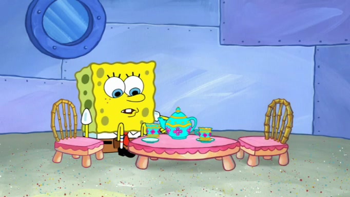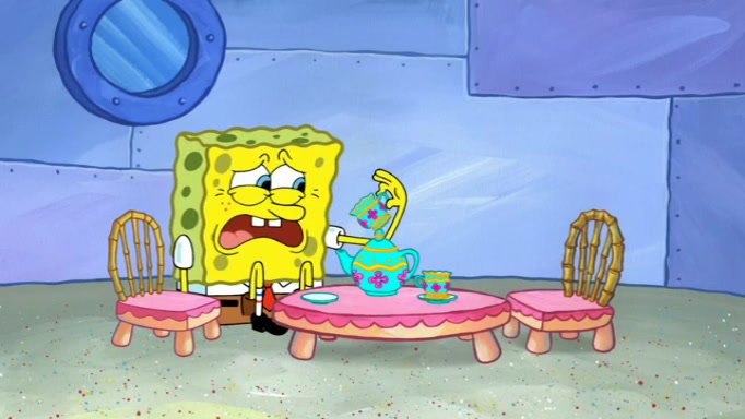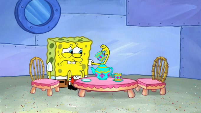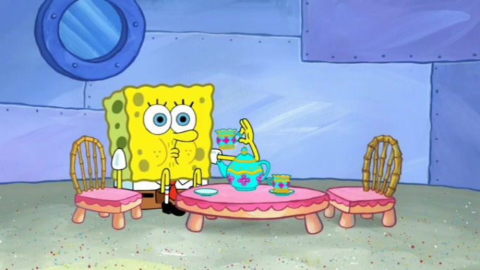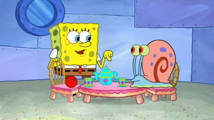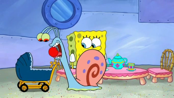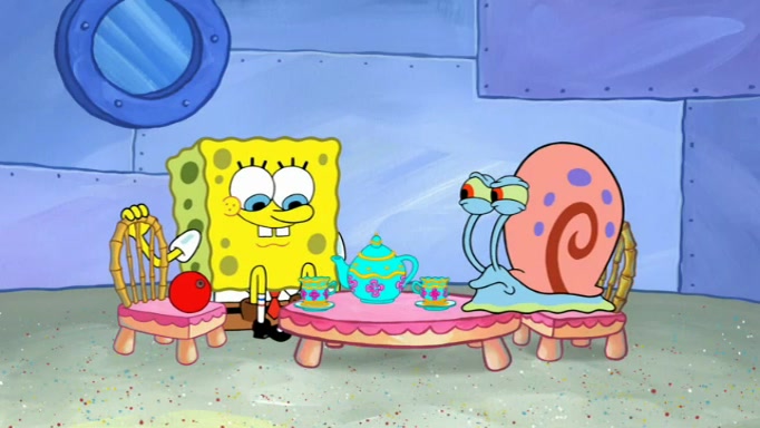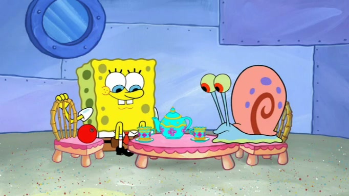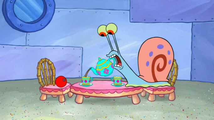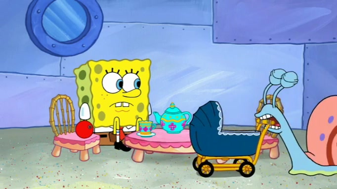 Back at SpongeBob's house, SpongeBob and Gary are playing with Gary's new toy ball. SpongeBob asks for Gary to bring it back, but notices he is constantly chewing on it. SpongeBob walks off, happy that Gary isn't chewing on his stuff. SpongeBob then notices that he hasn't heard Gary squeaking with the toy in awhile and starts to look for him. He then finds Gary having a tea party with his red ball. SpongeBob tries to join in, but Gary takes out a stroller, puts the red ball in it, then crawls away.