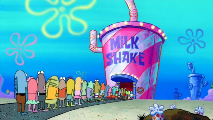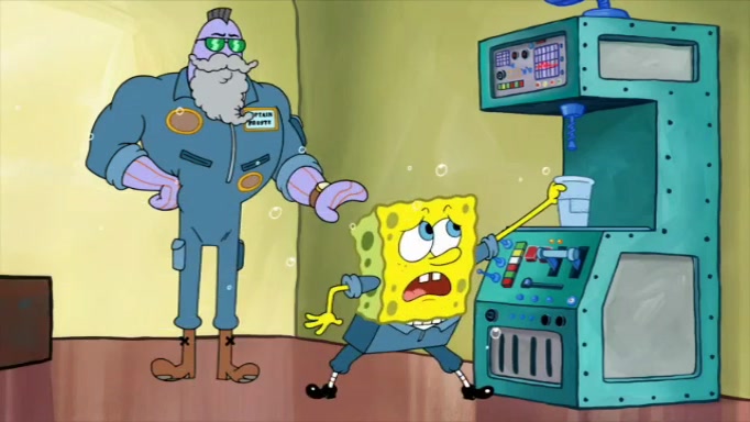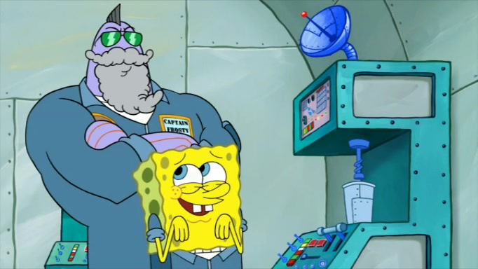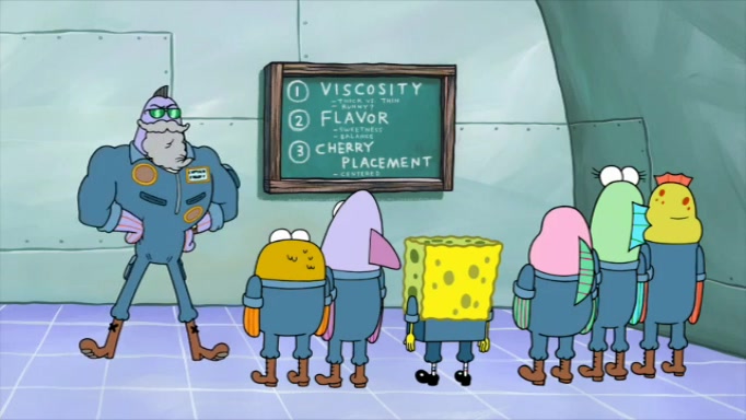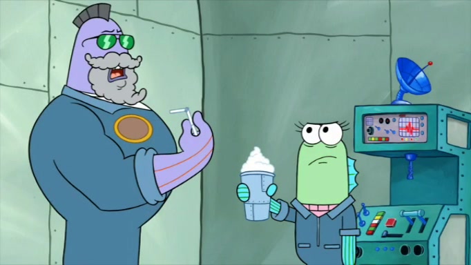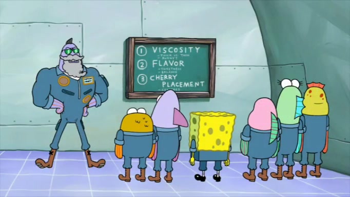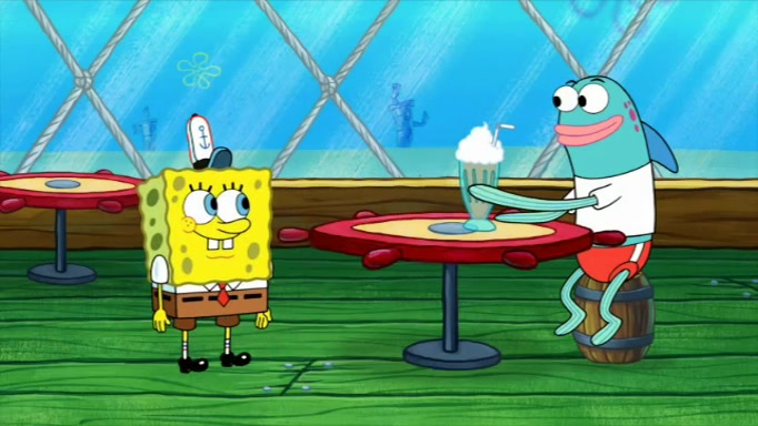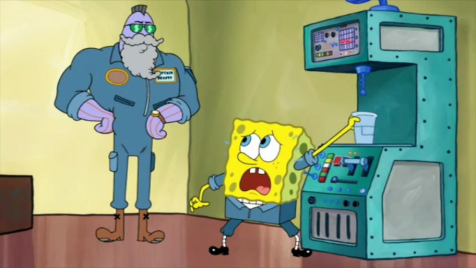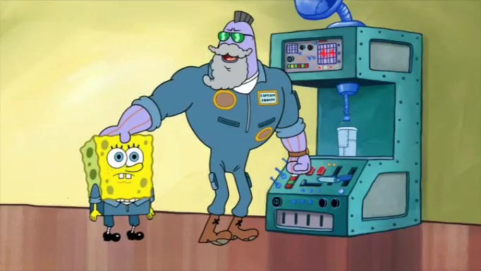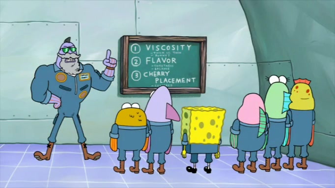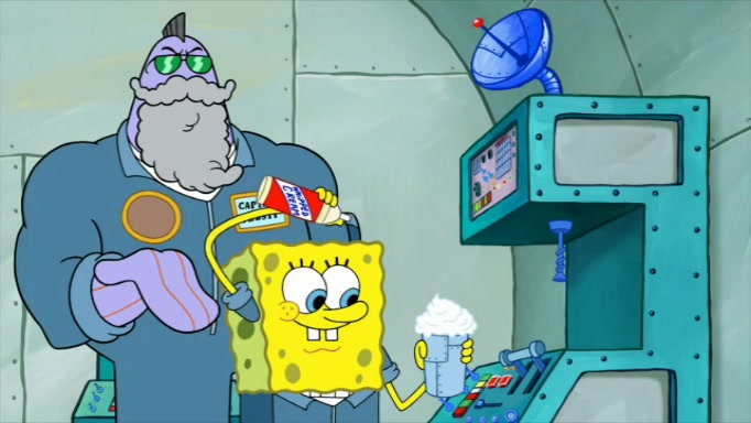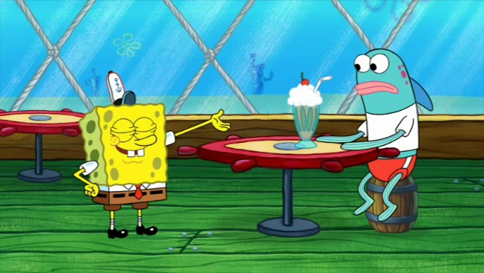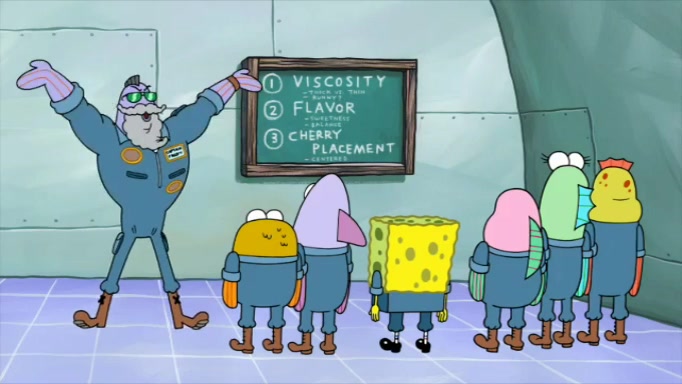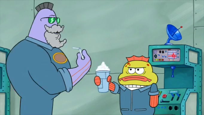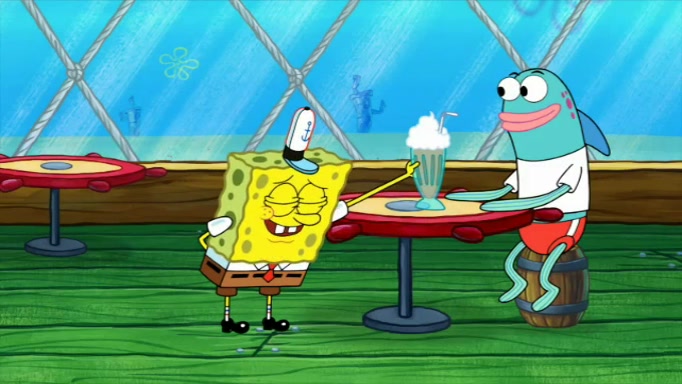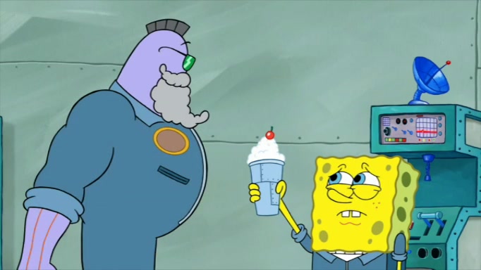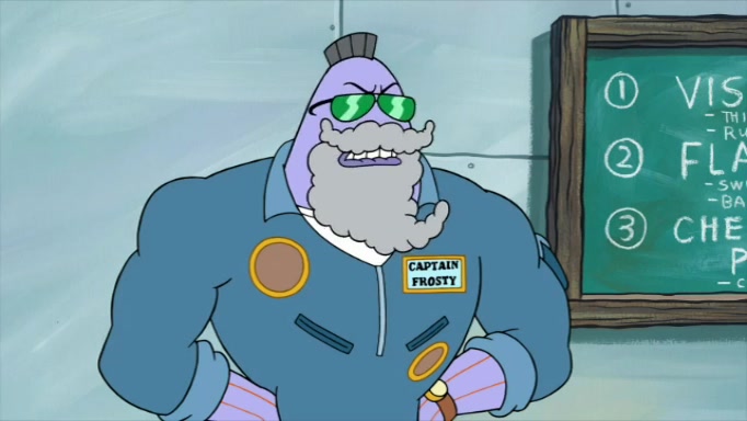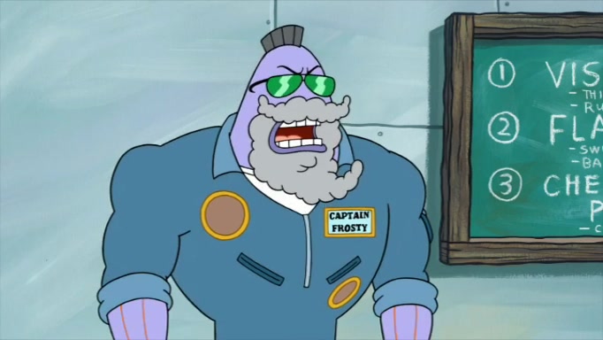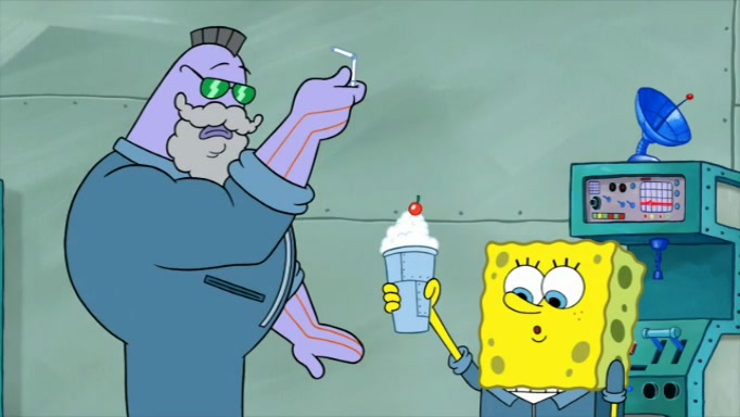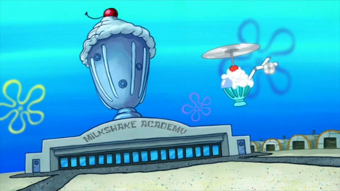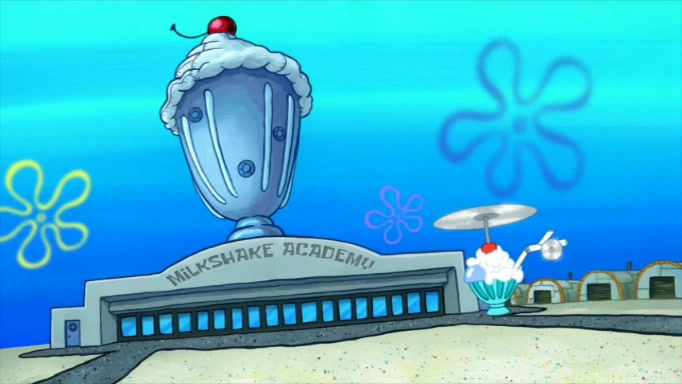 One day around lunchtime, while working and snogging the lips off his toy doll at the Krusty Krab, SpongeBob gets a last minute order to serve a milkshake which he has not made in years. SpongeBob decides to make a simple milkshake in a blender, and finishes it off by topping whipped cream and a cherry while walking out of the kitchen door. He serves it to Harold. But, Harold says it tastes horrible (and throws a temper tantrum, demanding a refund while angry). Mr. Krabs comes in and walks Harold out of the restaurant while telling him that SpongeBob will make a proper milkshake for him tomorrow. Mr. Krabs then puts SpongeBob in a a boatmobile and says he is taking him back to school. SpongeBob and Mr. Krabs later arrive at the Milkshake Academy and SpongeBob has to go here to learn how to make a proper milkshake again. Captain Frosty Mug tells the cadets to man their milkshake stations. When SpongeBob mans his station, he realizes that there are more buttons and contraptions than he's used to, but thinks he still can make a milkshake with no problem. But when he tries to mix the milkshake, he repeatedly pushes the wrong button. Frosty Mug comes over and has to inform SpongeBob that the controls are different and he has to push the button on the lower control panel. When SpongeBob manages to finally mix his milkshake, he lets Frosty Mug try it. However, when Frosty Mug tries it, the milkshake is frozen and it ends up in Frosty Mug's eye. Frosty Mug suggests they need to get back to the basics. He tells SpongeBob before he makes a milkshake, he needs to know what it feels like to be a milkshake. He makes him go in the Shake Simulator, which makes cadets who enter it into a milkshake-shaped blob. Frosty Mug sets the Simulator on "Obliterate," which makes the students gasp. A cadet reminds Frosty Mug that no one has ever survived Obliterate, to which he responds that he needs to learn. The simulator shakes, rattles, and rolls SpongeBob. Captain Frosty Mug decides to see how SpongeBob turned out and gets angry when he sees that he both survived and actually found it fun. Angry, Frosty Mug says that he's never had such an "unteachable moron" in 30 years. He asks his students to tell him how he could teach SpongeBob how to make a milkshake (with one student replying, "You'd be better off teaching a piece of coral, sir!," to which the students laugh at). SpongeBob replies that he'll show the students that he can make a milkshake. However, during the courses of making a milkshake, SpongeBob fails doing them all. During graduation, SpongeBob expects to get his milkshake license at this event. However, Captain Frosty Mug gives everyone milkshake licenses except for SpongeBob, because he couldn't even get past Step #1 of making a milkshake. SpongeBob tells Frosty Mug that he will keep trying. Captain Frostymug tells him he needs to put the milkshake up to the spinney thing. Then, he stops, flashing back to 20 years ago.
