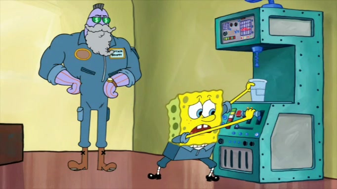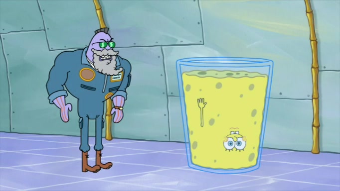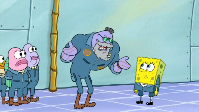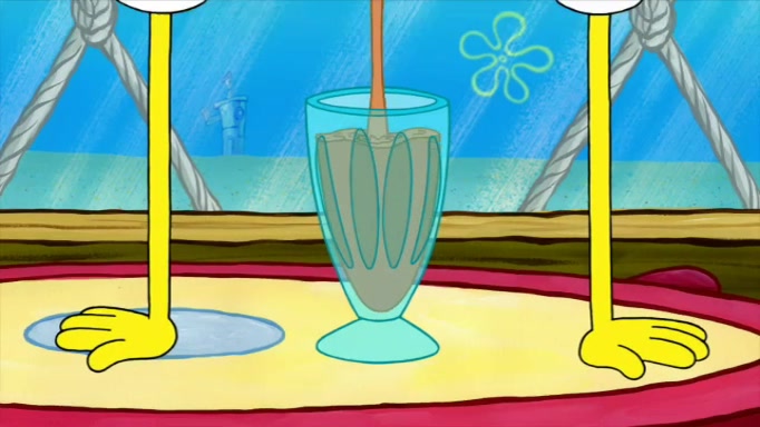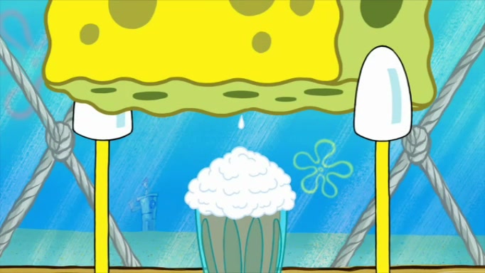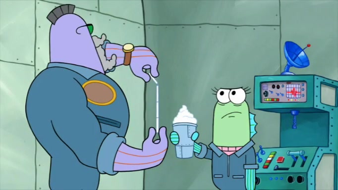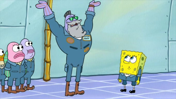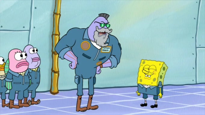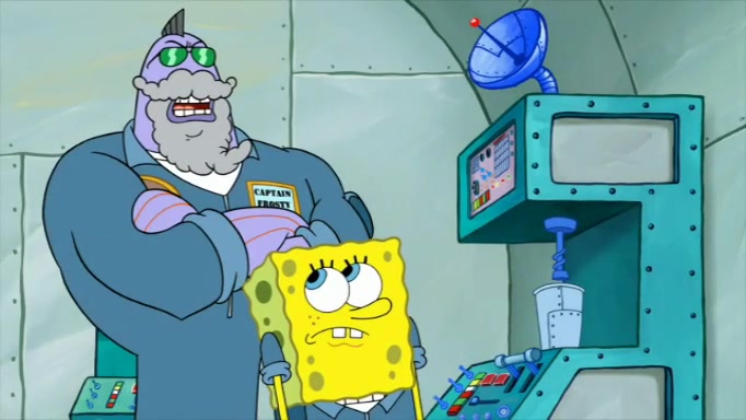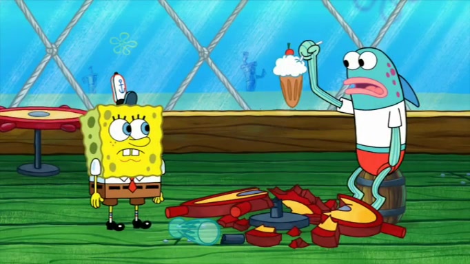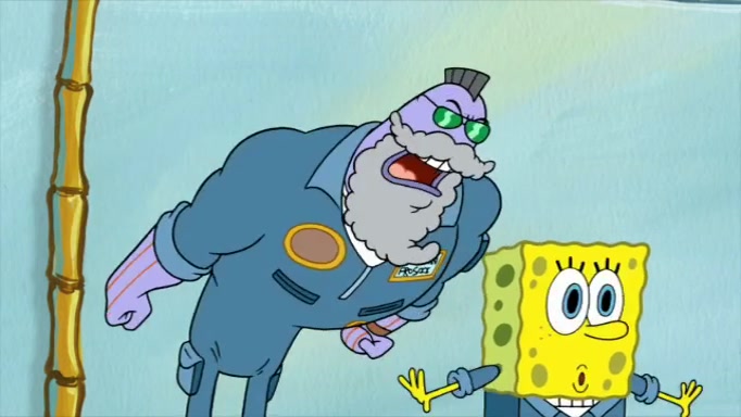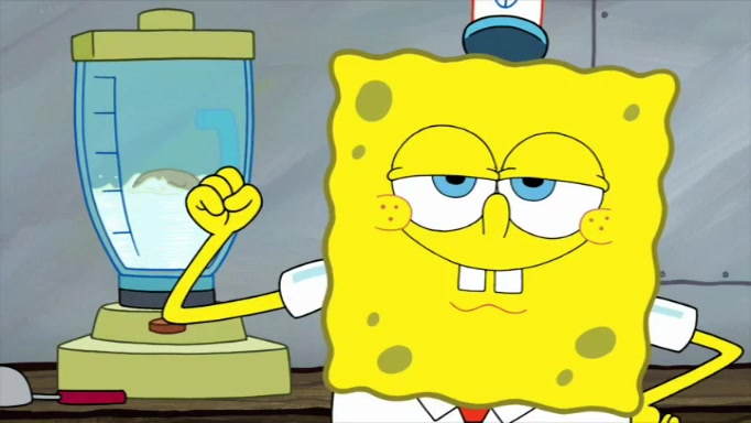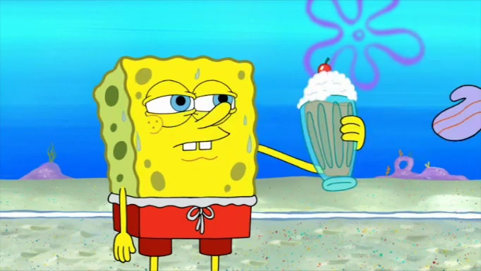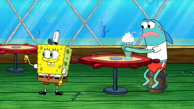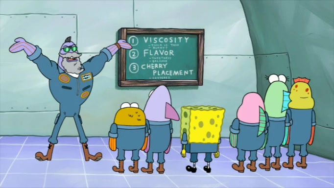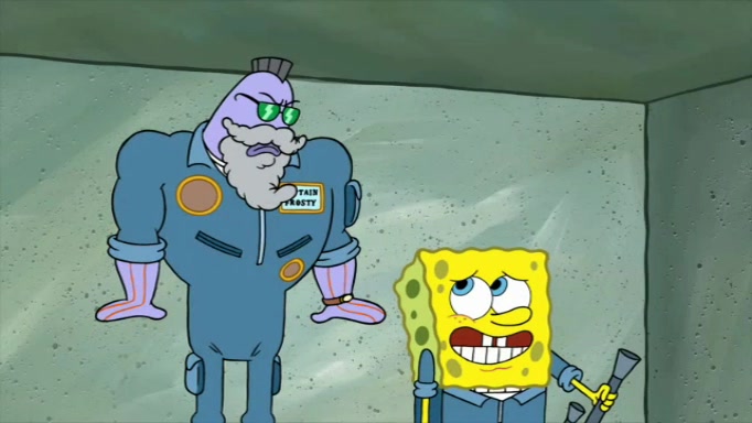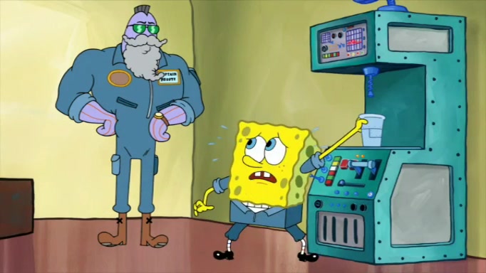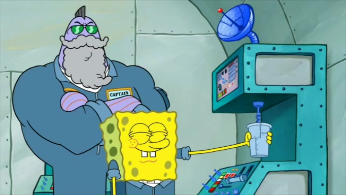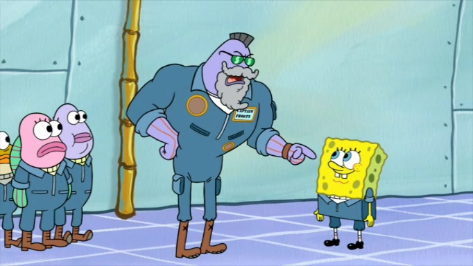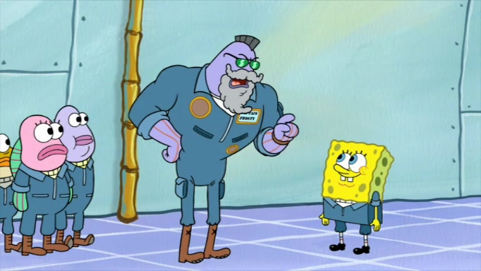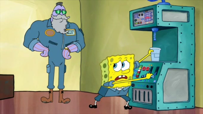 One day around lunchtime, while working and snogging the lips off his toy doll at the Krusty Krab, SpongeBob gets a last minute order to serve a milkshake which he has not made in years. SpongeBob decides to make a simple milkshake in a blender, and finishes it off by topping whipped cream and a cherry while walking out of the kitchen door. He serves it to Harold. But, Harold says it tastes horrible (and throws a temper tantrum, demanding a refund while angry). Mr. Krabs comes in and walks Harold out of the restaurant while telling him that SpongeBob will make a proper milkshake for him tomorrow. Mr. Krabs then puts SpongeBob in a a boatmobile and says he is taking him back to school. SpongeBob and Mr. Krabs later arrive at the Milkshake Academy and SpongeBob has to go here to learn how to make a proper milkshake again. Captain Frosty Mug tells the cadets to man their milkshake stations. When SpongeBob mans his station, he realizes that there are more buttons and contraptions than he's used to, but thinks he still can make a milkshake with no problem. But when he tries to mix the milkshake, he repeatedly pushes the wrong button. Frosty Mug comes over and has to inform SpongeBob that the controls are different and he has to push the button on the lower control panel. When SpongeBob manages to finally mix his milkshake, he lets Frosty Mug try it. However, when Frosty Mug tries it, the milkshake is frozen and it ends up in Frosty Mug's eye. Frosty Mug suggests they need to get back to the basics. He tells SpongeBob before he makes a milkshake, he needs to know what it feels like to be a milkshake. He makes him go in the Shake Simulator, which makes cadets who enter it into a milkshake-shaped blob. Frosty Mug sets the Simulator on "Obliterate," which makes the students gasp. A cadet reminds Frosty Mug that no one has ever survived Obliterate, to which he responds that he needs to learn. The simulator shakes, rattles, and rolls SpongeBob. Captain Frosty Mug decides to see how SpongeBob turned out and gets angry when he sees that he both survived and actually found it fun. Angry, Frosty Mug says that he's never had such an "unteachable moron" in 30 years. He asks his students to tell him how he could teach SpongeBob how to make a milkshake (with one student replying, "You'd be better off teaching a piece of coral, sir!," to which the students laugh at). SpongeBob replies that he'll show the students that he can make a milkshake. However, during the courses of making a milkshake, SpongeBob fails doing them all. During graduation, SpongeBob expects to get his milkshake license at this event. However, Captain Frosty Mug gives everyone milkshake licenses except for SpongeBob, because he couldn't even get past Step #1 of making a milkshake. SpongeBob tells Frosty Mug that he will keep trying. Captain Frostymug tells him he needs to put the milkshake up to the spinney thing. Then, he stops, flashing back to 20 years ago.
