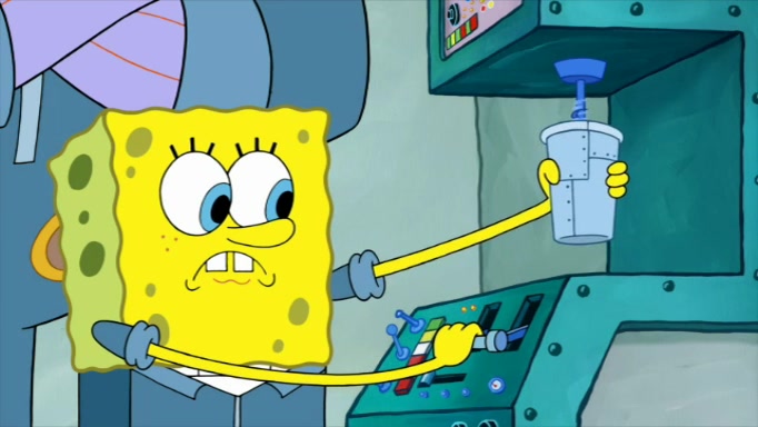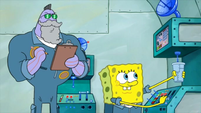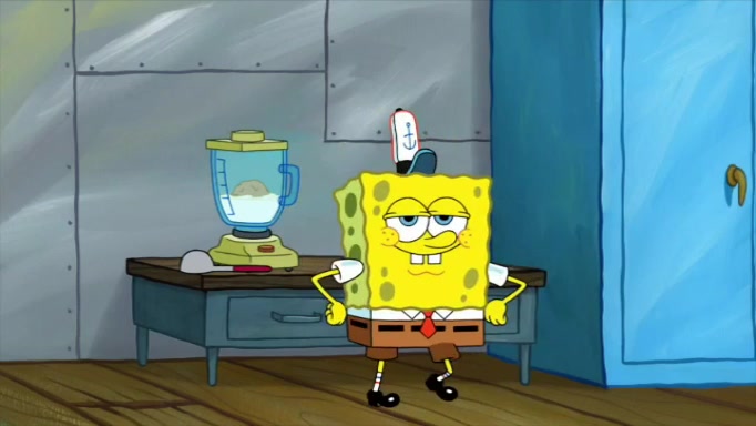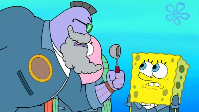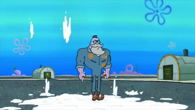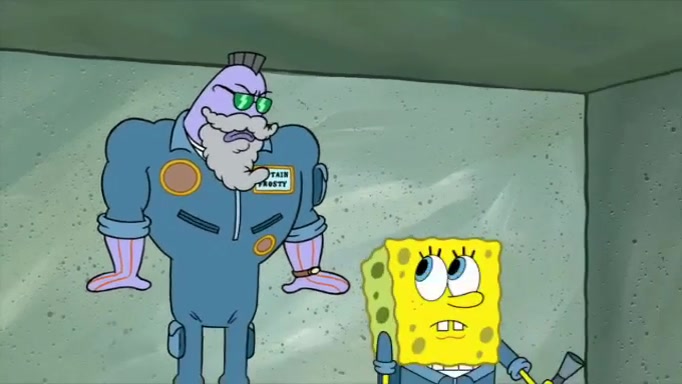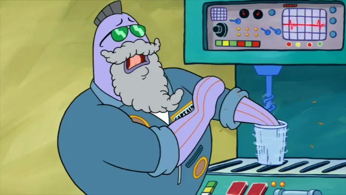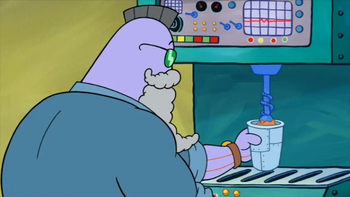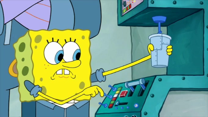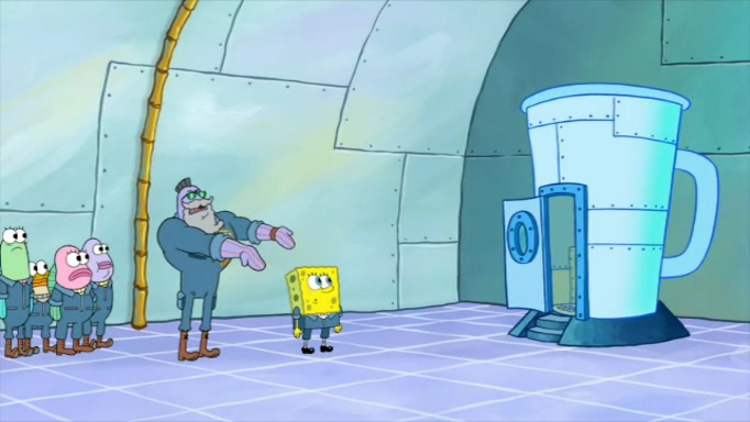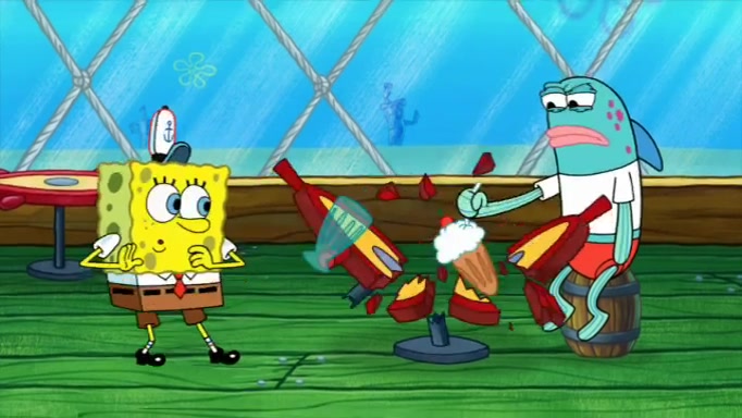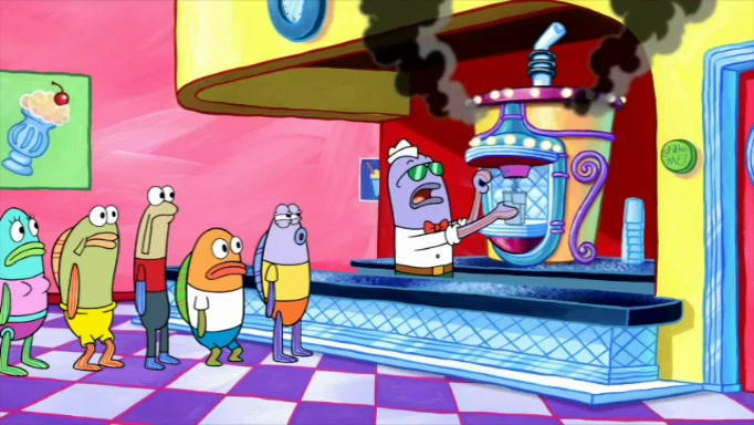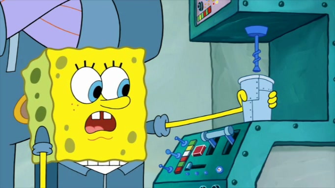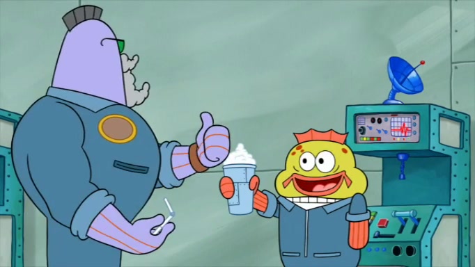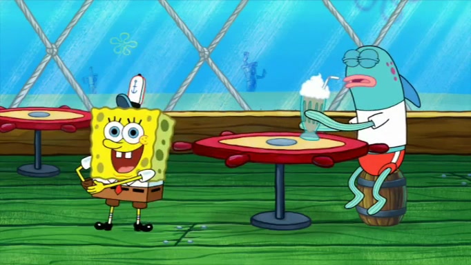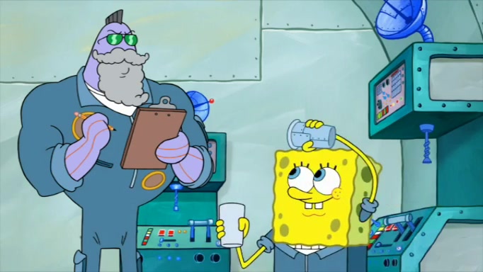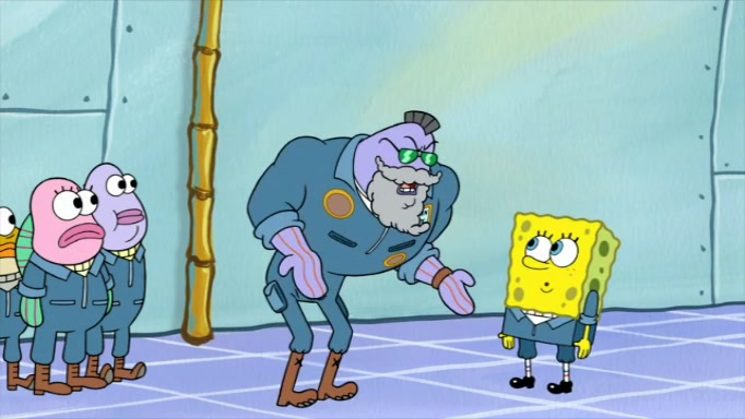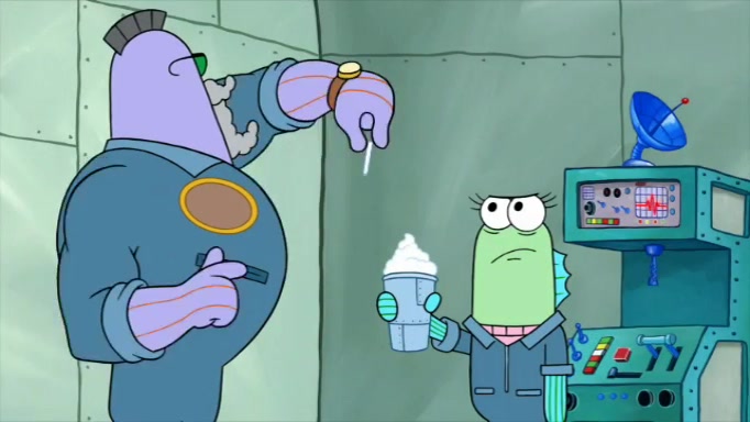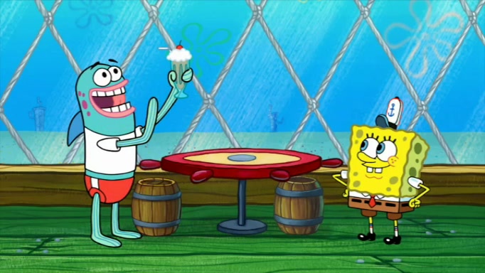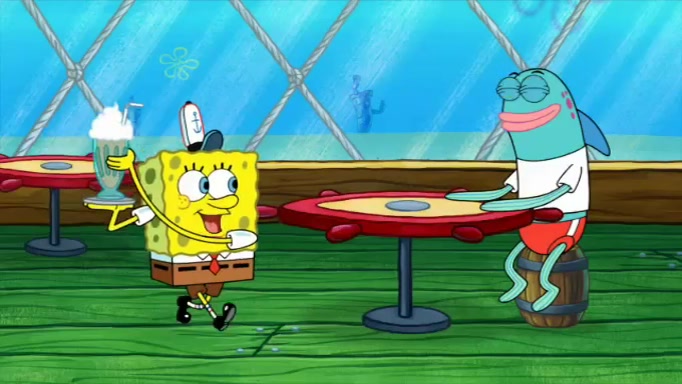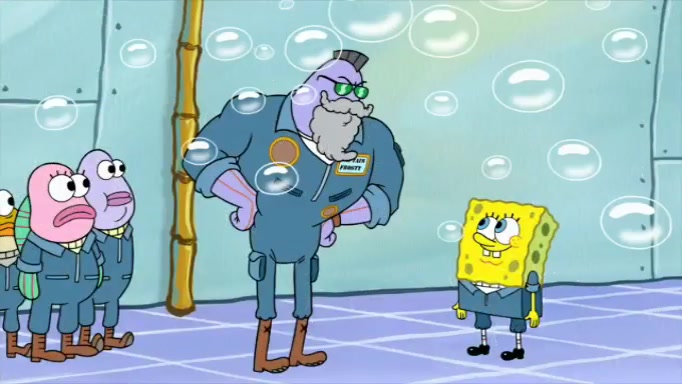 One day around lunchtime, while working and snogging the lips off his toy doll at the Krusty Krab, SpongeBob gets a last minute order to serve a milkshake which he has not made in years. SpongeBob decides to make a simple milkshake in a blender, and finishes it off by topping whipped cream and a cherry while walking out of the kitchen door. He serves it to Harold. But, Harold says it tastes horrible (and throws a temper tantrum, demanding a refund while angry). Mr. Krabs comes in and walks Harold out of the restaurant while telling him that SpongeBob will make a proper milkshake for him tomorrow. Mr. Krabs then puts SpongeBob in a a boatmobile and says he is taking him back to school. SpongeBob and Mr. Krabs later arrive at the Milkshake Academy and SpongeBob has to go here to learn how to make a proper milkshake again. Captain Frosty Mug tells the cadets to man their milkshake stations. When SpongeBob mans his station, he realizes that there are more buttons and contraptions than he's used to, but thinks he still can make a milkshake with no problem. But when he tries to mix the milkshake, he repeatedly pushes the wrong button. Frosty Mug comes over and has to inform SpongeBob that the controls are different and he has to push the button on the lower control panel. When SpongeBob manages to finally mix his milkshake, he lets Frosty Mug try it. However, when Frosty Mug tries it, the milkshake is frozen and it ends up in Frosty Mug's eye. Frosty Mug suggests they need to get back to the basics. He tells SpongeBob before he makes a milkshake, he needs to know what it feels like to be a milkshake. He makes him go in the Shake Simulator, which makes cadets who enter it into a milkshake-shaped blob. Frosty Mug sets the Simulator on "Obliterate," which makes the students gasp. A cadet reminds Frosty Mug that no one has ever survived Obliterate, to which he responds that he needs to learn. The simulator shakes, rattles, and rolls SpongeBob. Captain Frosty Mug decides to see how SpongeBob turned out and gets angry when he sees that he both survived and actually found it fun. Angry, Frosty Mug says that he's never had such an "unteachable moron" in 30 years. He asks his students to tell him how he could teach SpongeBob how to make a milkshake (with one student replying, "You'd be better off teaching a piece of coral, sir!," to which the students laugh at). SpongeBob replies that he'll show the students that he can make a milkshake. However, during the courses of making a milkshake, SpongeBob fails doing them all. During graduation, SpongeBob expects to get his milkshake license at this event. However, Captain Frosty Mug gives everyone milkshake licenses except for SpongeBob, because he couldn't even get past Step #1 of making a milkshake. SpongeBob tells Frosty Mug that he will keep trying. Captain Frostymug tells him he needs to put the milkshake up to the spinney thing. Then, he stops, flashing back to 20 years ago.