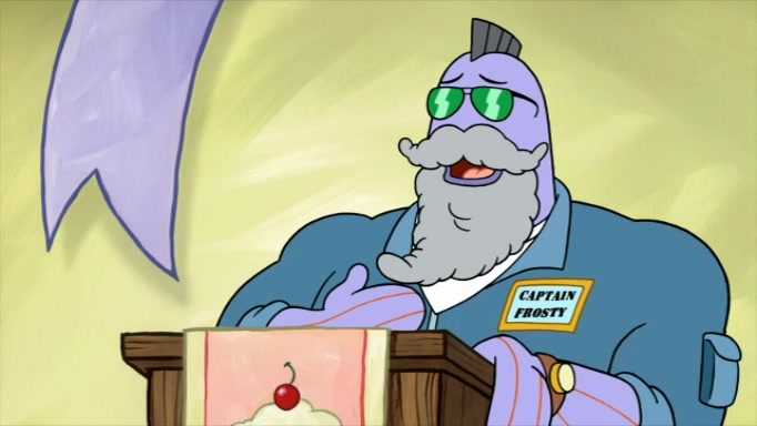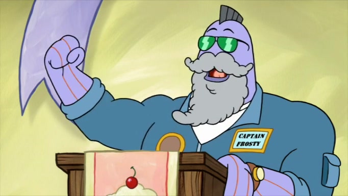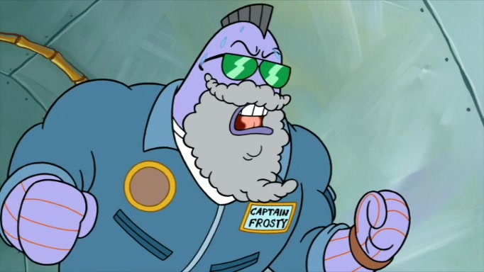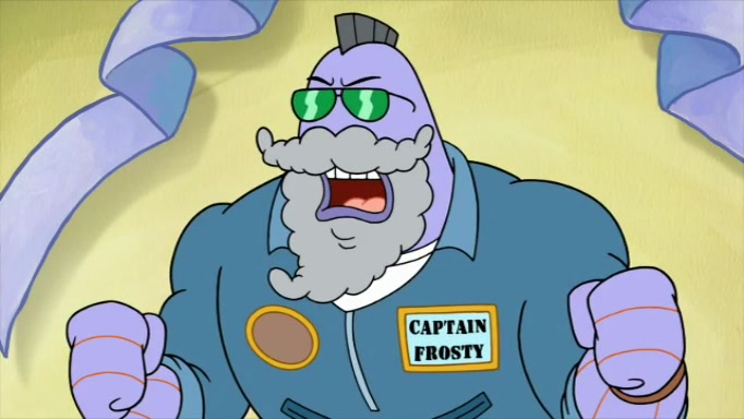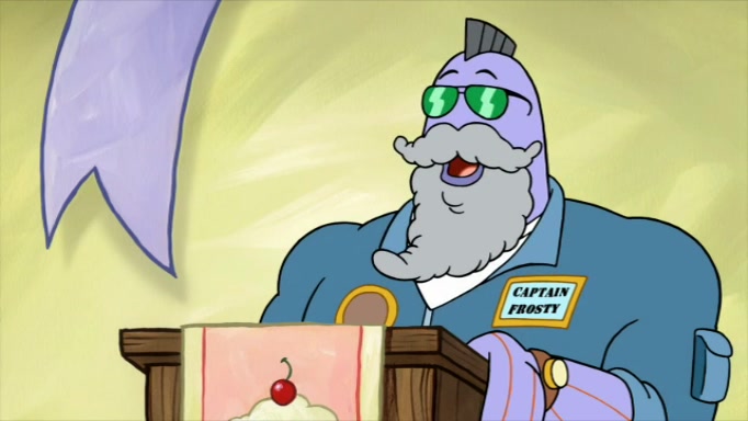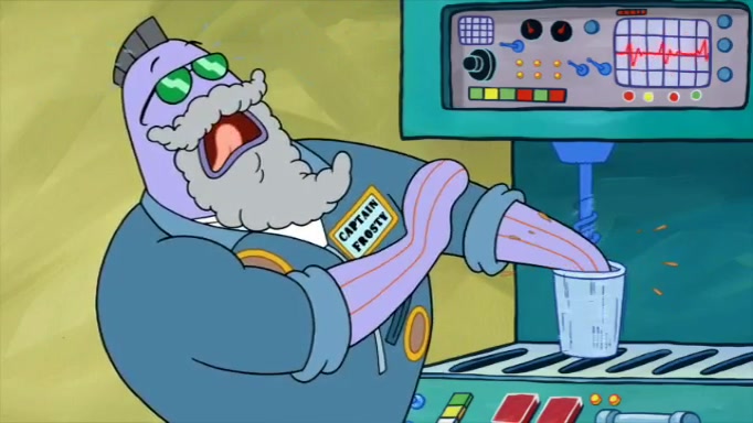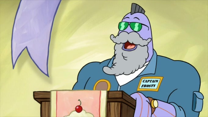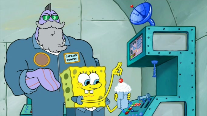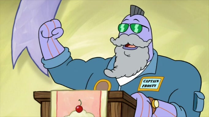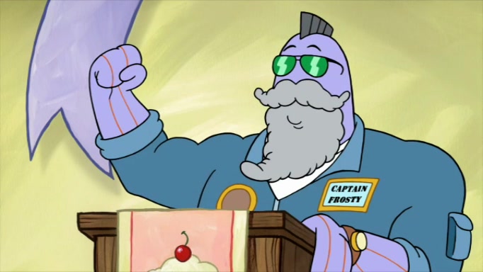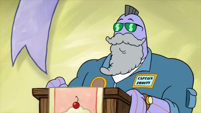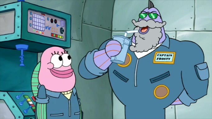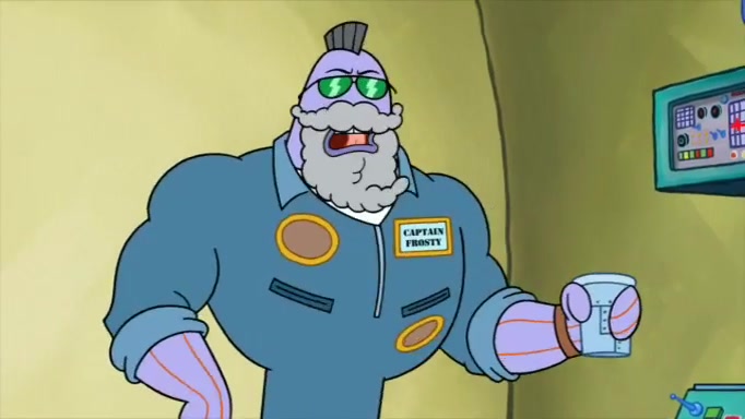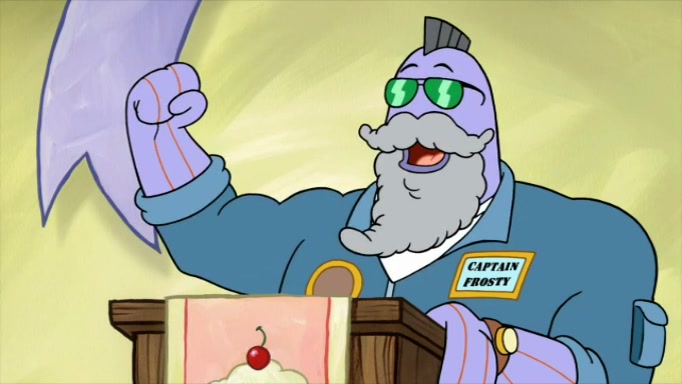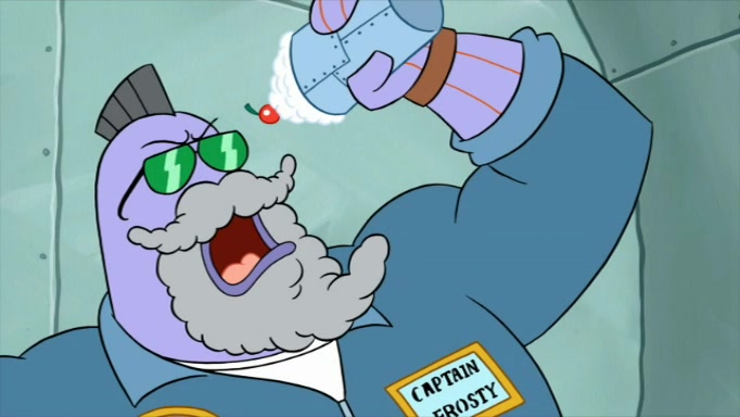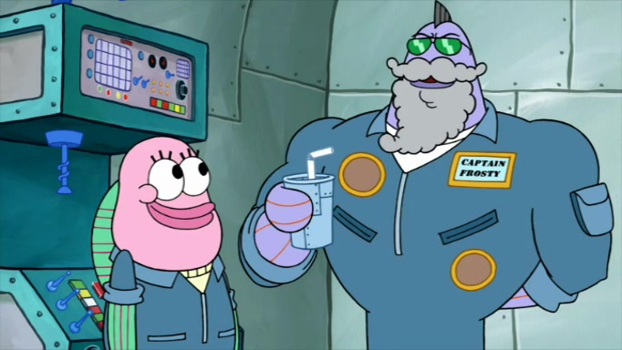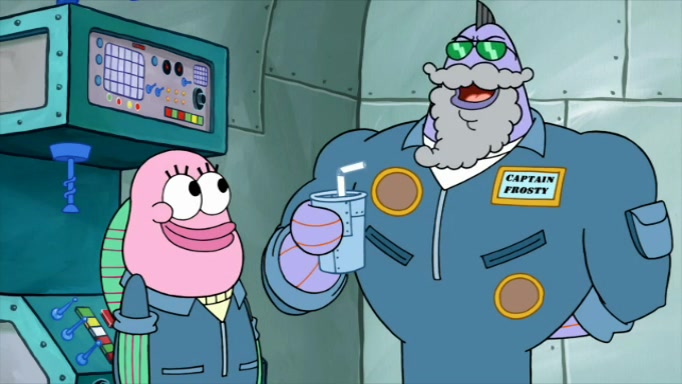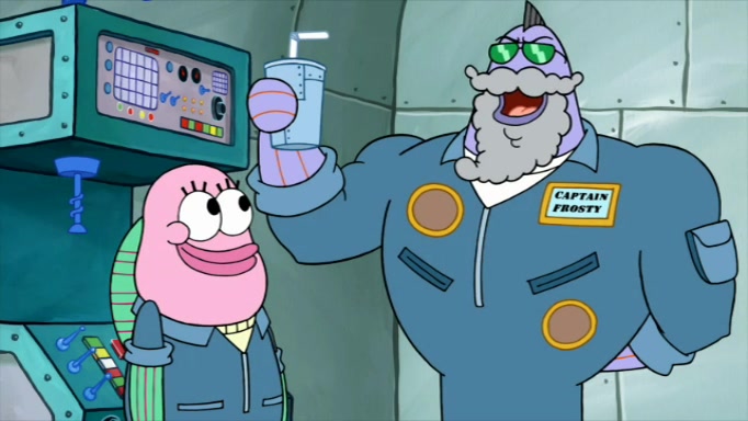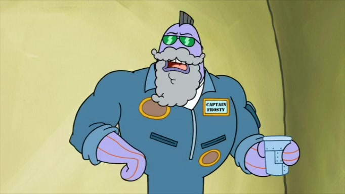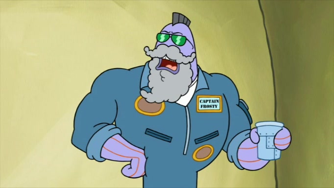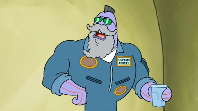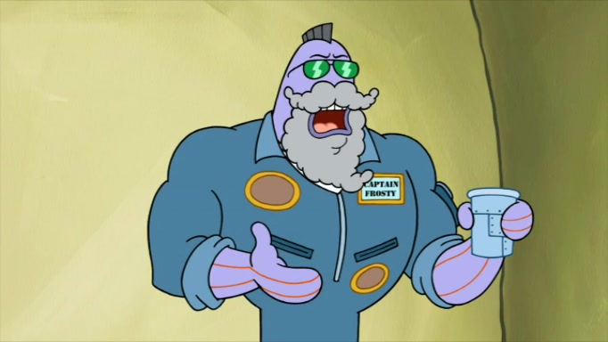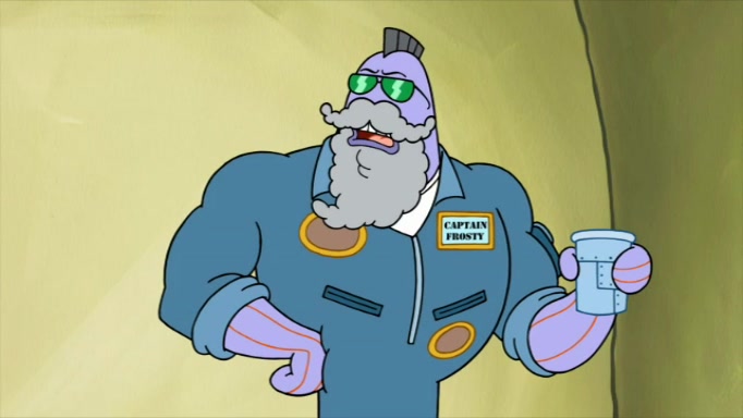 He was the owner of a milkshake cafe called Milk Shake. Many customers were excited to have Frosty Mug's milkshakes. However, when he tried to make a milkshake for an eager customer, he ended up splattering the milkshake all over the store. A stain of milkshake got on the power lines that connect to the milkshake machine, destroying it. The milkshake machine squirted out milkshake stains onto the customers, frightening them and ruining Frostymug's career. He informs SpongeBob that he has not touched the milkshake machine in 20 years. He gets his hand stuck in the machine. He is about to get his arm and all of him sucked into the machine, but SpongeBob is able to grab and save him just before the machine can suck him in. The machine ends up exploding, but Frosty Mug thanks SpongeBob for saving him. Thanks to the machine incident, Frostymug's arm is hurt. He realizes that he doesn't need a machine to make a milkshake and tells SpongeBob that a milkshake comes from within the heart. The next day, at the Krusty Krab, SpongeBob serves Harold a milkshake, which he replies is the best he's ever had. Everyone now wants to buy SpongeBob's milkshake. Captain Frosty Mug comes in, requesting a milkshake and gives SpongeBob his new milkshake license to which SpongeBob replies, "If only it were this easy to get a boating license" and laughs, ending the episode.