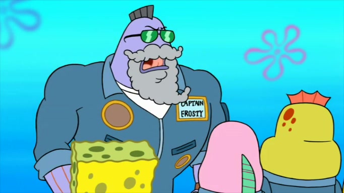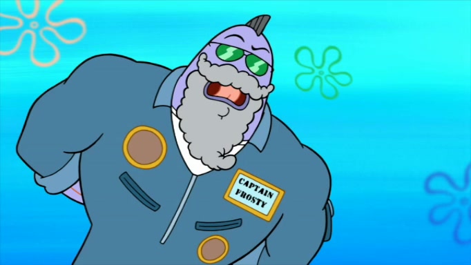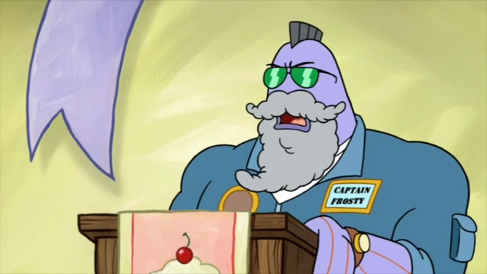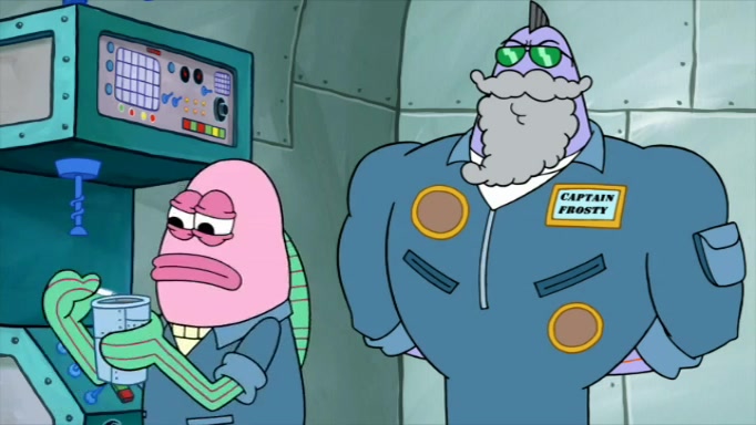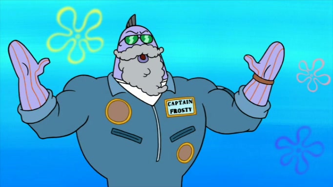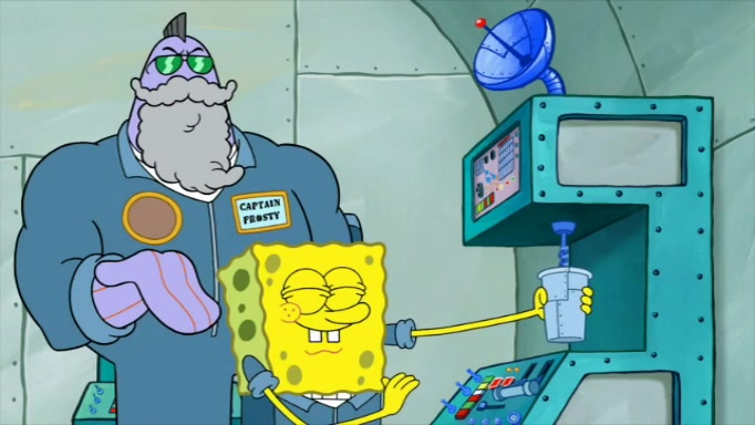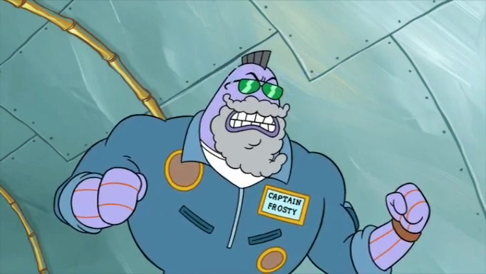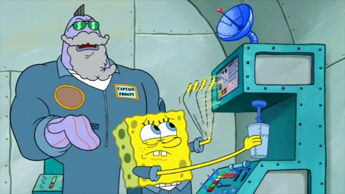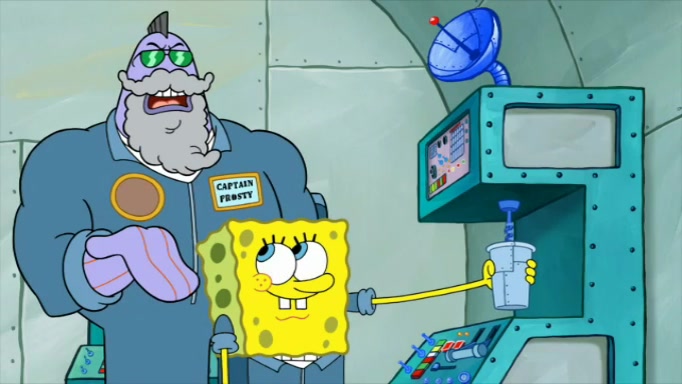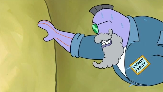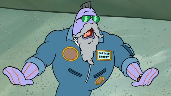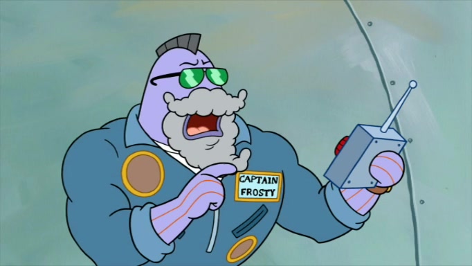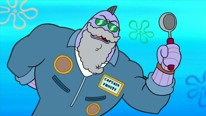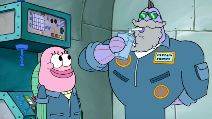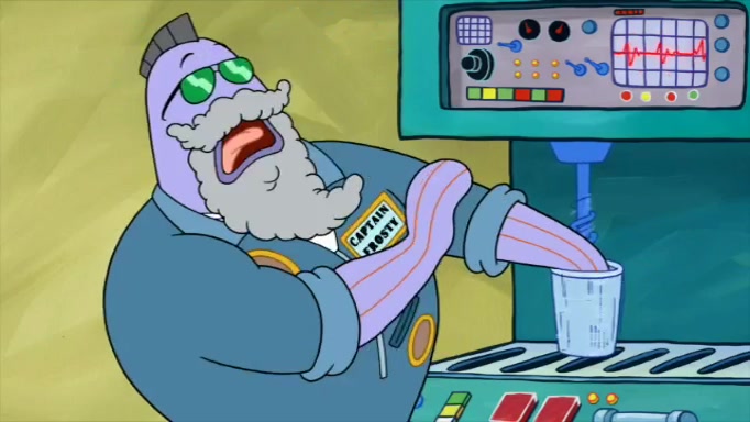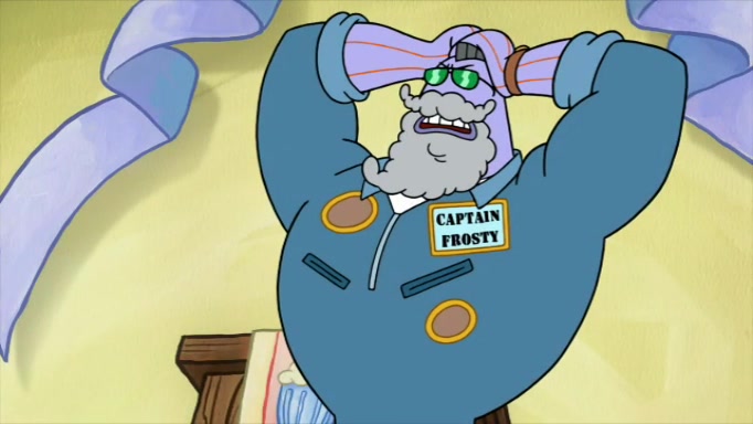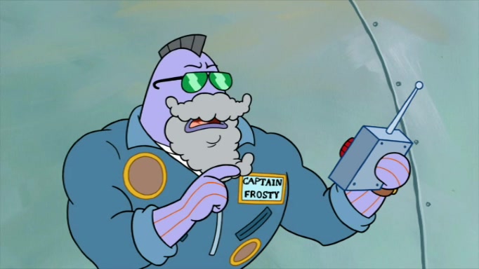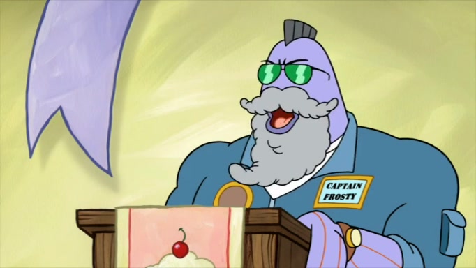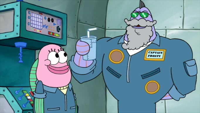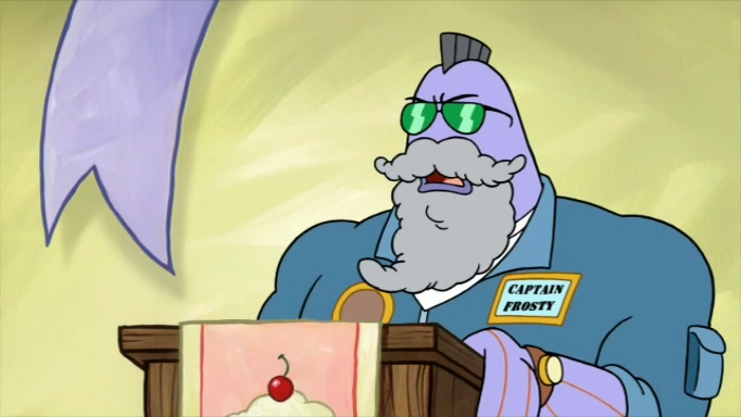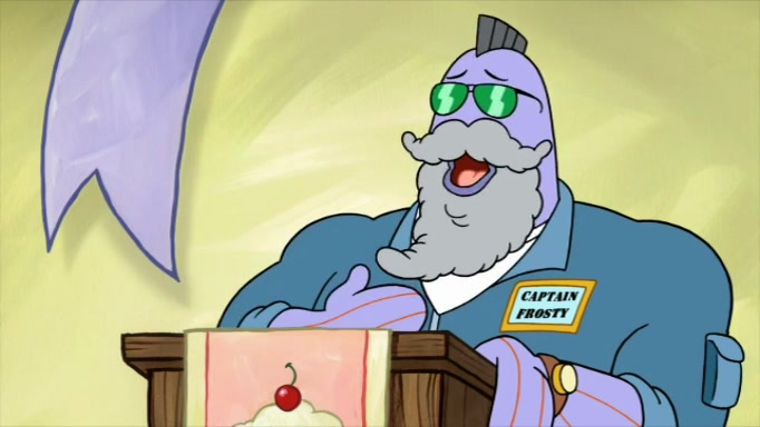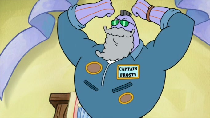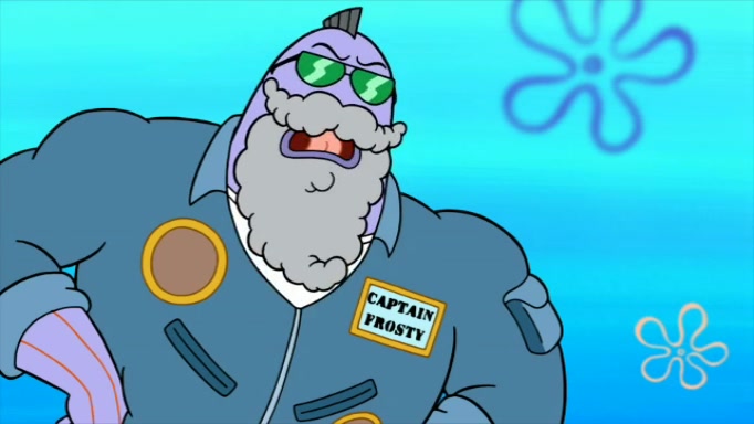 He was the owner of a milkshake cafe called Milk Shake. Many customers were excited to have Frosty Mug's milkshakes. However, when he tried to make a milkshake for an eager customer, he ended up splattering the milkshake all over the store. A stain of milkshake got on the power lines that connect to the milkshake machine, destroying it. The milkshake machine squirted out milkshake stains onto the customers, frightening them and ruining Frostymug's career. He informs SpongeBob that he has not touched the milkshake machine in 20 years. He gets his hand stuck in the machine. He is about to get his arm and all of him sucked into the machine, but SpongeBob is able to grab and save him just before the machine can suck him in. The machine ends up exploding, but Frosty Mug thanks SpongeBob for saving him. Thanks to the machine incident, Frostymug's arm is hurt. He realizes that he doesn't need a machine to make a milkshake and tells SpongeBob that a milkshake comes from within the heart. The next day, at the Krusty Krab, SpongeBob serves Harold a milkshake, which he replies is the best he's ever had. Everyone now wants to buy SpongeBob's milkshake. Captain Frosty Mug comes in, requesting a milkshake and gives SpongeBob his new milkshake license to which SpongeBob replies, "If only it were this easy to get a boating license" and laughs, ending the episode.