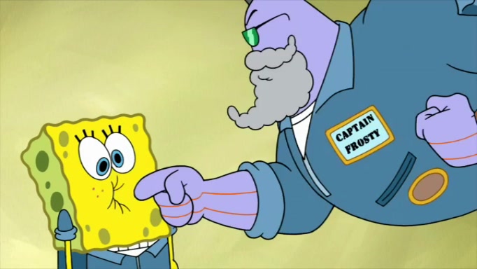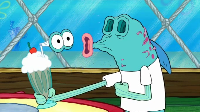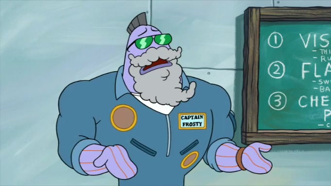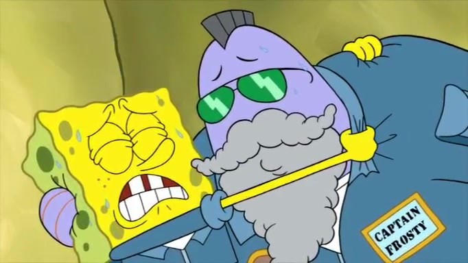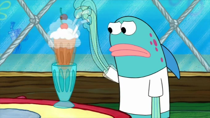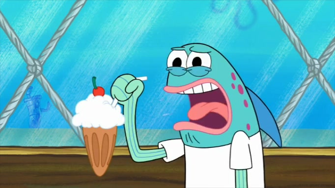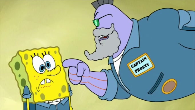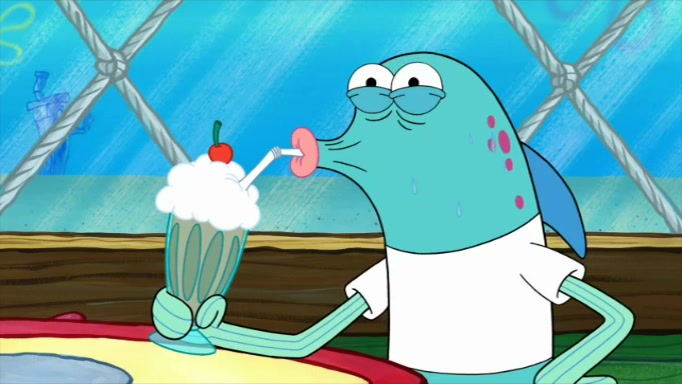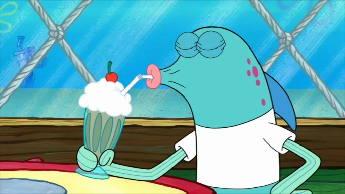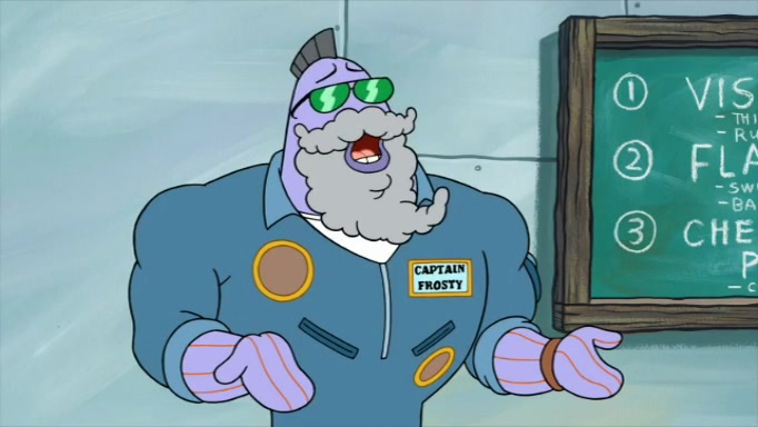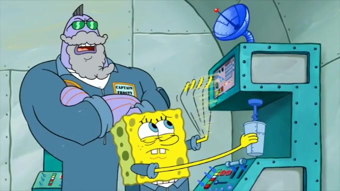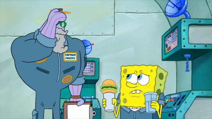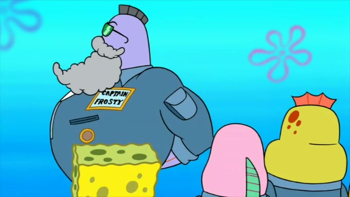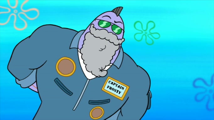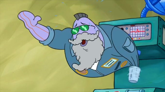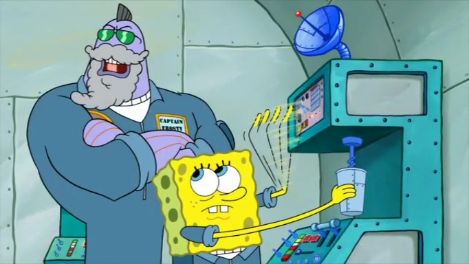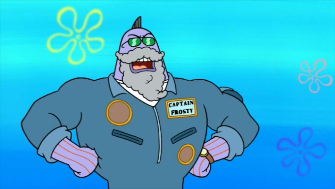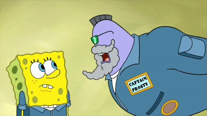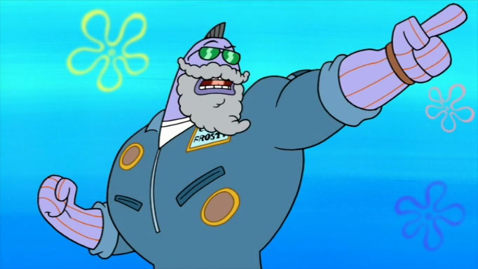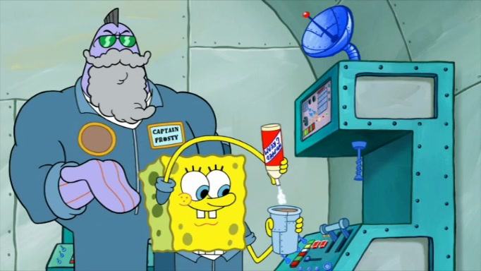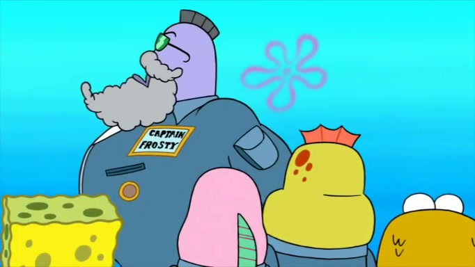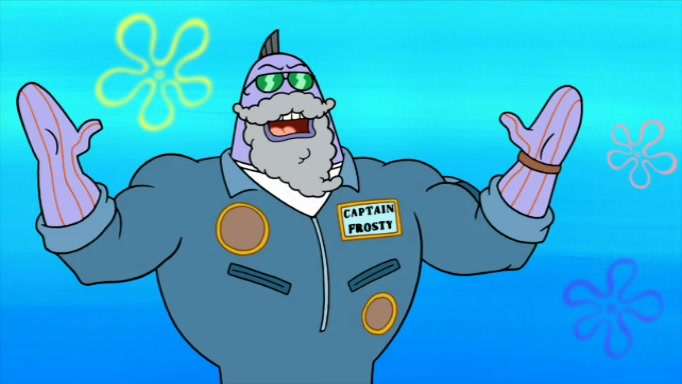 He was the owner of a milkshake cafe called Milk Shake. Many customers were excited to have Frosty Mug's milkshakes. However, when he tried to make a milkshake for an eager customer, he ended up splattering the milkshake all over the store. A stain of milkshake got on the power lines that connect to the milkshake machine, destroying it. The milkshake machine squirted out milkshake stains onto the customers, frightening them and ruining Frostymug's career. He informs SpongeBob that he has not touched the milkshake machine in 20 years. He gets his hand stuck in the machine. He is about to get his arm and all of him sucked into the machine, but SpongeBob is able to grab and save him just before the machine can suck him in. The machine ends up exploding, but Frosty Mug thanks SpongeBob for saving him. Thanks to the machine incident, Frostymug's arm is hurt. He realizes that he doesn't need a machine to make a milkshake and tells SpongeBob that a milkshake comes from within the heart. The next day, at the Krusty Krab, SpongeBob serves Harold a milkshake, which he replies is the best he's ever had. Everyone now wants to buy SpongeBob's milkshake. Captain Frosty Mug comes in, requesting a milkshake and gives SpongeBob his new milkshake license to which SpongeBob replies, "If only it were this easy to get a boating license" and laughs, ending the episode.