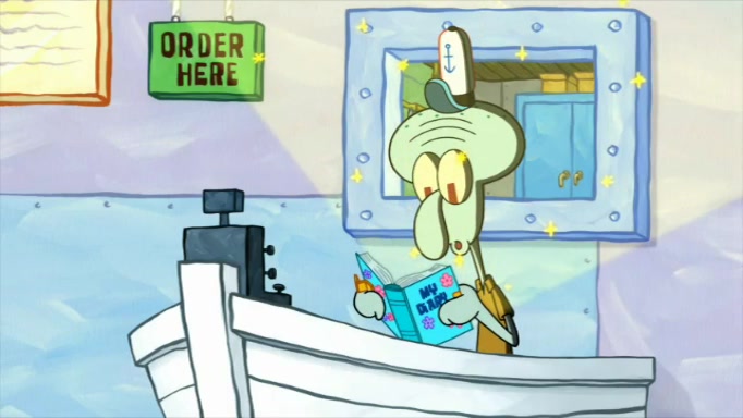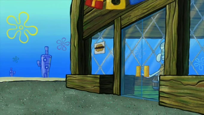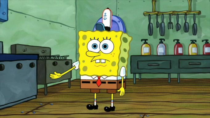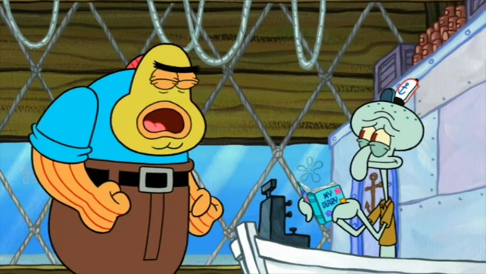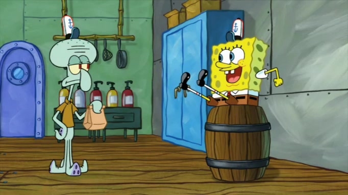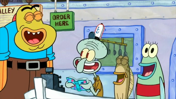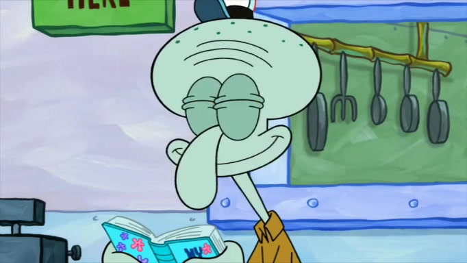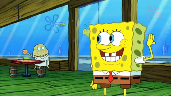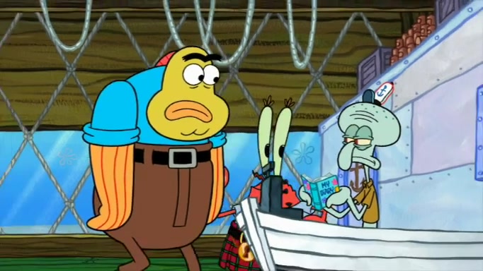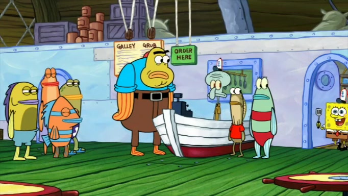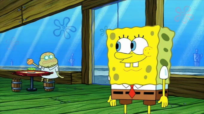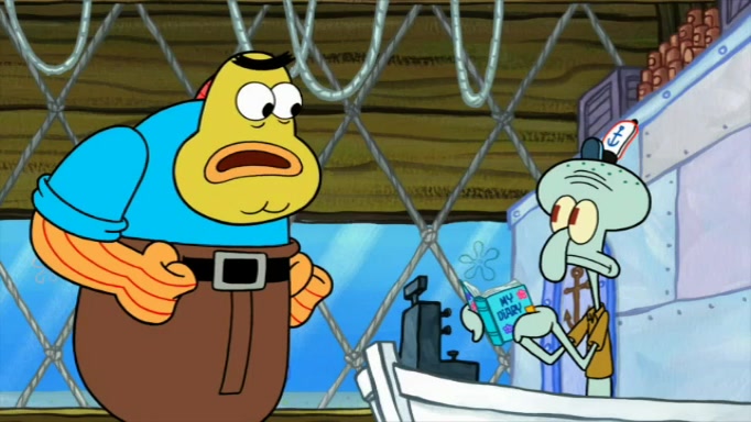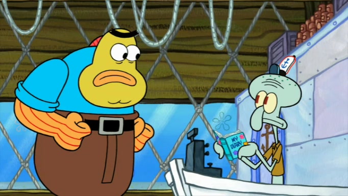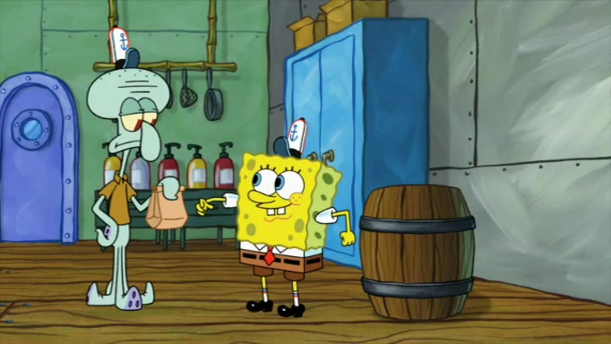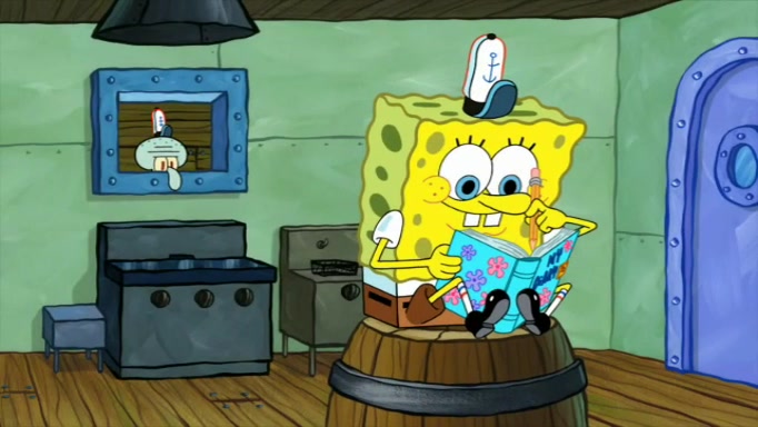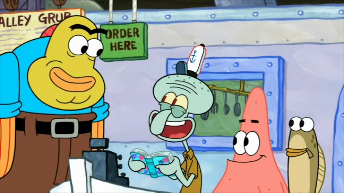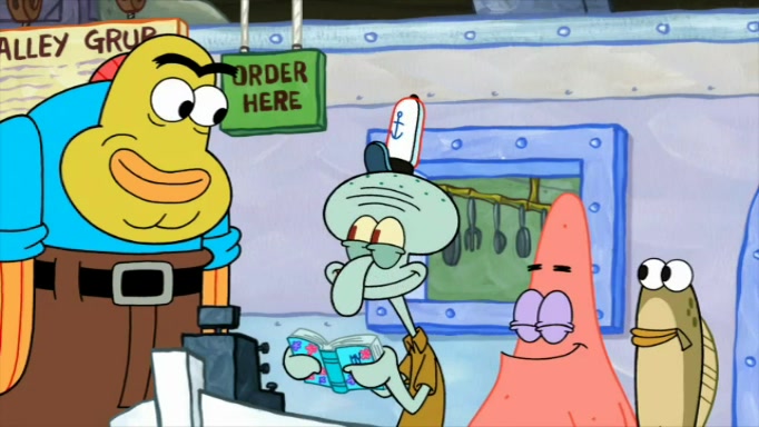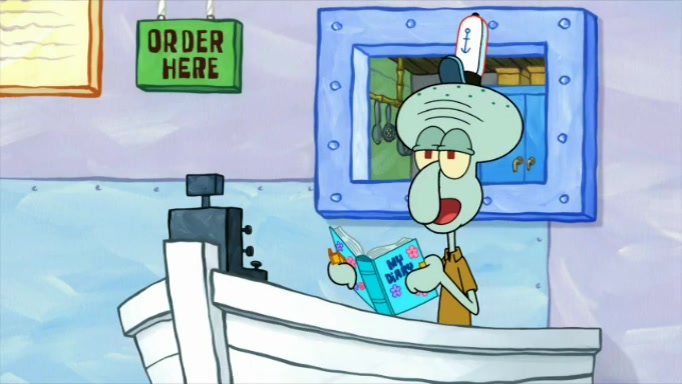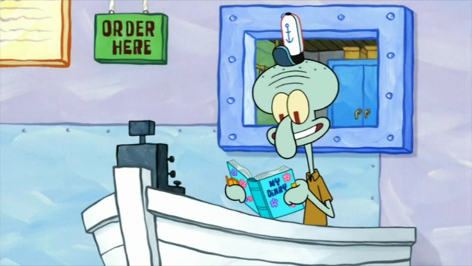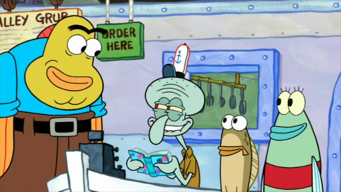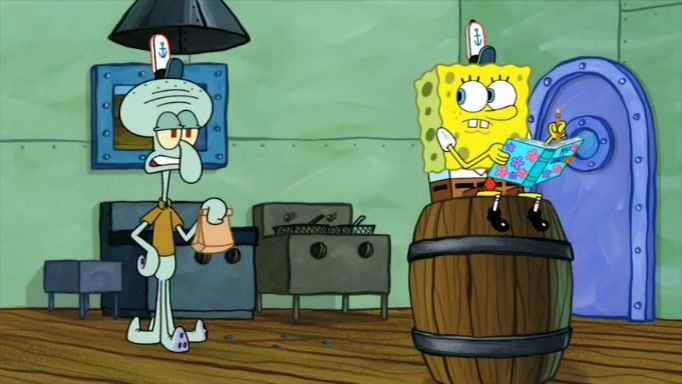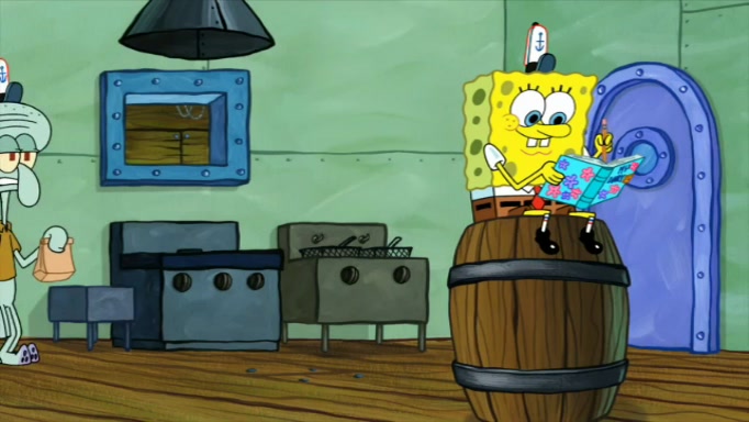 The episode starts off at the Krusty Krab, where business is slow. As a result, Squidward decides to rest. Before he even gets a chance to start relaxing, a whole bunch of fish come. Squidward freaks out when he realizes SpongeBob isn't making Krabby Patties. Squidward then finds SpongeBob in a barrel. He screams at him, resulting in SpongeBob melting out of the barrel. SpongeBob makes the food and serves everybody while Squidward finds a book in the barrel. Then, SpongeBob grabs it and puts it in between the two frying baskets.