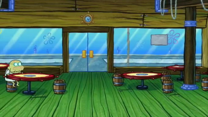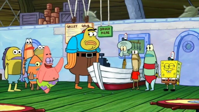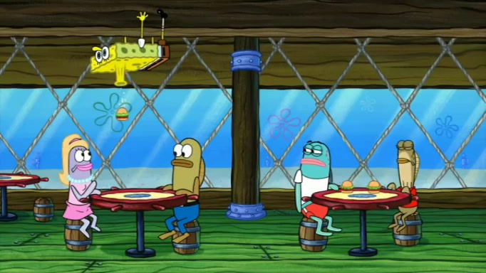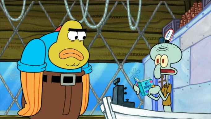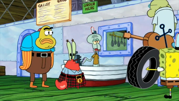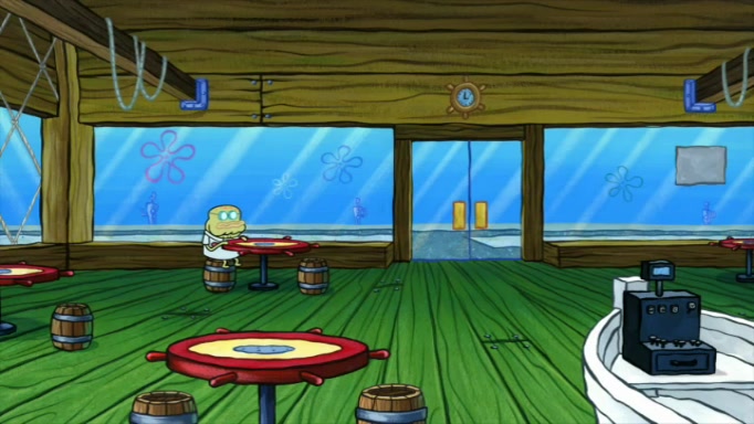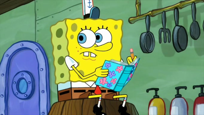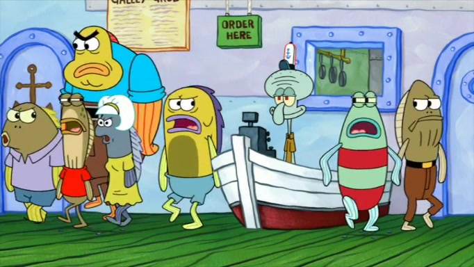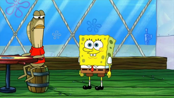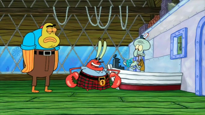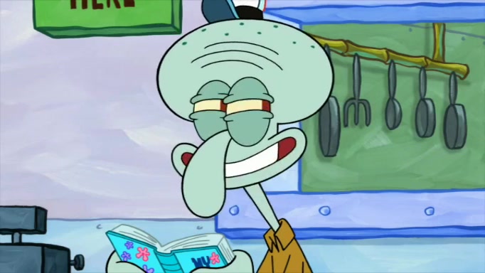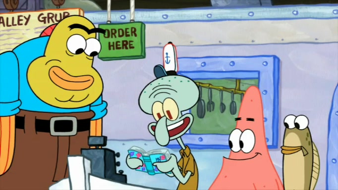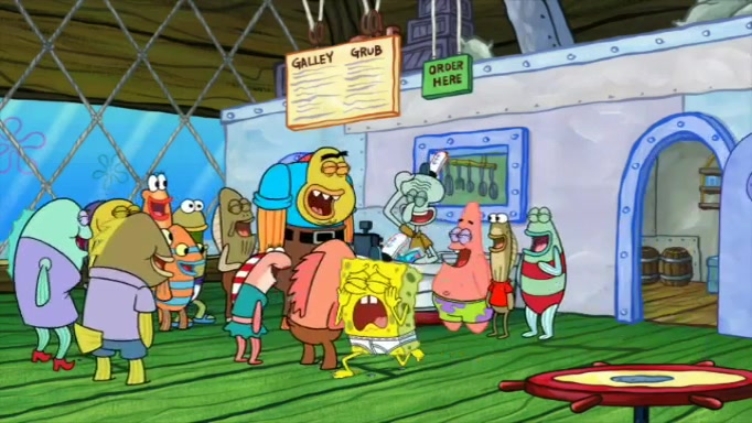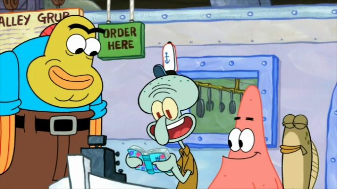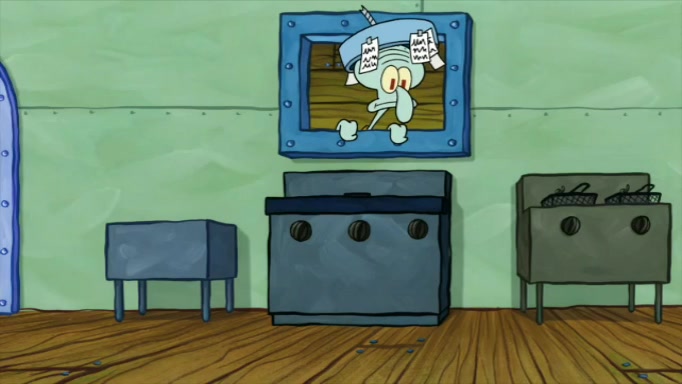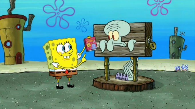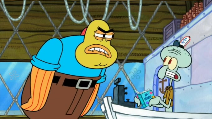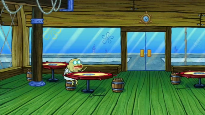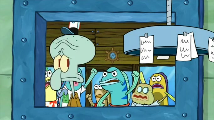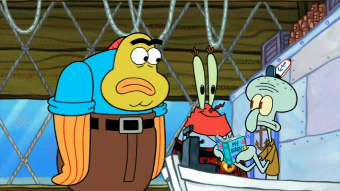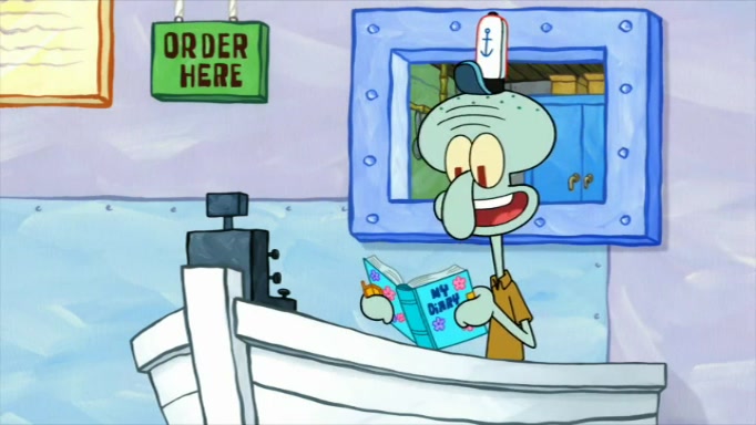 The episode starts off at the Krusty Krab, where business is slow. As a result, Squidward decides to rest. Before he even gets a chance to start relaxing, a whole bunch of fish come. Squidward freaks out when he realizes SpongeBob isn't making Krabby Patties. Squidward then finds SpongeBob in a barrel. He screams at him, resulting in SpongeBob melting out of the barrel. SpongeBob makes the food and serves everybody while Squidward finds a book in the barrel. Then, SpongeBob grabs it and puts it in between the two frying baskets.
