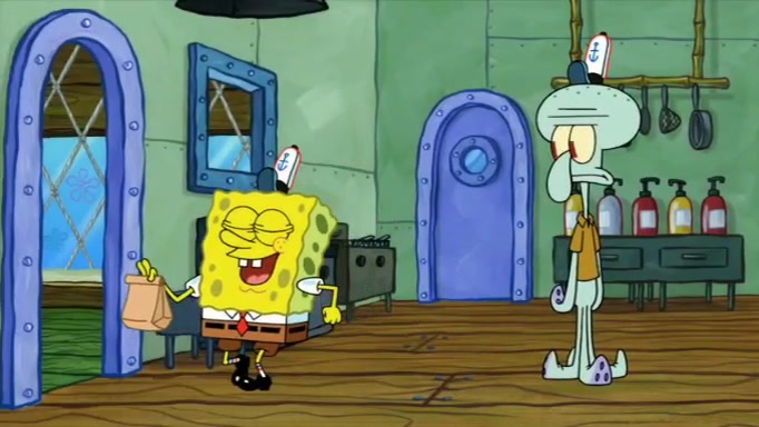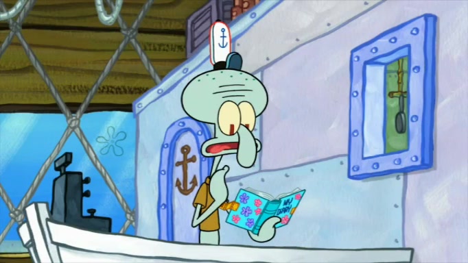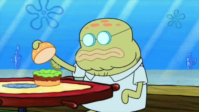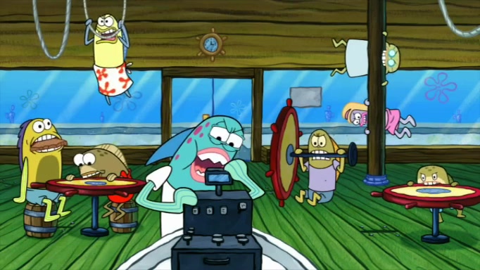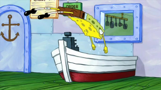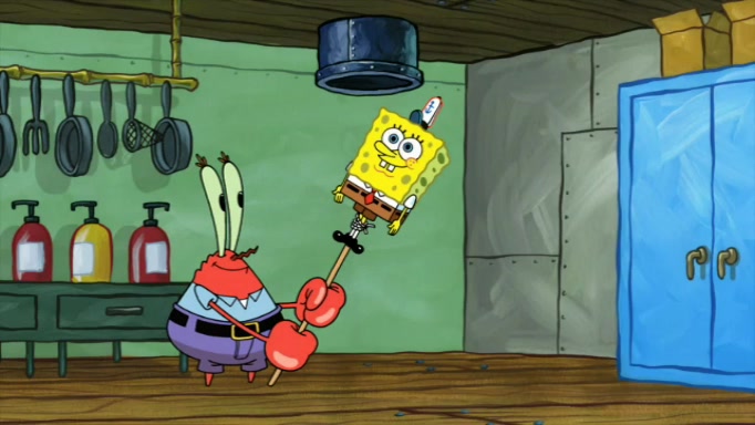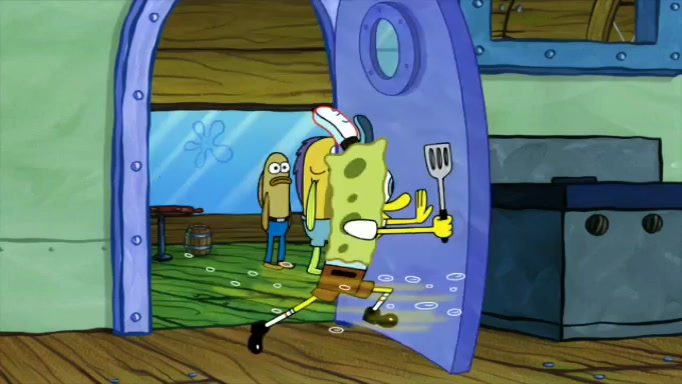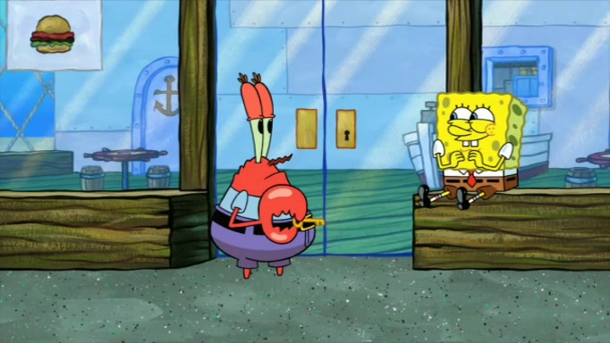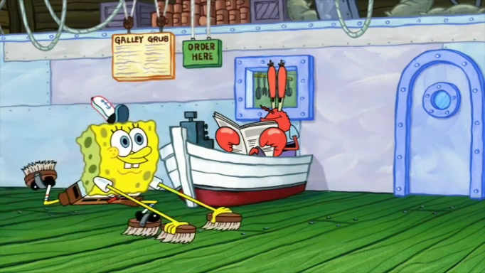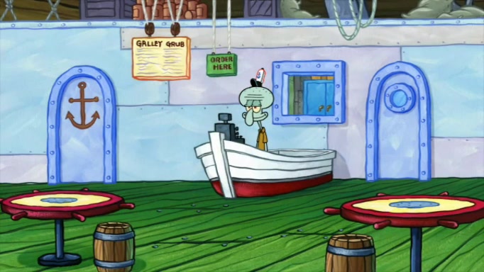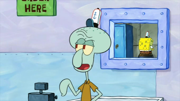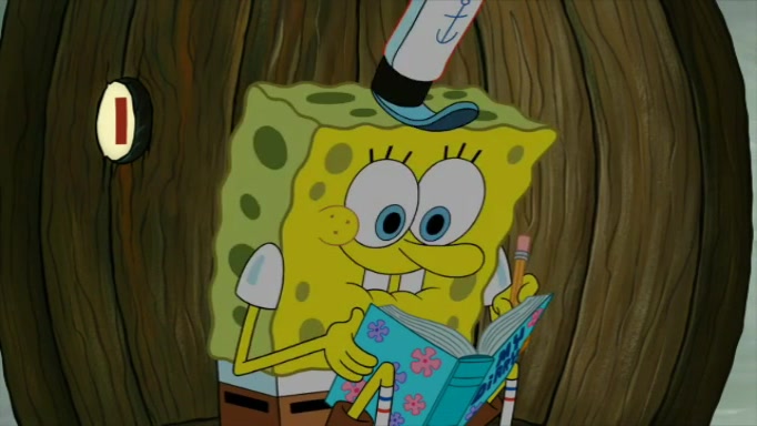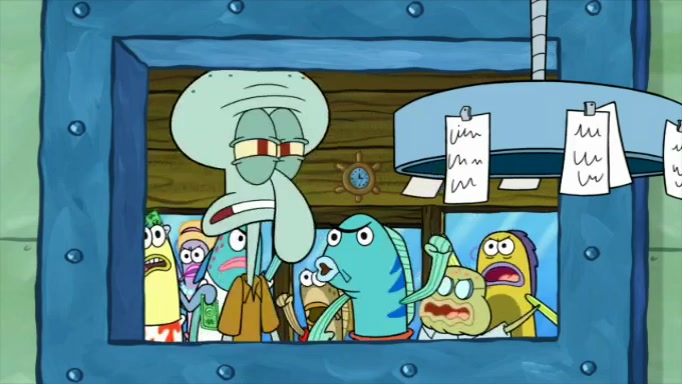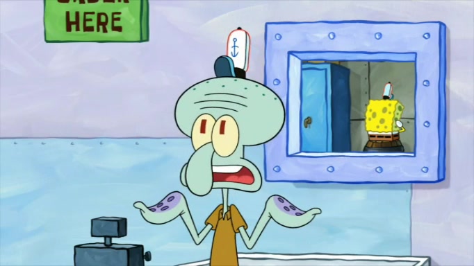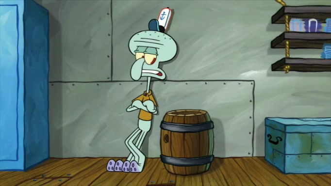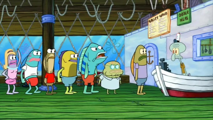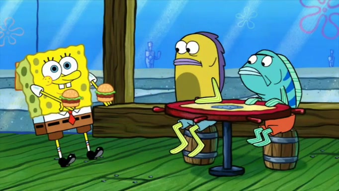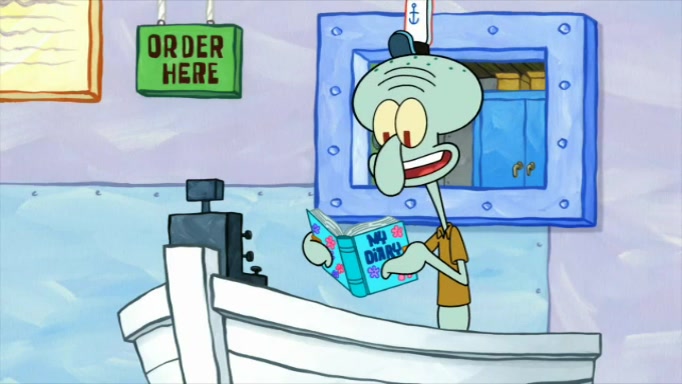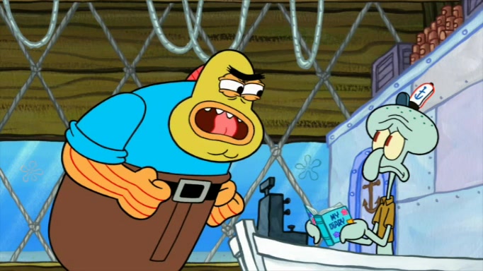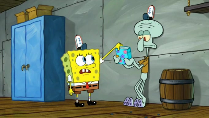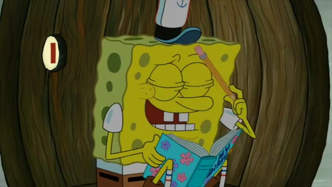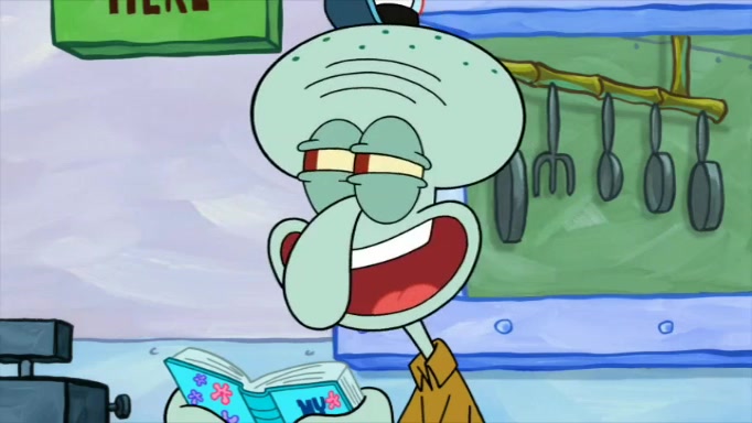 The episode starts off at the Krusty Krab, where business is slow. As a result, Squidward decides to rest. Before he even gets a chance to start relaxing, a whole bunch of fish come. Squidward freaks out when he realizes SpongeBob isn't making Krabby Patties. Squidward then finds SpongeBob in a barrel. He screams at him, resulting in SpongeBob melting out of the barrel. SpongeBob makes the food and serves everybody while Squidward finds a book in the barrel. Then, SpongeBob grabs it and puts it in between the two frying baskets.