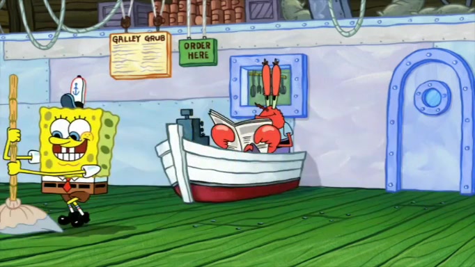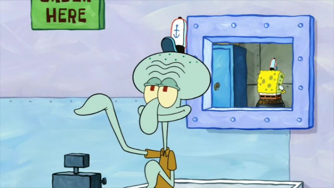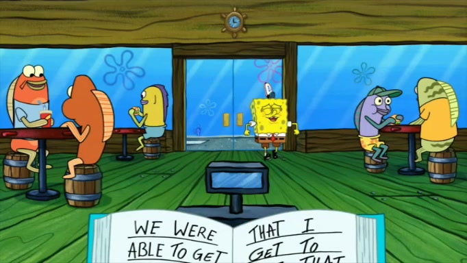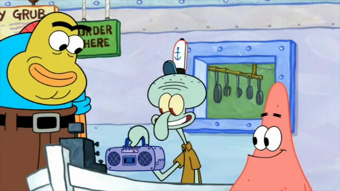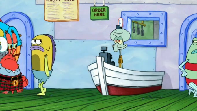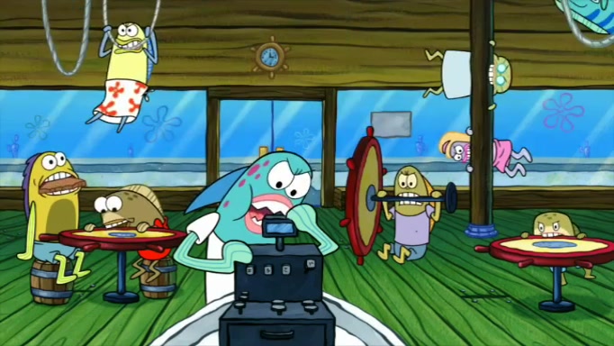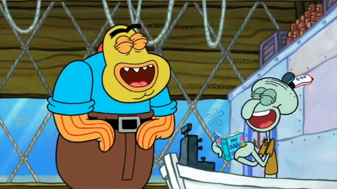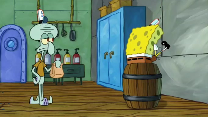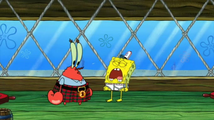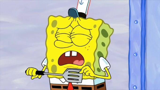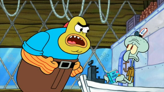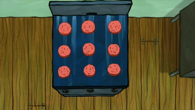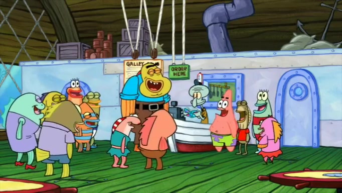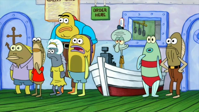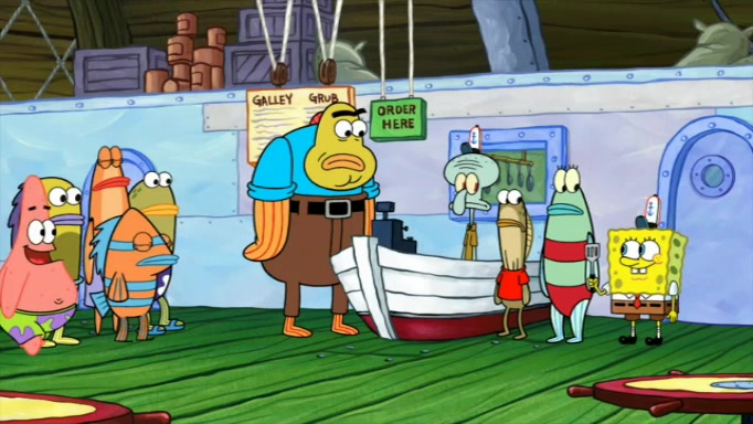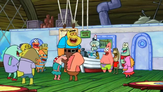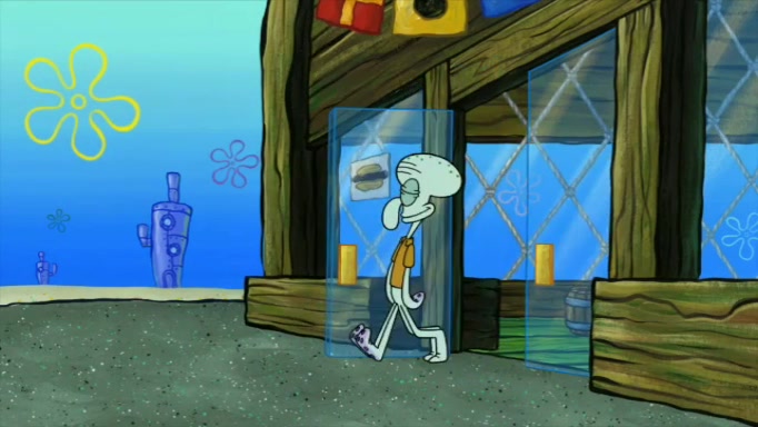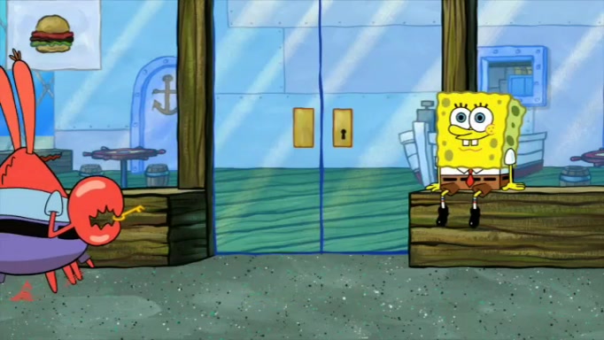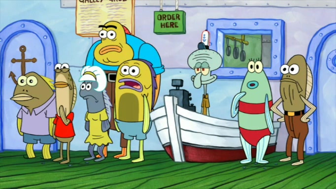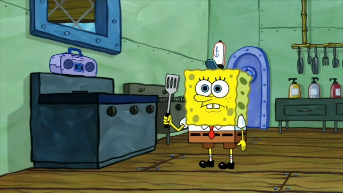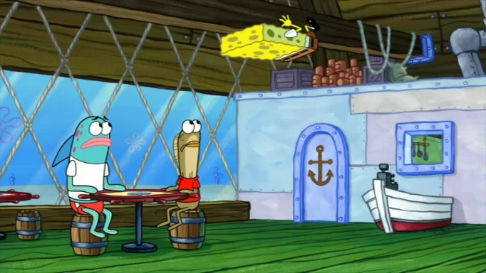 The episode starts off at the Krusty Krab, where business is slow. As a result, Squidward decides to rest. Before he even gets a chance to start relaxing, a whole bunch of fish come. Squidward freaks out when he realizes SpongeBob isn't making Krabby Patties. Squidward then finds SpongeBob in a barrel. He screams at him, resulting in SpongeBob melting out of the barrel. SpongeBob makes the food and serves everybody while Squidward finds a book in the barrel. Then, SpongeBob grabs it and puts it in between the two frying baskets.