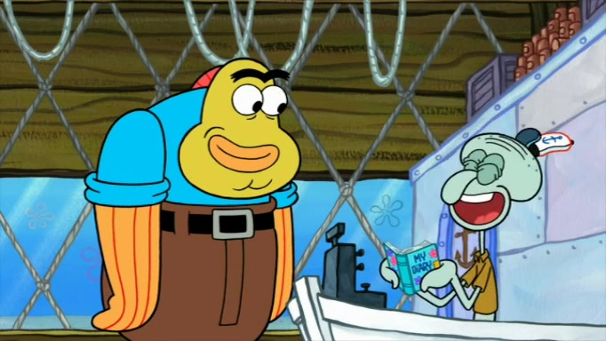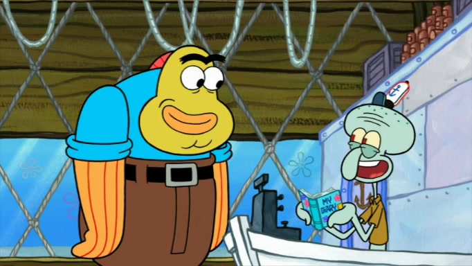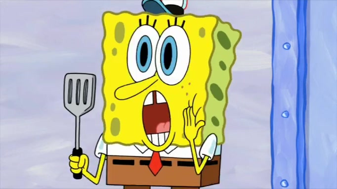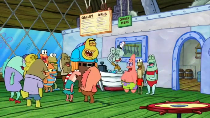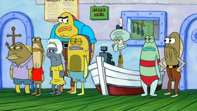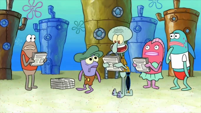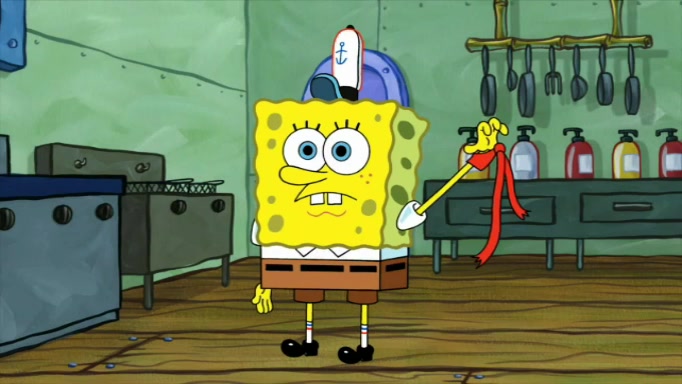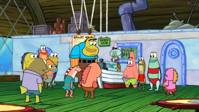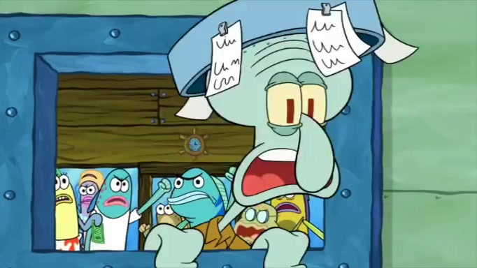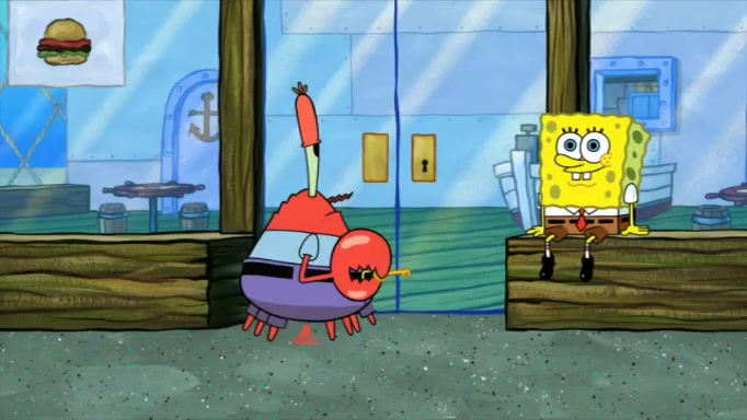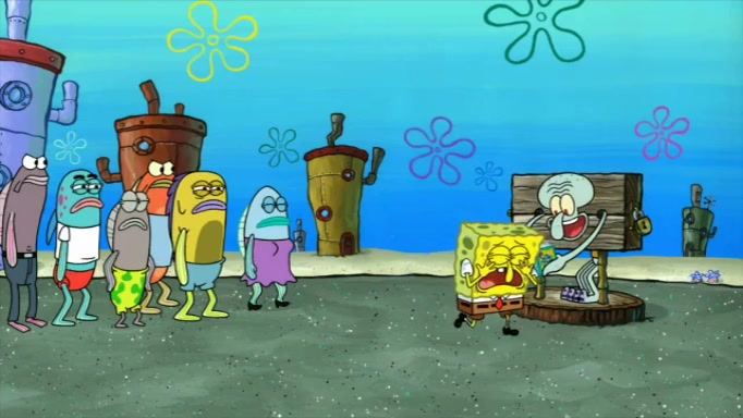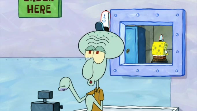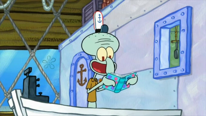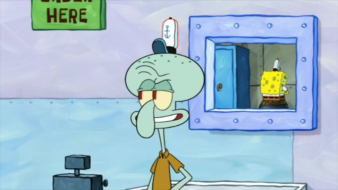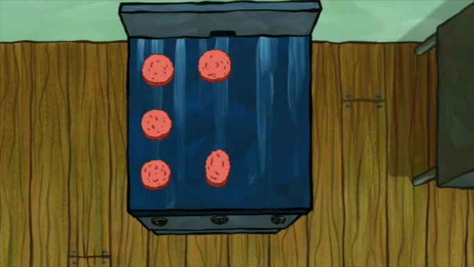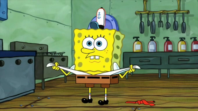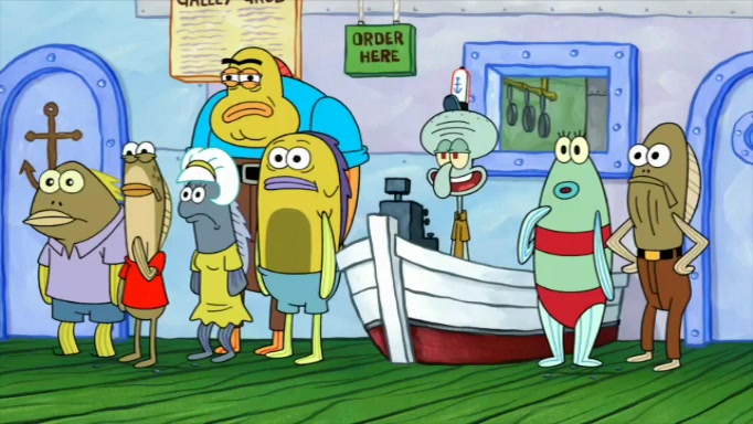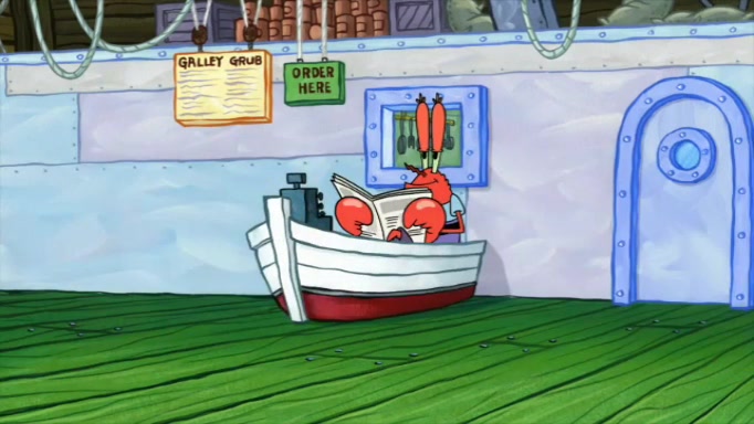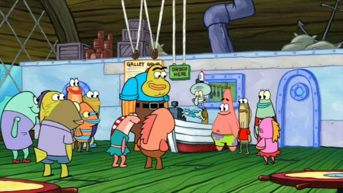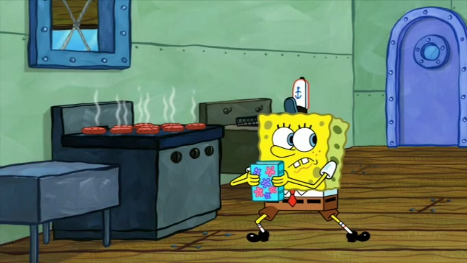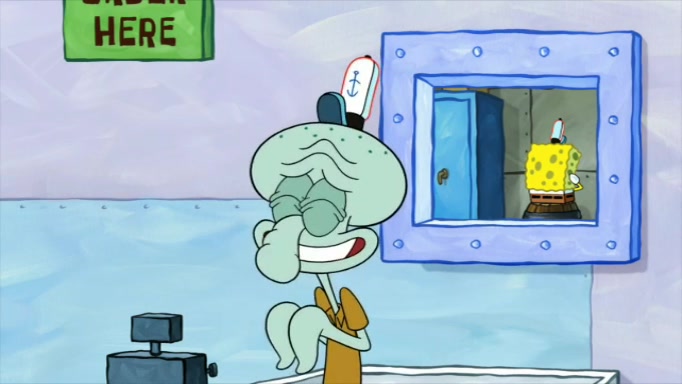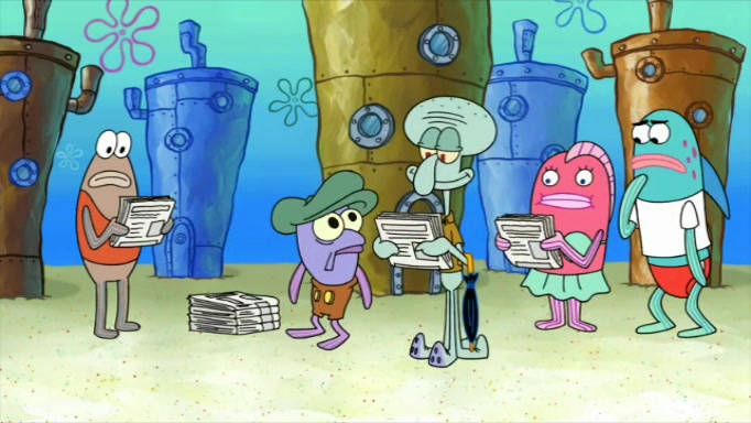 The episode starts off at the Krusty Krab, where business is slow. As a result, Squidward decides to rest. Before he even gets a chance to start relaxing, a whole bunch of fish come. Squidward freaks out when he realizes SpongeBob isn't making Krabby Patties. Squidward then finds SpongeBob in a barrel. He screams at him, resulting in SpongeBob melting out of the barrel. SpongeBob makes the food and serves everybody while Squidward finds a book in the barrel. Then, SpongeBob grabs it and puts it in between the two frying baskets.