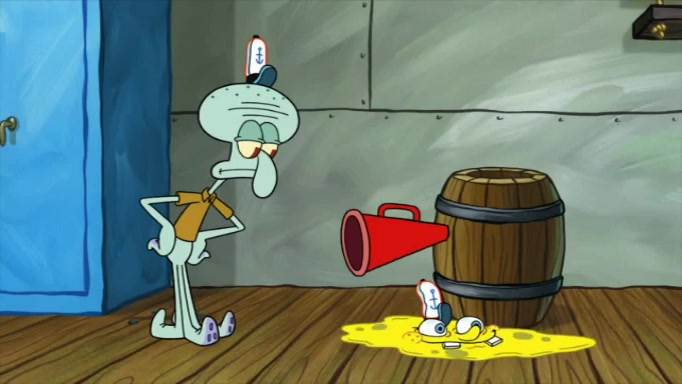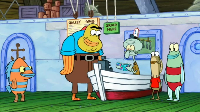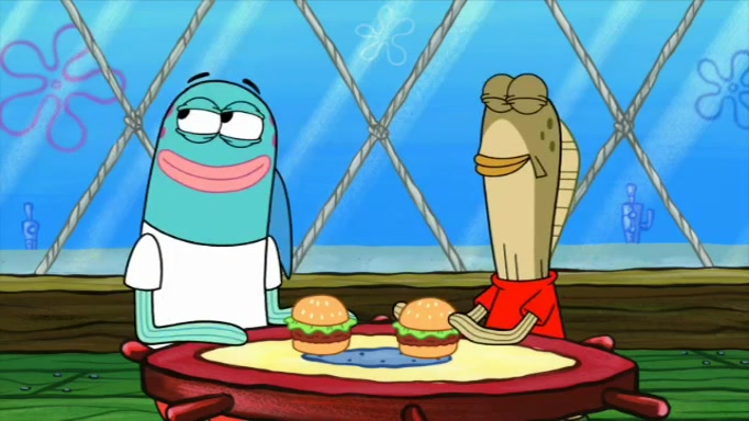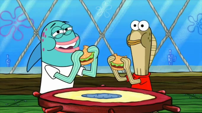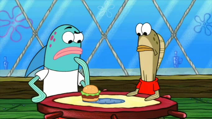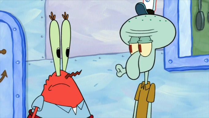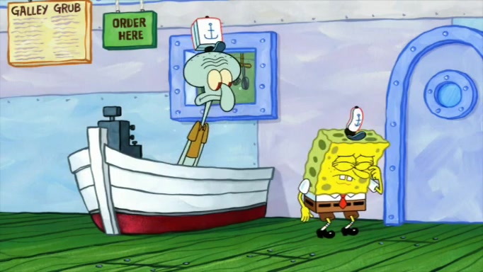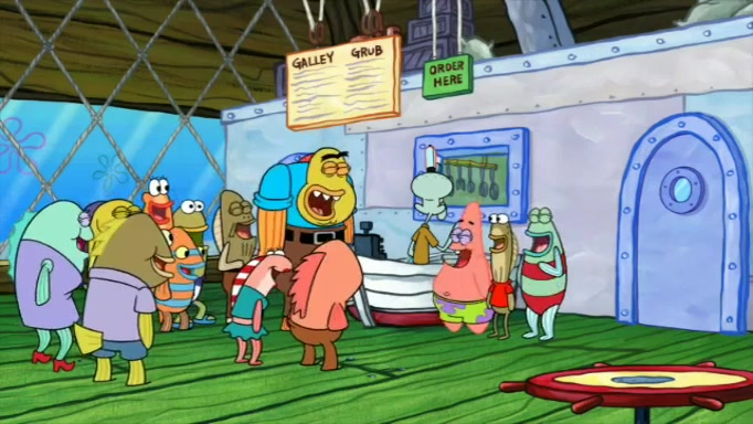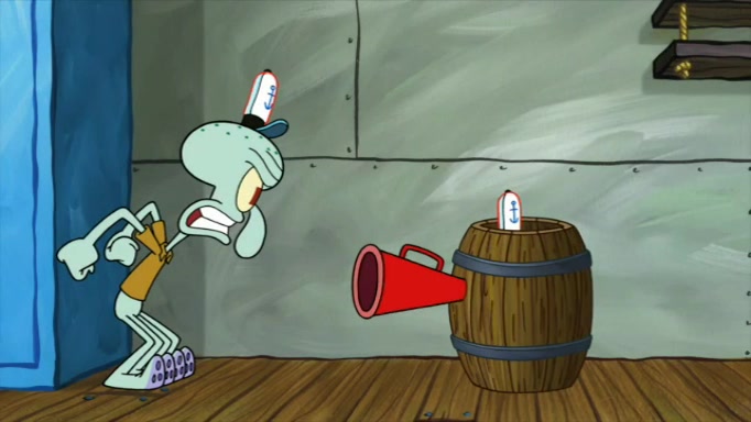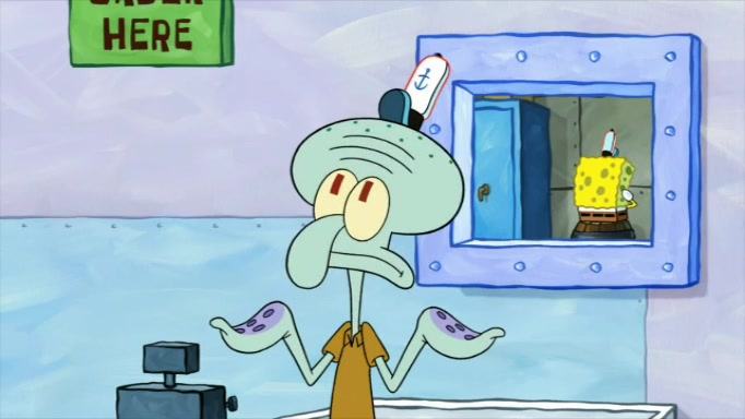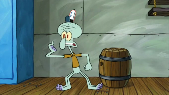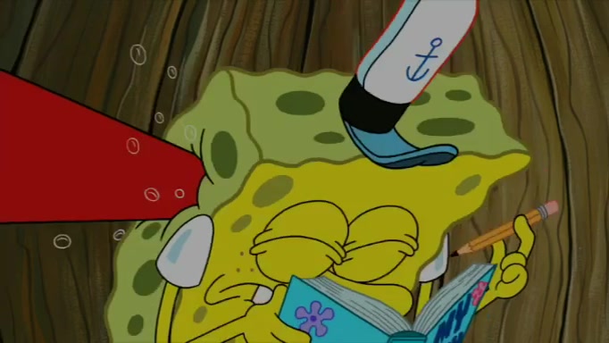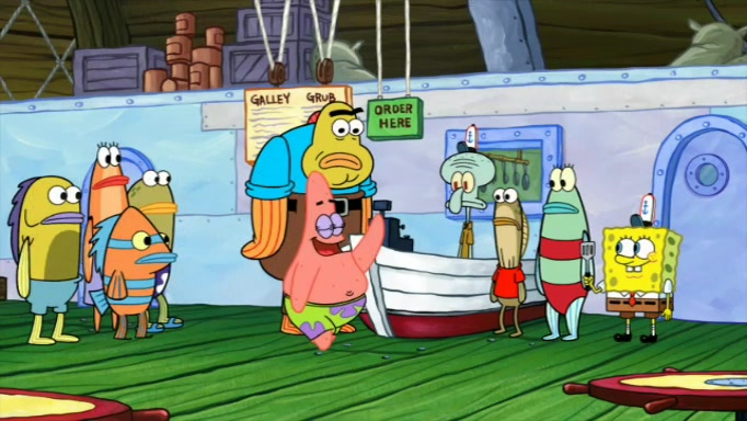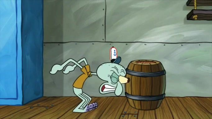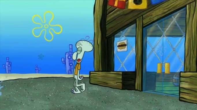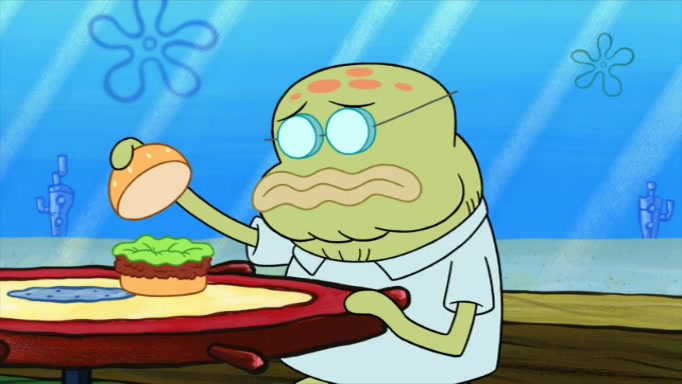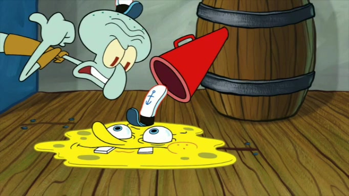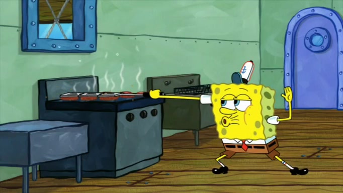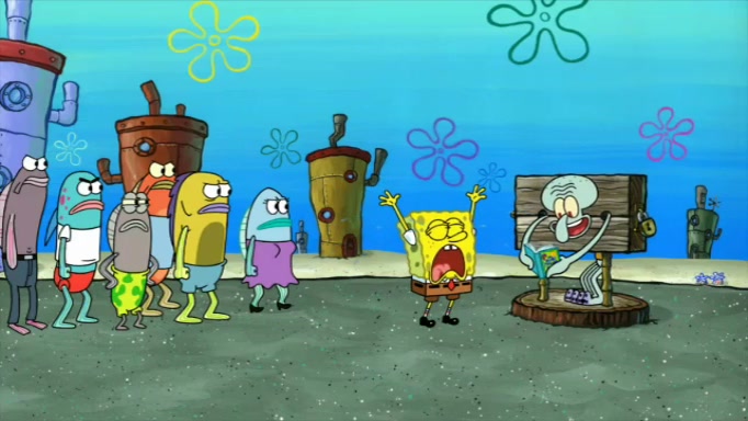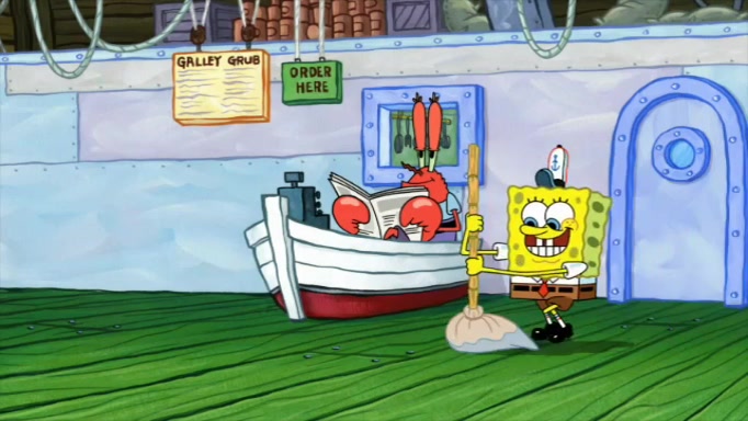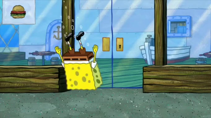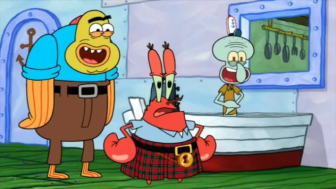 The episode starts off at the Krusty Krab, where business is slow. As a result, Squidward decides to rest. Before he even gets a chance to start relaxing, a whole bunch of fish come. Squidward freaks out when he realizes SpongeBob isn't making Krabby Patties. Squidward then finds SpongeBob in a barrel. He screams at him, resulting in SpongeBob melting out of the barrel. SpongeBob makes the food and serves everybody while Squidward finds a book in the barrel. Then, SpongeBob grabs it and puts it in between the two frying baskets.