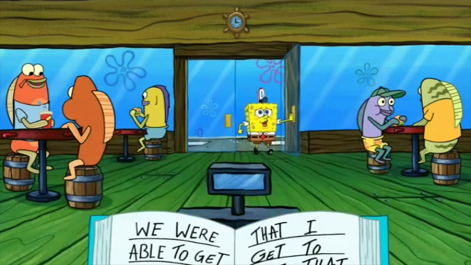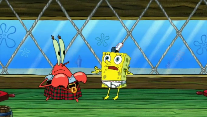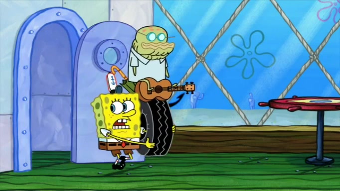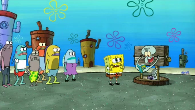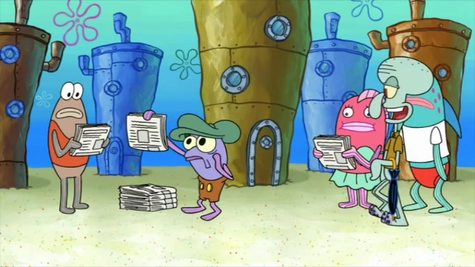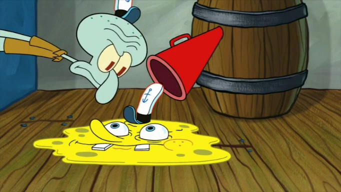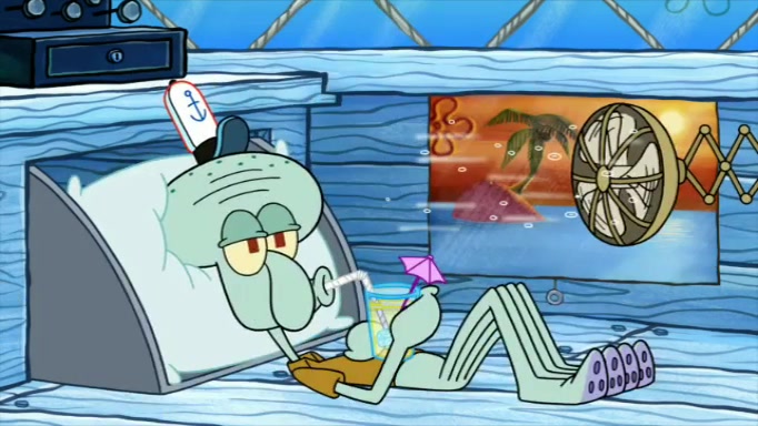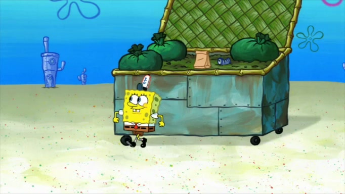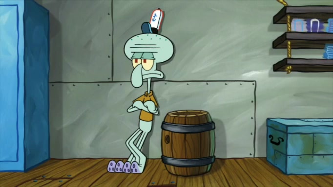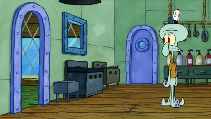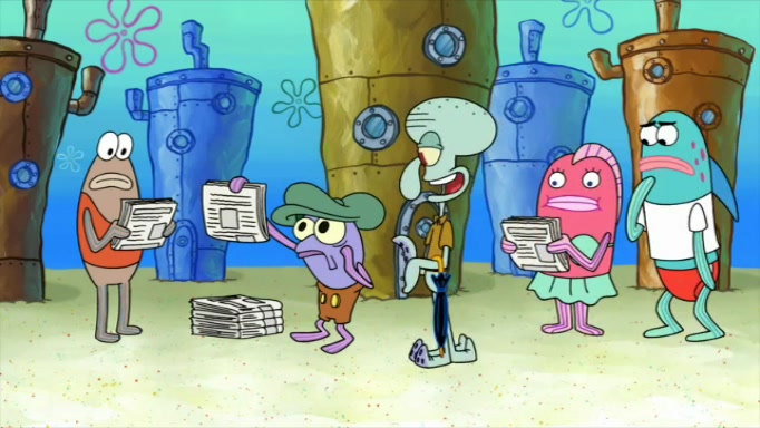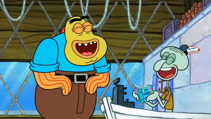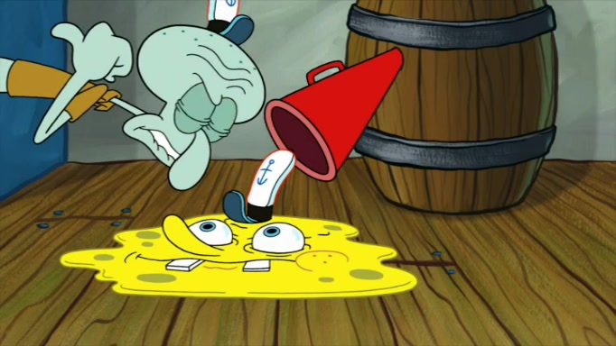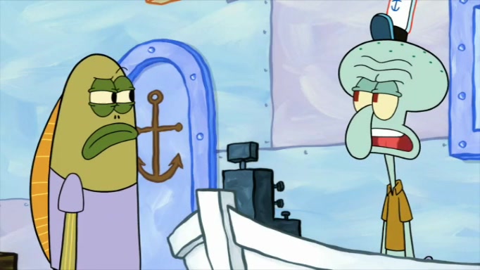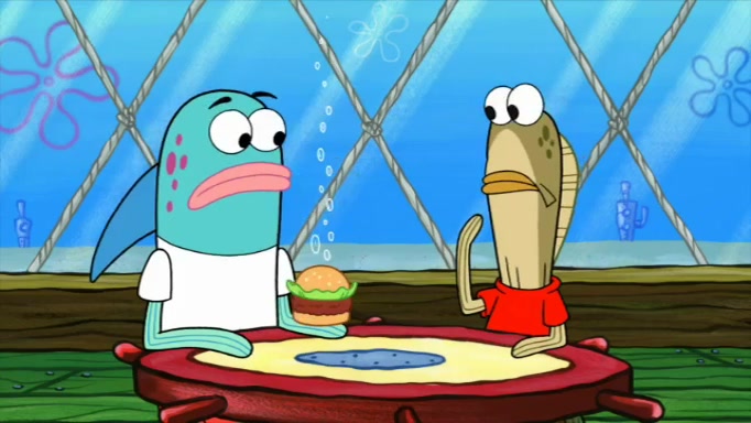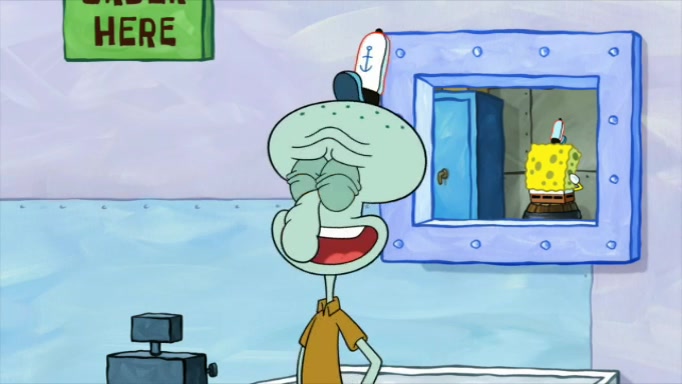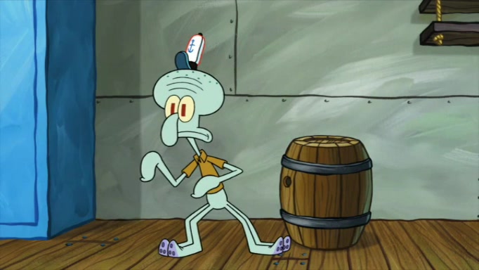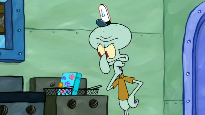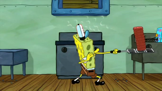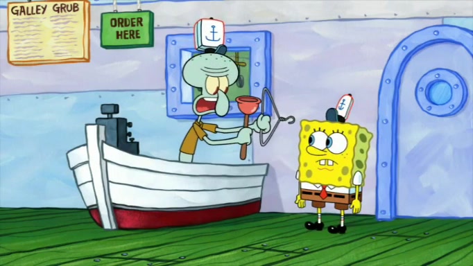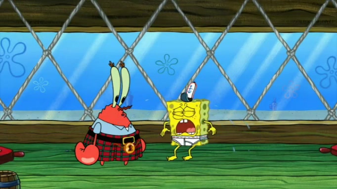 The episode starts off at the Krusty Krab, where business is slow. As a result, Squidward decides to rest. Before he even gets a chance to start relaxing, a whole bunch of fish come. Squidward freaks out when he realizes SpongeBob isn't making Krabby Patties. Squidward then finds SpongeBob in a barrel. He screams at him, resulting in SpongeBob melting out of the barrel. SpongeBob makes the food and serves everybody while Squidward finds a book in the barrel. Then, SpongeBob grabs it and puts it in between the two frying baskets.