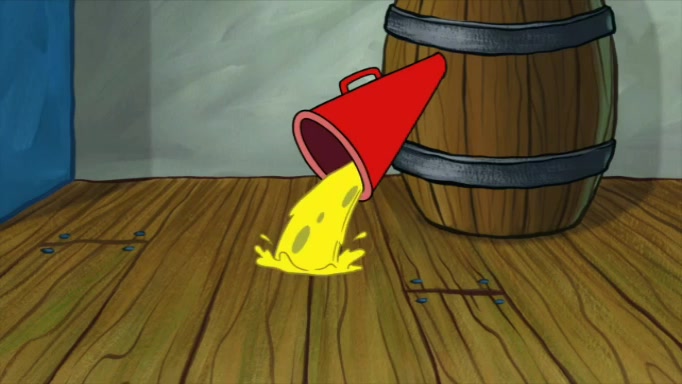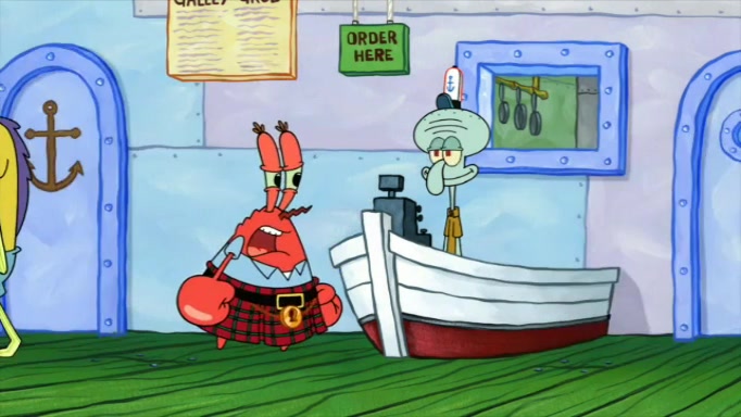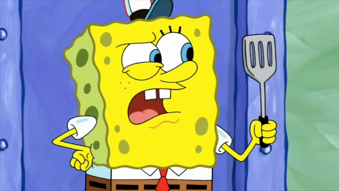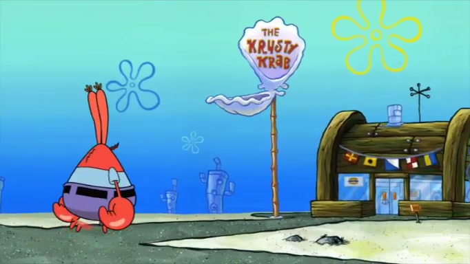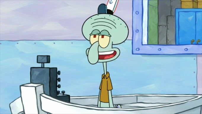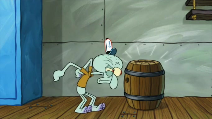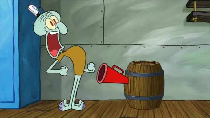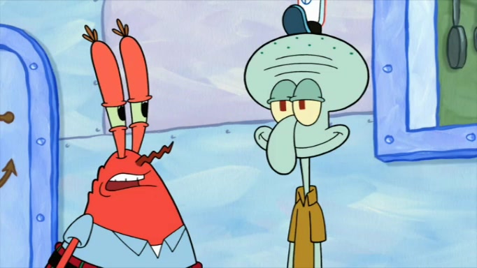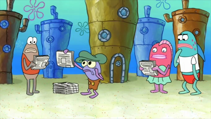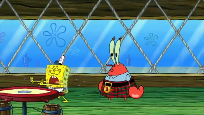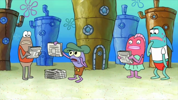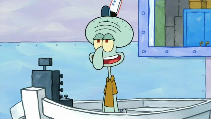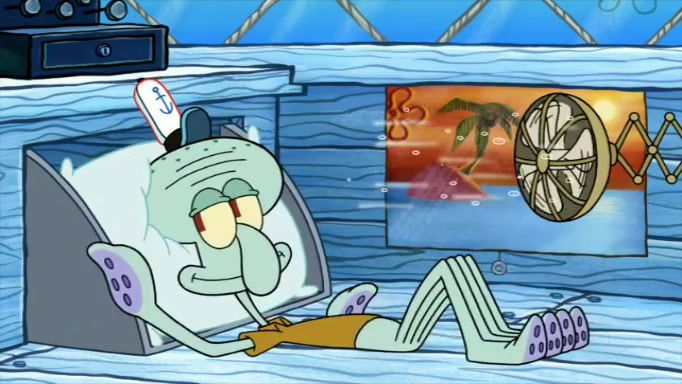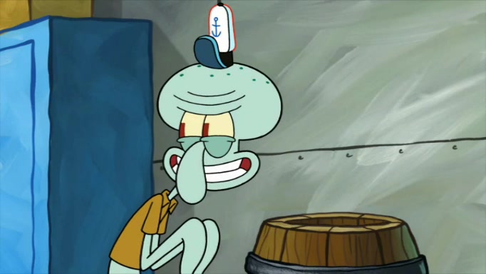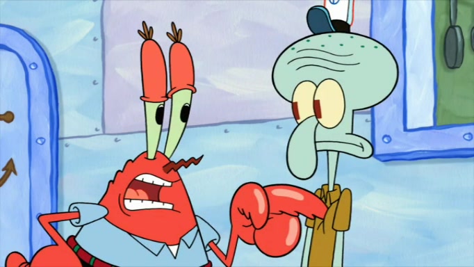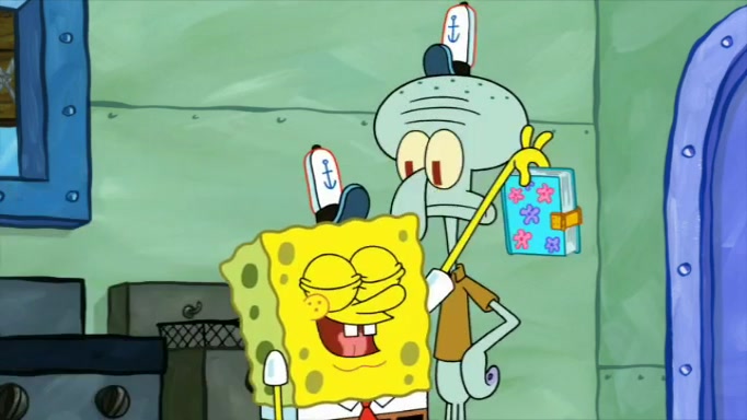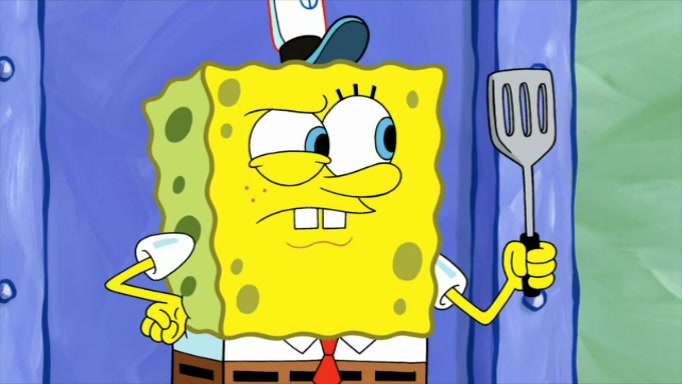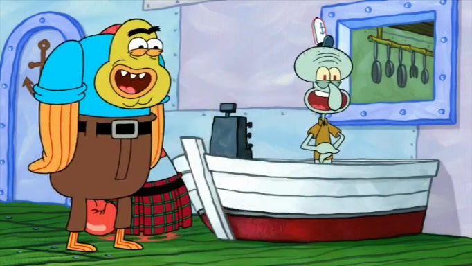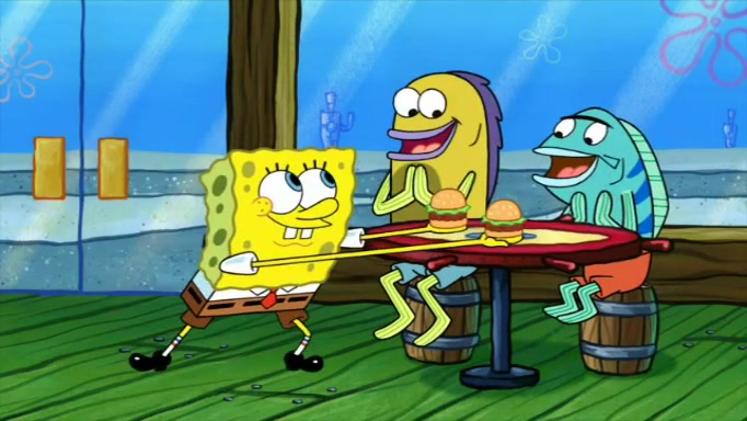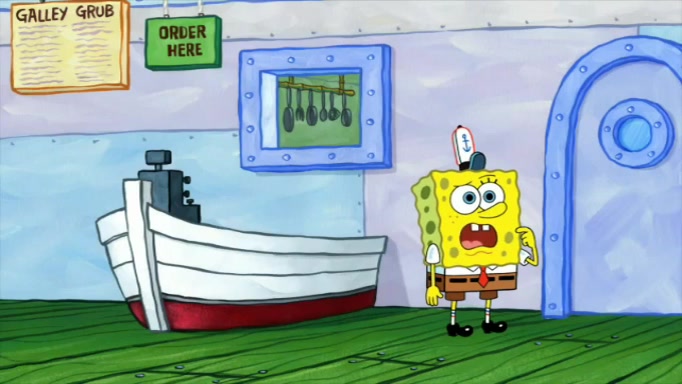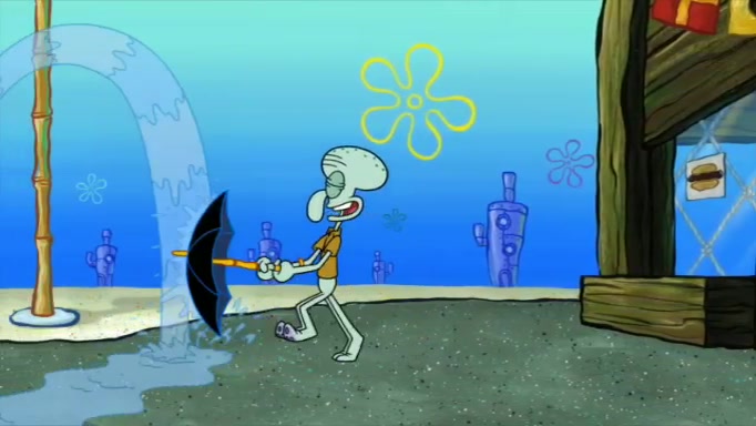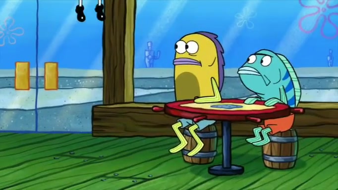 The episode starts off at the Krusty Krab, where business is slow. As a result, Squidward decides to rest. Before he even gets a chance to start relaxing, a whole bunch of fish come. Squidward freaks out when he realizes SpongeBob isn't making Krabby Patties. Squidward then finds SpongeBob in a barrel. He screams at him, resulting in SpongeBob melting out of the barrel. SpongeBob makes the food and serves everybody while Squidward finds a book in the barrel. Then, SpongeBob grabs it and puts it in between the two frying baskets.
