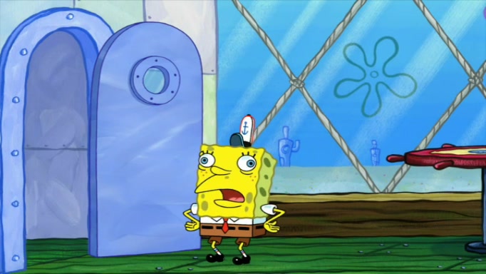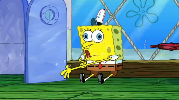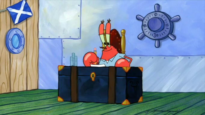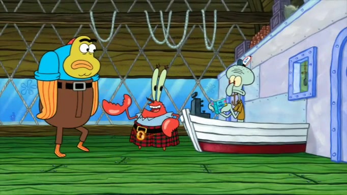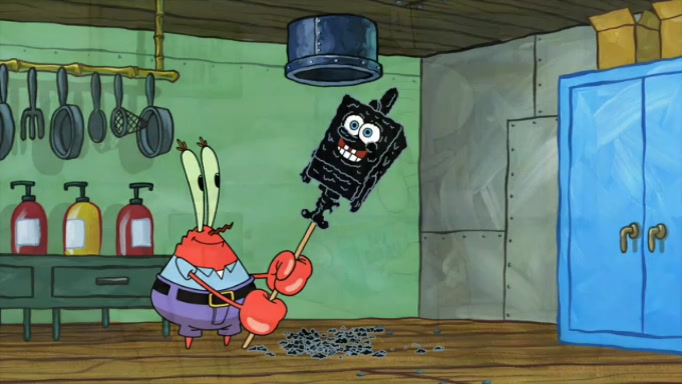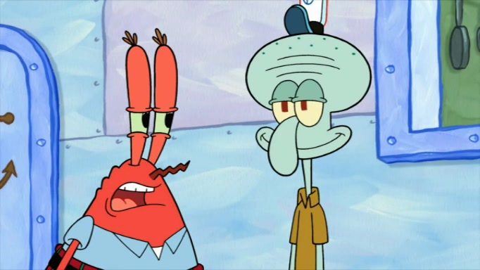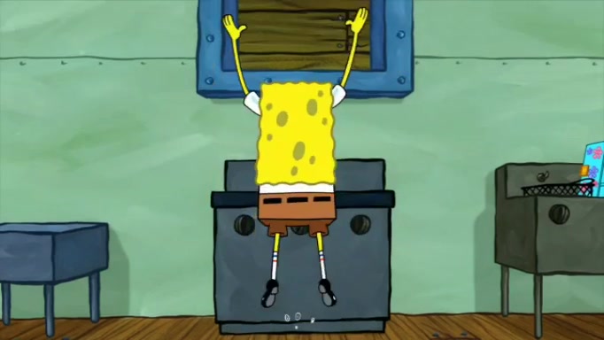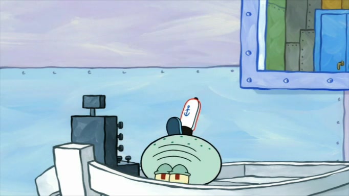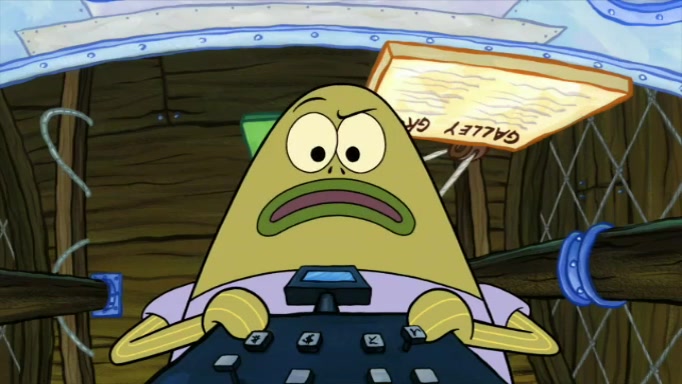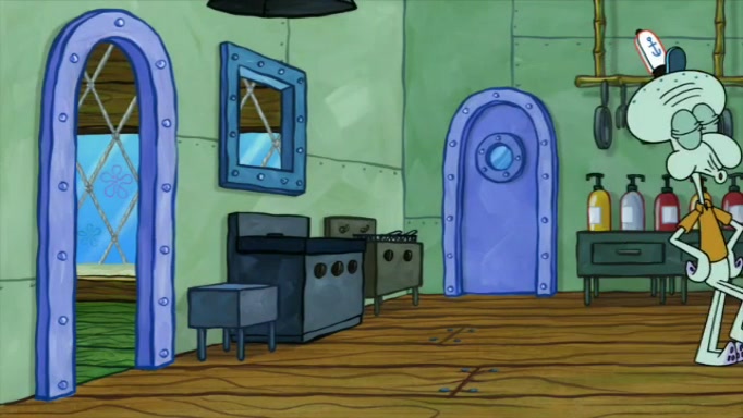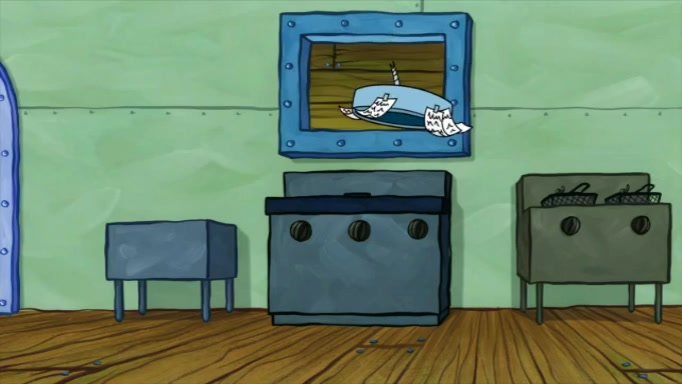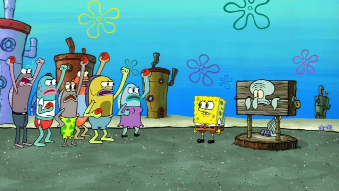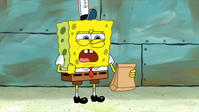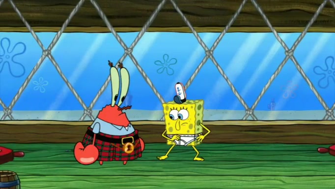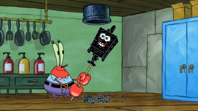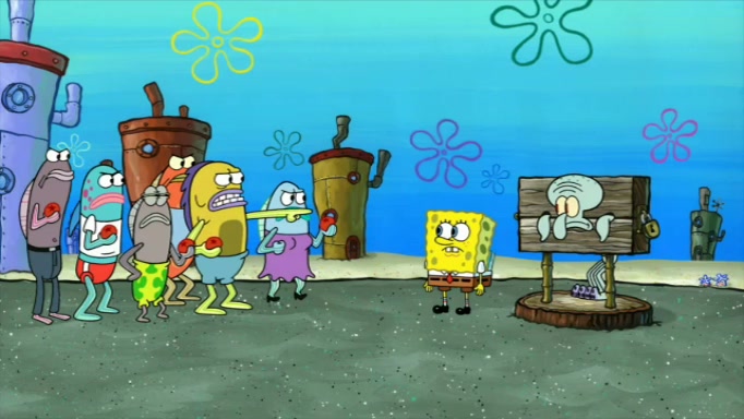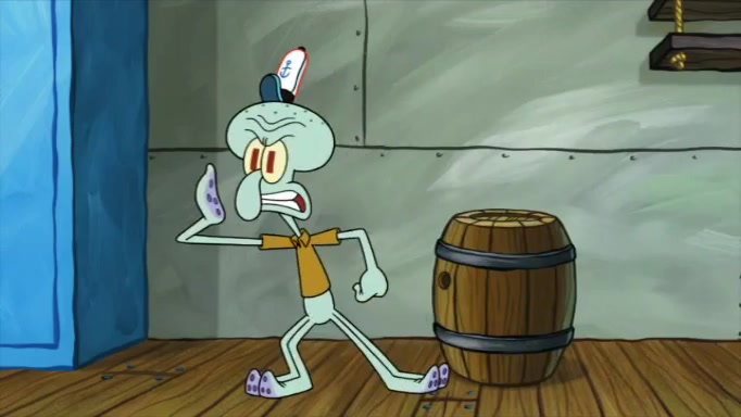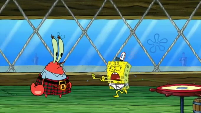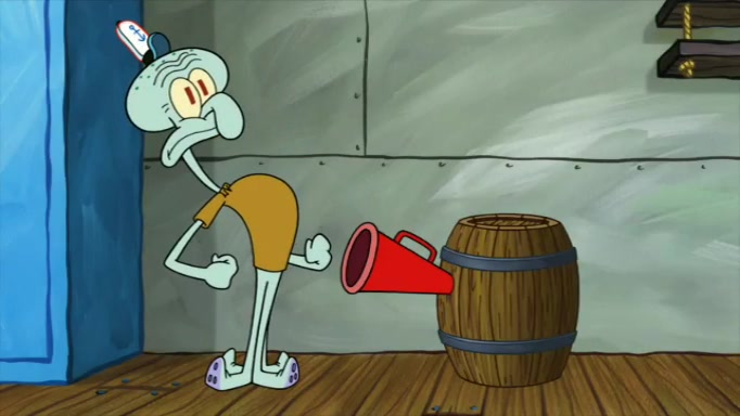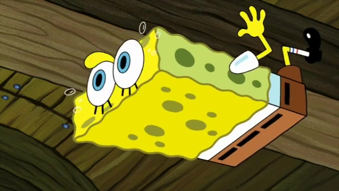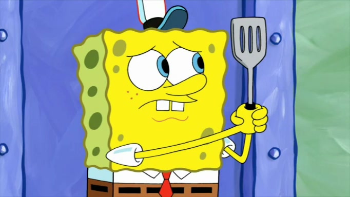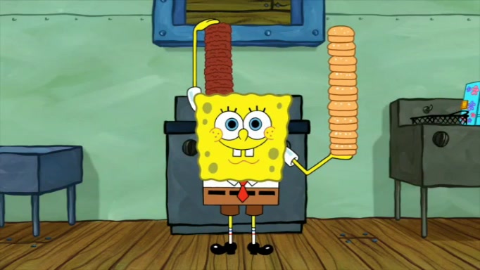 The episode starts off at the Krusty Krab, where business is slow. As a result, Squidward decides to rest. Before he even gets a chance to start relaxing, a whole bunch of fish come. Squidward freaks out when he realizes SpongeBob isn't making Krabby Patties. Squidward then finds SpongeBob in a barrel. He screams at him, resulting in SpongeBob melting out of the barrel. SpongeBob makes the food and serves everybody while Squidward finds a book in the barrel. Then, SpongeBob grabs it and puts it in between the two frying baskets.