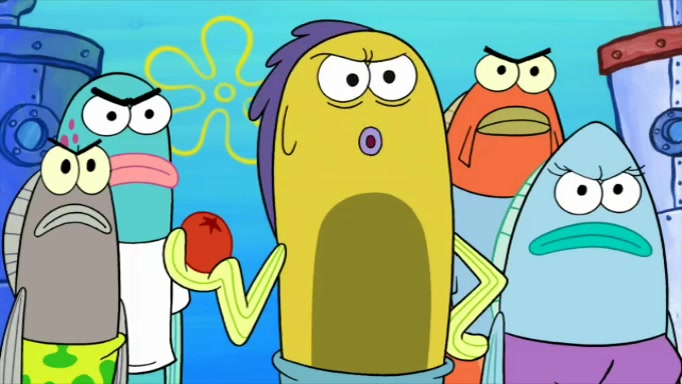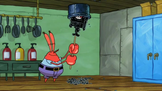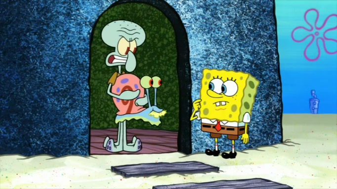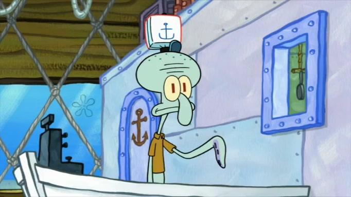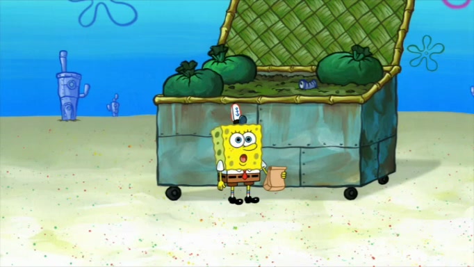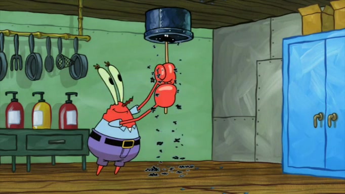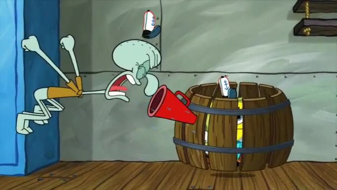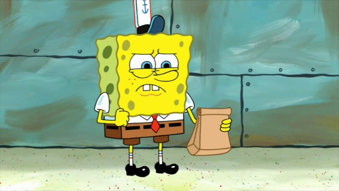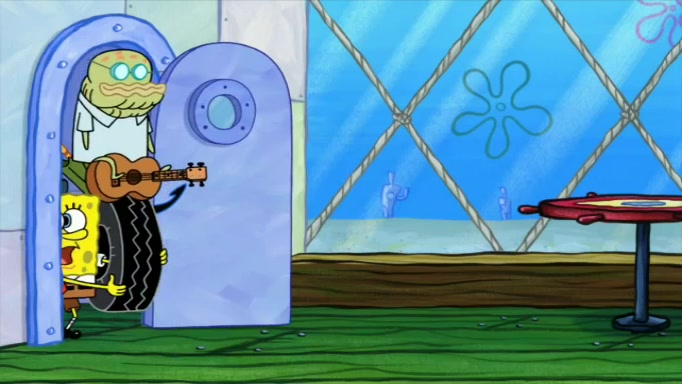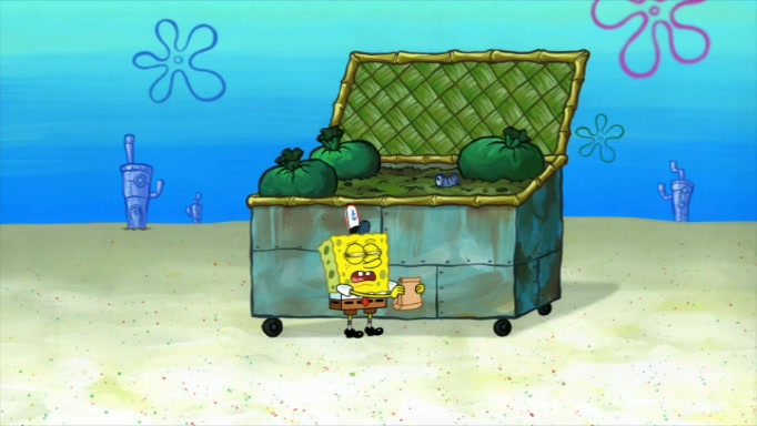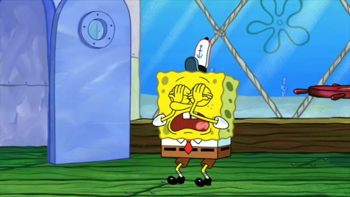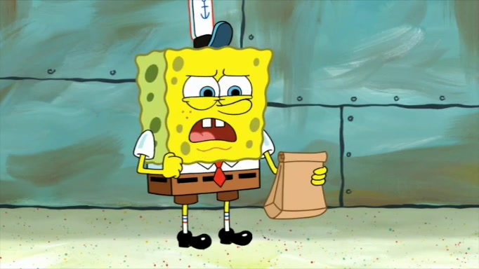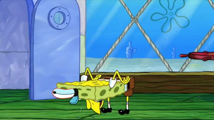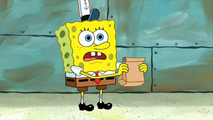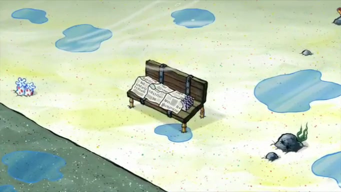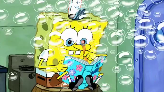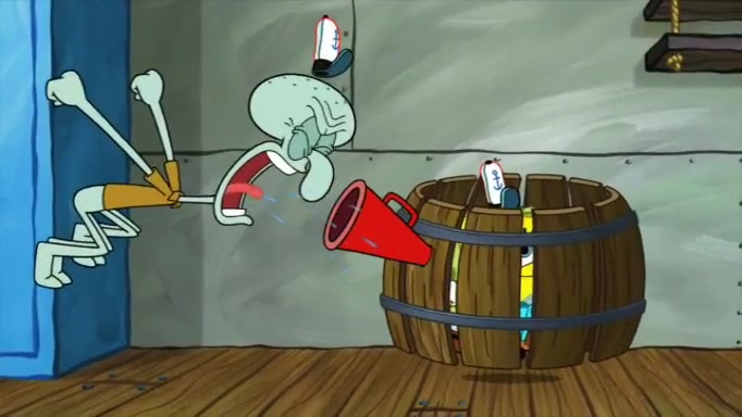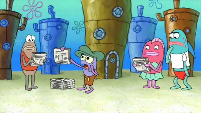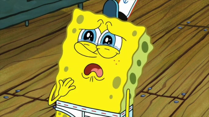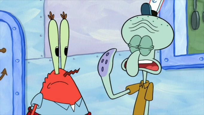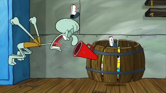The episode starts off at the Krusty Krab, where business is slow. As a result, Squidward decides to rest. Before he even gets a chance to start relaxing, a whole bunch of fish come. Squidward freaks out when he realizes SpongeBob isn't making Krabby Patties. Squidward then finds SpongeBob in a barrel. He screams at him, resulting in SpongeBob melting out of the barrel. SpongeBob makes the food and serves everybody while Squidward finds a book in the barrel. Then, SpongeBob grabs it and puts it in between the two frying baskets.