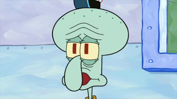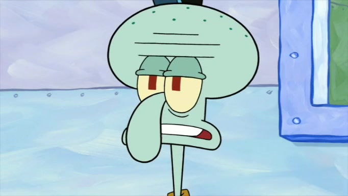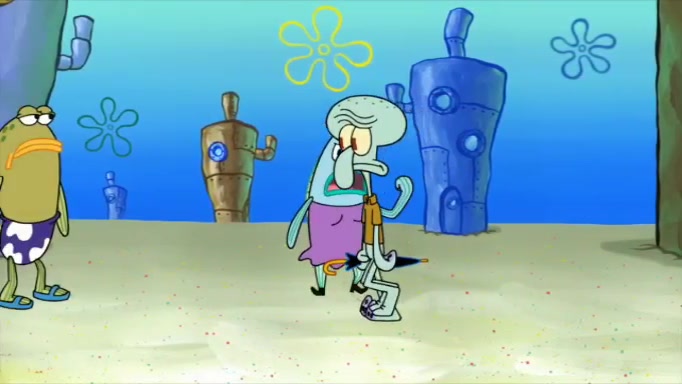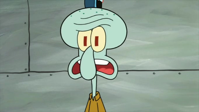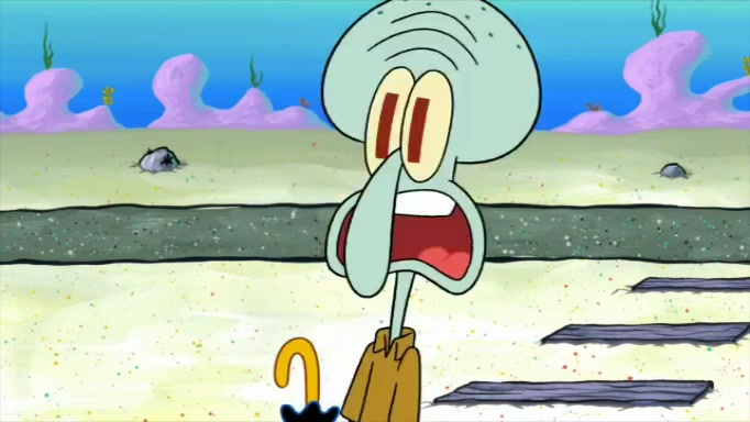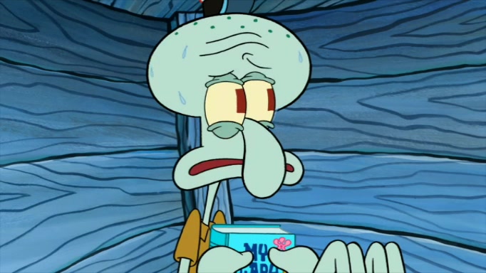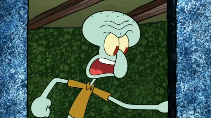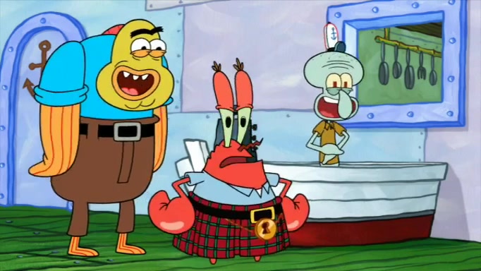 Later, SpongeBob finds out Squidward has been reading his diary and gets embarrassed about Squidward reading his diary, crying saying "Squidward, how could you?" Then, he runs away from the Krusty Krab, and bumps into Mr. Krabs. Since Mr. Krabs is still wearing plaid, the second SpongeBob sees him, he acts like a chicken. Then he continues crying and runs into town.