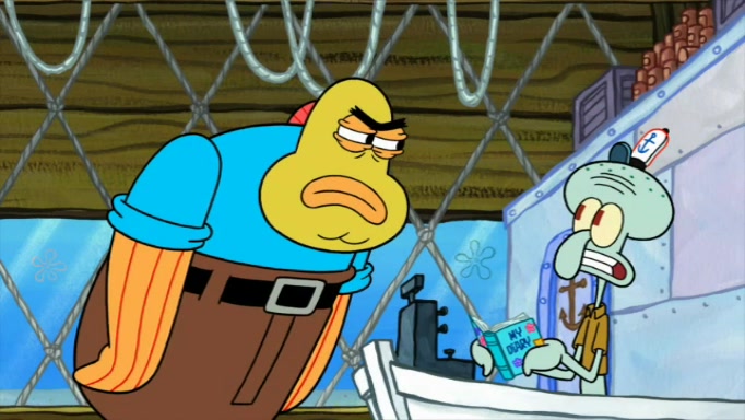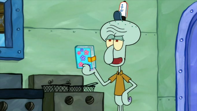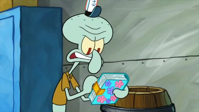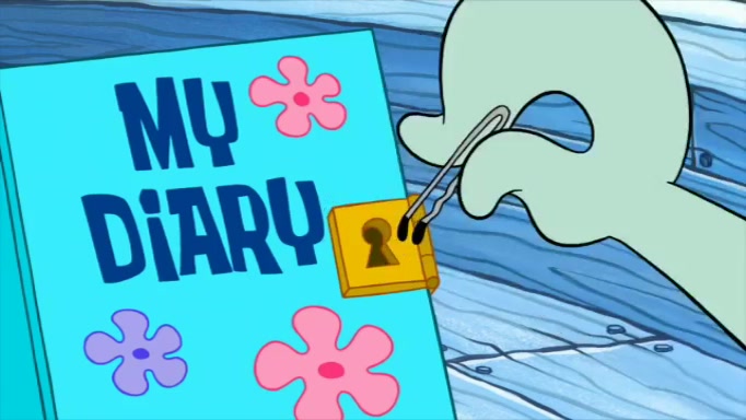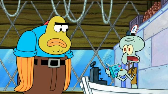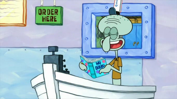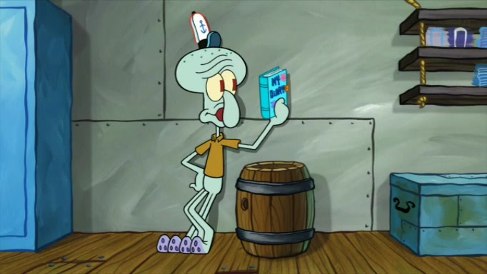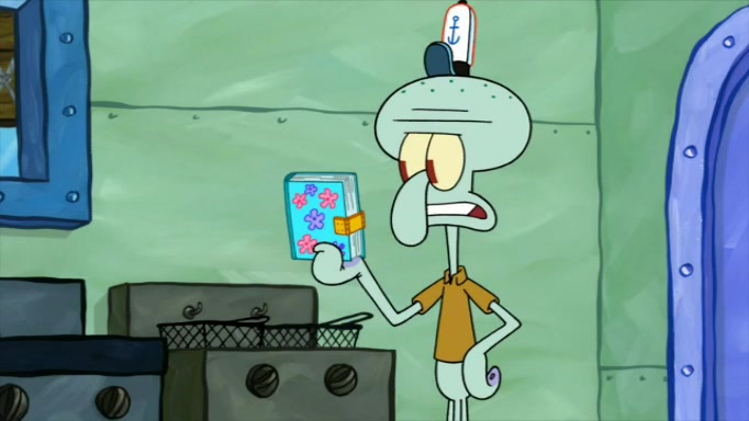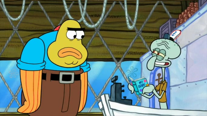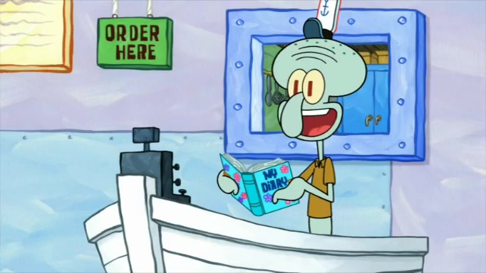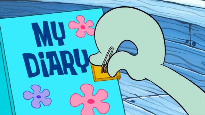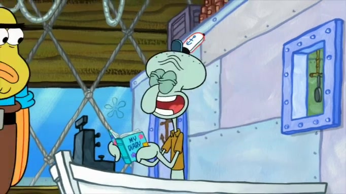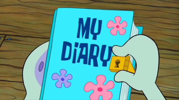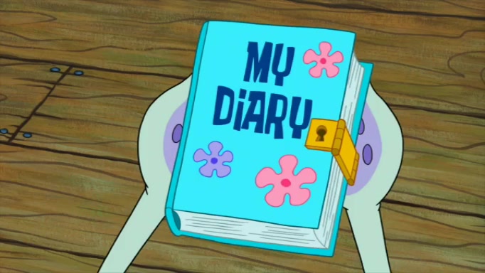 Whenever Squidward tries to see the book, SpongeBob snatches the book from him, which happens twice. A few minutes later, SpongeBob takes a break and Squidward finds the book in the barrel again. Now that he finds out the book was a diary, Squidward reads SpongeBob's diary to everyone at the Krusty Krab. The first secret he reads is that SpongeBob clucks like a chicken whenever he sees plaid. Squidward sees Mr. Krabs wearing plaid, so he calls SpongeBob back. SpongeBob sees Mr. Krabs plaid so he clucks like a chicken, making Squidward and a fish laugh.