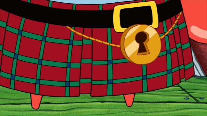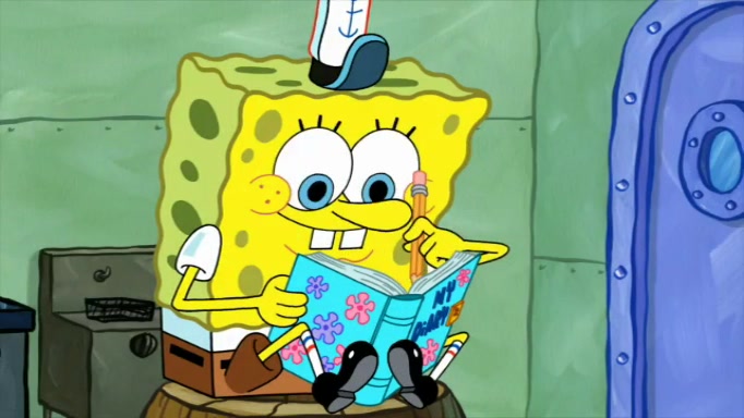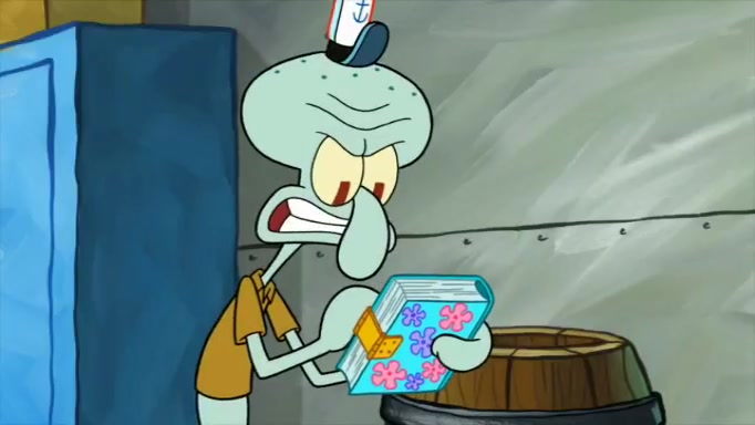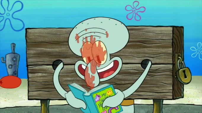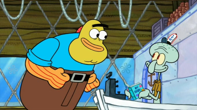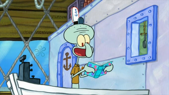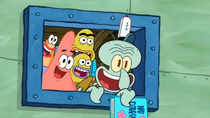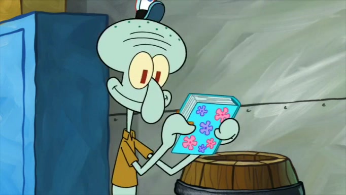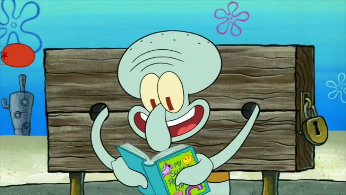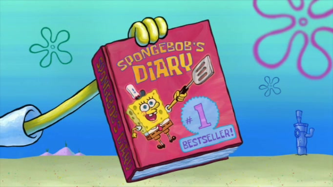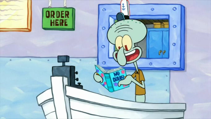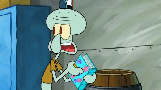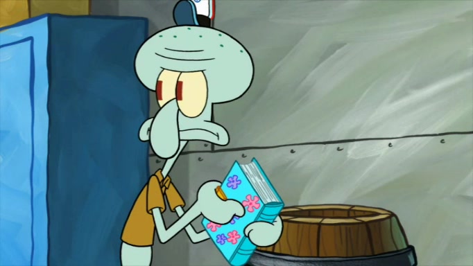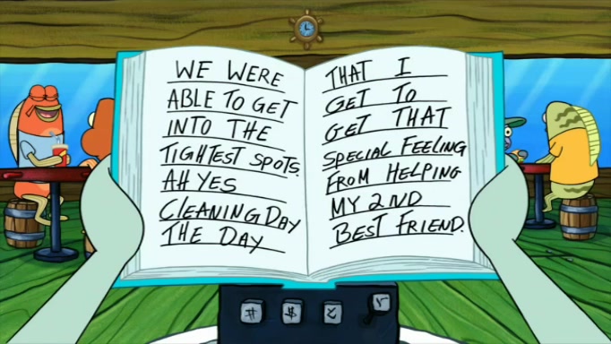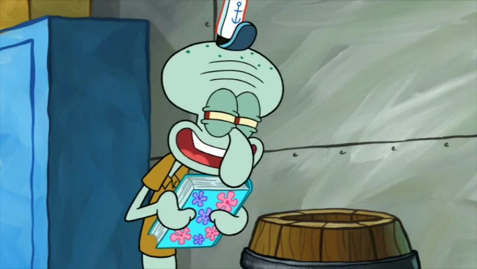 Whenever Squidward tries to see the book, SpongeBob snatches the book from him, which happens twice. A few minutes later, SpongeBob takes a break and Squidward finds the book in the barrel again. Now that he finds out the book was a diary, Squidward reads SpongeBob's diary to everyone at the Krusty Krab. The first secret he reads is that SpongeBob clucks like a chicken whenever he sees plaid. Squidward sees Mr. Krabs wearing plaid, so he calls SpongeBob back. SpongeBob sees Mr. Krabs plaid so he clucks like a chicken, making Squidward and a fish laugh.