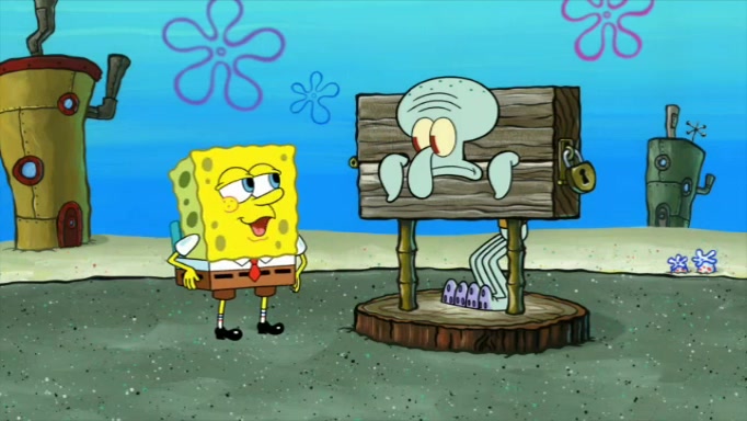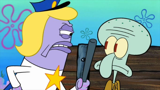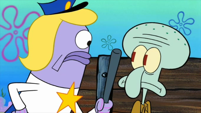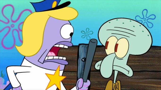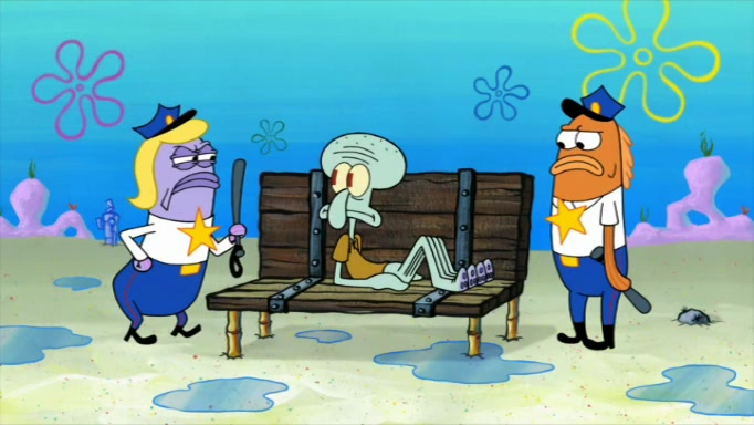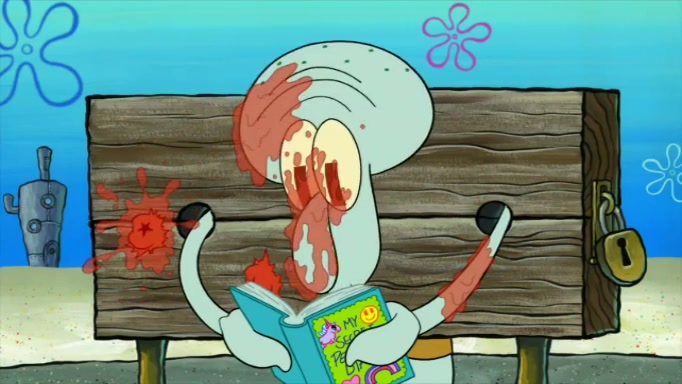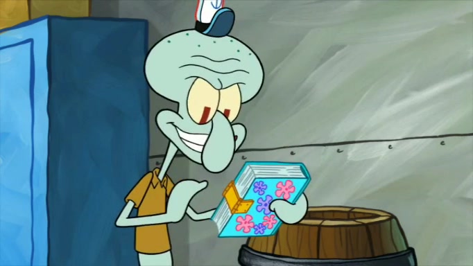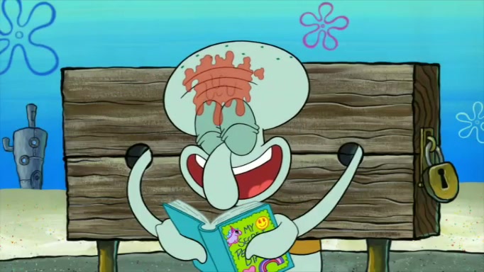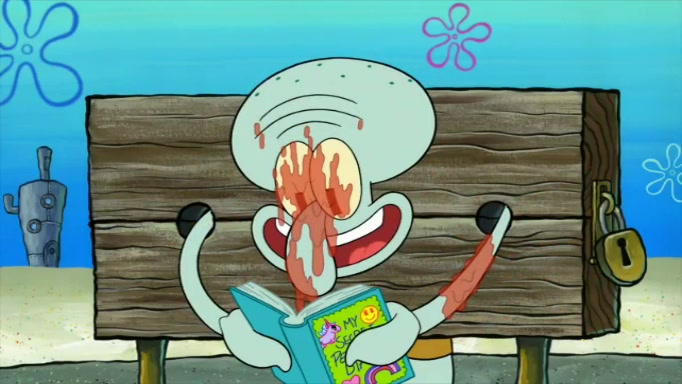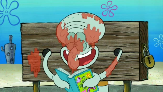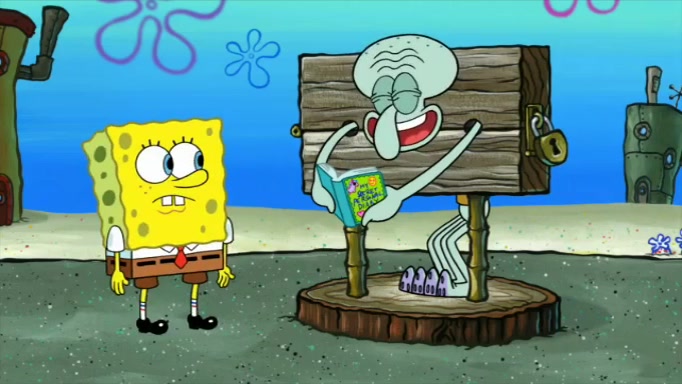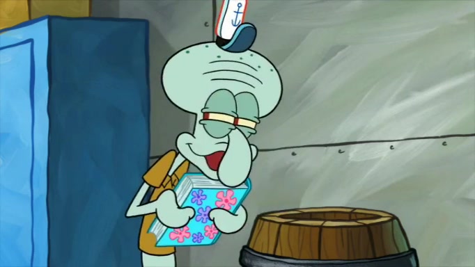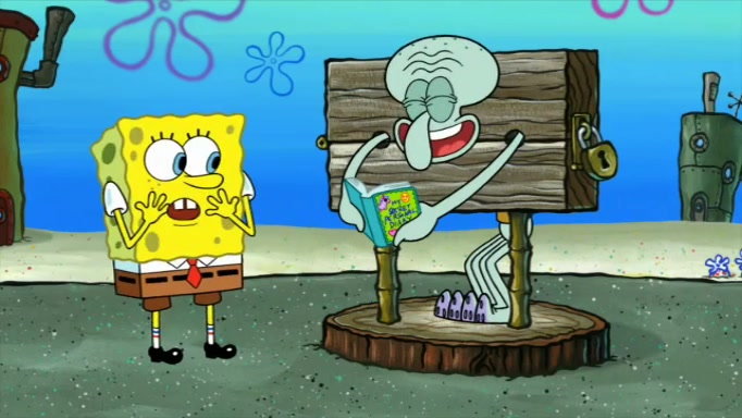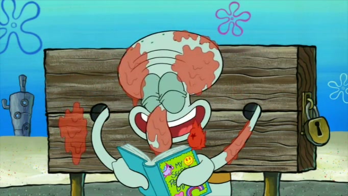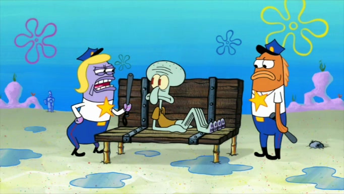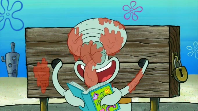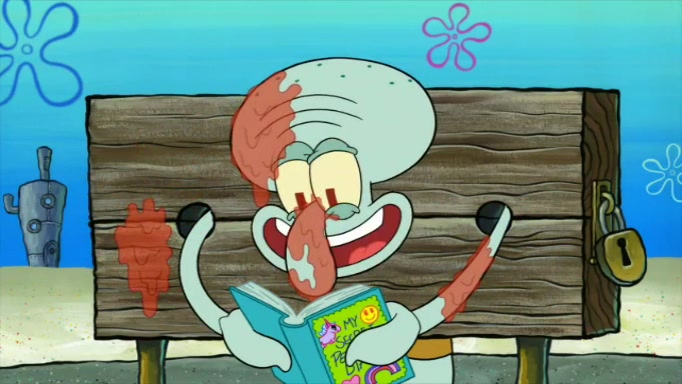 Now, when Squidward sleeps on a bench, a couple of police recognize him and lock him in the stocks. Then, Patrick throws tomatoes at him. Squidward then apologizes to SpongeBob and he learns that he only read SpongeBob's work diary, which got published. SpongeBob also tells him he never read his secret personal diary, which would be really embarrassing.