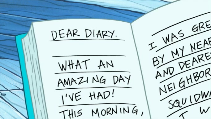 A crowd comes to throw tomatoes at Squidward when SpongeBob tells them he forgave Squidward. Nat tells SpongeBob that Squidward is reading the secret personal diary. SpongeBob gets upset again and runs away. The episode ends with tomatoes being thrown at Squidward by the disgusted crowd, laughing as he reads SpongeBob's diary, saying, "I don't care! This is so worth it!"