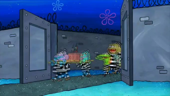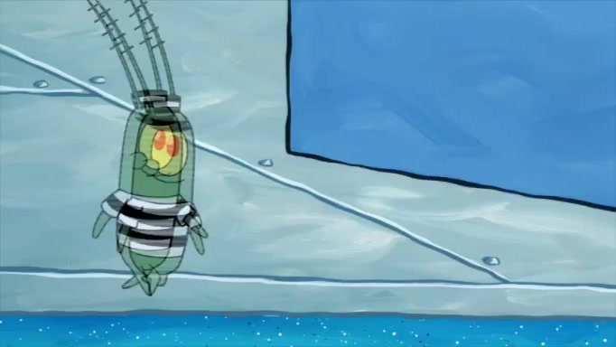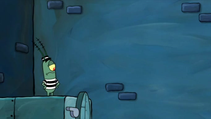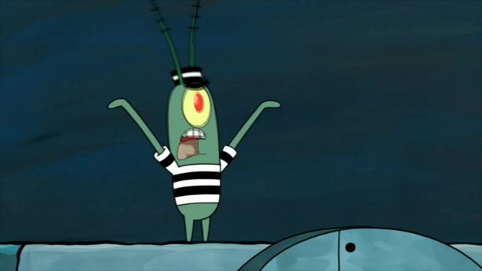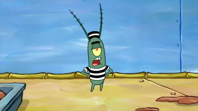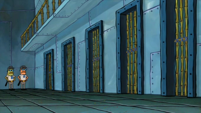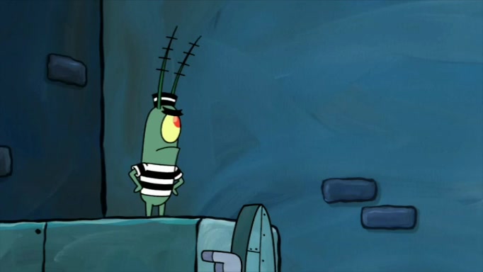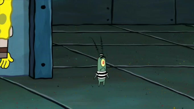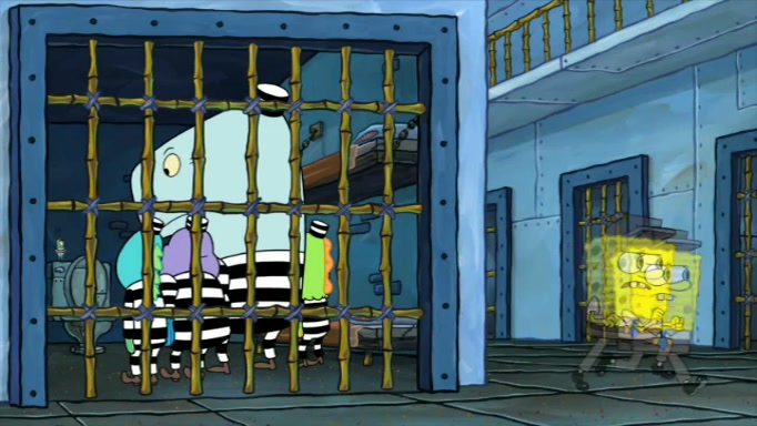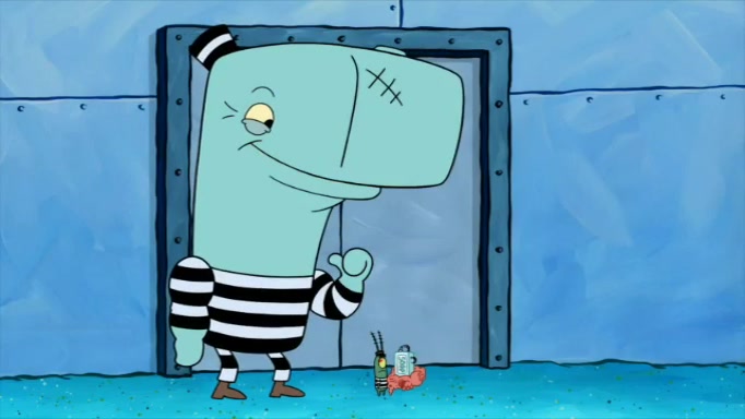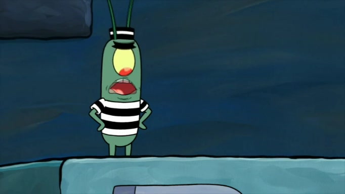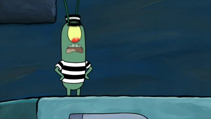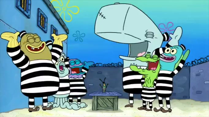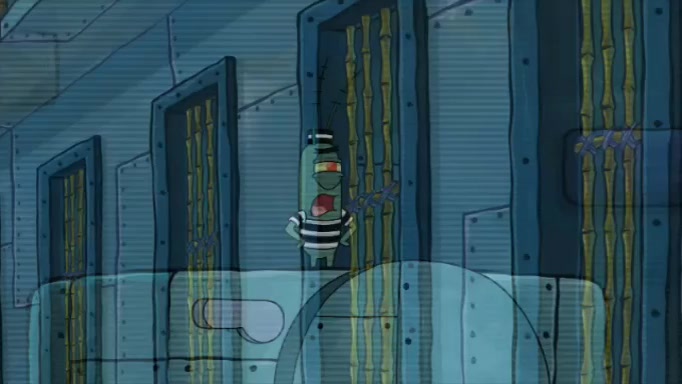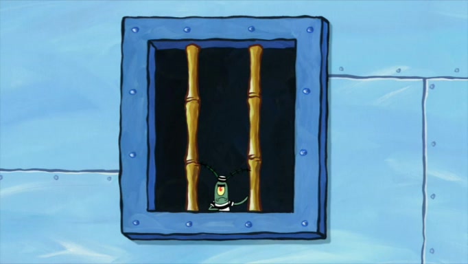The episode opens with the Narrator explaining the Bikini Bottom Jail, mainly it's newest member, Plankton. The warden lets all of the prisoners out, including Plankton. Plankton hears SpongeBob calling out to him. Plankton wants to know what is SpongeBob doing there and SpongeBob says that Mr. Krabs told him to watch over Plankton. Plankton doesn't like the idea but the prison warden tells him to quiet down. The scene changes over to a room where Karen is about to send over a cake to SpongeBob which is for Plankton. Plankton asks if Karen had put the file in the cake but Karen just laughs for she thought he was joking (although plankton was expecting her to put a file in the cake). Plankton attempts to jump over the glass but SpongeBob grabs him.