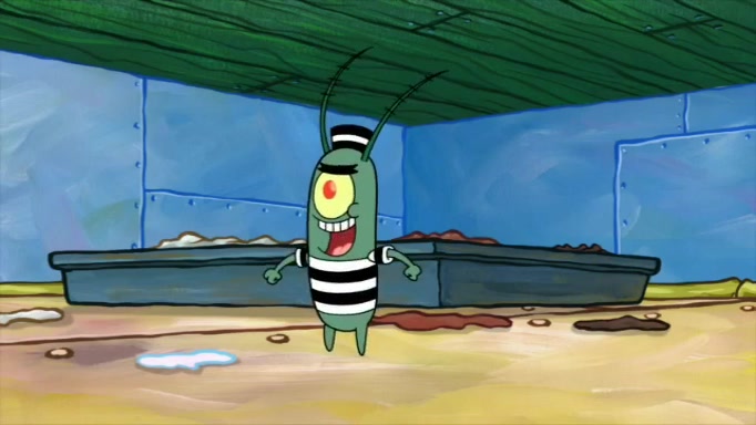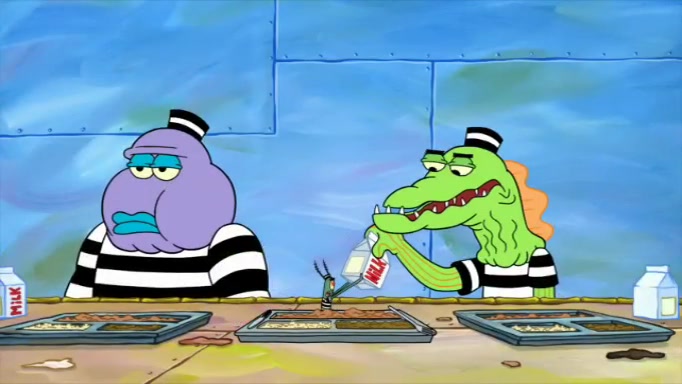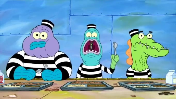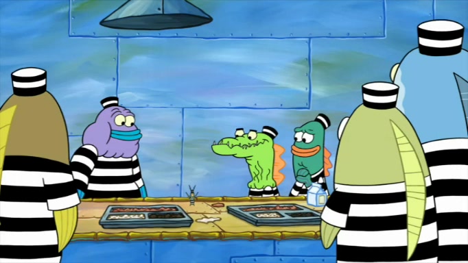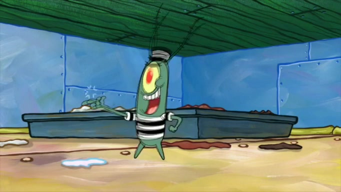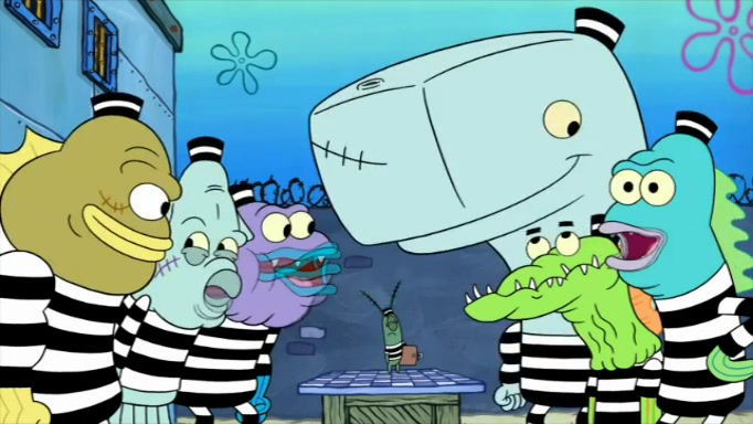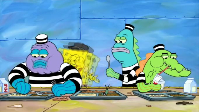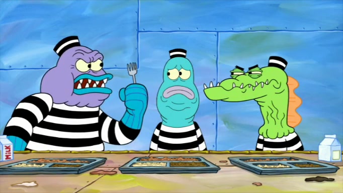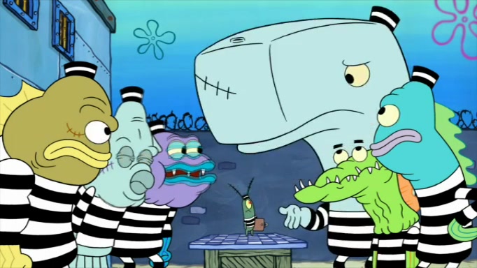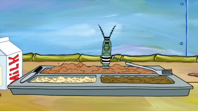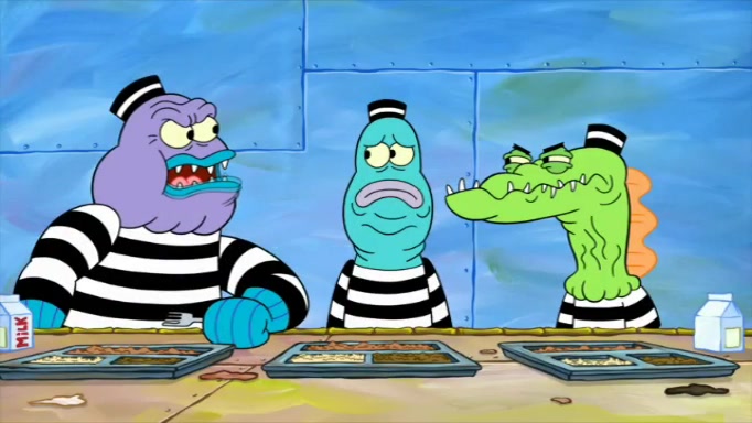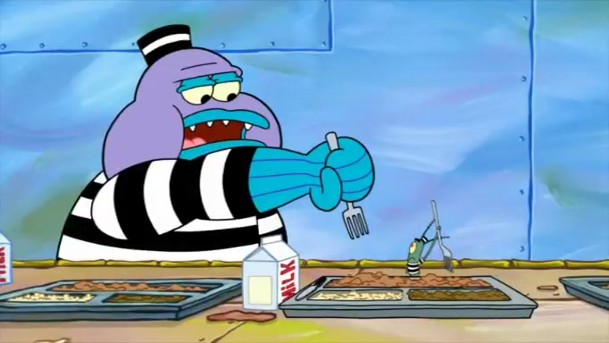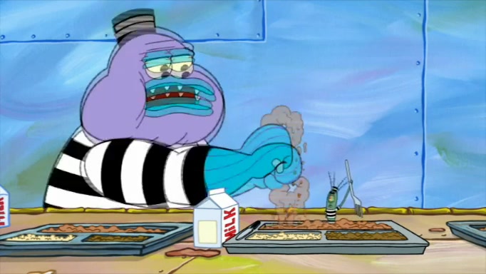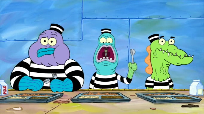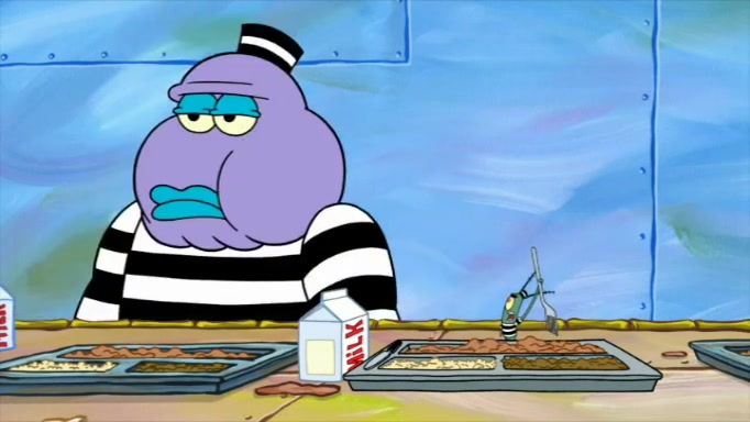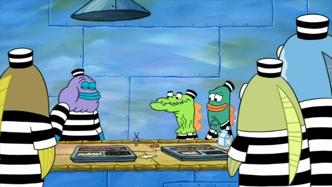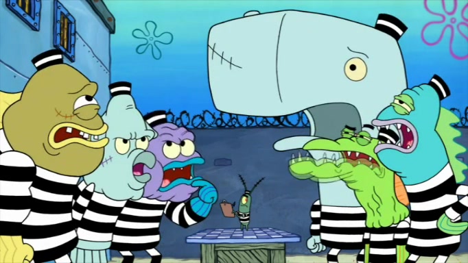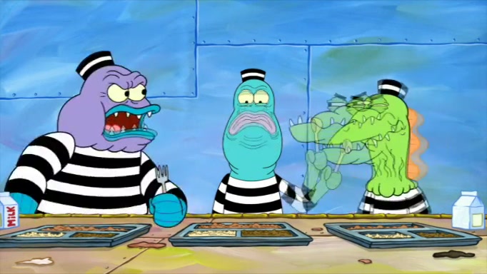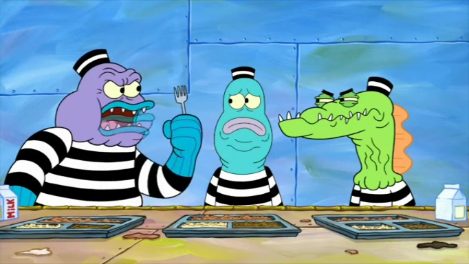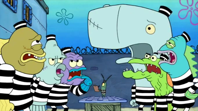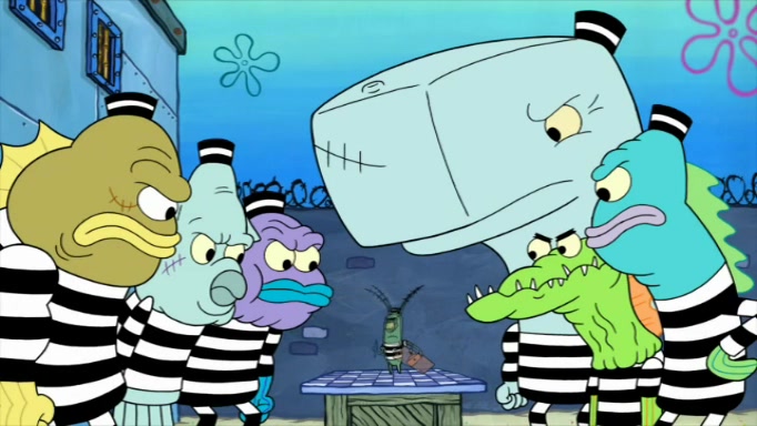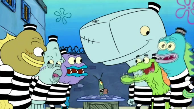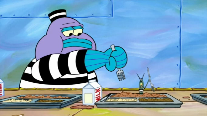In the cafeteria, Plankton attempts to eat his food but a purple cellmate eats some of his food. Another green cellmate drinks Plankton's milk and then Plankton gets eaten by a Light Blue Cellmate. Plankton yells out that he is the most evil genius and yells out his name. The Purple Cellmate, thinking the Light Blue Cellmate is talking, doesn't believe him, saying he and the others are fans of Plankton. Plankton calls out his name again and then the Purple Cellmate punches the Light Blue Cellmate in the stomach which causes Plankton to be punched out and crash into the wall. The Purple and Green Cellmates start to beat up the Light Blue Cellmate until Plankton breaks it up. Plankton introduces himself to the Cellmates and the Cellmates say how they are going to do everything that Plankton says. Plankton gets excited saying how easily he could get the Krabby Patty Secret Formula.