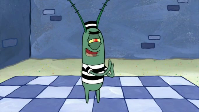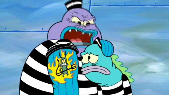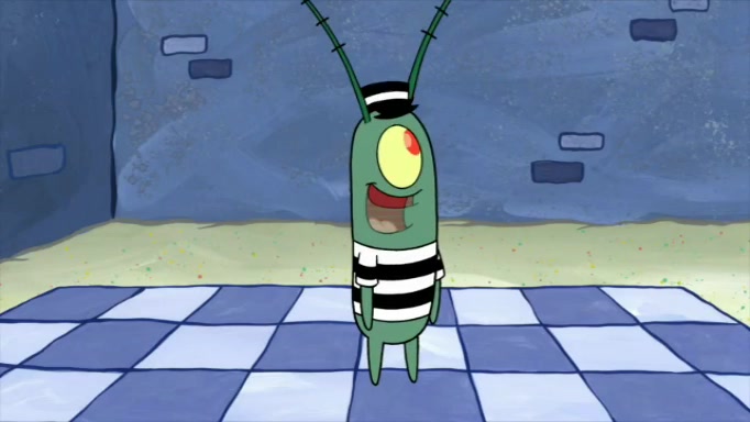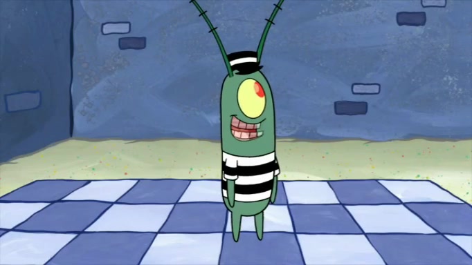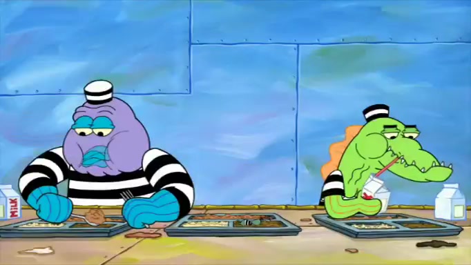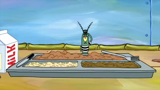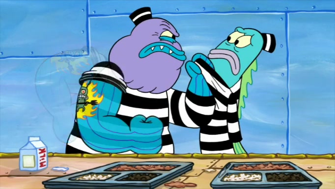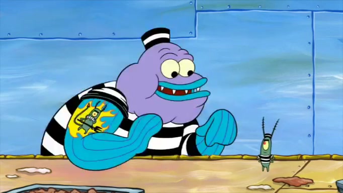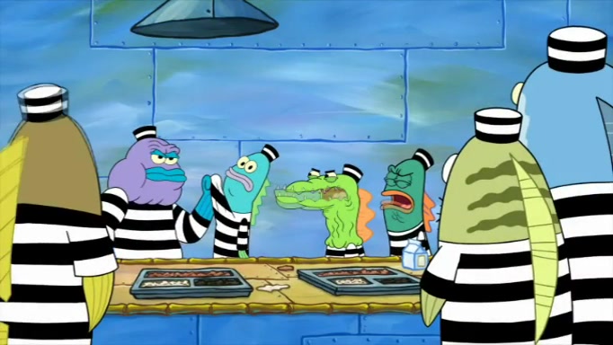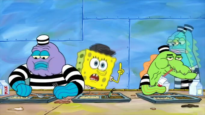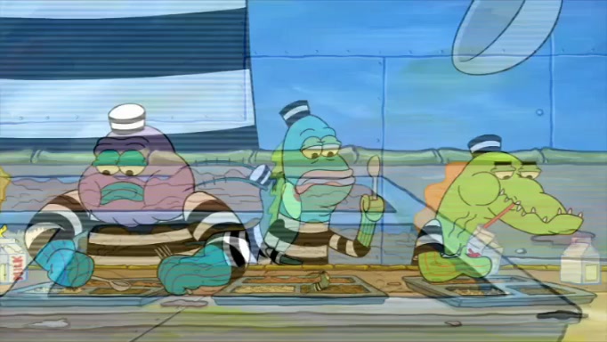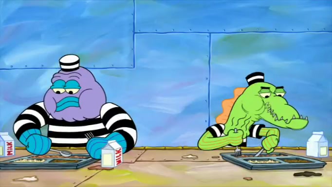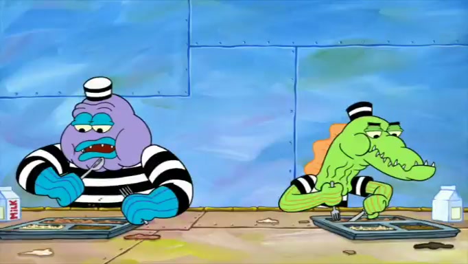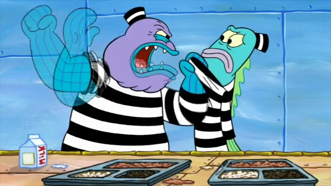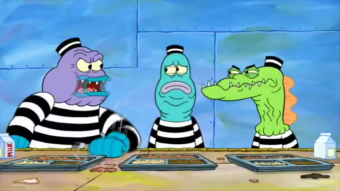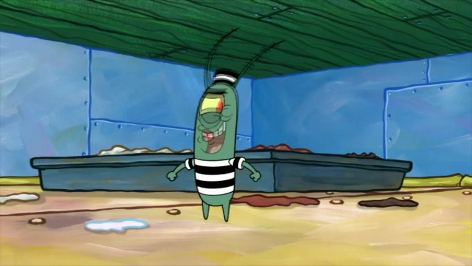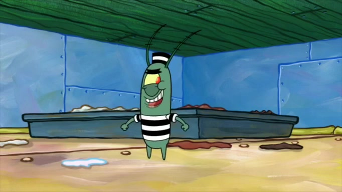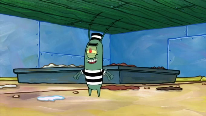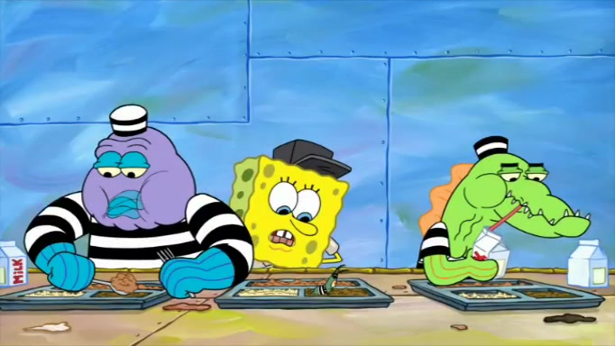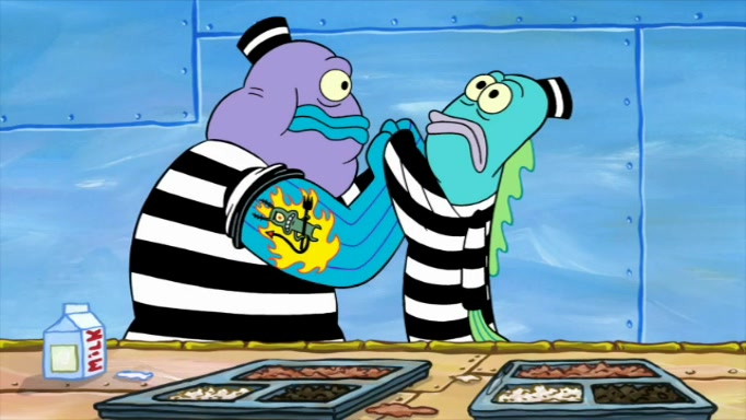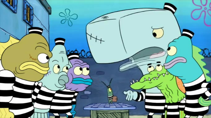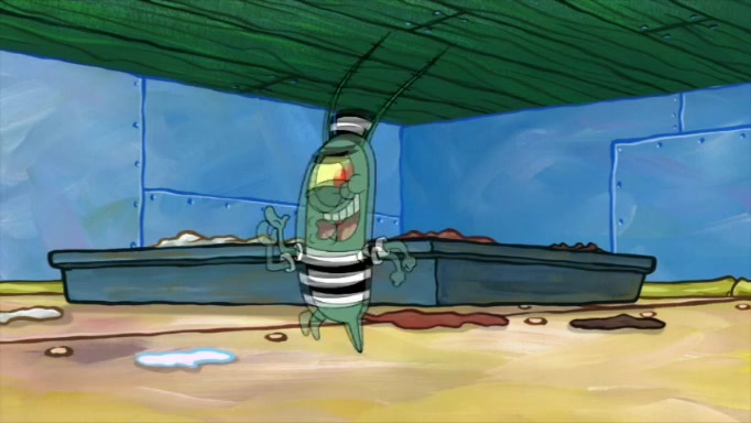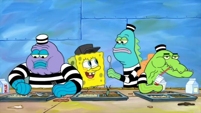 In the cafeteria, Plankton attempts to eat his food but a purple cellmate eats some of his food. Another green cellmate drinks Plankton's milk and then Plankton gets eaten by a Light Blue Cellmate. Plankton yells out that he is the most evil genius and yells out his name. The Purple Cellmate, thinking the Light Blue Cellmate is talking, doesn't believe him, saying he and the others are fans of Plankton. Plankton calls out his name again and then the Purple Cellmate punches the Light Blue Cellmate in the stomach which causes Plankton to be punched out and crash into the wall. The Purple and Green Cellmates start to beat up the Light Blue Cellmate until Plankton breaks it up. Plankton introduces himself to the Cellmates and the Cellmates say how they are going to do everything that Plankton says. Plankton gets excited saying how easily he could get the Krabby Patty Secret Formula.