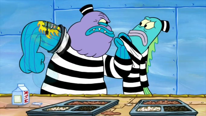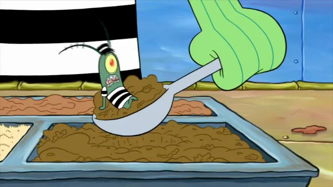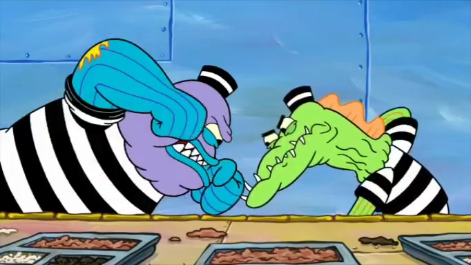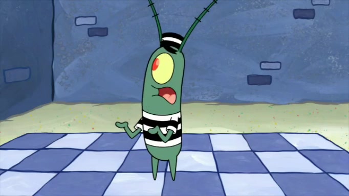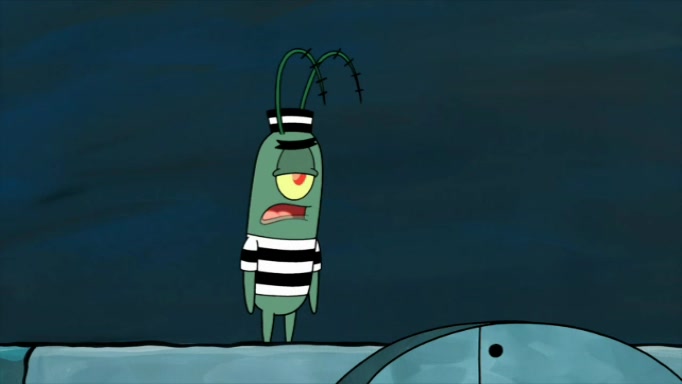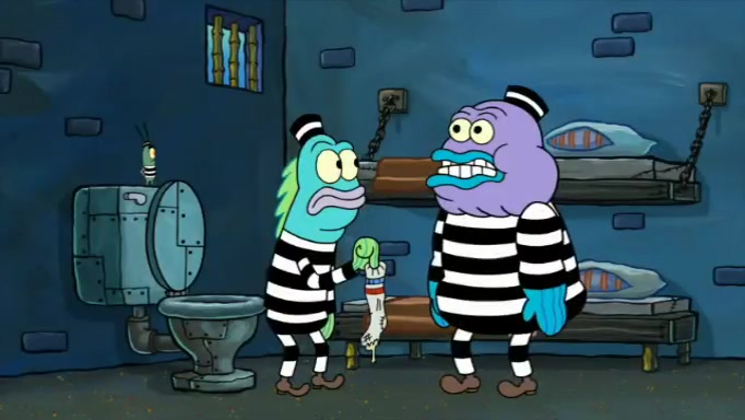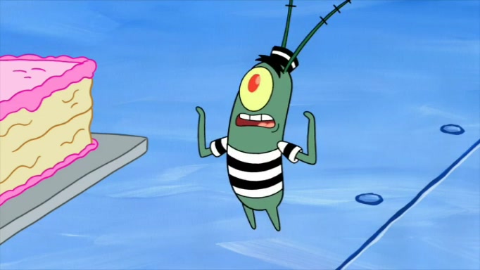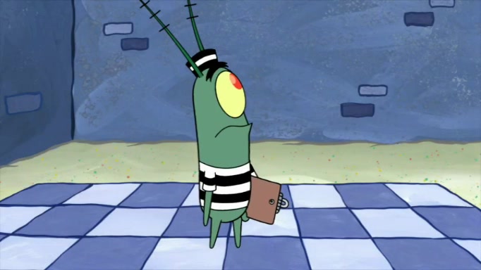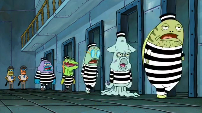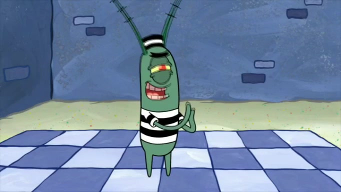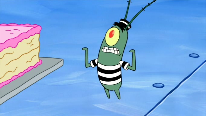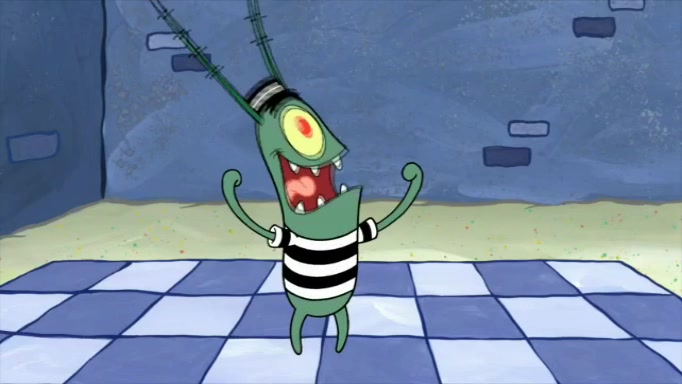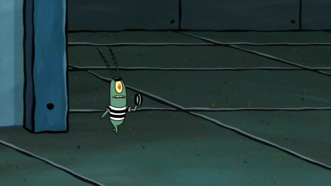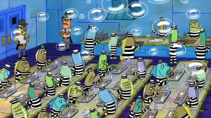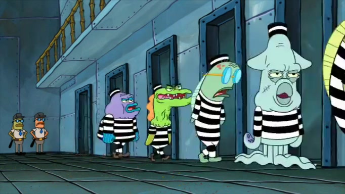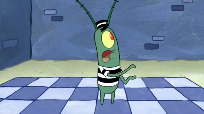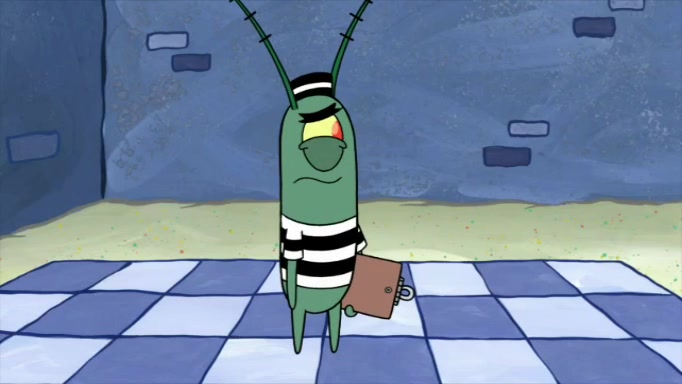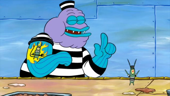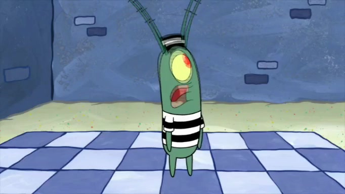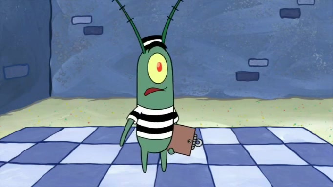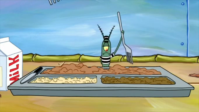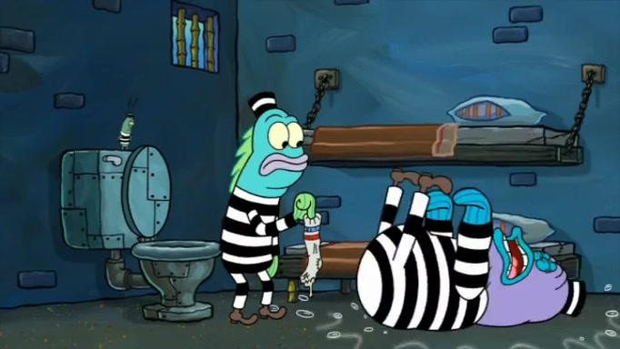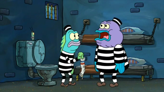 In the cafeteria, Plankton attempts to eat his food but a purple cellmate eats some of his food. Another green cellmate drinks Plankton's milk and then Plankton gets eaten by a Light Blue Cellmate. Plankton yells out that he is the most evil genius and yells out his name. The Purple Cellmate, thinking the Light Blue Cellmate is talking, doesn't believe him, saying he and the others are fans of Plankton. Plankton calls out his name again and then the Purple Cellmate punches the Light Blue Cellmate in the stomach which causes Plankton to be punched out and crash into the wall. The Purple and Green Cellmates start to beat up the Light Blue Cellmate until Plankton breaks it up. Plankton introduces himself to the Cellmates and the Cellmates say how they are going to do everything that Plankton says. Plankton gets excited saying how easily he could get the Krabby Patty Secret Formula.
