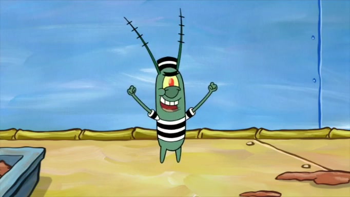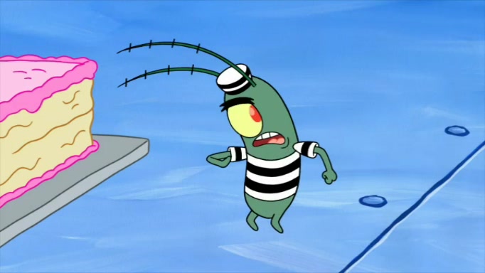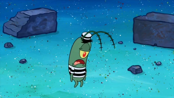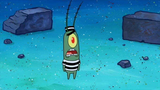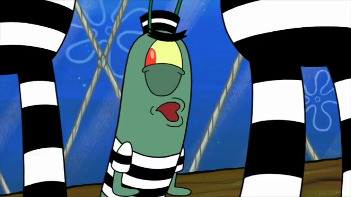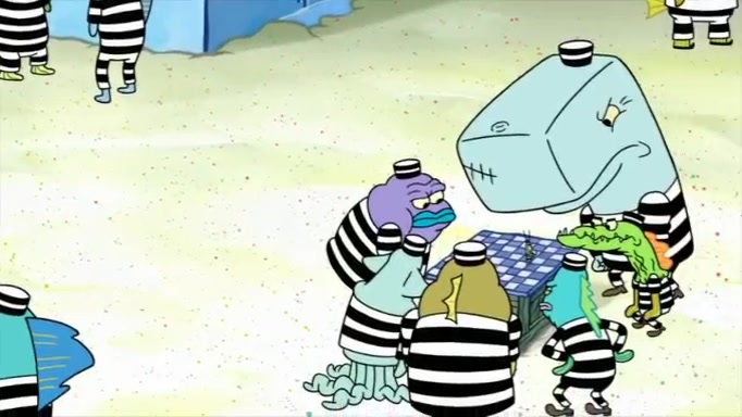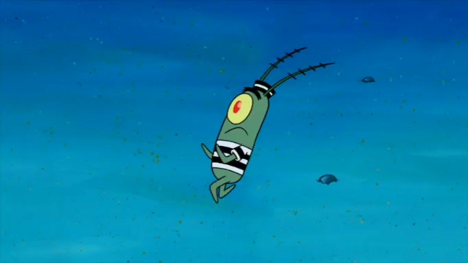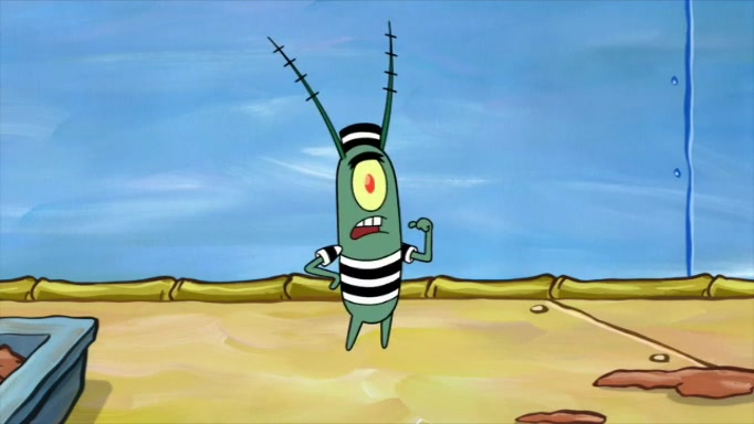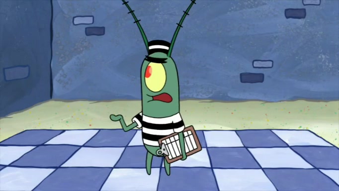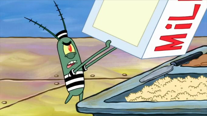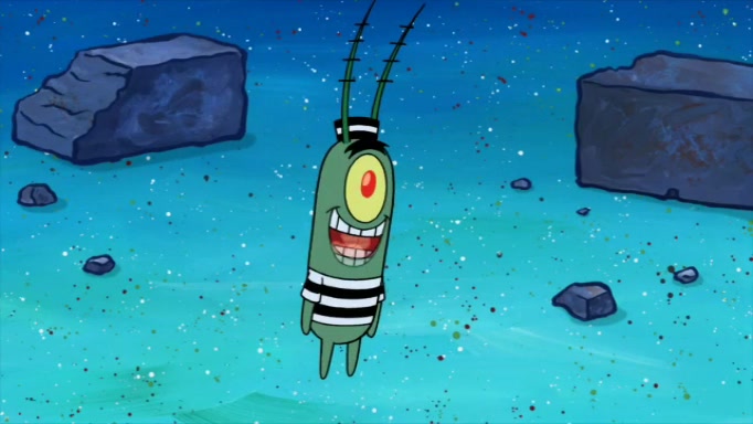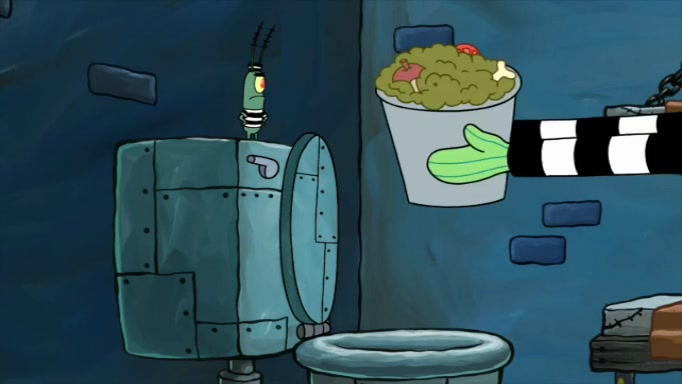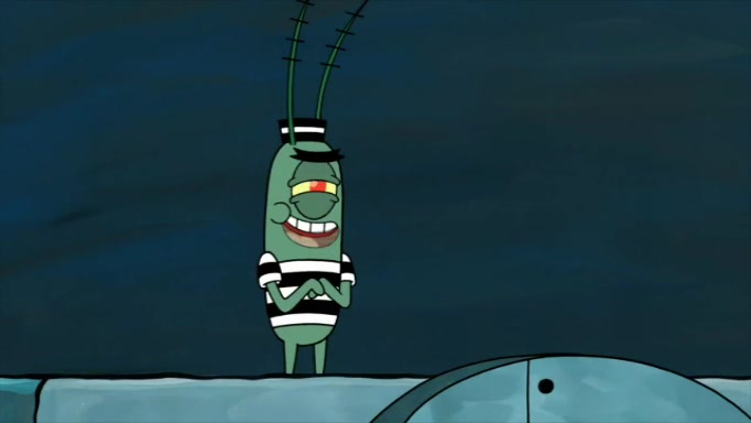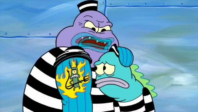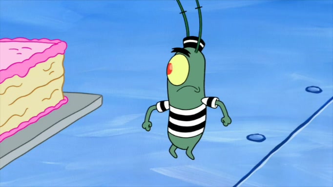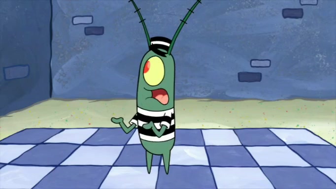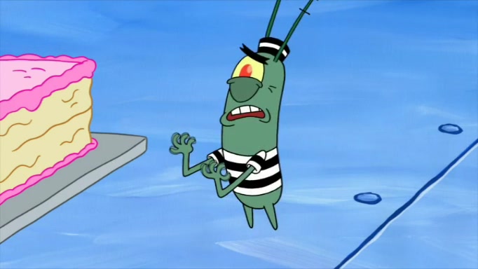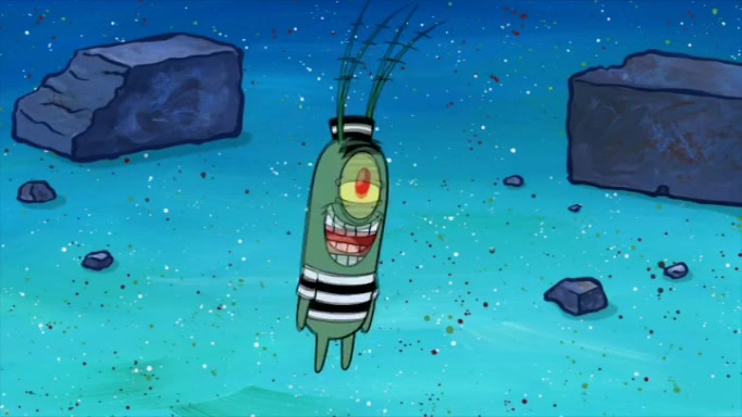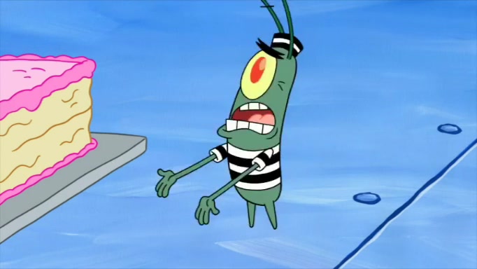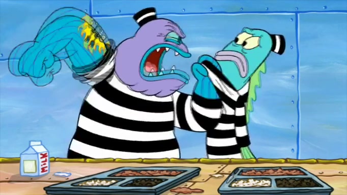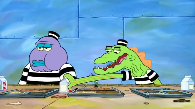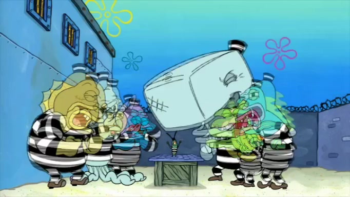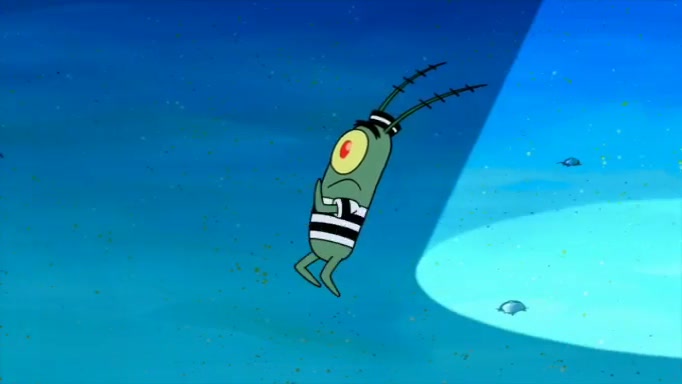 In the cafeteria, Plankton attempts to eat his food but a purple cellmate eats some of his food. Another green cellmate drinks Plankton's milk and then Plankton gets eaten by a Light Blue Cellmate. Plankton yells out that he is the most evil genius and yells out his name. The Purple Cellmate, thinking the Light Blue Cellmate is talking, doesn't believe him, saying he and the others are fans of Plankton. Plankton calls out his name again and then the Purple Cellmate punches the Light Blue Cellmate in the stomach which causes Plankton to be punched out and crash into the wall. The Purple and Green Cellmates start to beat up the Light Blue Cellmate until Plankton breaks it up. Plankton introduces himself to the Cellmates and the Cellmates say how they are going to do everything that Plankton says. Plankton gets excited saying how easily he could get the Krabby Patty Secret Formula.