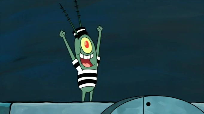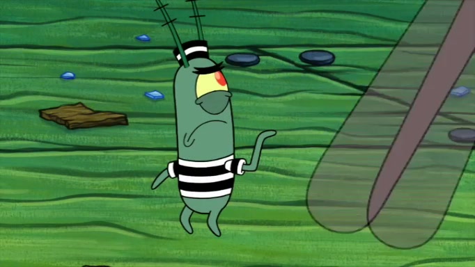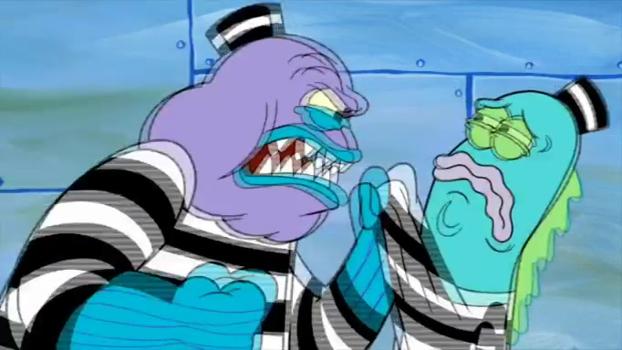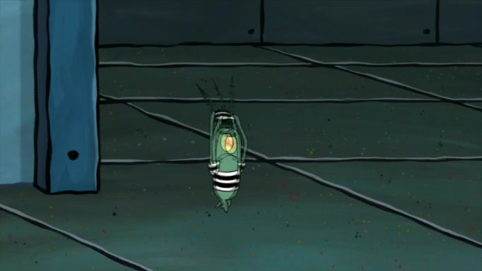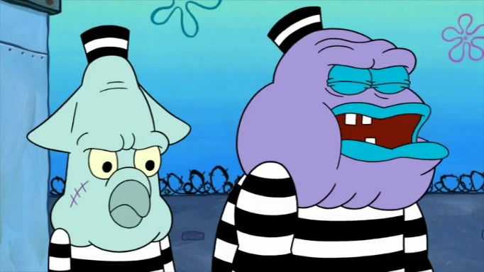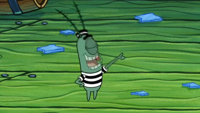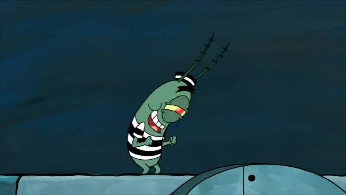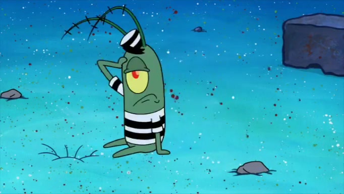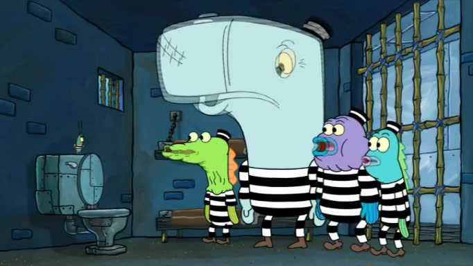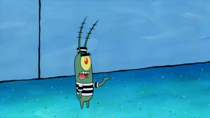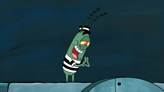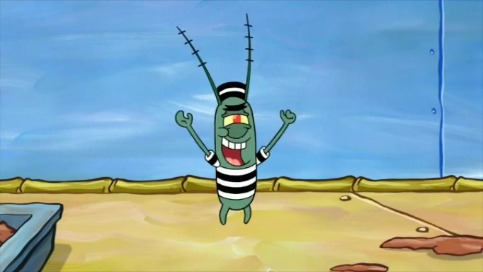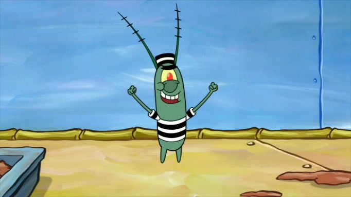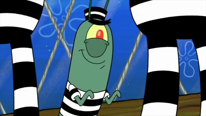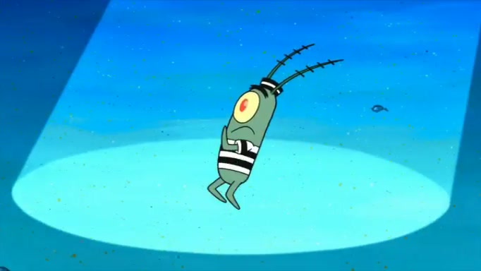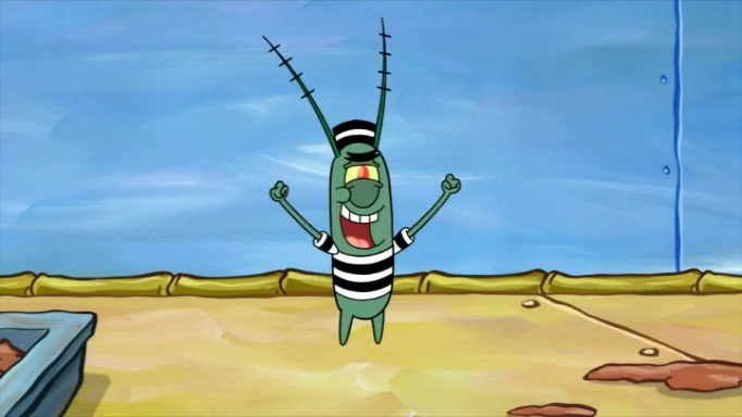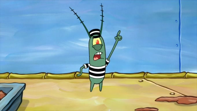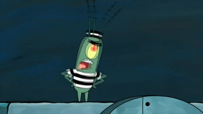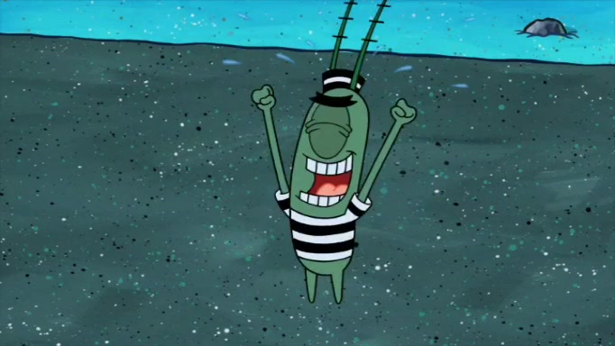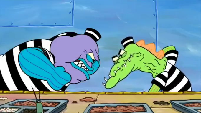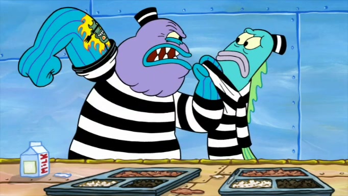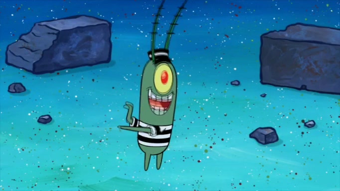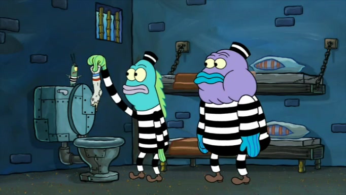 In the cafeteria, Plankton attempts to eat his food but a purple cellmate eats some of his food. Another green cellmate drinks Plankton's milk and then Plankton gets eaten by a Light Blue Cellmate. Plankton yells out that he is the most evil genius and yells out his name. The Purple Cellmate, thinking the Light Blue Cellmate is talking, doesn't believe him, saying he and the others are fans of Plankton. Plankton calls out his name again and then the Purple Cellmate punches the Light Blue Cellmate in the stomach which causes Plankton to be punched out and crash into the wall. The Purple and Green Cellmates start to beat up the Light Blue Cellmate until Plankton breaks it up. Plankton introduces himself to the Cellmates and the Cellmates say how they are going to do everything that Plankton says. Plankton gets excited saying how easily he could get the Krabby Patty Secret Formula.