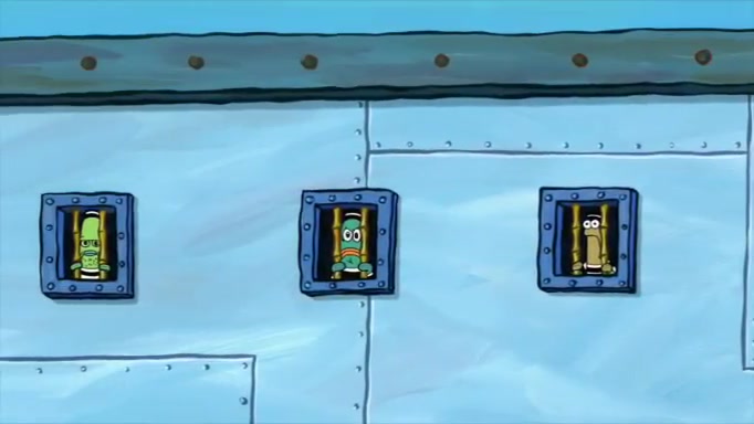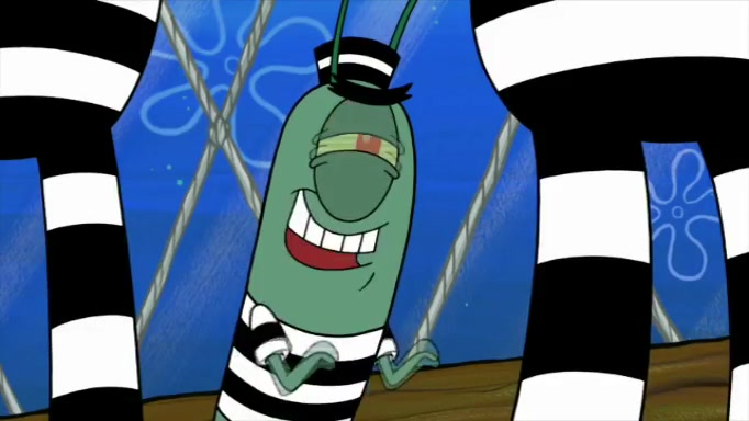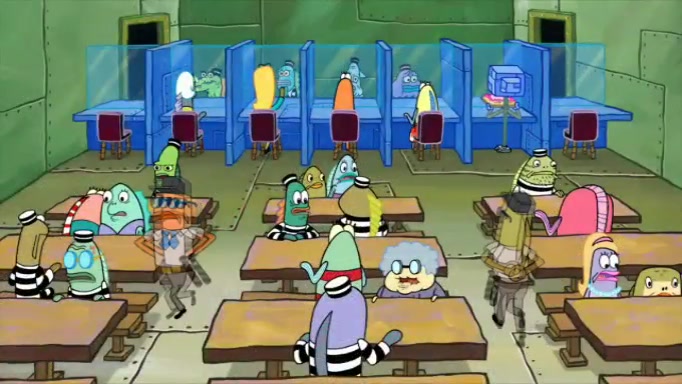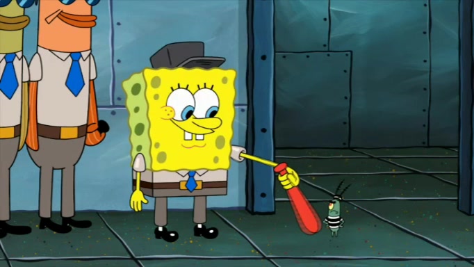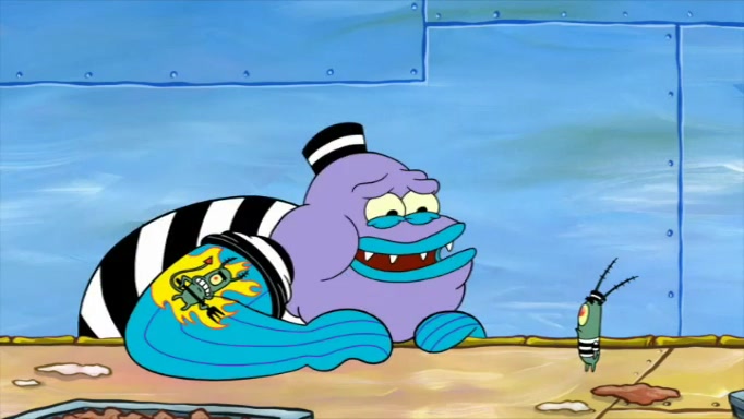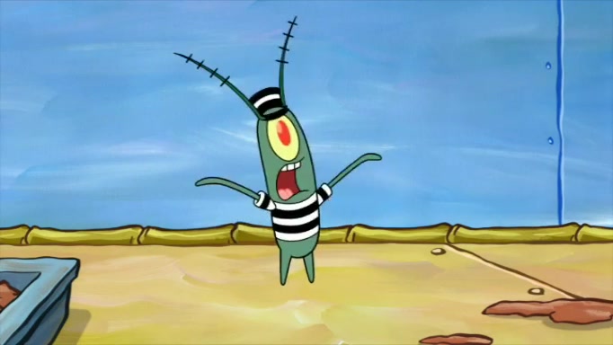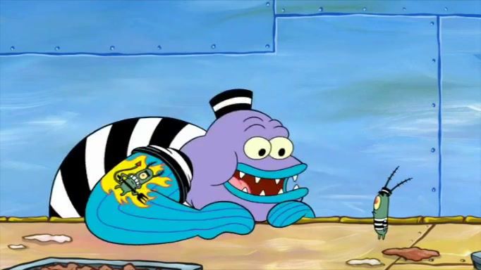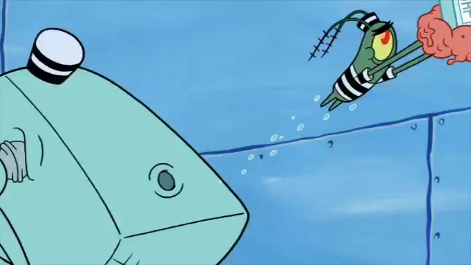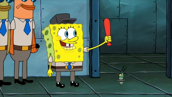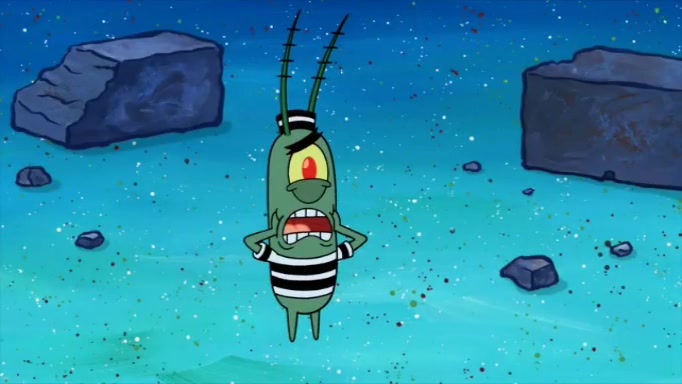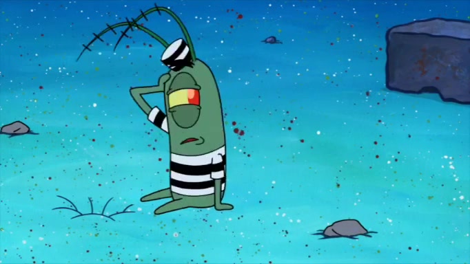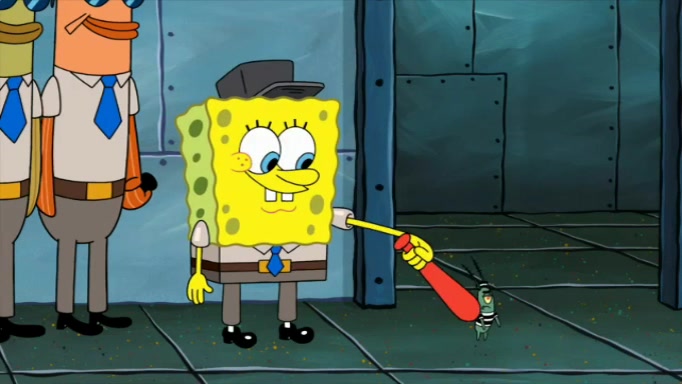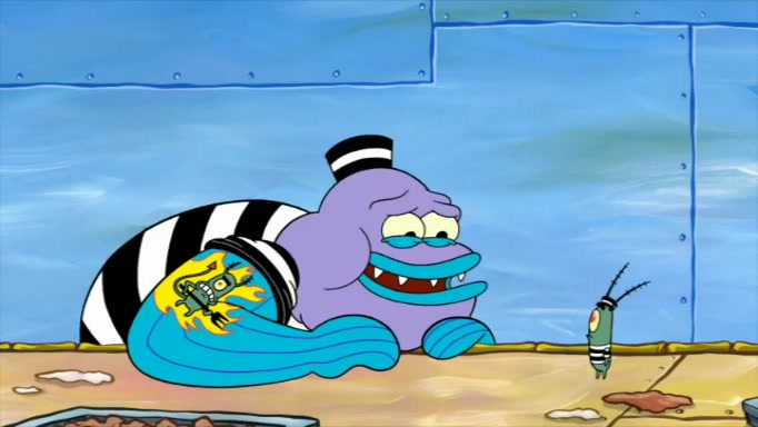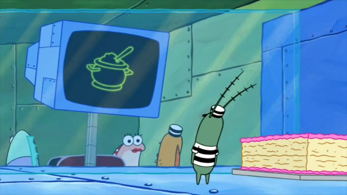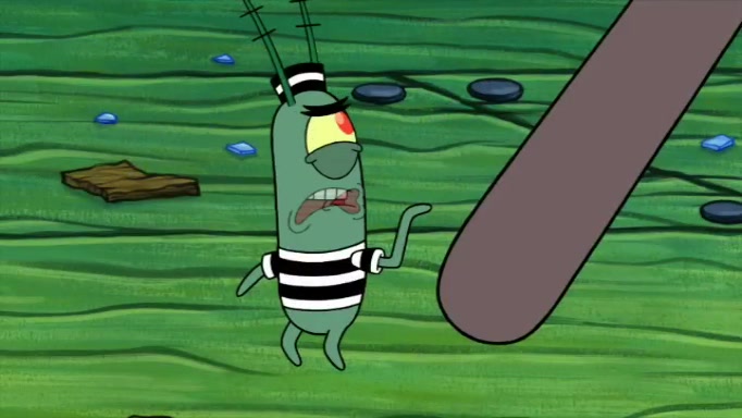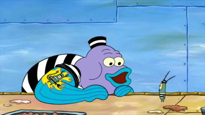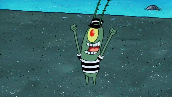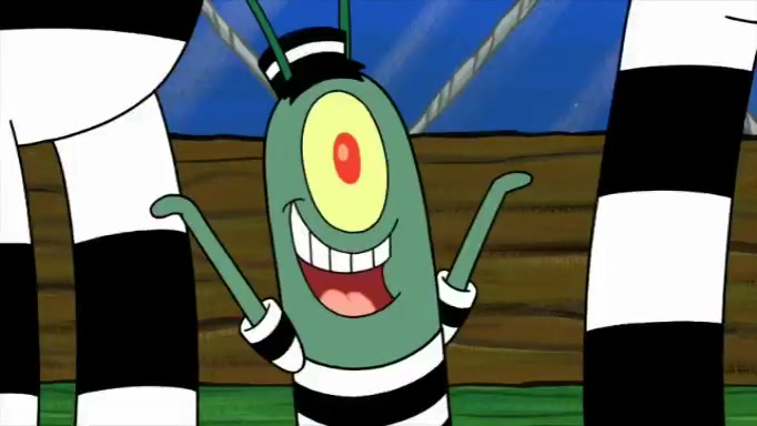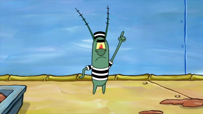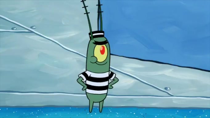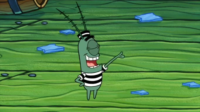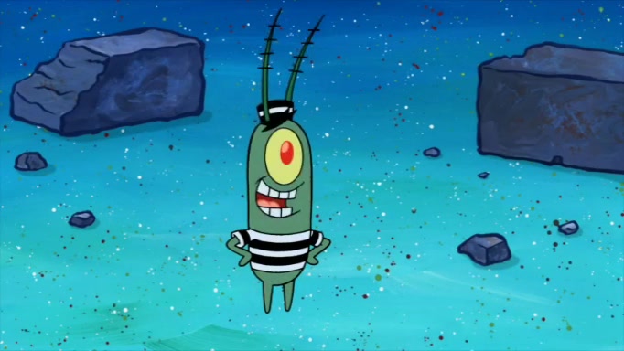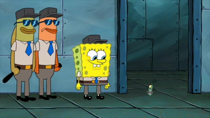 In the cafeteria, Plankton attempts to eat his food but a purple cellmate eats some of his food. Another green cellmate drinks Plankton's milk and then Plankton gets eaten by a Light Blue Cellmate. Plankton yells out that he is the most evil genius and yells out his name. The Purple Cellmate, thinking the Light Blue Cellmate is talking, doesn't believe him, saying he and the others are fans of Plankton. Plankton calls out his name again and then the Purple Cellmate punches the Light Blue Cellmate in the stomach which causes Plankton to be punched out and crash into the wall. The Purple and Green Cellmates start to beat up the Light Blue Cellmate until Plankton breaks it up. Plankton introduces himself to the Cellmates and the Cellmates say how they are going to do everything that Plankton says. Plankton gets excited saying how easily he could get the Krabby Patty Secret Formula.