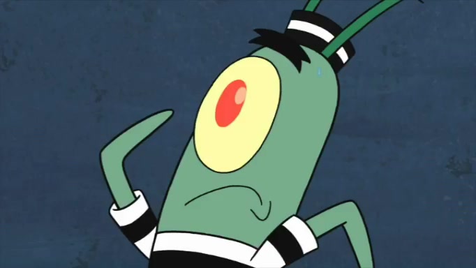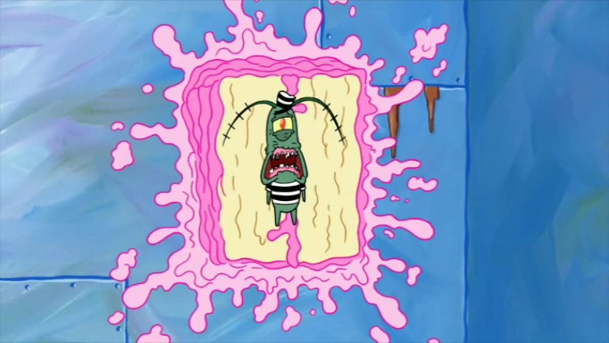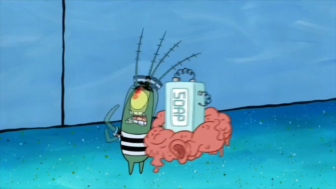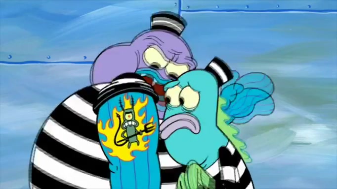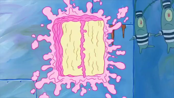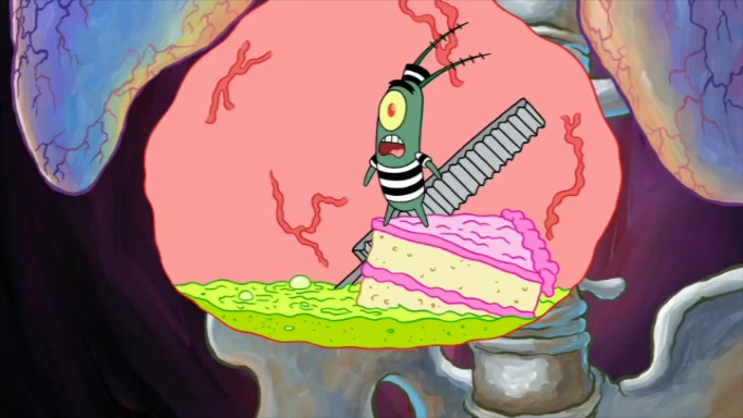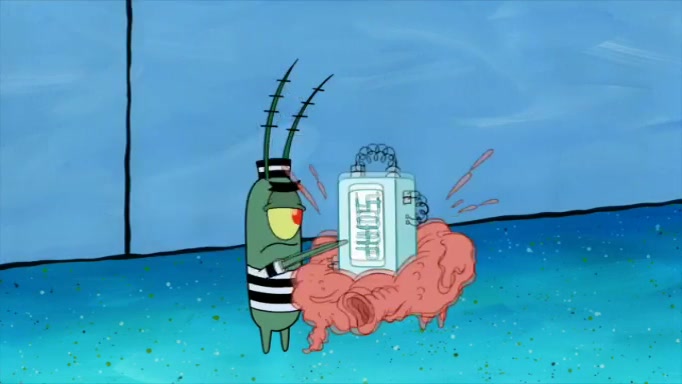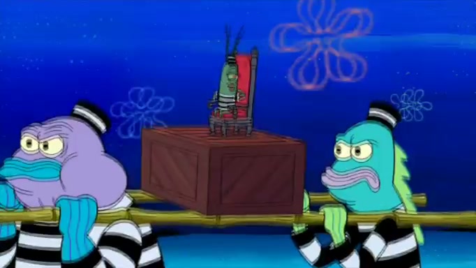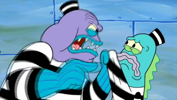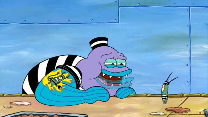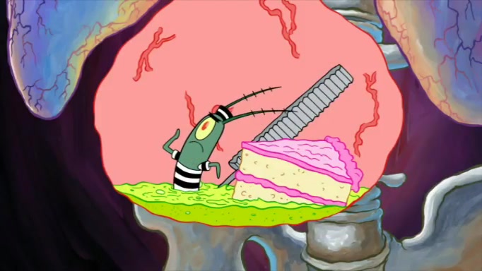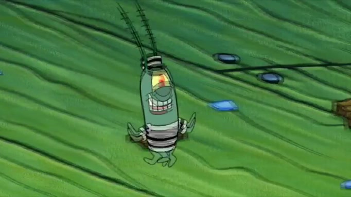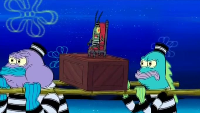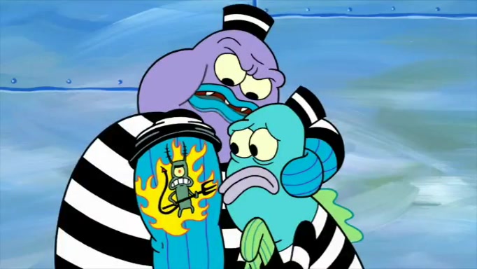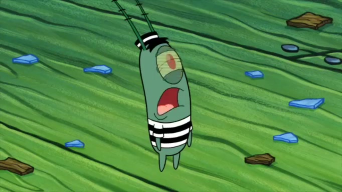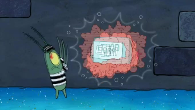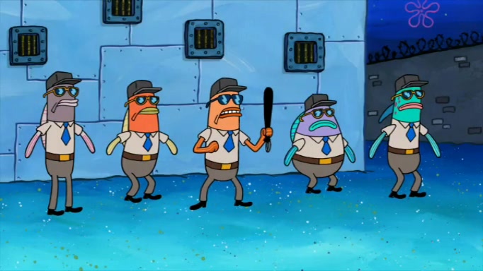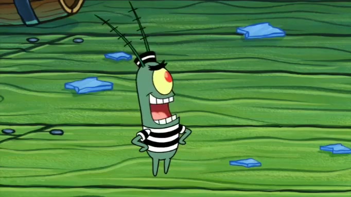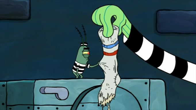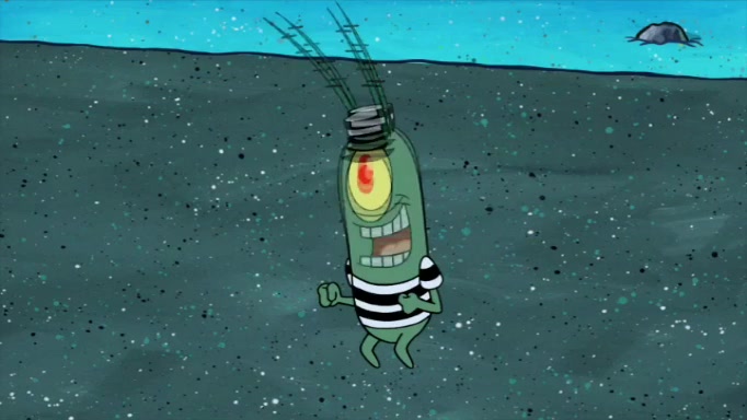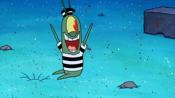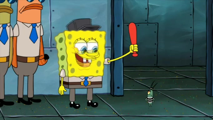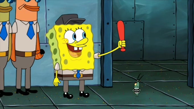 In the cafeteria, Plankton attempts to eat his food but a purple cellmate eats some of his food. Another green cellmate drinks Plankton's milk and then Plankton gets eaten by a Light Blue Cellmate. Plankton yells out that he is the most evil genius and yells out his name. The Purple Cellmate, thinking the Light Blue Cellmate is talking, doesn't believe him, saying he and the others are fans of Plankton. Plankton calls out his name again and then the Purple Cellmate punches the Light Blue Cellmate in the stomach which causes Plankton to be punched out and crash into the wall. The Purple and Green Cellmates start to beat up the Light Blue Cellmate until Plankton breaks it up. Plankton introduces himself to the Cellmates and the Cellmates say how they are going to do everything that Plankton says. Plankton gets excited saying how easily he could get the Krabby Patty Secret Formula.