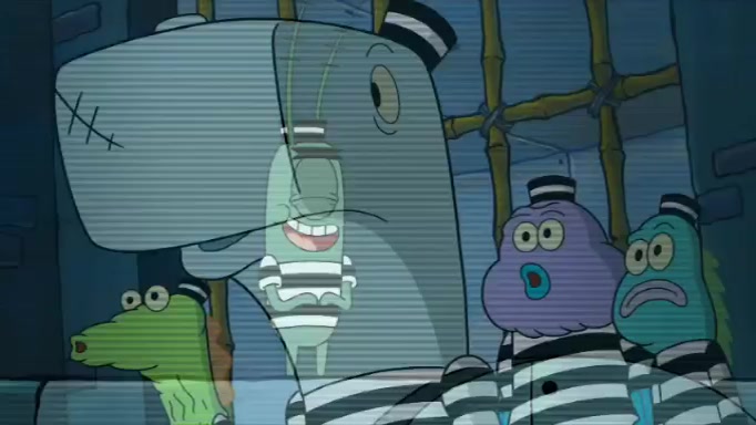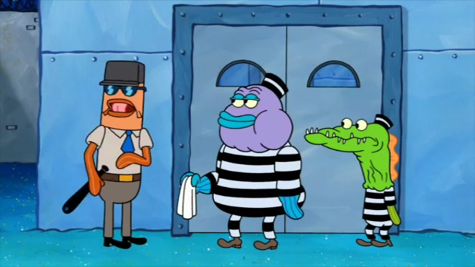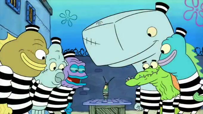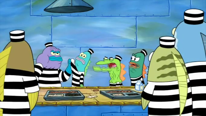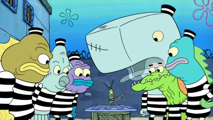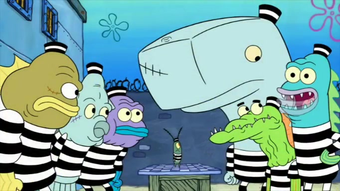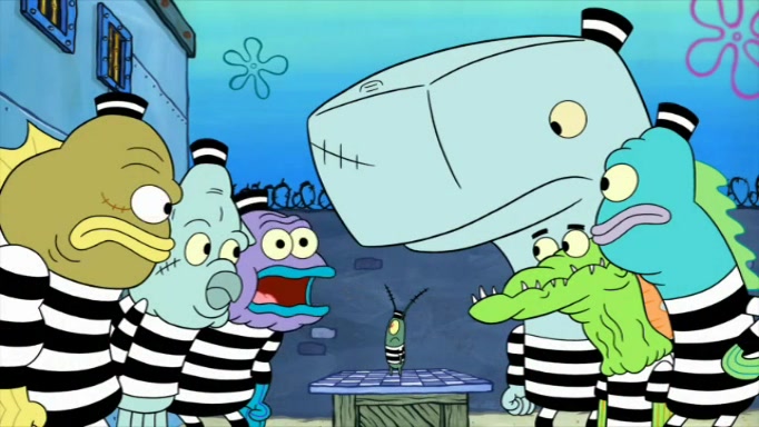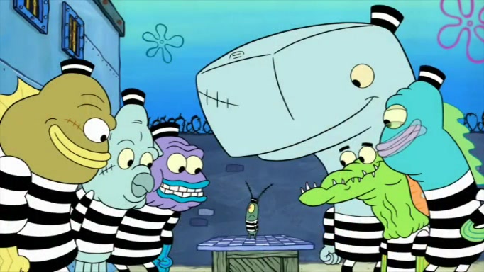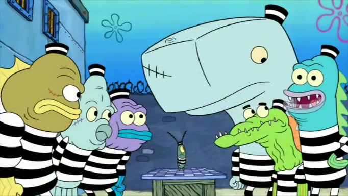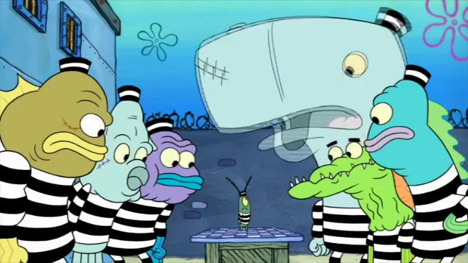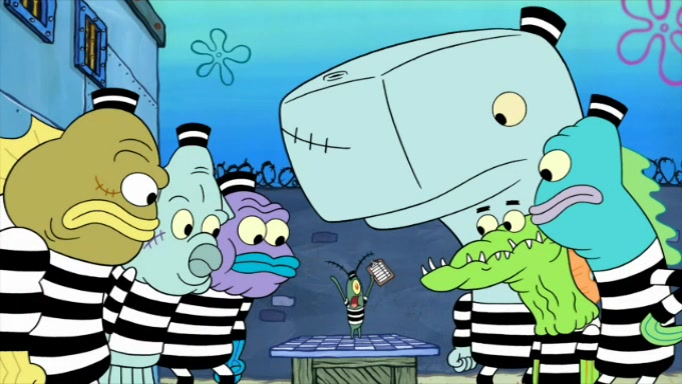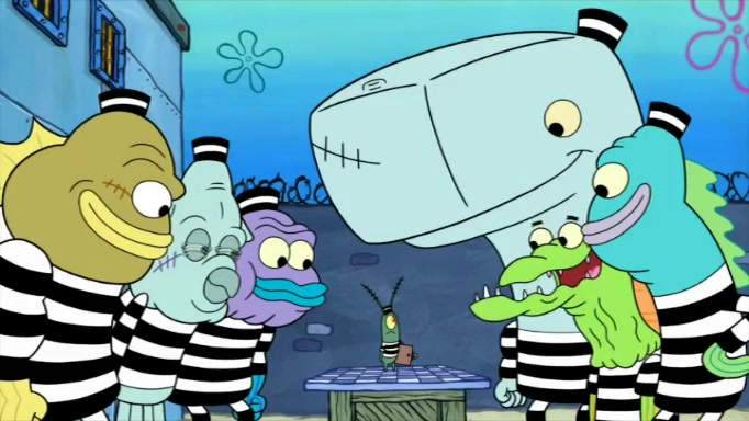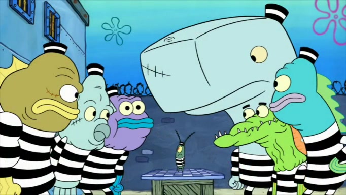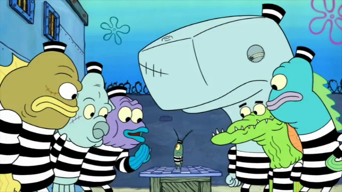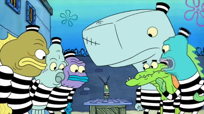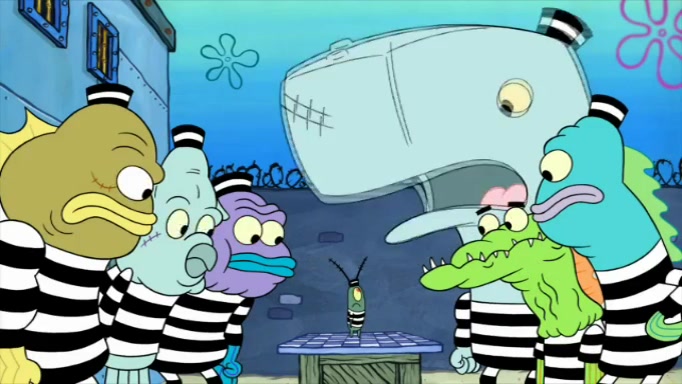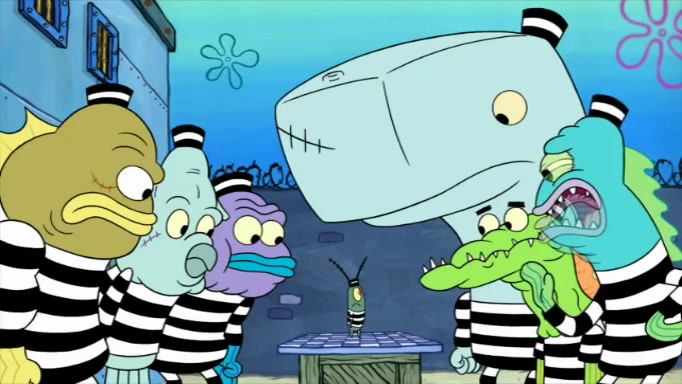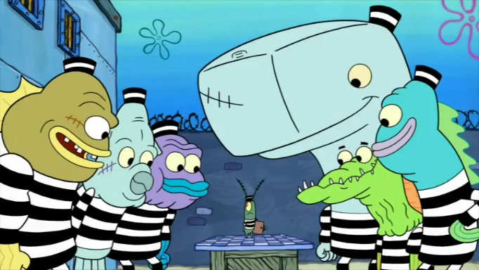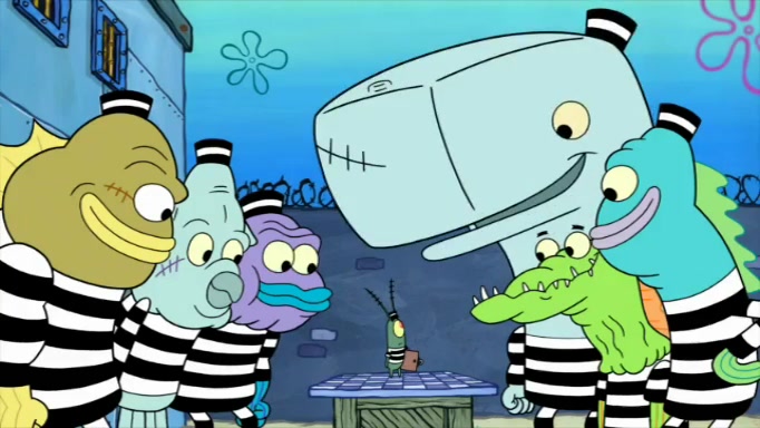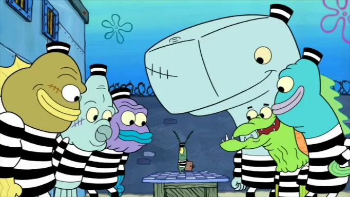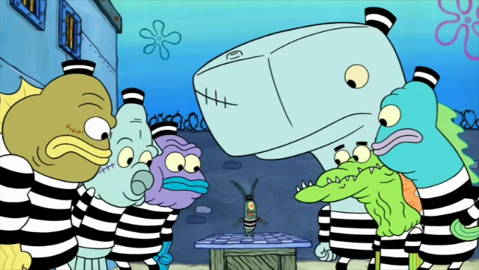 Outside, Plankton is explaining to his Cellmates how to escape from the Bikini Bottom Jail. The Cellmates have ideas but Plankton tells them they need better ones. The Whale Cellmate says they could break out only if they had chum and the other Cellmates agree. Plankton is surprised with the Cellmates saying how chum is great for committing crimes. Plankton asks if chum is great for eating but the Cellmates don't think so. Plankton then agrees to make chum for the Cellmates and they all cheer. Inside Plankton's jail cell, Plankton and his Cellmates are creating chum using different kinds of items. They successfully make the chum. SpongeBob overhears them and runs to the Krusty Krab to warn Mr. Krabs. At the Krusty Krab, SpongeBob tells Mr. Krabs that Plankton is planning to break into the Krusty Krab with his Cellmates. Mr. Krabs insures SpongeBob that he will handle the problem.