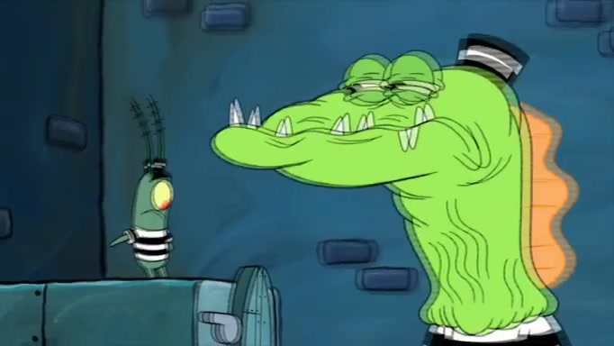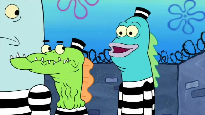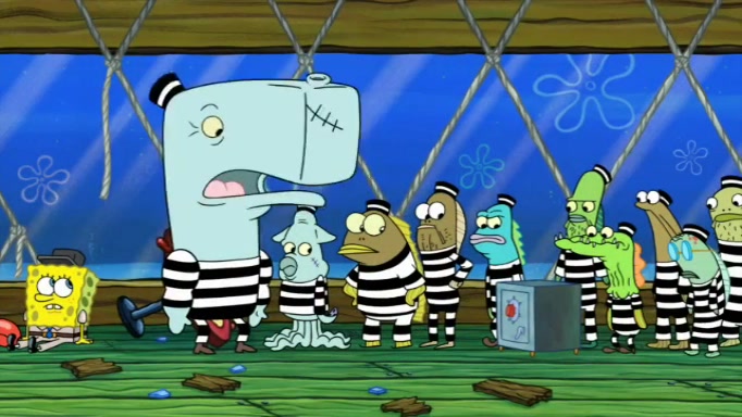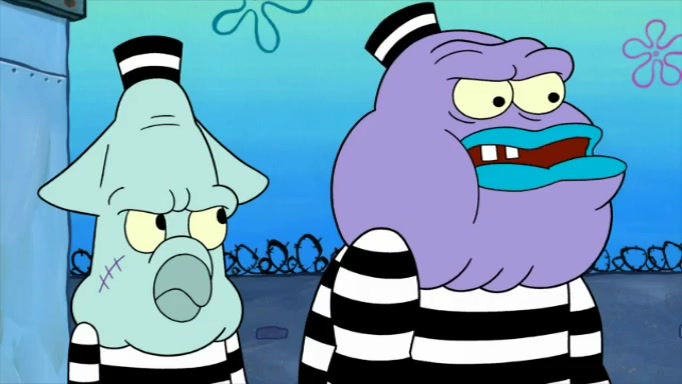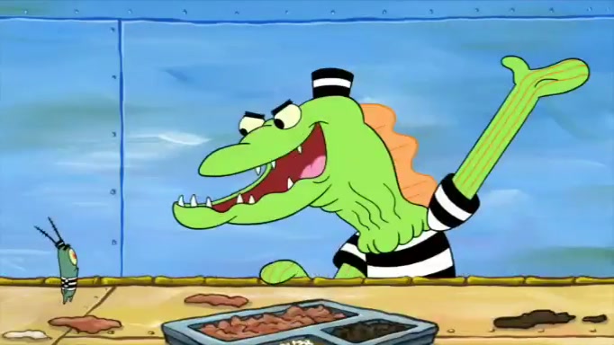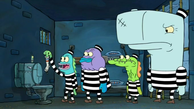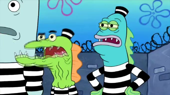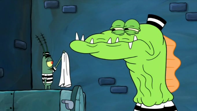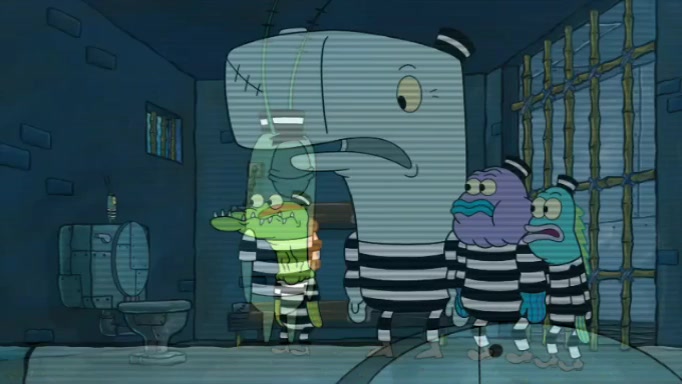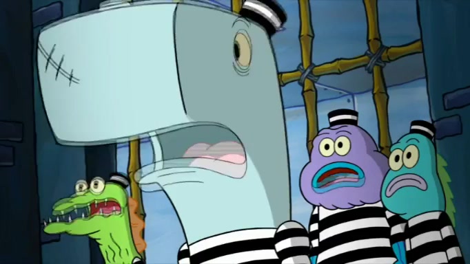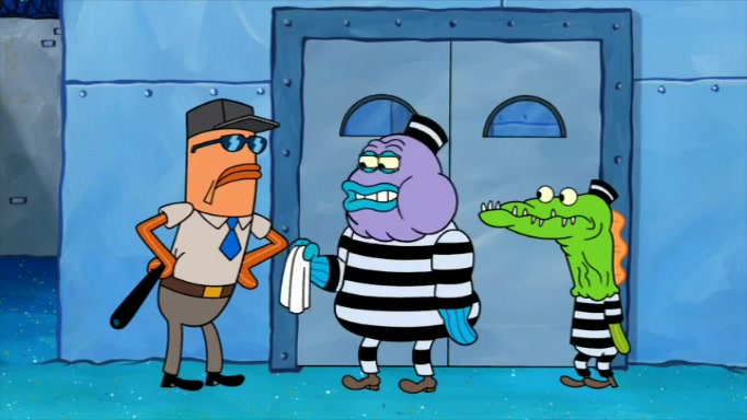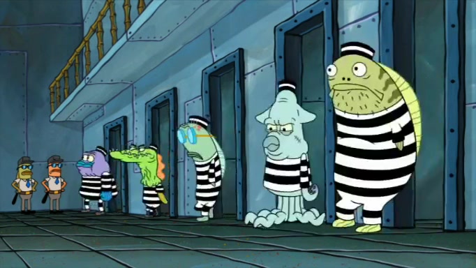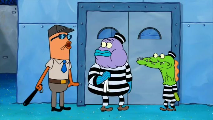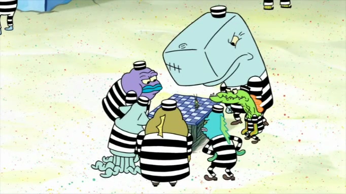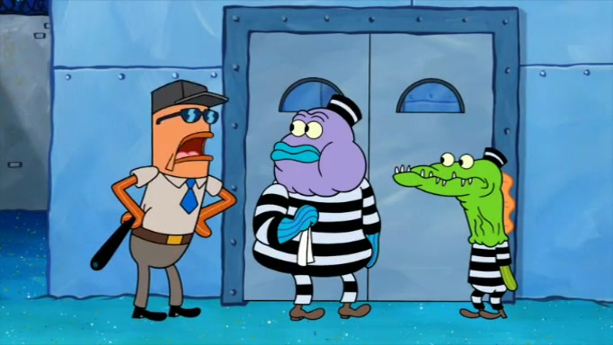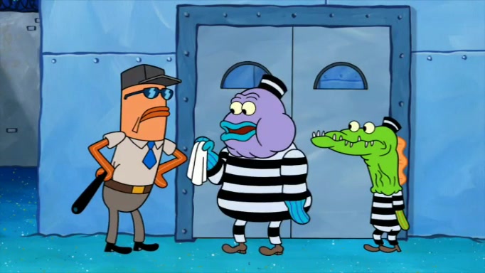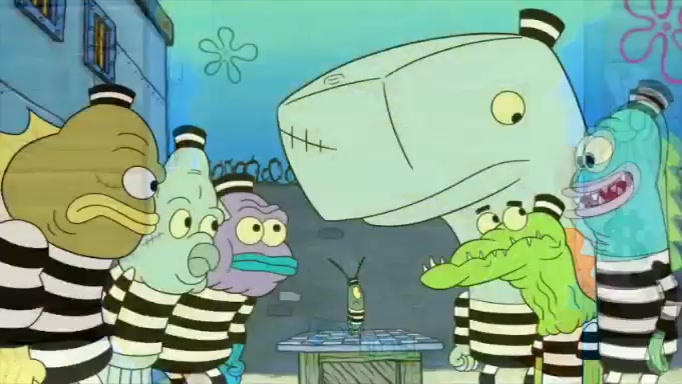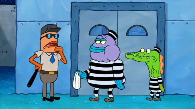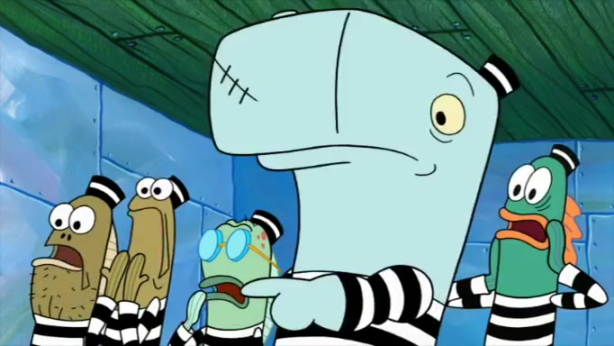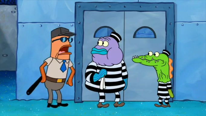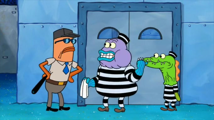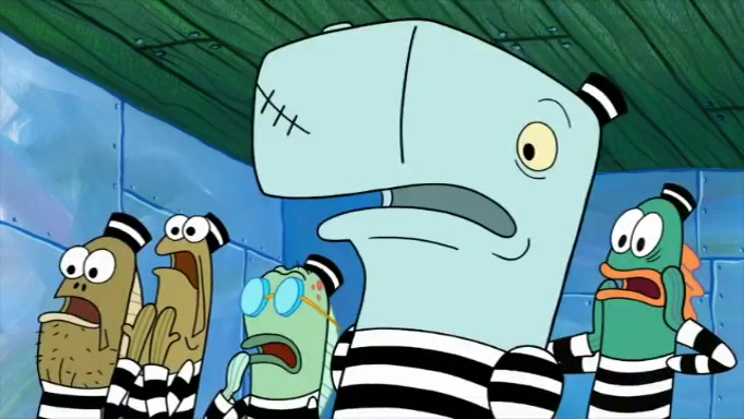 Outside, Plankton is explaining to his Cellmates how to escape from the Bikini Bottom Jail. The Cellmates have ideas but Plankton tells them they need better ones. The Whale Cellmate says they could break out only if they had chum and the other Cellmates agree. Plankton is surprised with the Cellmates saying how chum is great for committing crimes. Plankton asks if chum is great for eating but the Cellmates don't think so. Plankton then agrees to make chum for the Cellmates and they all cheer. Inside Plankton's jail cell, Plankton and his Cellmates are creating chum using different kinds of items. They successfully make the chum. SpongeBob overhears them and runs to the Krusty Krab to warn Mr. Krabs. At the Krusty Krab, SpongeBob tells Mr. Krabs that Plankton is planning to break into the Krusty Krab with his Cellmates. Mr. Krabs insures SpongeBob that he will handle the problem.