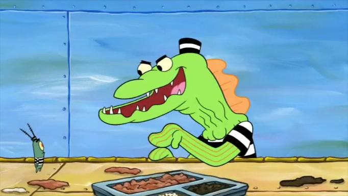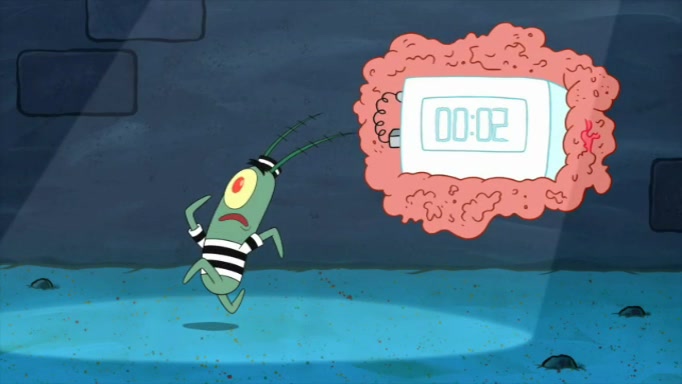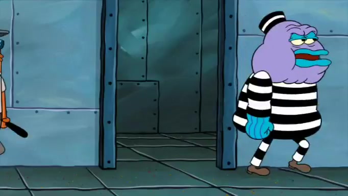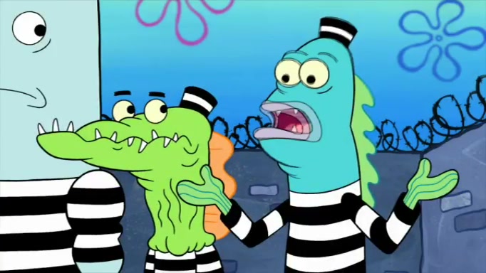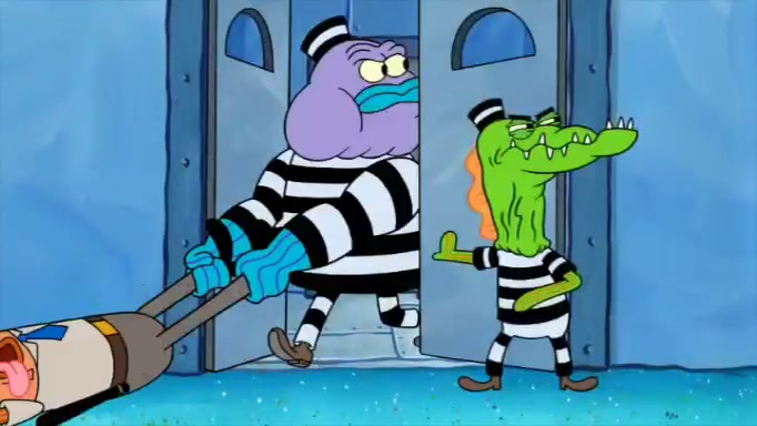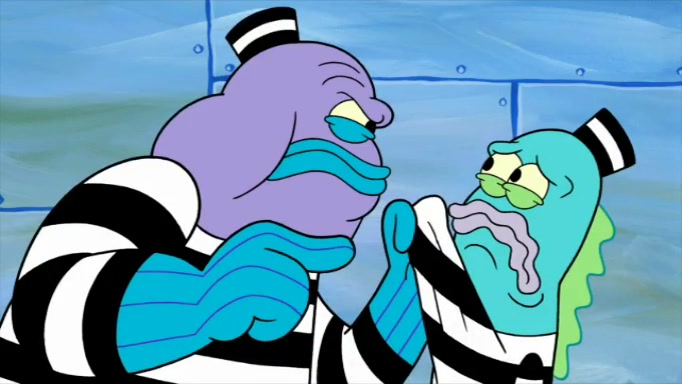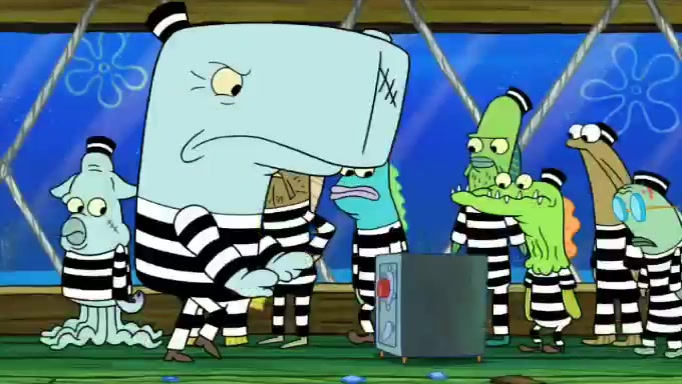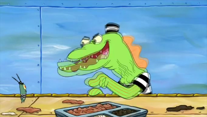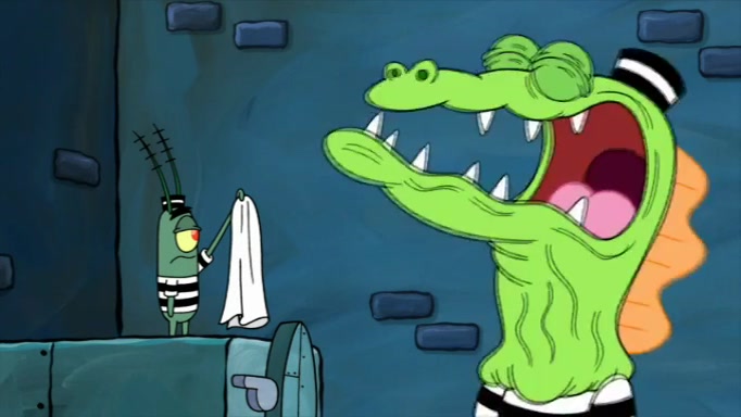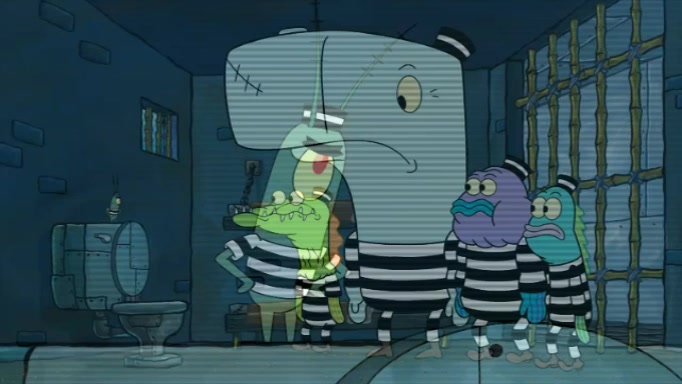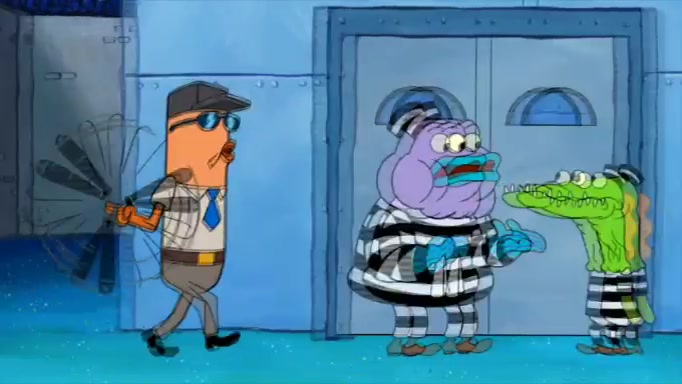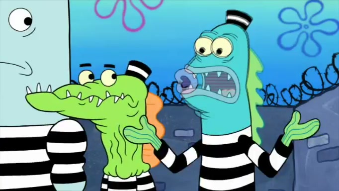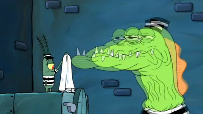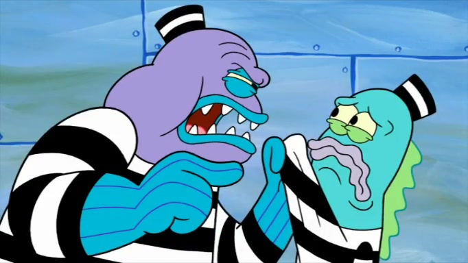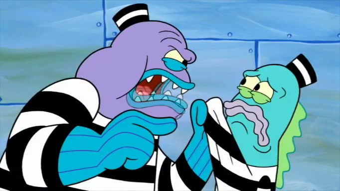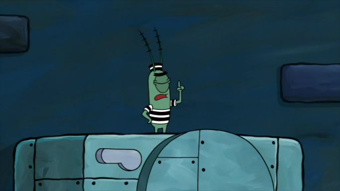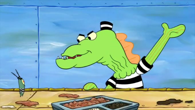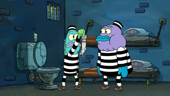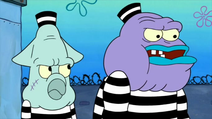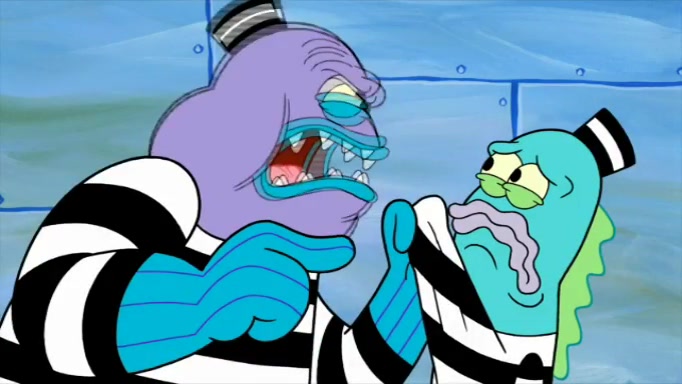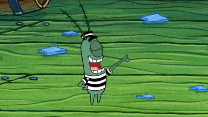 Outside, Plankton is explaining to his Cellmates how to escape from the Bikini Bottom Jail. The Cellmates have ideas but Plankton tells them they need better ones. The Whale Cellmate says they could break out only if they had chum and the other Cellmates agree. Plankton is surprised with the Cellmates saying how chum is great for committing crimes. Plankton asks if chum is great for eating but the Cellmates don't think so. Plankton then agrees to make chum for the Cellmates and they all cheer. Inside Plankton's jail cell, Plankton and his Cellmates are creating chum using different kinds of items. They successfully make the chum. SpongeBob overhears them and runs to the Krusty Krab to warn Mr. Krabs. At the Krusty Krab, SpongeBob tells Mr. Krabs that Plankton is planning to break into the Krusty Krab with his Cellmates. Mr. Krabs insures SpongeBob that he will handle the problem.