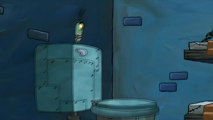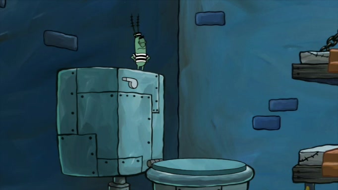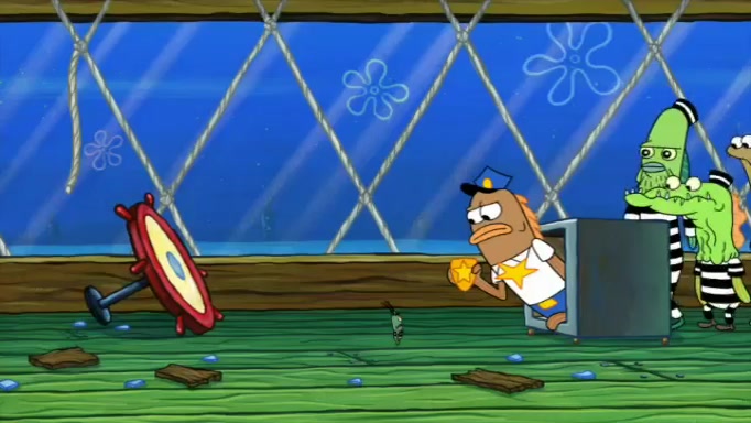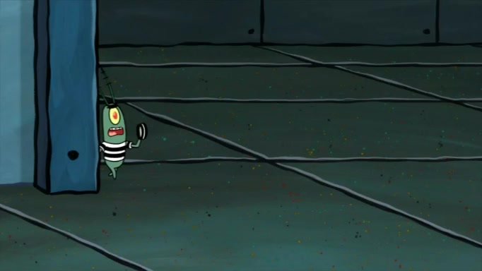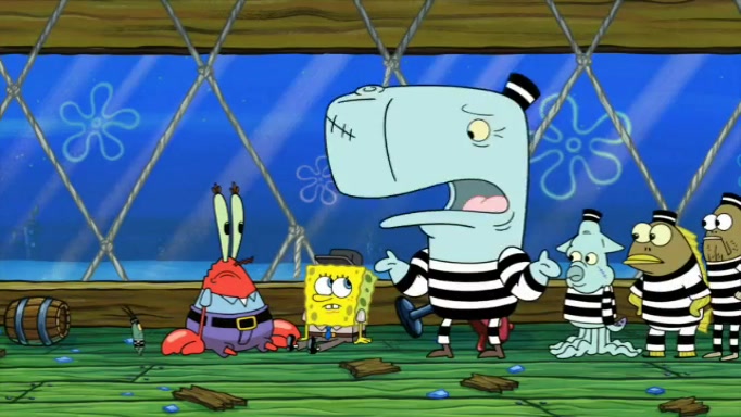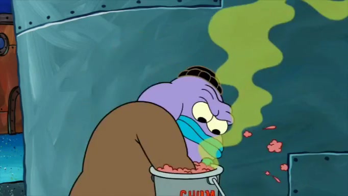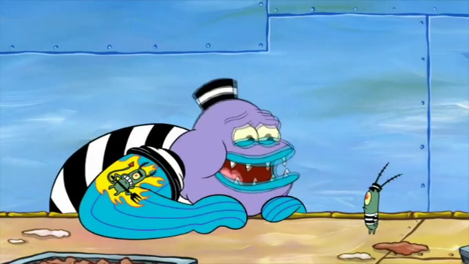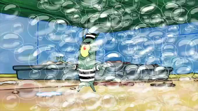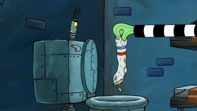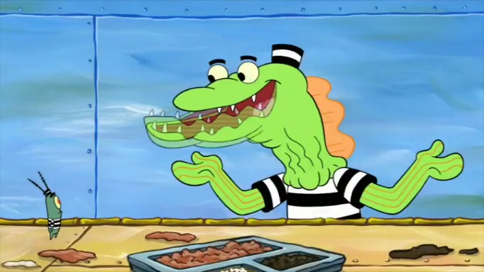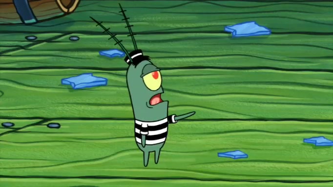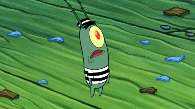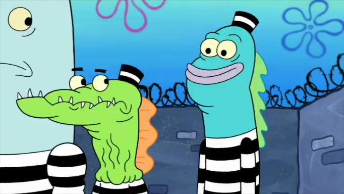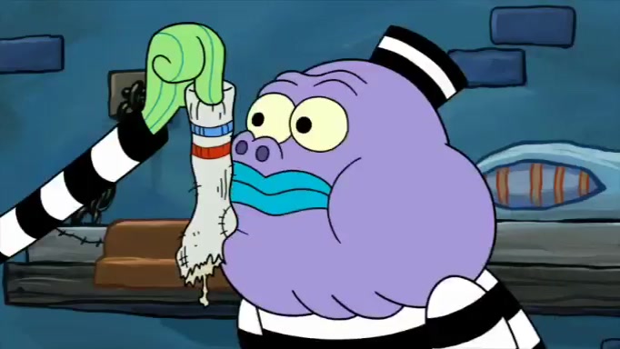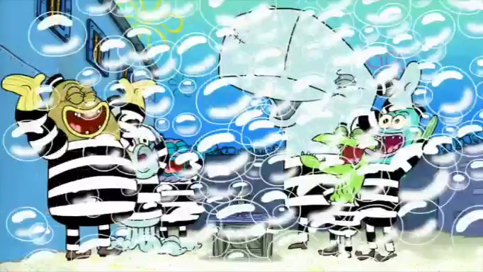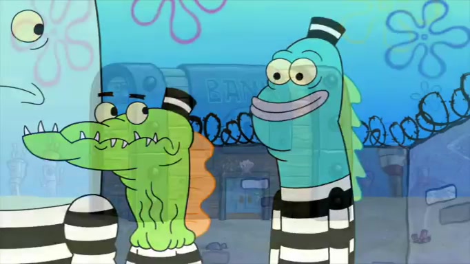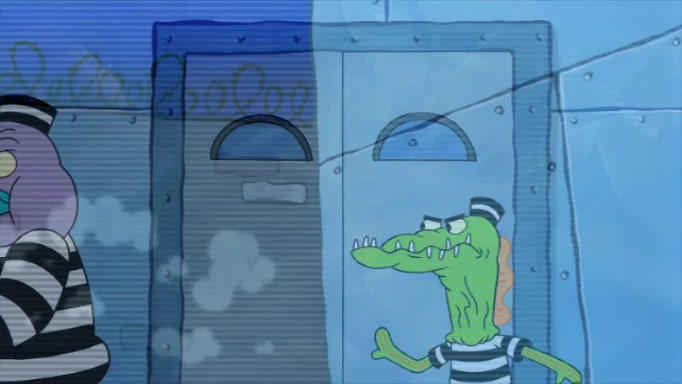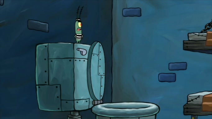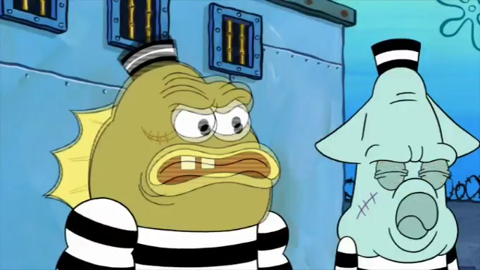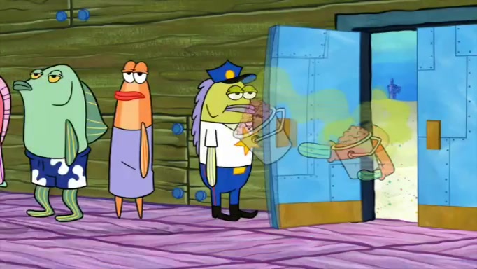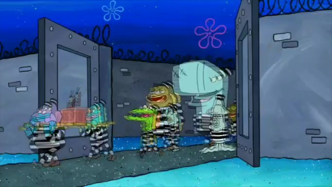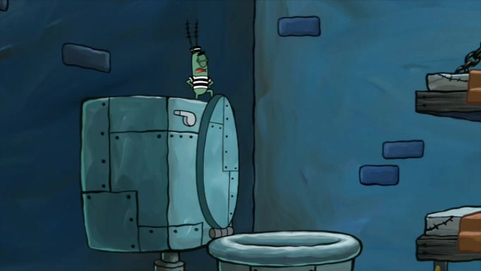 Outside, Plankton is explaining to his Cellmates how to escape from the Bikini Bottom Jail. The Cellmates have ideas but Plankton tells them they need better ones. The Whale Cellmate says they could break out only if they had chum and the other Cellmates agree. Plankton is surprised with the Cellmates saying how chum is great for committing crimes. Plankton asks if chum is great for eating but the Cellmates don't think so. Plankton then agrees to make chum for the Cellmates and they all cheer. Inside Plankton's jail cell, Plankton and his Cellmates are creating chum using different kinds of items. They successfully make the chum. SpongeBob overhears them and runs to the Krusty Krab to warn Mr. Krabs. At the Krusty Krab, SpongeBob tells Mr. Krabs that Plankton is planning to break into the Krusty Krab with his Cellmates. Mr. Krabs insures SpongeBob that he will handle the problem.