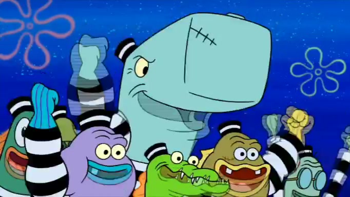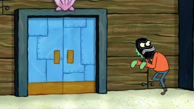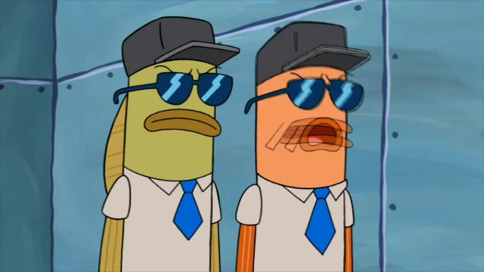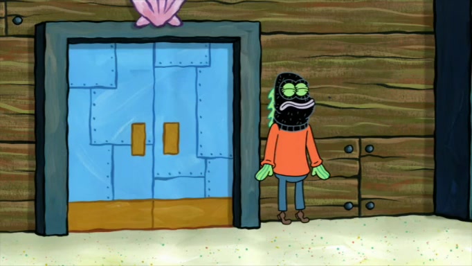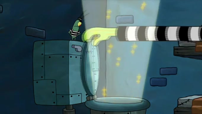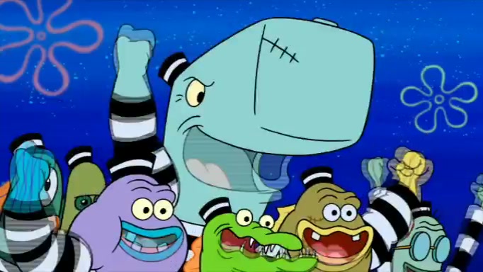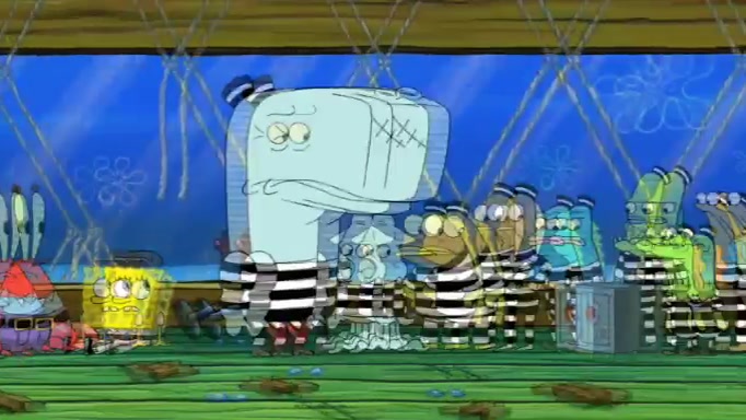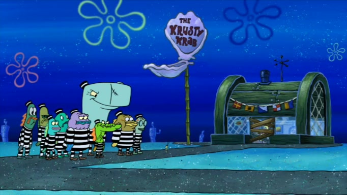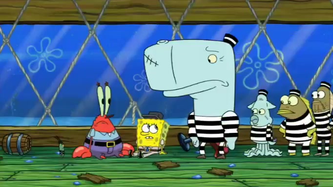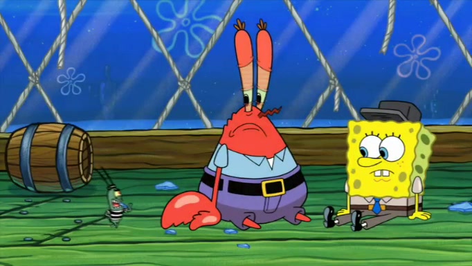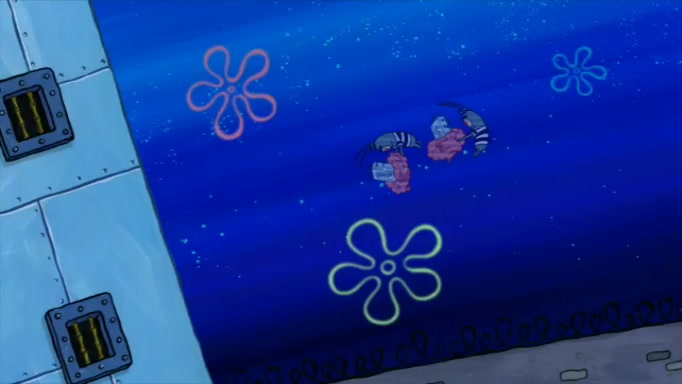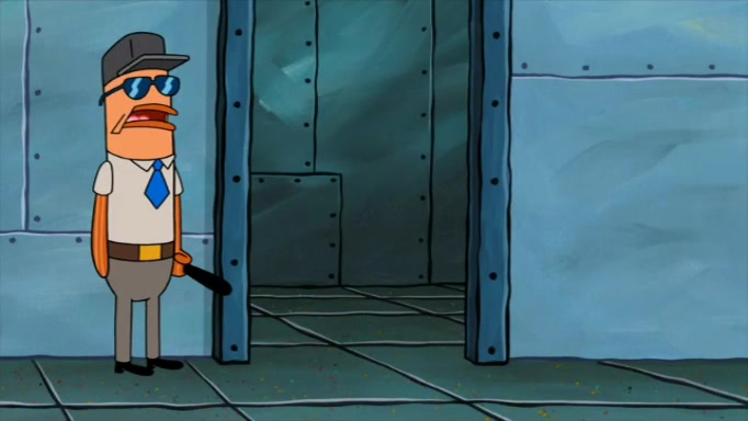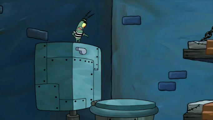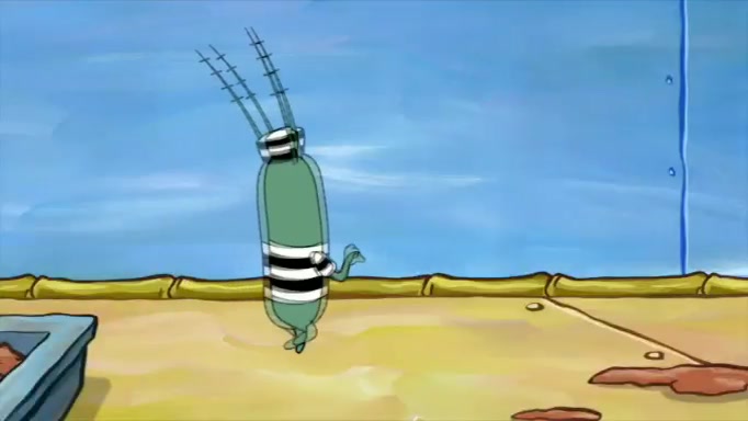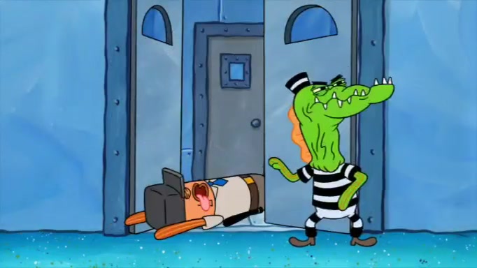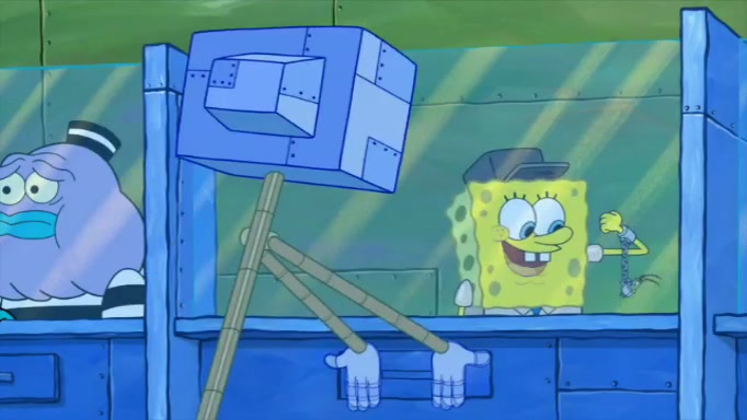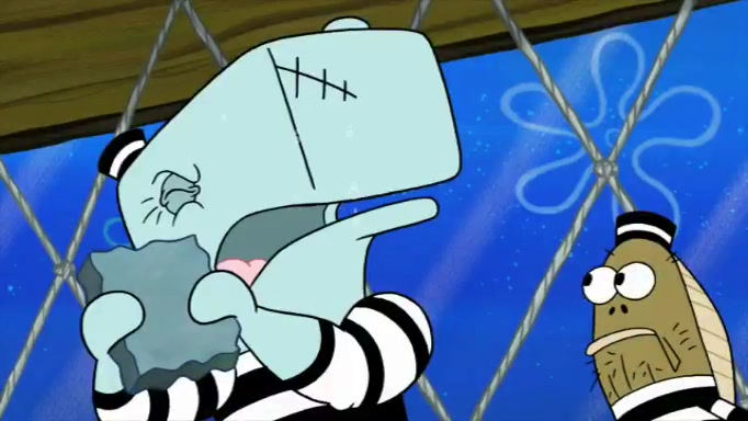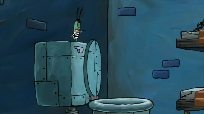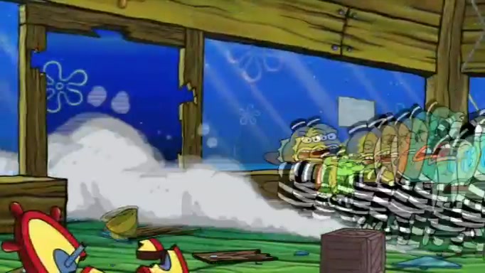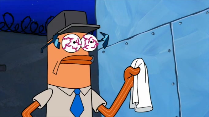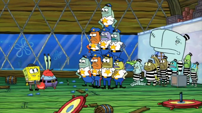 Outside, Plankton is explaining to his Cellmates how to escape from the Bikini Bottom Jail. The Cellmates have ideas but Plankton tells them they need better ones. The Whale Cellmate says they could break out only if they had chum and the other Cellmates agree. Plankton is surprised with the Cellmates saying how chum is great for committing crimes. Plankton asks if chum is great for eating but the Cellmates don't think so. Plankton then agrees to make chum for the Cellmates and they all cheer. Inside Plankton's jail cell, Plankton and his Cellmates are creating chum using different kinds of items. They successfully make the chum. SpongeBob overhears them and runs to the Krusty Krab to warn Mr. Krabs. At the Krusty Krab, SpongeBob tells Mr. Krabs that Plankton is planning to break into the Krusty Krab with his Cellmates. Mr. Krabs insures SpongeBob that he will handle the problem.