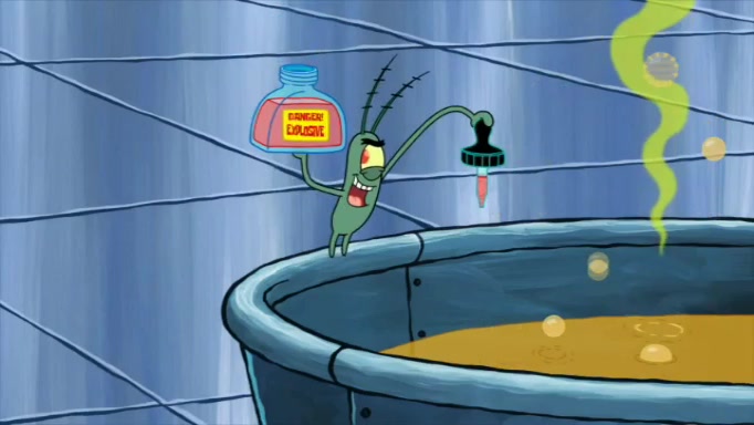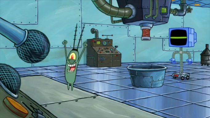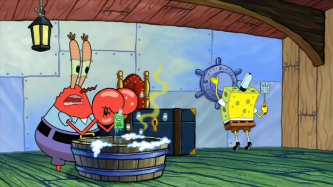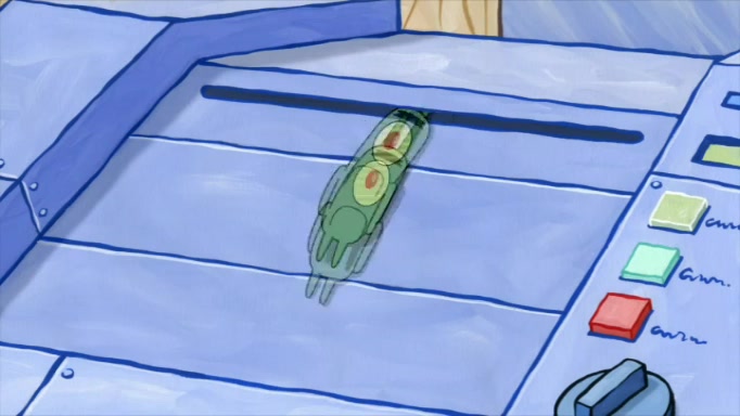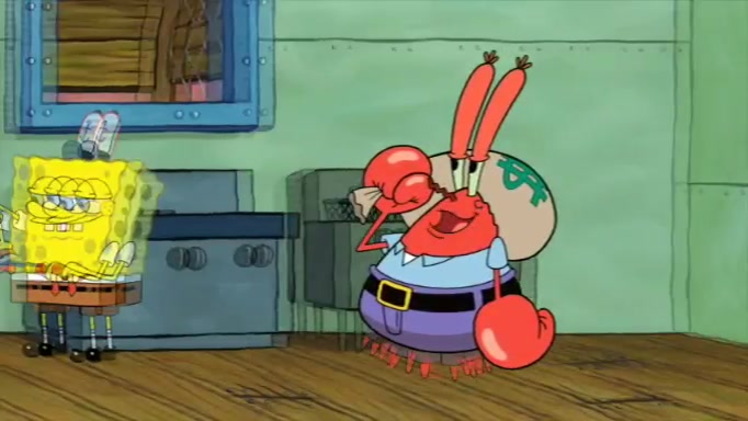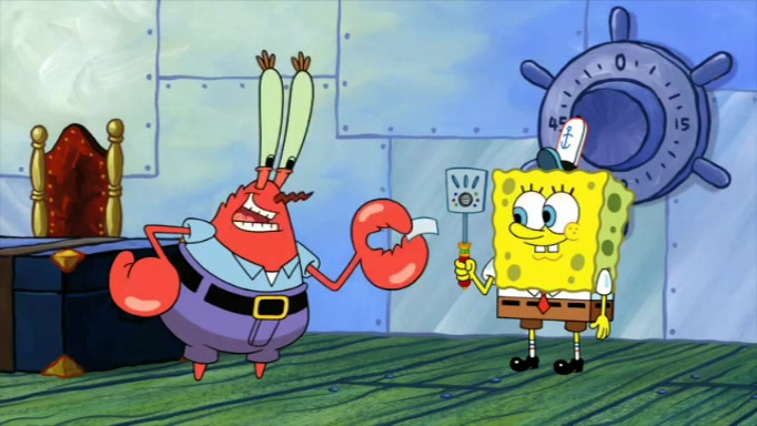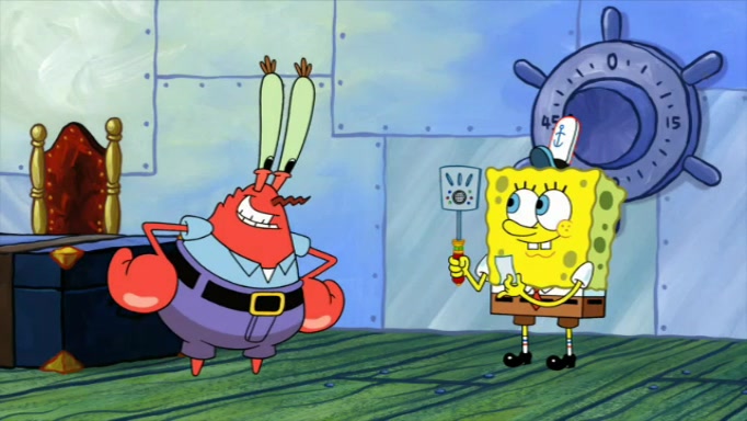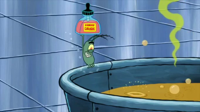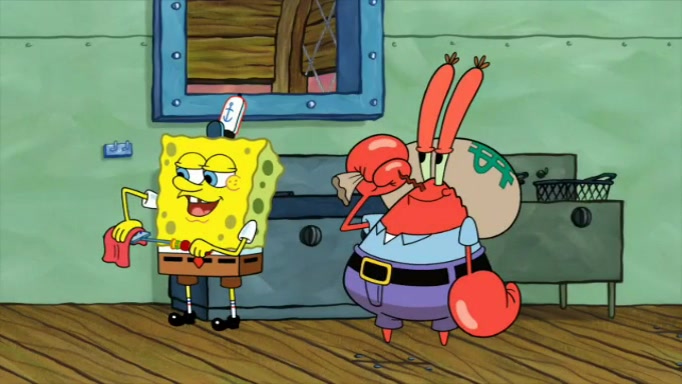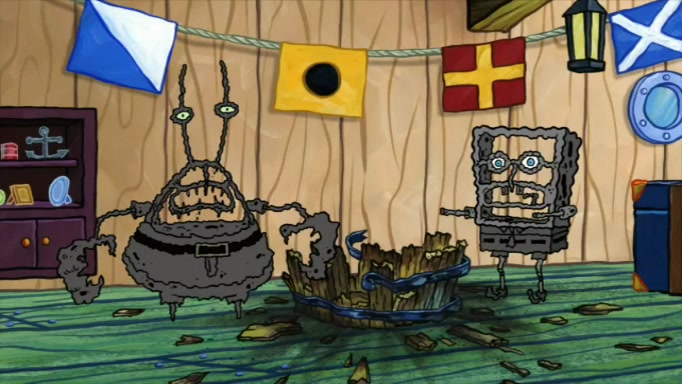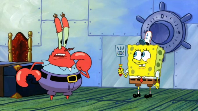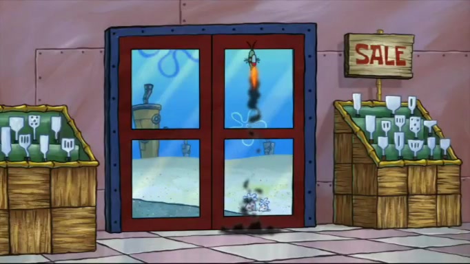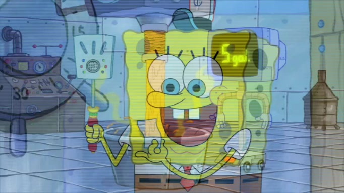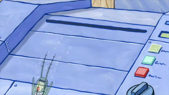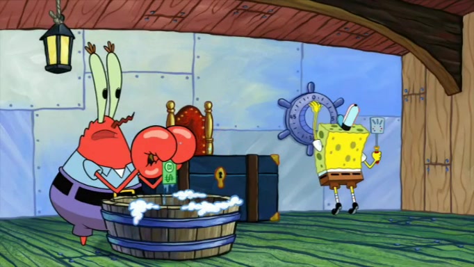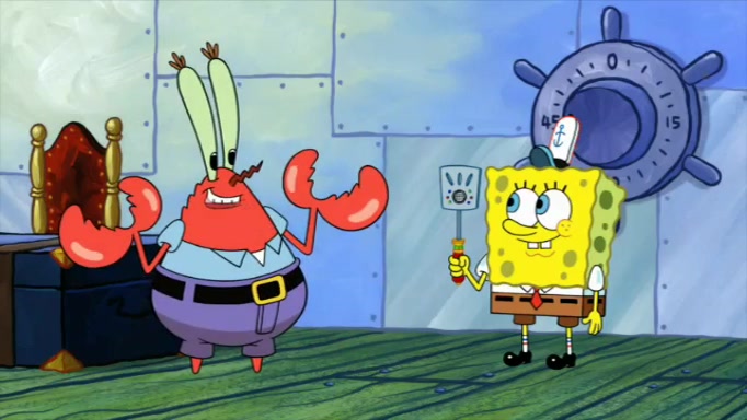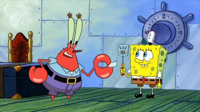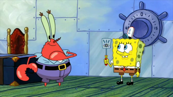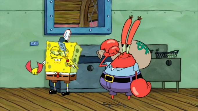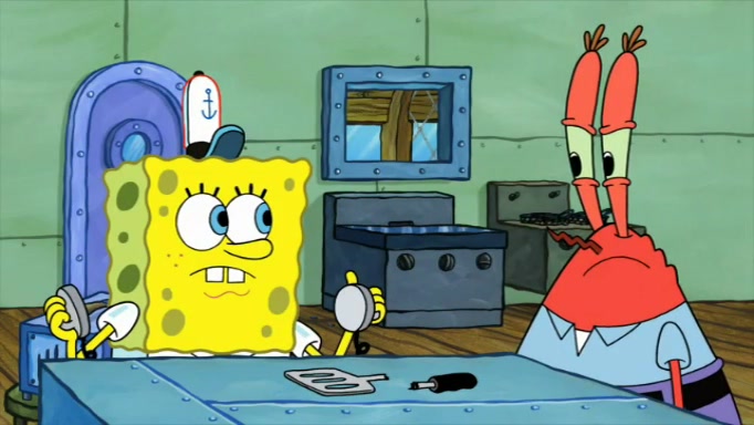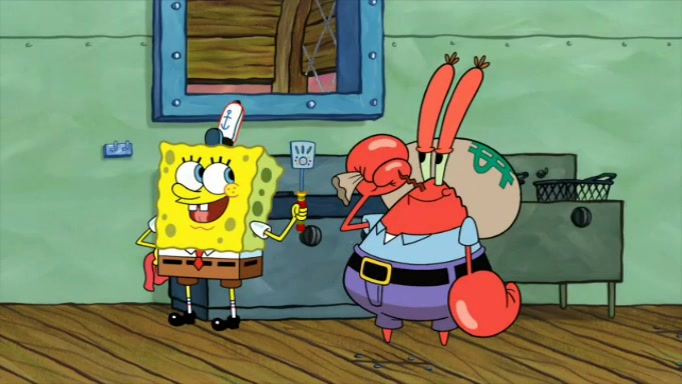 Mr. Krabs and SpongeBob are cleaning out their customers' money. SpongeBob and Mr. Krabs create a formula designed to clean the dirty money they receive. Unfortunately, SpongeBob uses too much of an explosive ingredient, which causes their faces to be blown off. SpongeBob notices a fax coming but Mr. Krabs says they will get it later. It is none other than Plankton who faxed himself into the Krusty Krab saying the first phase of his plan is complete. Plankton then starts "Phase 2" by sawing a bit of SpongeBob's spatula then places it beside the grill. SpongeBob then comes along and tries to flip a Krabby Patty but his spatula breaks in half. He tries everything to fix it but Mr. Krabs just tells SpongeBob to get a new spatula and he leaves.