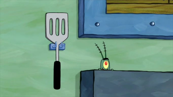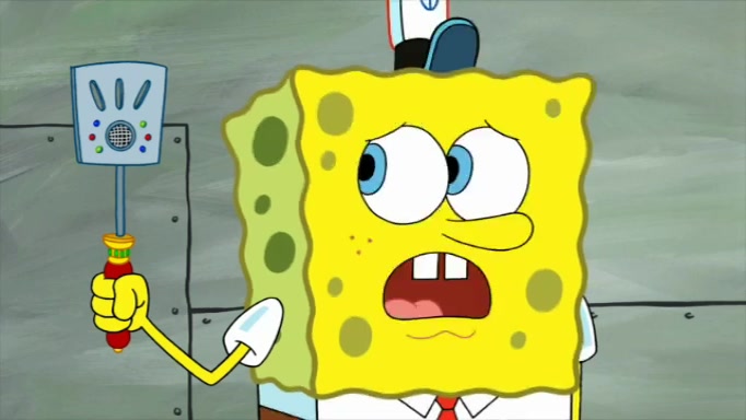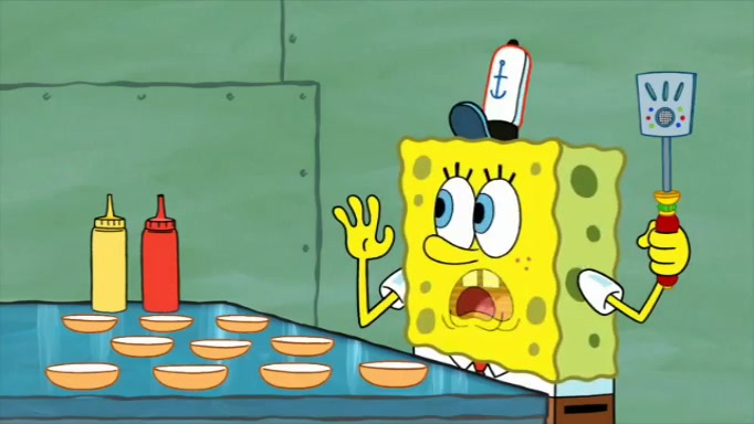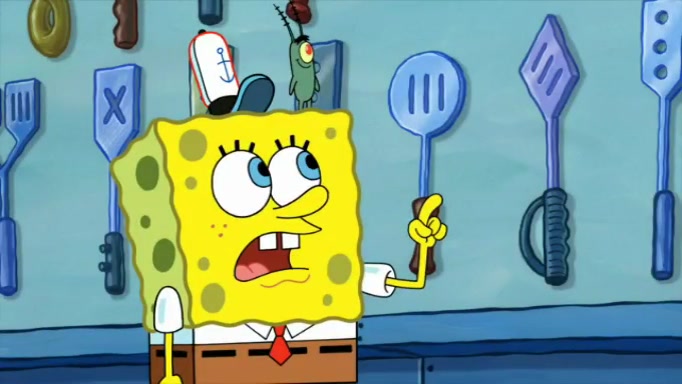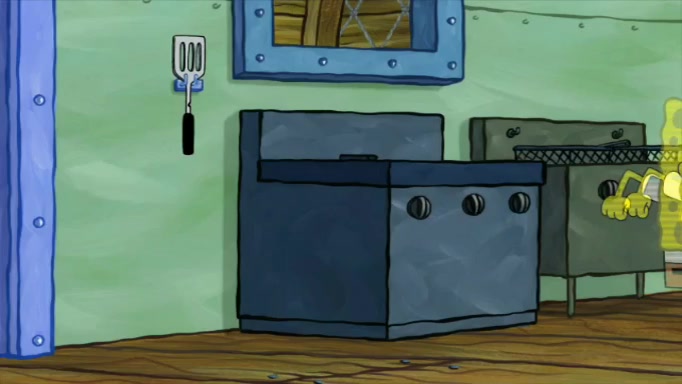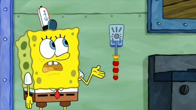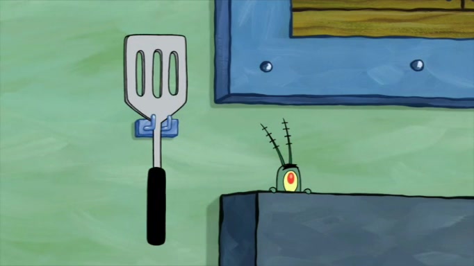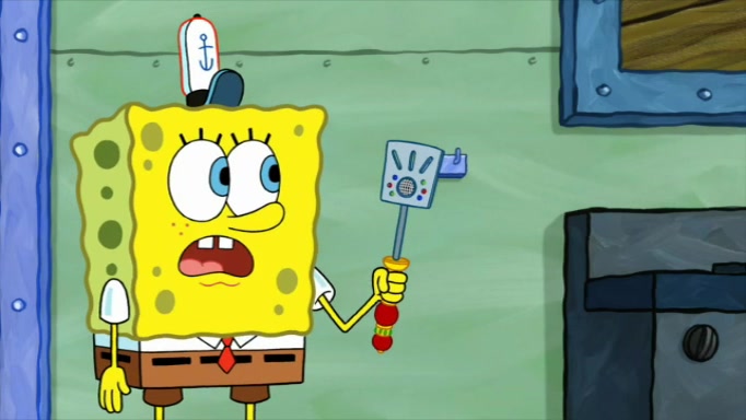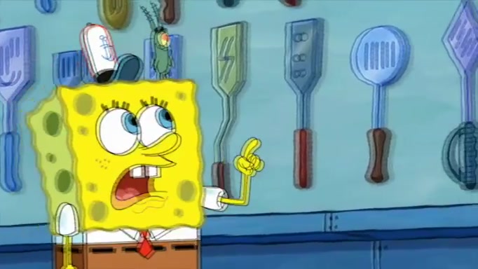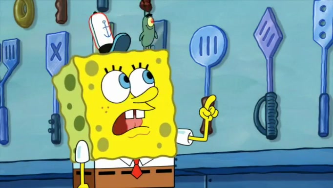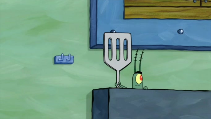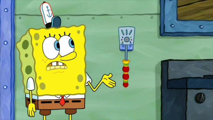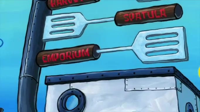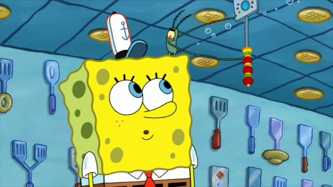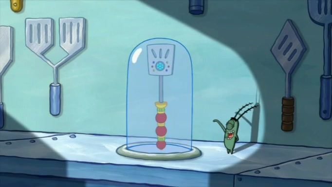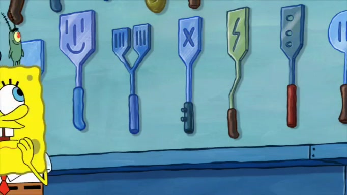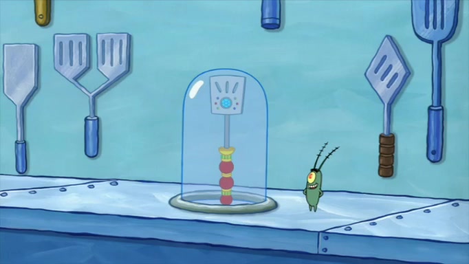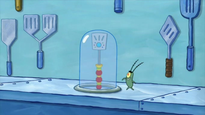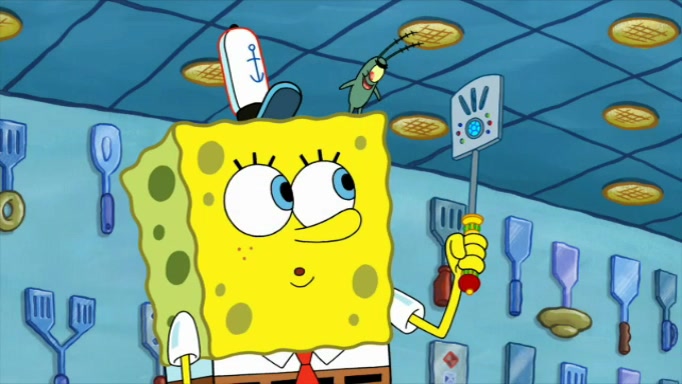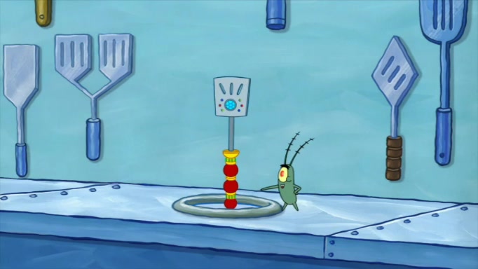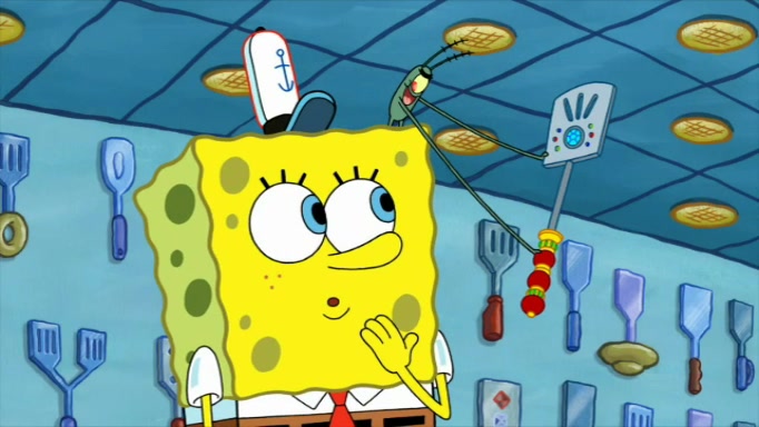 The scene changes to Harvey's Spatula Emporium where Plankton awaits SpongeBob's arrival. He then begins "Phase 3" by flying out of the store with his jetpack and flies into SpongeBob. SpongeBob wants to know what is Plankton doing at the Emporium and Plankton responds to holding an object saying SpongeBob doesn't know what it is. SpongeBob successfully identifies the part as a handle cap for a vintage spatula and Plankton is amazed. Plankton then offers SpongeBob his special own spatula with "magical powers" which SpongeBob quickly agrees. They arrive at the Chum Bucket where Plankton shows off a room full of spatulas and introduces SpongeBob to the Majestic Sizzlemaster. SpongeBob is excited and takes his new spatula out of the Chum Bucket. Plankton starts "Phase 4" with Karen questioning on how many phases he has in his plan. Plankton then heads into the control room with Karen saying that it's enough to gain SpongeBob's trust and steal the Krabby Patty Secret Formula. Plankton then turns on the spatula and the scene changes to SpongeBob showing off the Majestic Sizzlemaster to Mr. Krabs. Mr. Krabs just tells SpongeBob to get back to work and SpongeBob heads into the kitchen with the Sizzlemaster. SpongeBob is about to handle all of the orders coming in and the Sizzlemaster soon starts talking not knowing it's Plankton talking through the other end. SpongeBob is confused trying not to believe the Sizzlemaster is talking but Squidward shouts out to him saying the customers are getting upset. SpongeBob starts to flip the Krabby Patties but the Sizzlemaster tells SpongeBob that there is a faster way in doing that and it extends it's head flipping four Patties at the same time. SpongeBob is amazed but still says that they are a long way from completing all of the orders and starts alternating between putting condiments on the buns and flipping the Krabby Patties. The Sizzlemaster (Plankton) tells SpongeBob that it will flip the patties while he handles the condiments. SpongeBob agrees but says he will handle the grill saying he doesn't trust anybody with it.