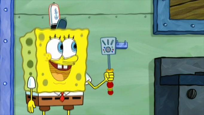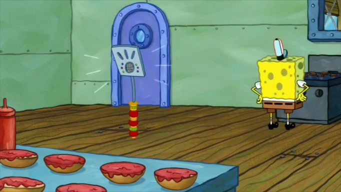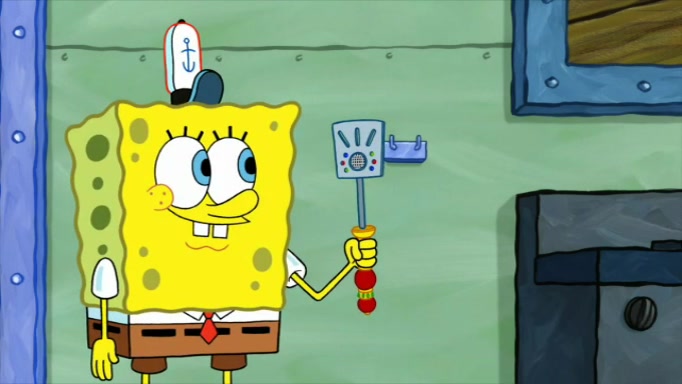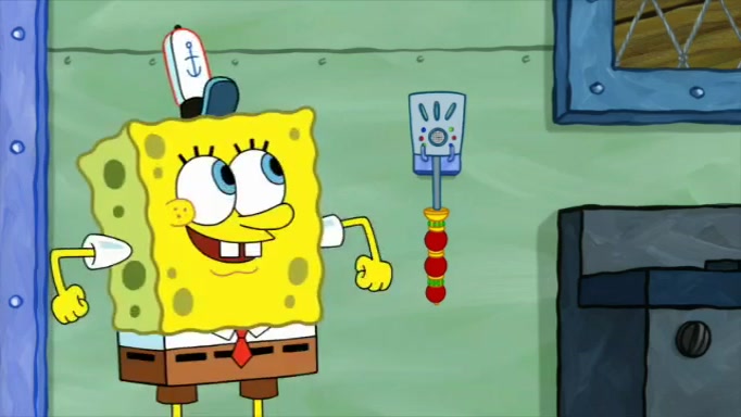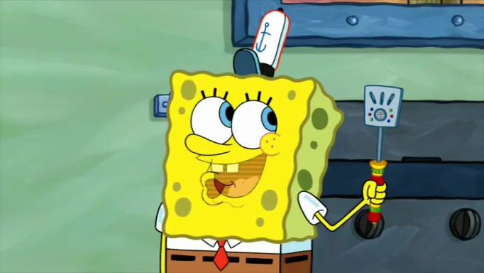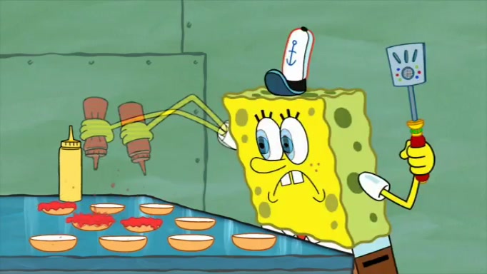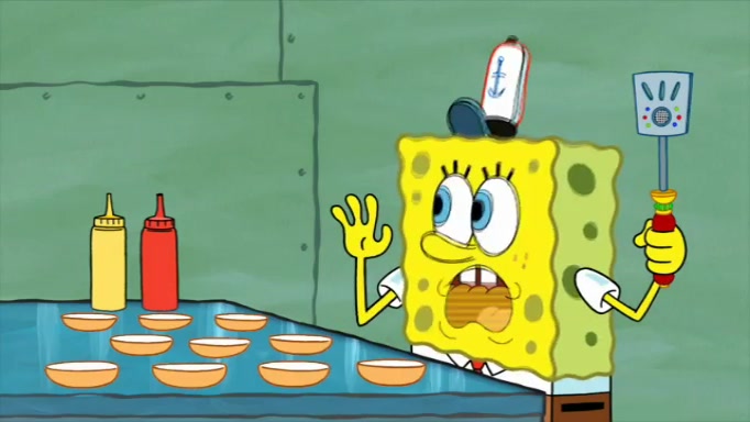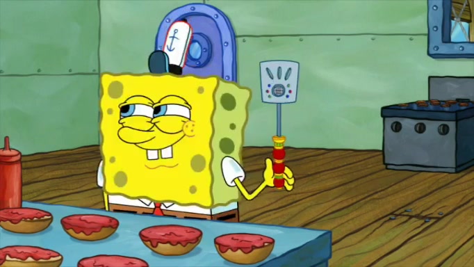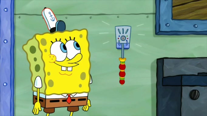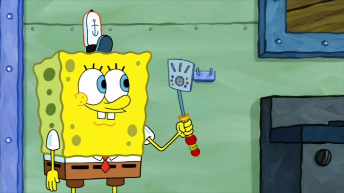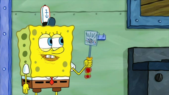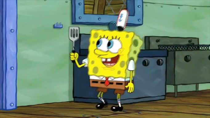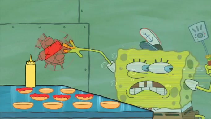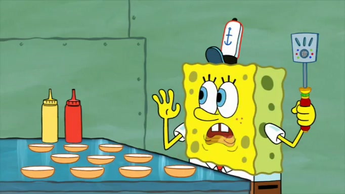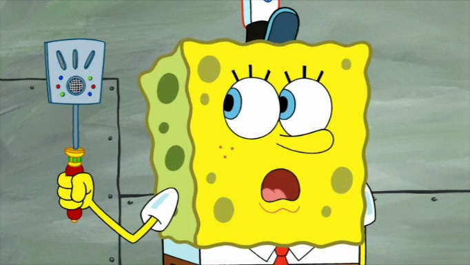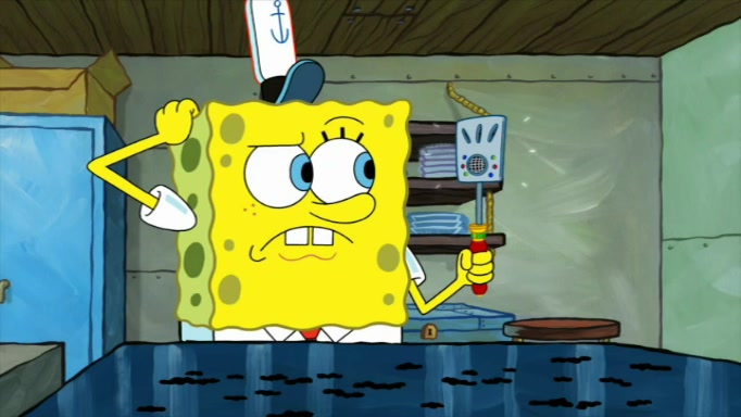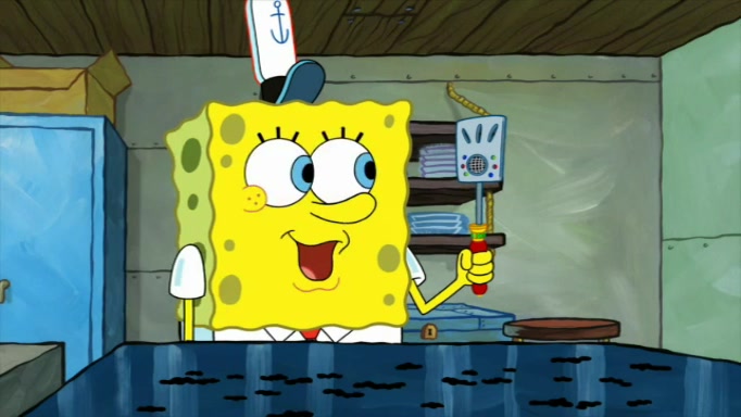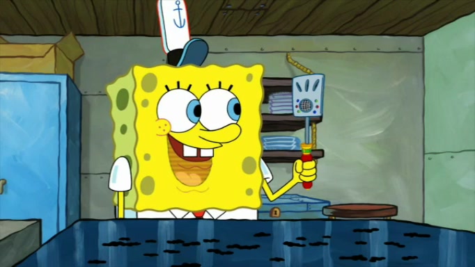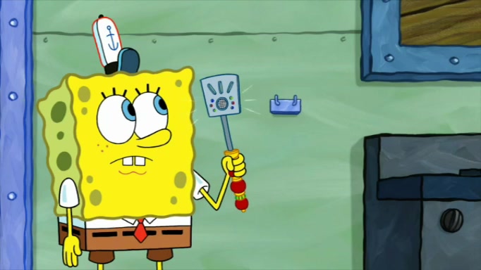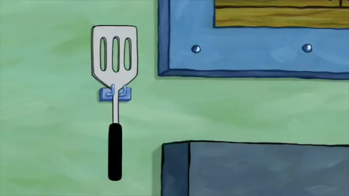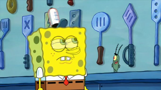 The scene changes to Harvey's Spatula Emporium where Plankton awaits SpongeBob's arrival. He then begins "Phase 3" by flying out of the store with his jetpack and flies into SpongeBob. SpongeBob wants to know what is Plankton doing at the Emporium and Plankton responds to holding an object saying SpongeBob doesn't know what it is. SpongeBob successfully identifies the part as a handle cap for a vintage spatula and Plankton is amazed. Plankton then offers SpongeBob his special own spatula with "magical powers" which SpongeBob quickly agrees. They arrive at the Chum Bucket where Plankton shows off a room full of spatulas and introduces SpongeBob to the Majestic Sizzlemaster. SpongeBob is excited and takes his new spatula out of the Chum Bucket. Plankton starts "Phase 4" with Karen questioning on how many phases he has in his plan. Plankton then heads into the control room with Karen saying that it's enough to gain SpongeBob's trust and steal the Krabby Patty Secret Formula. Plankton then turns on the spatula and the scene changes to SpongeBob showing off the Majestic Sizzlemaster to Mr. Krabs. Mr. Krabs just tells SpongeBob to get back to work and SpongeBob heads into the kitchen with the Sizzlemaster. SpongeBob is about to handle all of the orders coming in and the Sizzlemaster soon starts talking not knowing it's Plankton talking through the other end. SpongeBob is confused trying not to believe the Sizzlemaster is talking but Squidward shouts out to him saying the customers are getting upset. SpongeBob starts to flip the Krabby Patties but the Sizzlemaster tells SpongeBob that there is a faster way in doing that and it extends it's head flipping four Patties at the same time. SpongeBob is amazed but still says that they are a long way from completing all of the orders and starts alternating between putting condiments on the buns and flipping the Krabby Patties. The Sizzlemaster (Plankton) tells SpongeBob that it will flip the patties while he handles the condiments. SpongeBob agrees but says he will handle the grill saying he doesn't trust anybody with it.