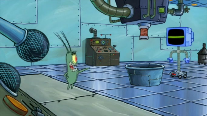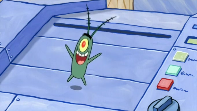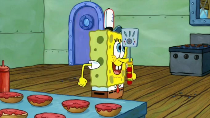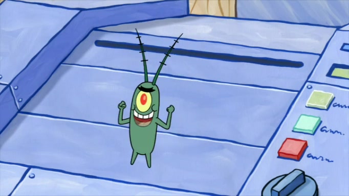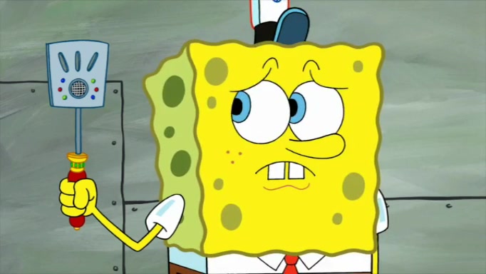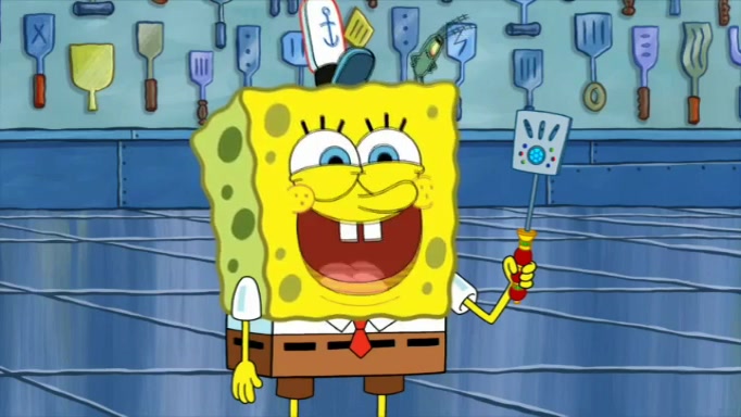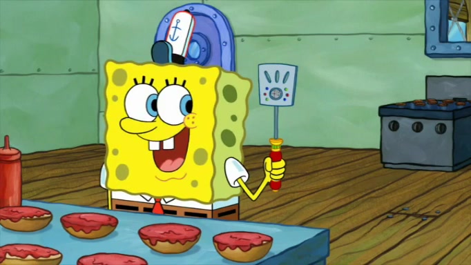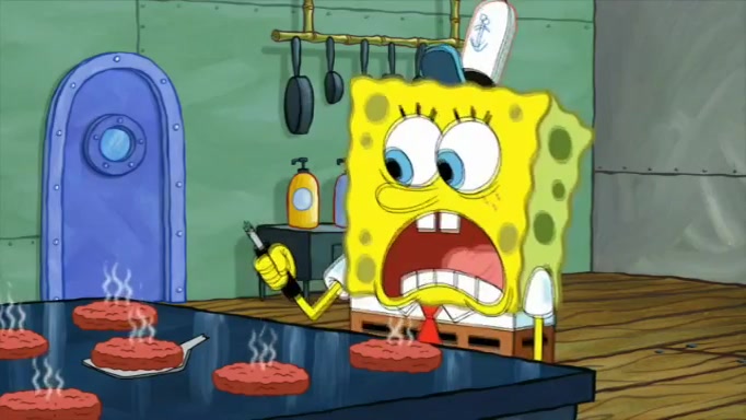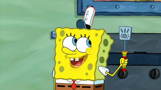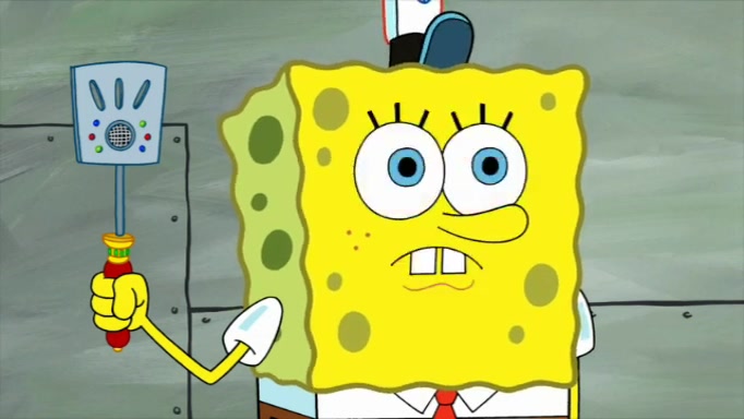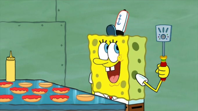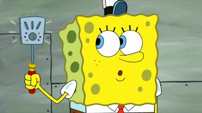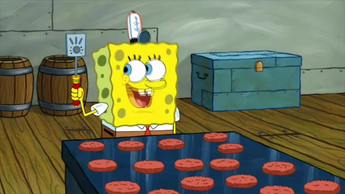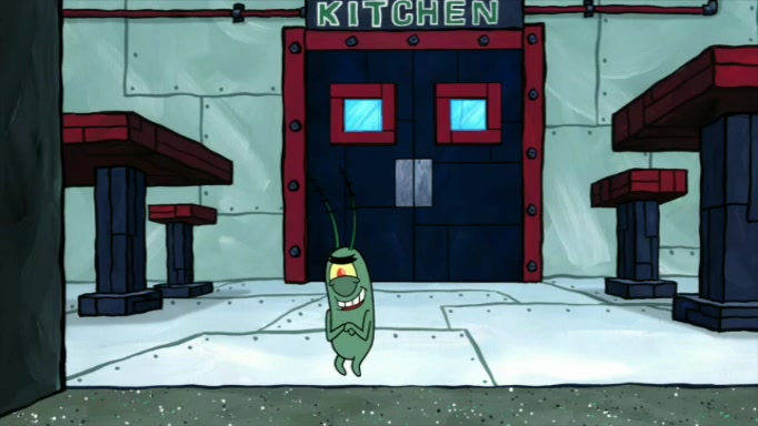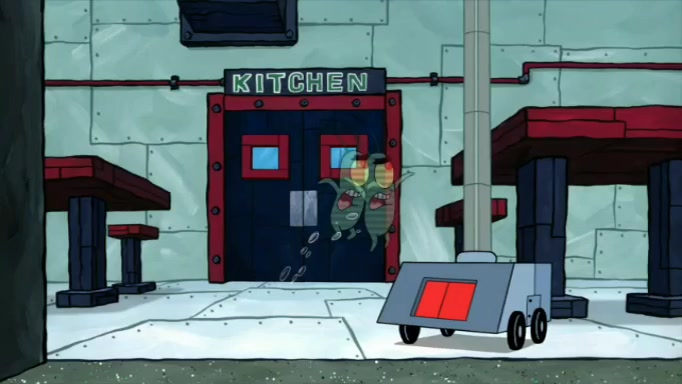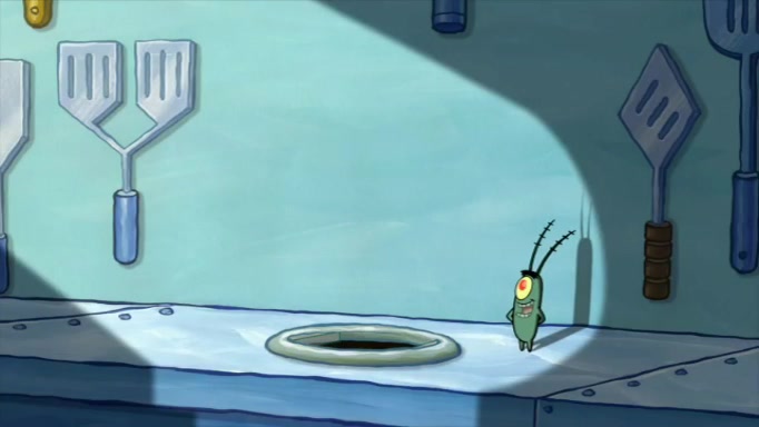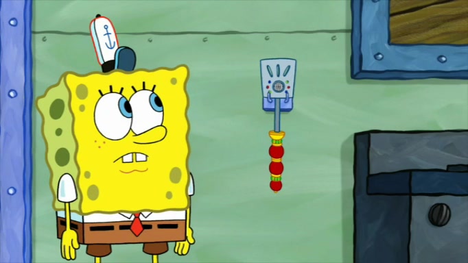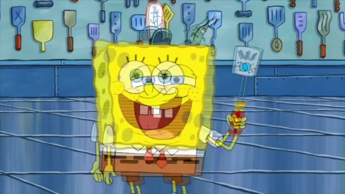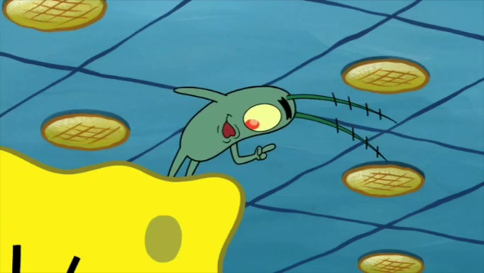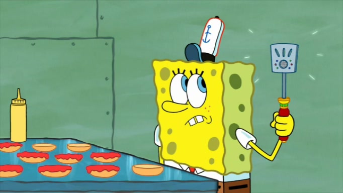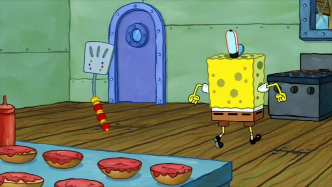 The scene changes to Harvey's Spatula Emporium where Plankton awaits SpongeBob's arrival. He then begins "Phase 3" by flying out of the store with his jetpack and flies into SpongeBob. SpongeBob wants to know what is Plankton doing at the Emporium and Plankton responds to holding an object saying SpongeBob doesn't know what it is. SpongeBob successfully identifies the part as a handle cap for a vintage spatula and Plankton is amazed. Plankton then offers SpongeBob his special own spatula with "magical powers" which SpongeBob quickly agrees. They arrive at the Chum Bucket where Plankton shows off a room full of spatulas and introduces SpongeBob to the Majestic Sizzlemaster. SpongeBob is excited and takes his new spatula out of the Chum Bucket. Plankton starts "Phase 4" with Karen questioning on how many phases he has in his plan. Plankton then heads into the control room with Karen saying that it's enough to gain SpongeBob's trust and steal the Krabby Patty Secret Formula. Plankton then turns on the spatula and the scene changes to SpongeBob showing off the Majestic Sizzlemaster to Mr. Krabs. Mr. Krabs just tells SpongeBob to get back to work and SpongeBob heads into the kitchen with the Sizzlemaster. SpongeBob is about to handle all of the orders coming in and the Sizzlemaster soon starts talking not knowing it's Plankton talking through the other end. SpongeBob is confused trying not to believe the Sizzlemaster is talking but Squidward shouts out to him saying the customers are getting upset. SpongeBob starts to flip the Krabby Patties but the Sizzlemaster tells SpongeBob that there is a faster way in doing that and it extends it's head flipping four Patties at the same time. SpongeBob is amazed but still says that they are a long way from completing all of the orders and starts alternating between putting condiments on the buns and flipping the Krabby Patties. The Sizzlemaster (Plankton) tells SpongeBob that it will flip the patties while he handles the condiments. SpongeBob agrees but says he will handle the grill saying he doesn't trust anybody with it.