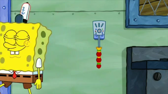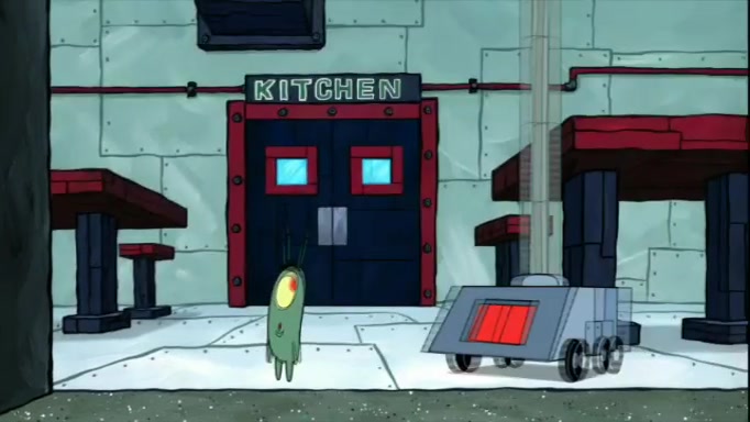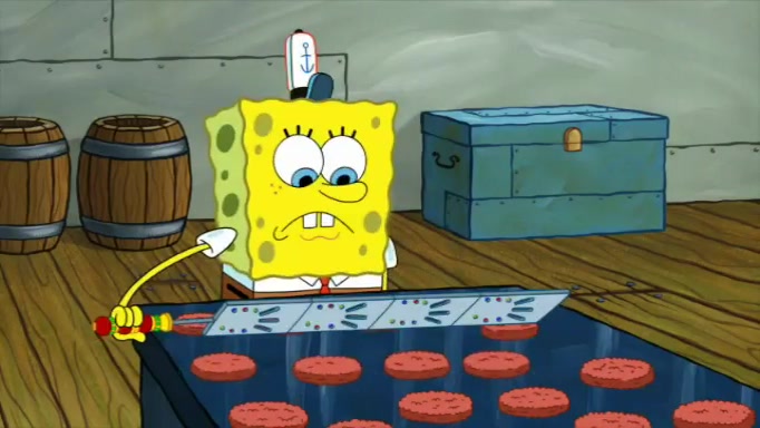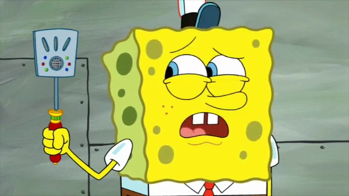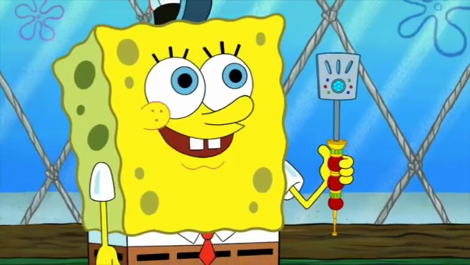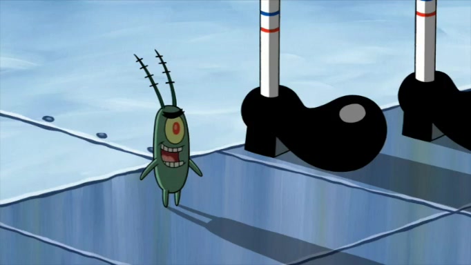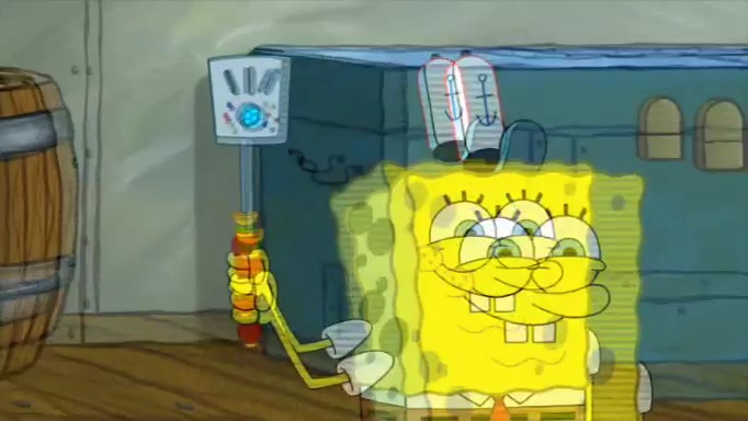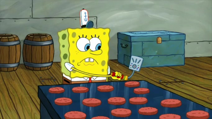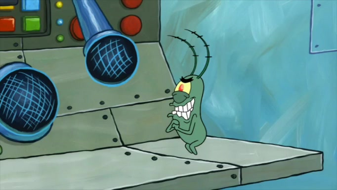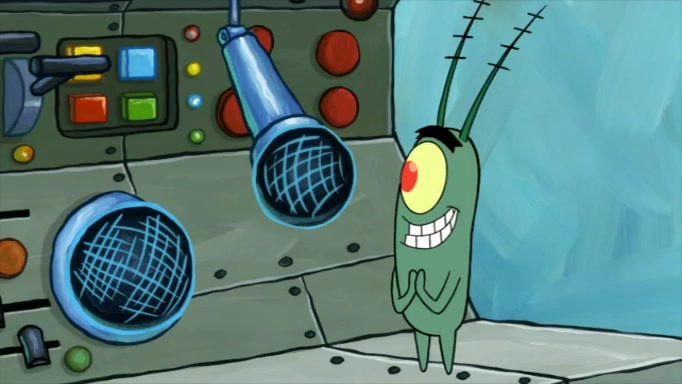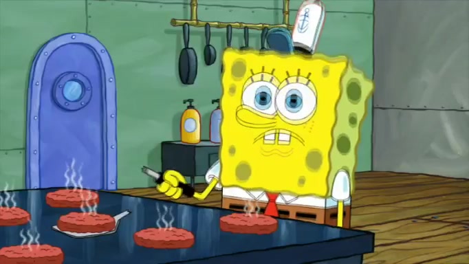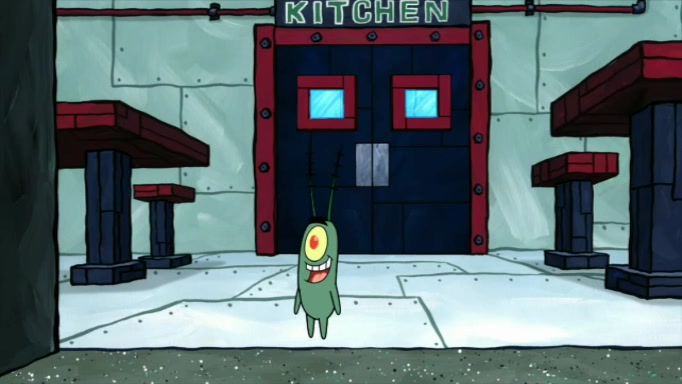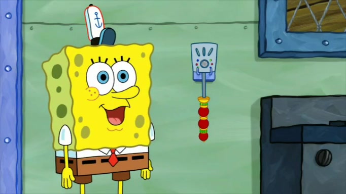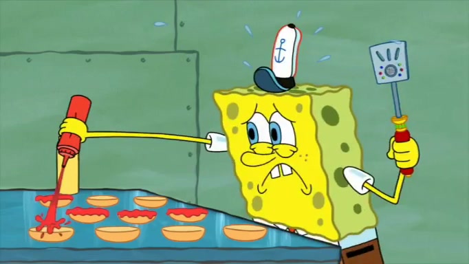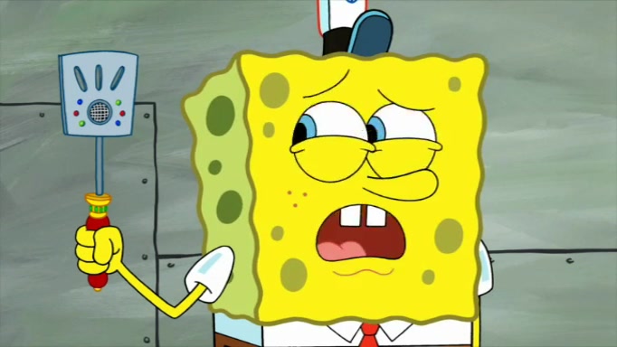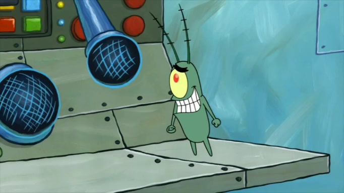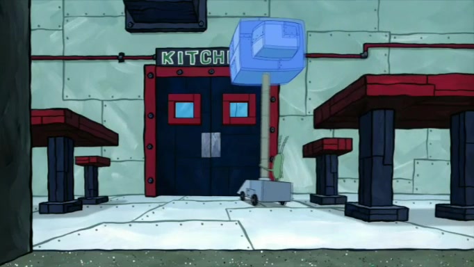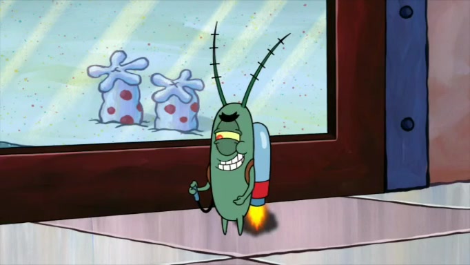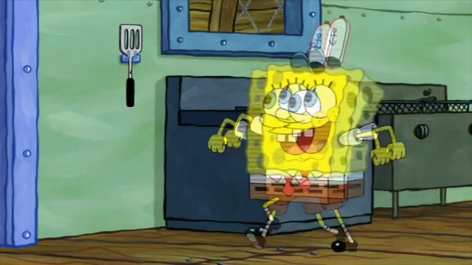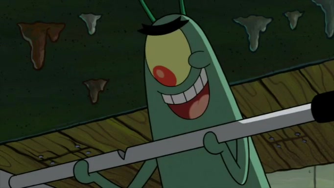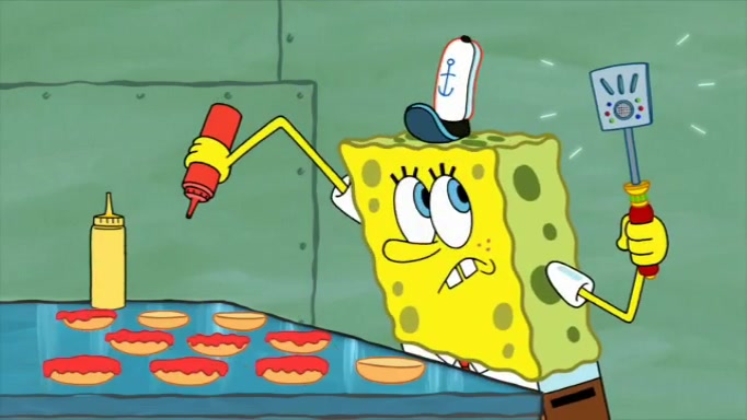 The scene changes to Harvey's Spatula Emporium where Plankton awaits SpongeBob's arrival. He then begins "Phase 3" by flying out of the store with his jetpack and flies into SpongeBob. SpongeBob wants to know what is Plankton doing at the Emporium and Plankton responds to holding an object saying SpongeBob doesn't know what it is. SpongeBob successfully identifies the part as a handle cap for a vintage spatula and Plankton is amazed. Plankton then offers SpongeBob his special own spatula with "magical powers" which SpongeBob quickly agrees. They arrive at the Chum Bucket where Plankton shows off a room full of spatulas and introduces SpongeBob to the Majestic Sizzlemaster. SpongeBob is excited and takes his new spatula out of the Chum Bucket. Plankton starts "Phase 4" with Karen questioning on how many phases he has in his plan. Plankton then heads into the control room with Karen saying that it's enough to gain SpongeBob's trust and steal the Krabby Patty Secret Formula. Plankton then turns on the spatula and the scene changes to SpongeBob showing off the Majestic Sizzlemaster to Mr. Krabs. Mr. Krabs just tells SpongeBob to get back to work and SpongeBob heads into the kitchen with the Sizzlemaster. SpongeBob is about to handle all of the orders coming in and the Sizzlemaster soon starts talking not knowing it's Plankton talking through the other end. SpongeBob is confused trying not to believe the Sizzlemaster is talking but Squidward shouts out to him saying the customers are getting upset. SpongeBob starts to flip the Krabby Patties but the Sizzlemaster tells SpongeBob that there is a faster way in doing that and it extends it's head flipping four Patties at the same time. SpongeBob is amazed but still says that they are a long way from completing all of the orders and starts alternating between putting condiments on the buns and flipping the Krabby Patties. The Sizzlemaster (Plankton) tells SpongeBob that it will flip the patties while he handles the condiments. SpongeBob agrees but says he will handle the grill saying he doesn't trust anybody with it.