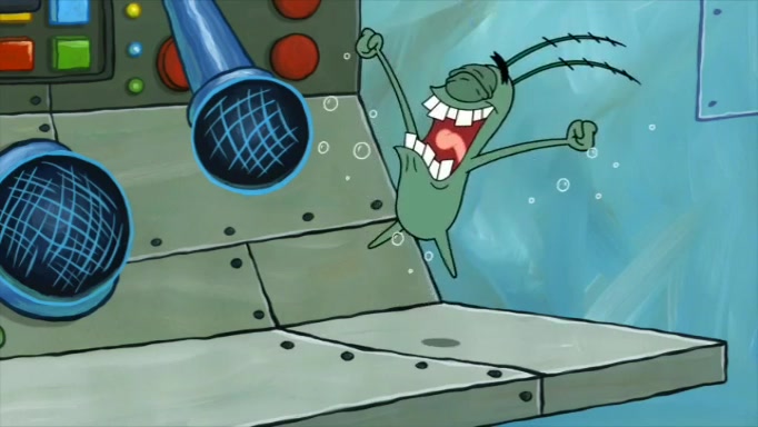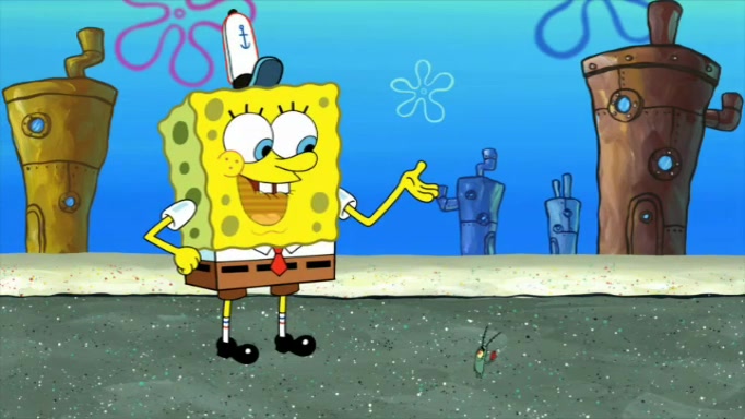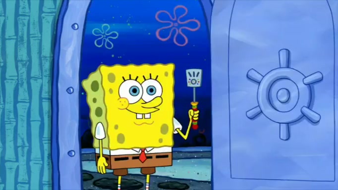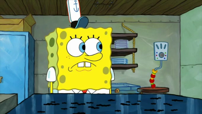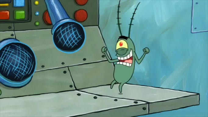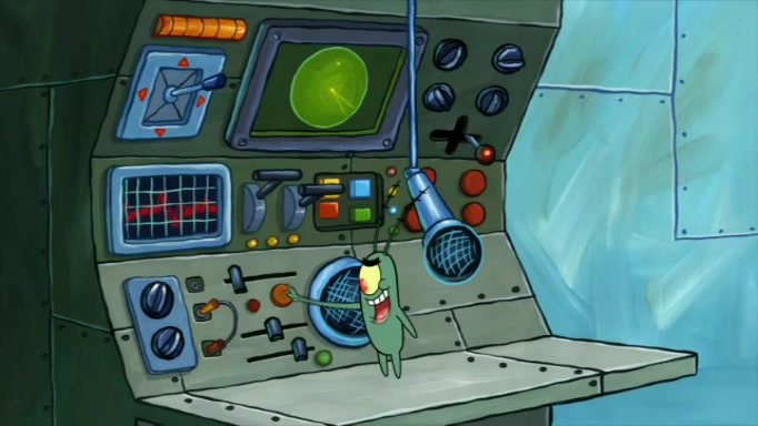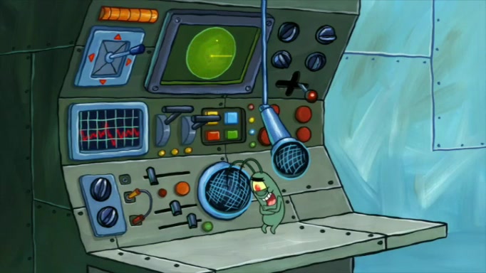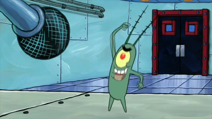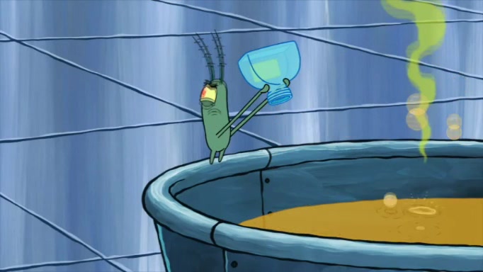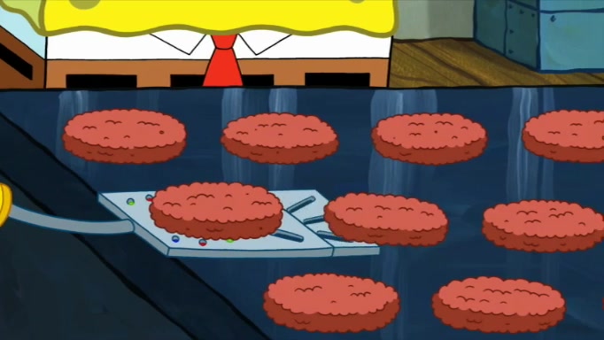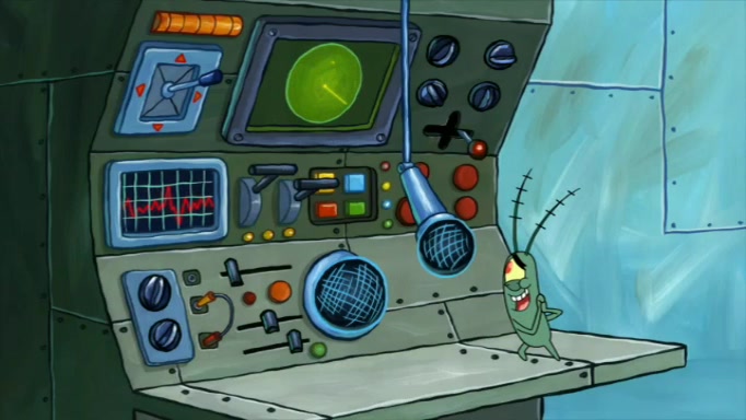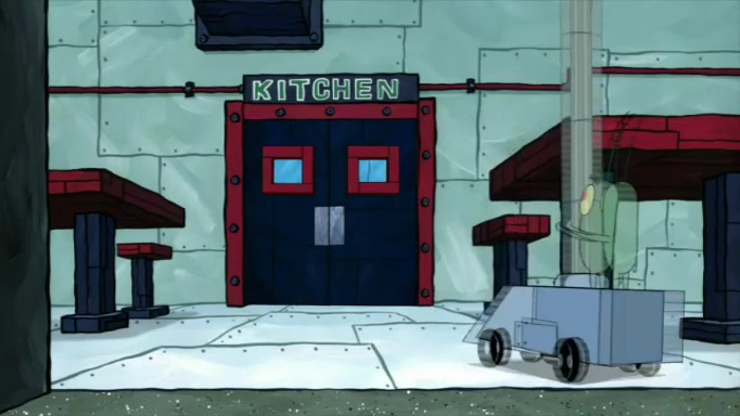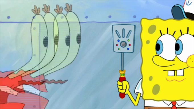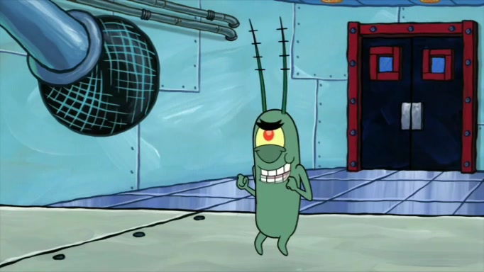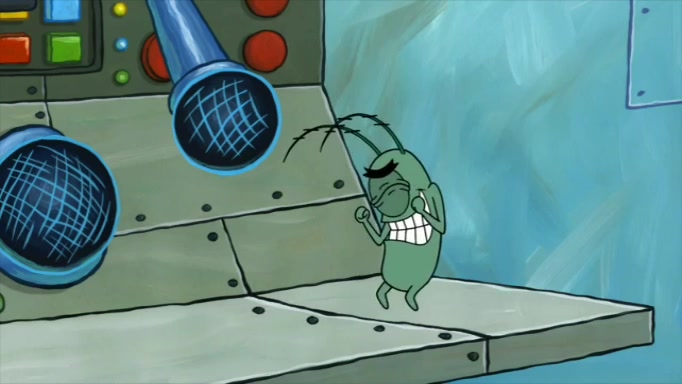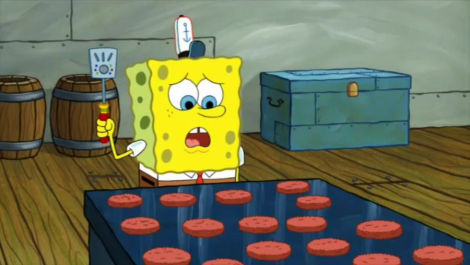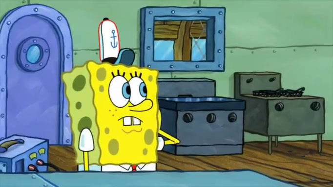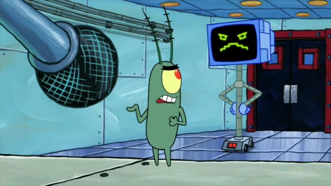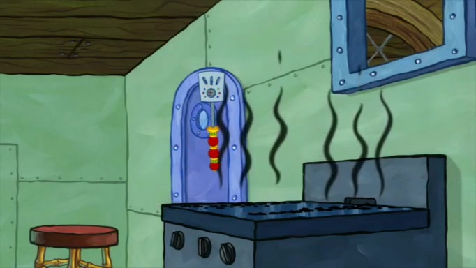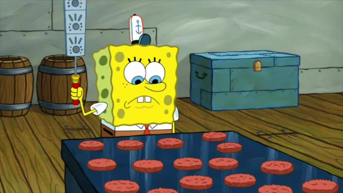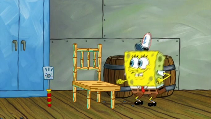 The scene changes to Harvey's Spatula Emporium where Plankton awaits SpongeBob's arrival. He then begins "Phase 3" by flying out of the store with his jetpack and flies into SpongeBob. SpongeBob wants to know what is Plankton doing at the Emporium and Plankton responds to holding an object saying SpongeBob doesn't know what it is. SpongeBob successfully identifies the part as a handle cap for a vintage spatula and Plankton is amazed. Plankton then offers SpongeBob his special own spatula with "magical powers" which SpongeBob quickly agrees. They arrive at the Chum Bucket where Plankton shows off a room full of spatulas and introduces SpongeBob to the Majestic Sizzlemaster. SpongeBob is excited and takes his new spatula out of the Chum Bucket. Plankton starts "Phase 4" with Karen questioning on how many phases he has in his plan. Plankton then heads into the control room with Karen saying that it's enough to gain SpongeBob's trust and steal the Krabby Patty Secret Formula. Plankton then turns on the spatula and the scene changes to SpongeBob showing off the Majestic Sizzlemaster to Mr. Krabs. Mr. Krabs just tells SpongeBob to get back to work and SpongeBob heads into the kitchen with the Sizzlemaster. SpongeBob is about to handle all of the orders coming in and the Sizzlemaster soon starts talking not knowing it's Plankton talking through the other end. SpongeBob is confused trying not to believe the Sizzlemaster is talking but Squidward shouts out to him saying the customers are getting upset. SpongeBob starts to flip the Krabby Patties but the Sizzlemaster tells SpongeBob that there is a faster way in doing that and it extends it's head flipping four Patties at the same time. SpongeBob is amazed but still says that they are a long way from completing all of the orders and starts alternating between putting condiments on the buns and flipping the Krabby Patties. The Sizzlemaster (Plankton) tells SpongeBob that it will flip the patties while he handles the condiments. SpongeBob agrees but says he will handle the grill saying he doesn't trust anybody with it.