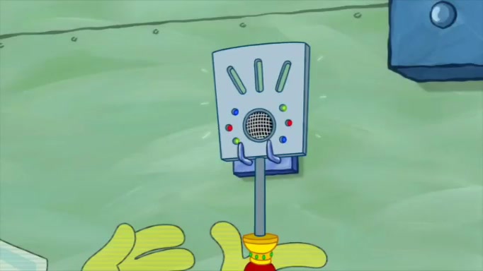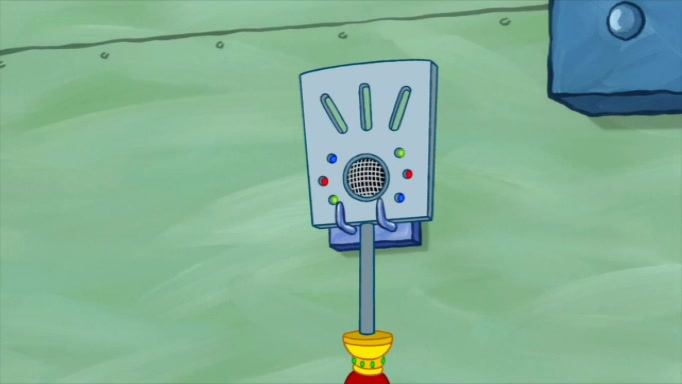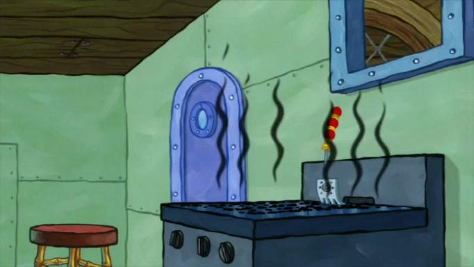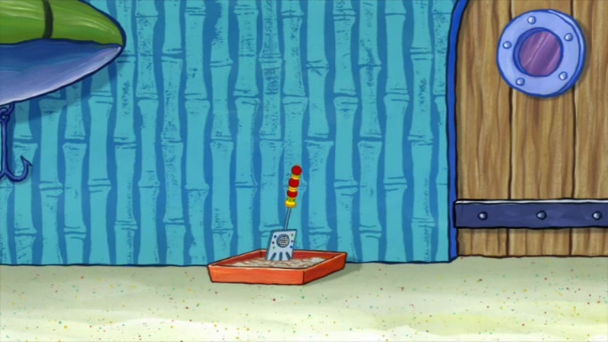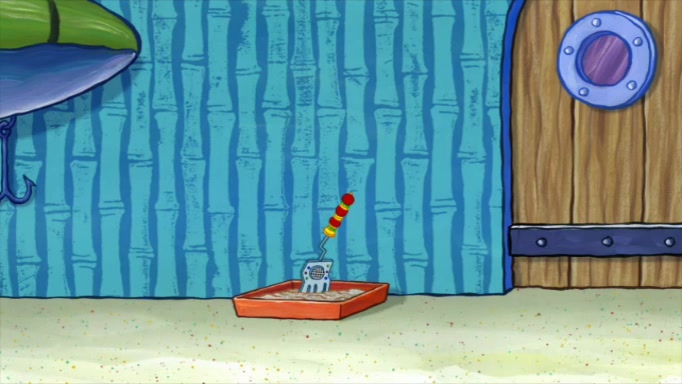 Meanwhile, Squidward is dealing with Nat Peterson who is angry and impatient, while SpongeBob hands the Krabby Patties through the window. Squidward hands out the Krabby Patties to the customers while SpongeBob is talking with the Sizzlemaster about the empty grill. The Sizzlemaster then "flies" to the freezer and takes out more Krabby Patties and puts them all on the grill. During closing time, Mr. Krabs tells SpongeBob he is leaving and thanks him for all the work. SpongeBob tells Mr. Krabs to thank the "new magic talking spatula", but Mr. Krabs gets angry at SpongeBob for talking to a "talking spatula," but tells him to only do it if it makes him money. Mr. Krabs leaves and SpongeBob thanks the Sizzlemaster for the help. The Sizzlemaster hopes to work the grill, but SpongeBob still disagrees to it and leaves the Sizzlemaster on a hook and leaves. Plankton talks to himself saying he still needs to gain SpongeBob's trust to work the grill and calls back out to SpongeBob through the Sizzlemaster. The Sizzlemaster hopes to go home with SpongeBob and help around the house, but SpongeBob says he's not grilling. The Sizzlemaster then says he is a multi-purpose tool and SpongeBob finally agrees. They arrive at SpongeBob's house and the Sizzlemaster (with Plankton talking of course) then decides to start "Phase 5." SpongeBob then tosses the Sizzlemaster into Gary's litter box which the Sizzlemaster has to clean and SpongeBob walks off. Plankton barks at Karen for adding "smell sensors" to the Sizzlemaster.