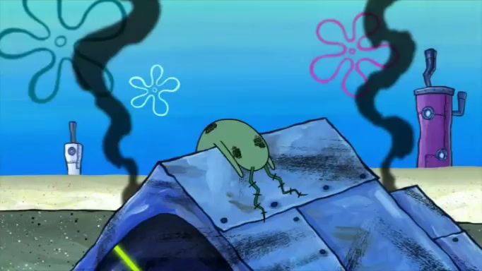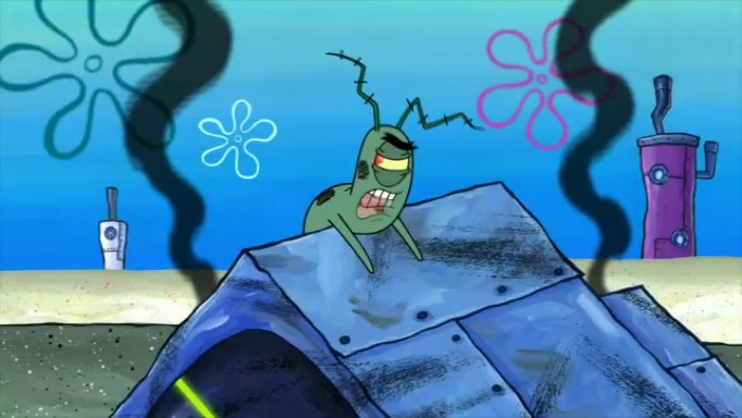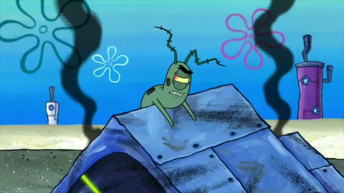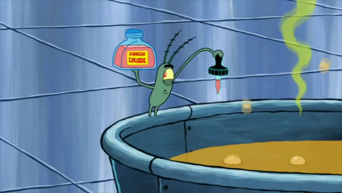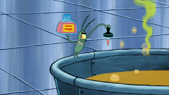 The next morning, SpongeBob gets ready to go to work with the Sizzlemaster helping out in every way. They arrive at the Krusty Krab and SpongeBob thanks the Sizzlemaster. The Sizzlemaster then pulls up a chair for SpongeBob and says he will do all the work for him. SpongeBob agrees and he sits in the chair. The Sizzlemaster finally convinces SpongeBob to let him use the grill. Plankton then finally ends "Phase 5" and starts up "Phase 6" which involves the Sizzlemaster burning up all of the Krabby Patties on the grill. SpongeBob is upset, but the Sizzlemaster suggests getting the Secret Formula to make more Krabby Patties. SpongeBob agrees and walks into Mr. Krabs' office and starts unlocking the safe. Mr. Krabs asks SpongeBob what he's doing and SpongeBob says that the Sizzlemaster he got from Plankton needs to know the Secret Formula, making Mr. Krabs suspicious. Realizing that it's another one of Plankton's schemes, Mr. Krabs then starts telling the ingredients for a fake formula and Plankton starts adding them in. After pouring an entire bottle of Disulfide (explosive bottle) , Plankton didn't know that it is approved for restaurant use until he hears Mr. Krabs saying that it's not. Plankton looks at the label too late then the entire Chum Bucket is blown up and Plankton and Karen land in front of Mr. Krabs and SpongeBob. Mr. Krabs and SpongeBob gloat and Plankton sarcastically laughs.