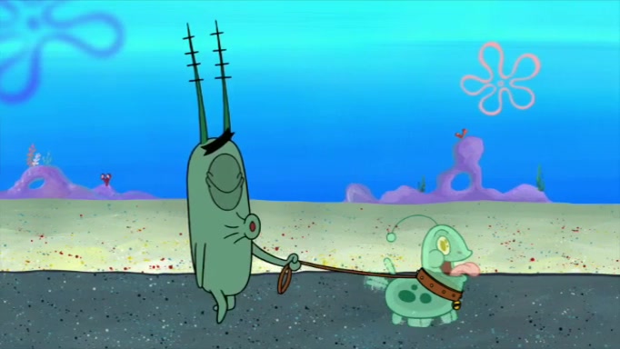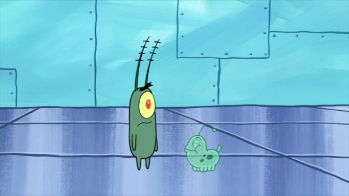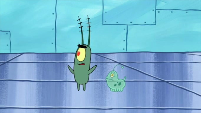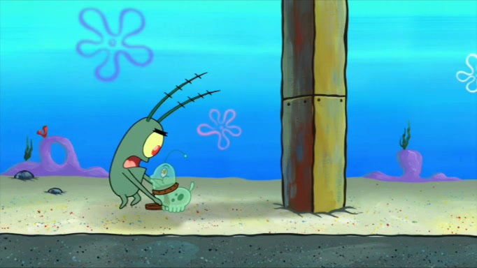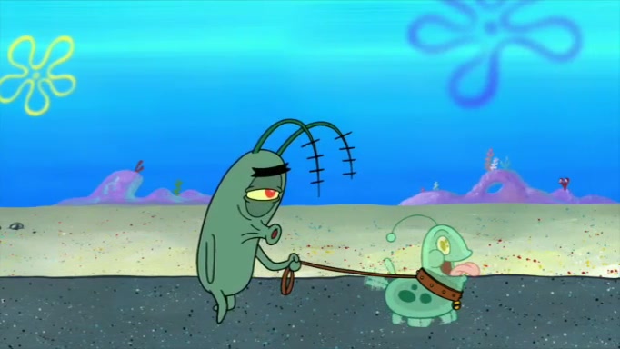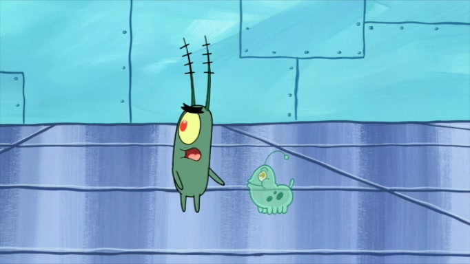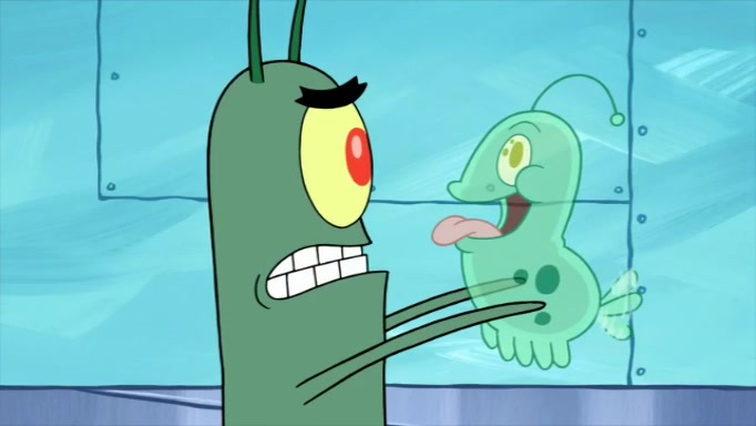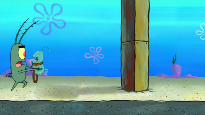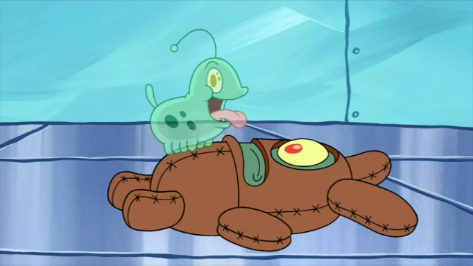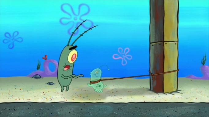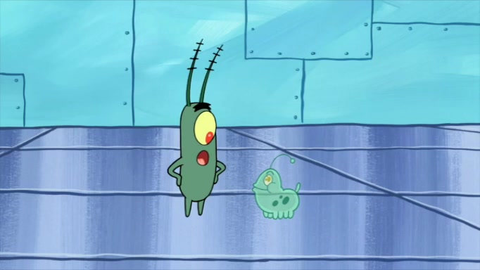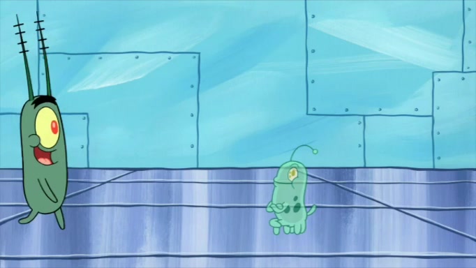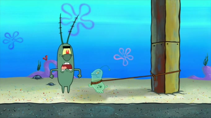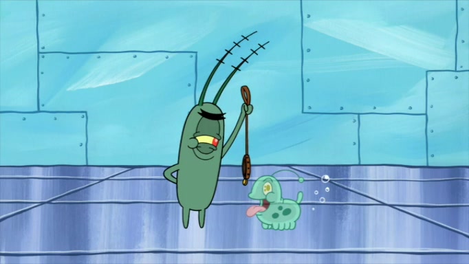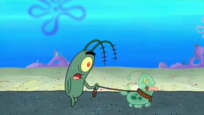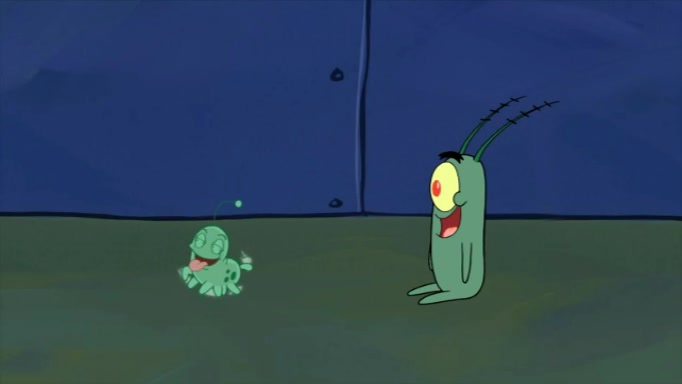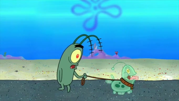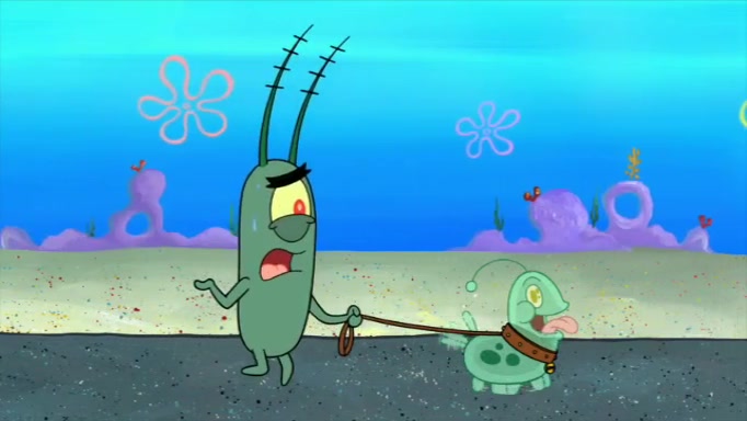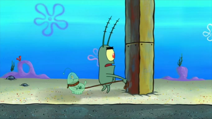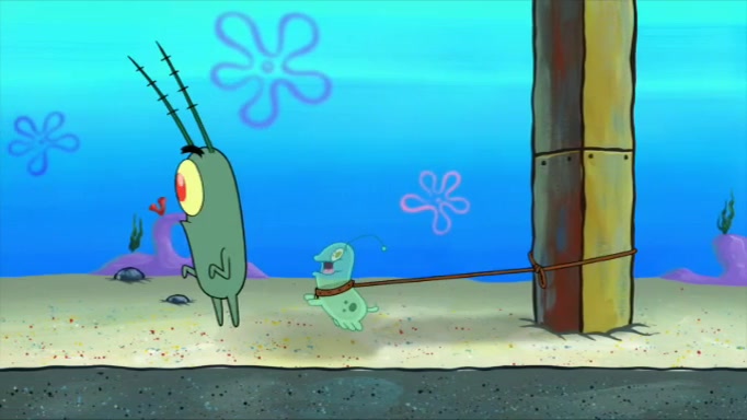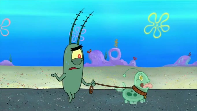 The episode begins in the Krusty Krab where a man gets a Krabby Patty, but then a baby comes and takes the Krabby Patty. Everyone thought it was cute, thinking it was a real baby, but Mr. Krabs was able to see Plankton inside the baby. Mr. Krabs started beating him up, but because everybody still thought it was a real baby, they were all outraged. Then Mr. Krabs ripped off the head revealing Plankton inside a baby robot. Mr. Krabs put the head back on and launched him back to the Chum Bucket and Karen then took off the diaper and put it in the trash where Plankton walks out. Karen told him that he should get a pet and SpongeBob, who just happened to hear their conversation, decided to help him look for a pet. At the animal shelter, Plankton sees a guard worm, an old gross snail, and even Patrick. Plankton almost gets swallowed by a pet. Then an amoeba saves his life. Plankton chooses the amoeba as his pet and decides to call him Spot. At the Chum Bucket, Plankton teaches Spot some tricks like stay, sit, and roll over. Then he teaches him how to steal a Krabby Patty. Plankton wasn't finished talking when Spot left to the Krusty Krab unseen to get a Krabby Patty. When Spot comes back, Plankton is rapt, thinking he finally won but is then enraged when Spot eats the krabby patty in one bite. He punishes Spot by tying his leash to the mailbox. Seconds later, Plankton feels bad, but when he runs back outside he finds Spot's leash, with no amoeba to be seen. Plankton then goes out to find him, with SpongeBob's help. Soon they stumble upon the shelter, then go inside. It is very dark inside so SpongeBob tries to find the light switch. There are 2 switches, so SpongeBob turns on both. One turns on the lights, and the other opened the pens. The guard worm, sea monkey, and sea urchin all chase SpongeBob and Plankton. When they lose the animals, Plankton realizes Spot had been on his optical cornea (his eye) the whole time. The other pets then find Plankton and SpongeBob again so Spot tries to scare them off. The animals laugh at Spot because he's so small but then he grows about a hundred times bigger and easily scares the animals away. Plankton then decides he is going to keep Spot and was sorry he yelled at him.