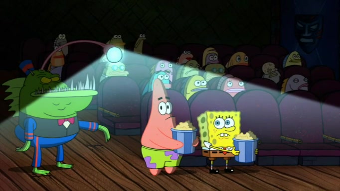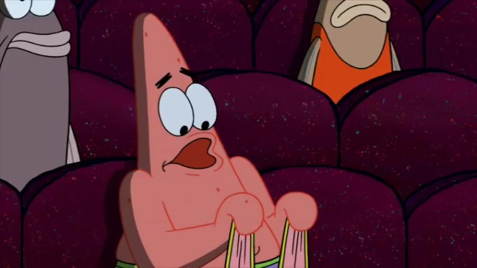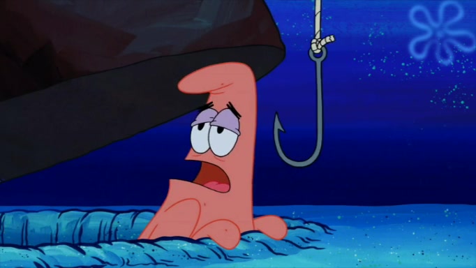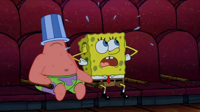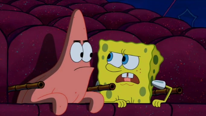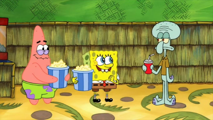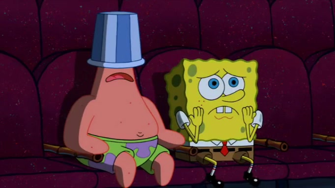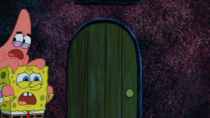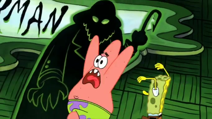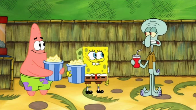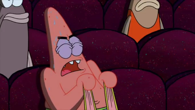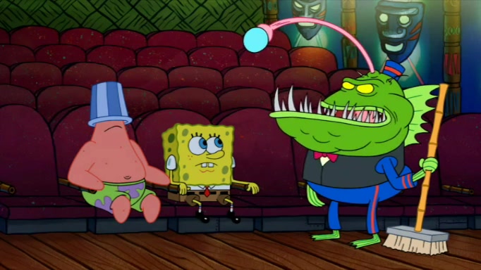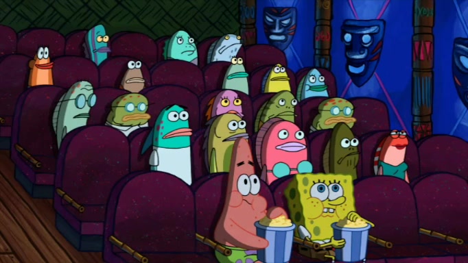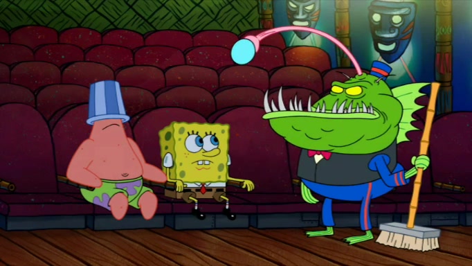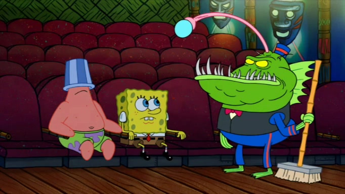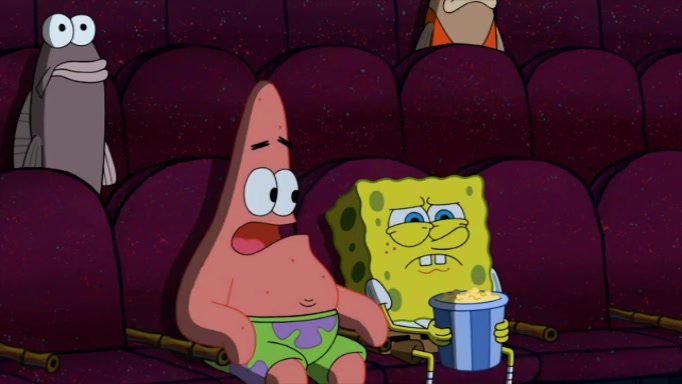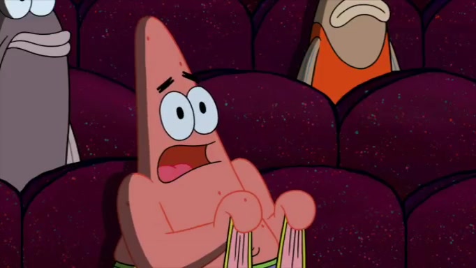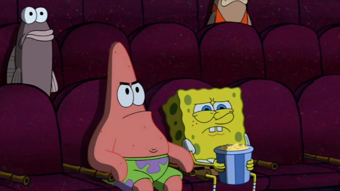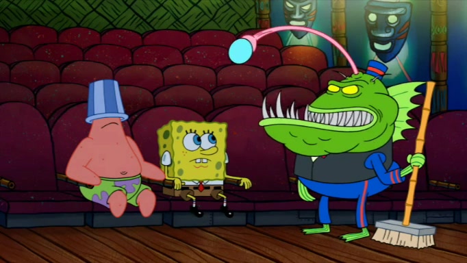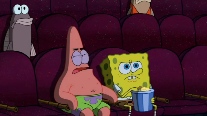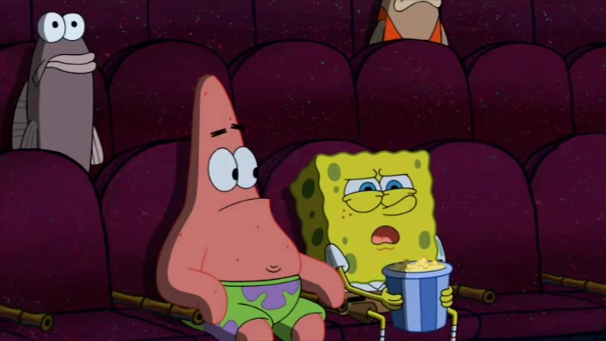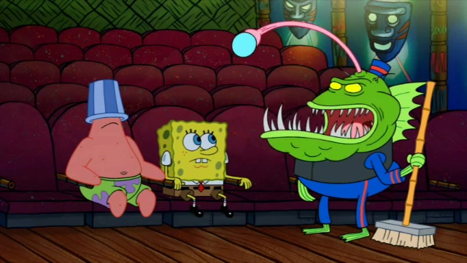 SpongeBob and Patrick are at the movie theater going to see Fisherman 4: Attack of the Hook. They meet Squidward who laughs saying they won't have any sleep after seeing the movie. They both claim they're grown-up men, but Squidward says "Boo" in monotone and scares them effortlessly.
