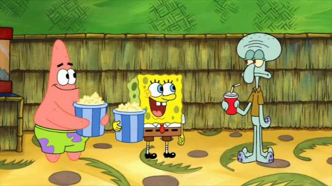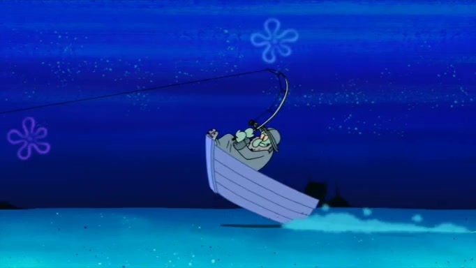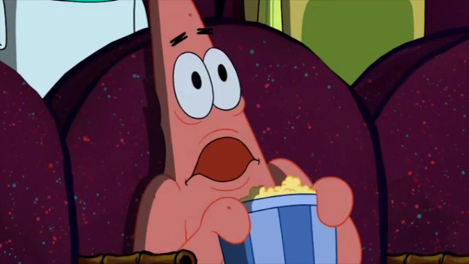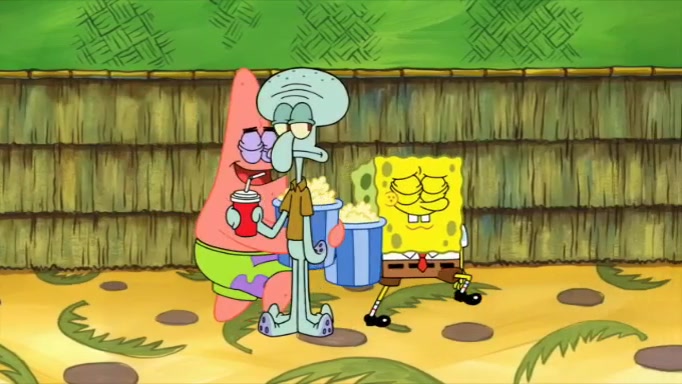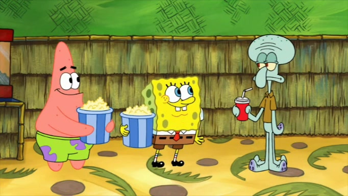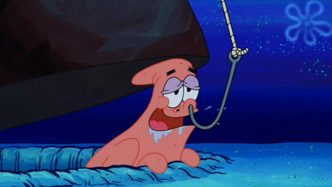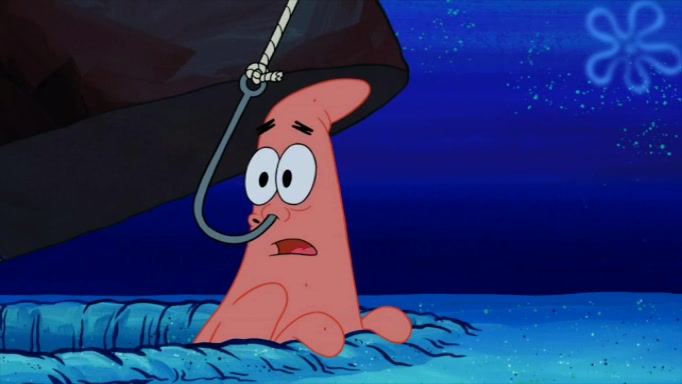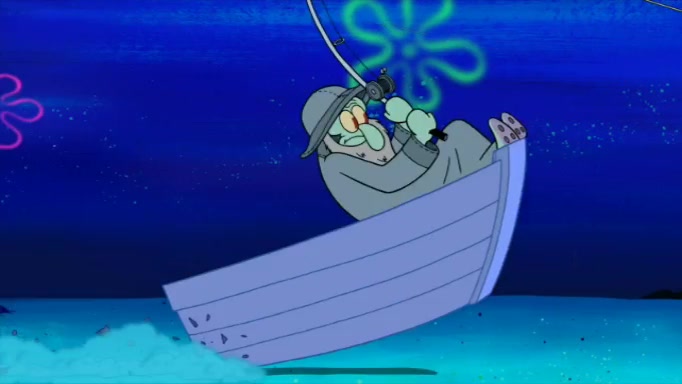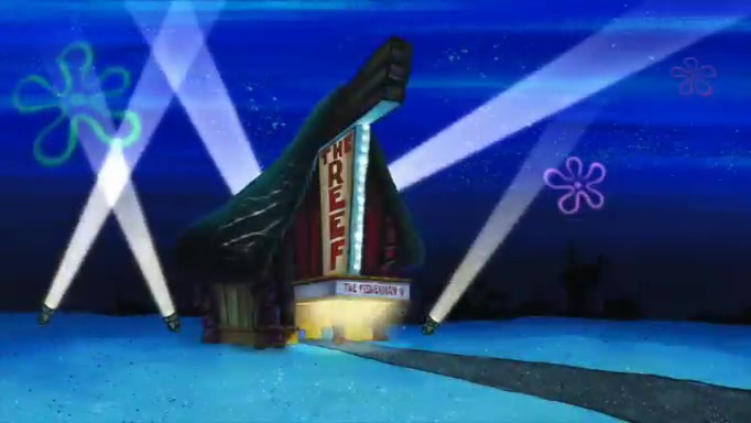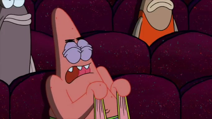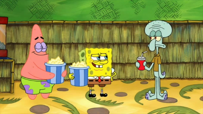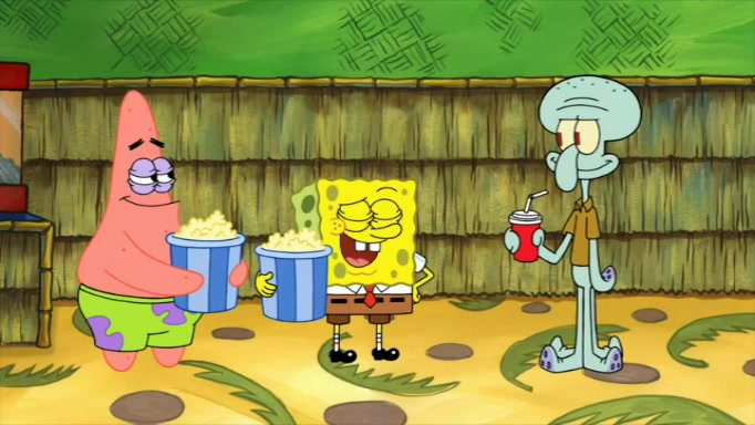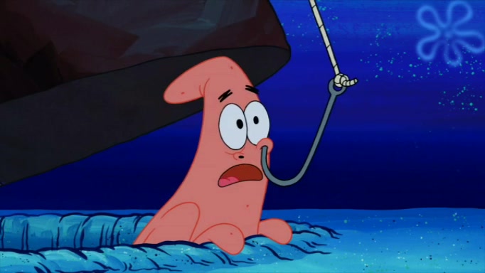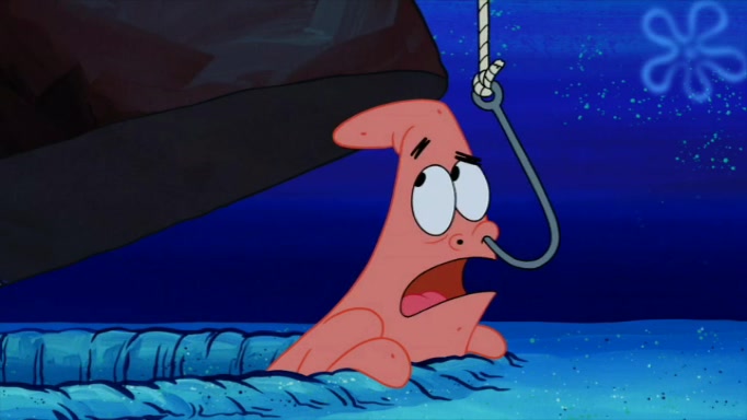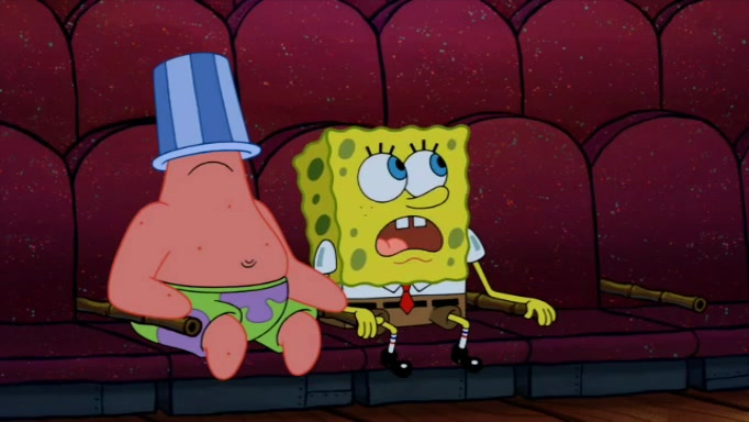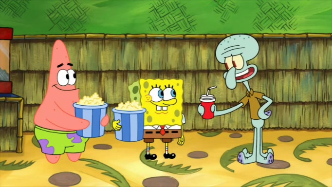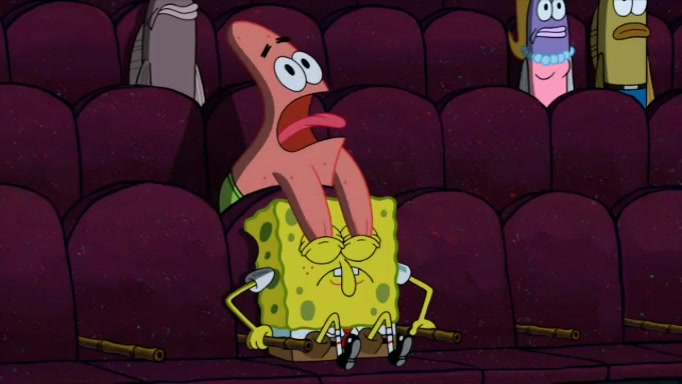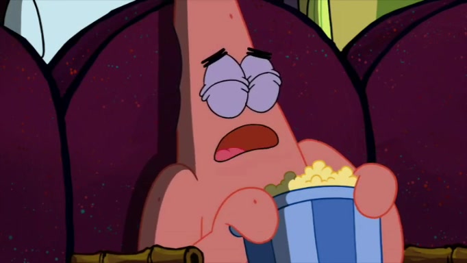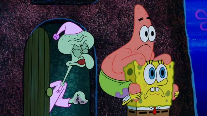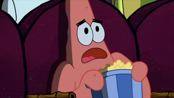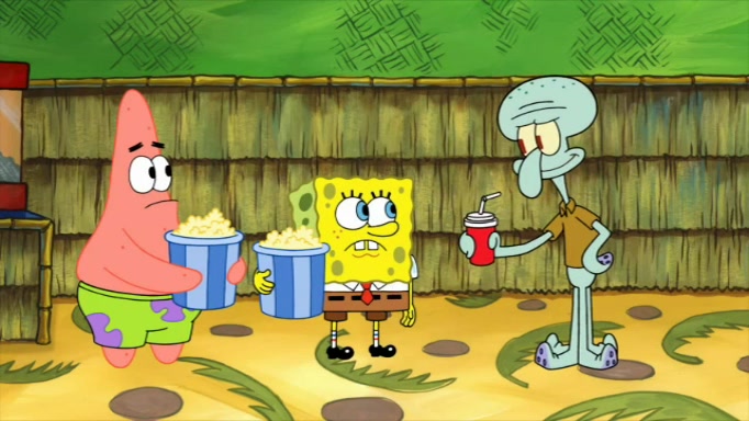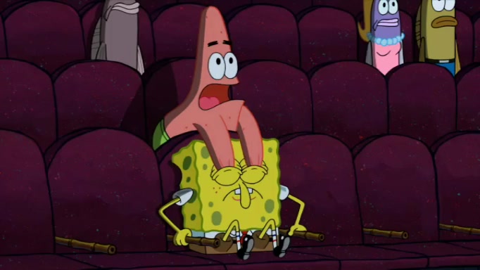 SpongeBob and Patrick are at the movie theater going to see Fisherman 4: Attack of the Hook. They meet Squidward who laughs saying they won't have any sleep after seeing the movie. They both claim they're grown-up men, but Squidward says "Boo" in monotone and scares them effortlessly.